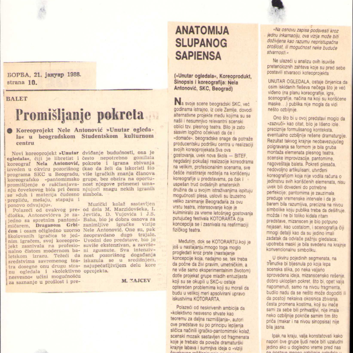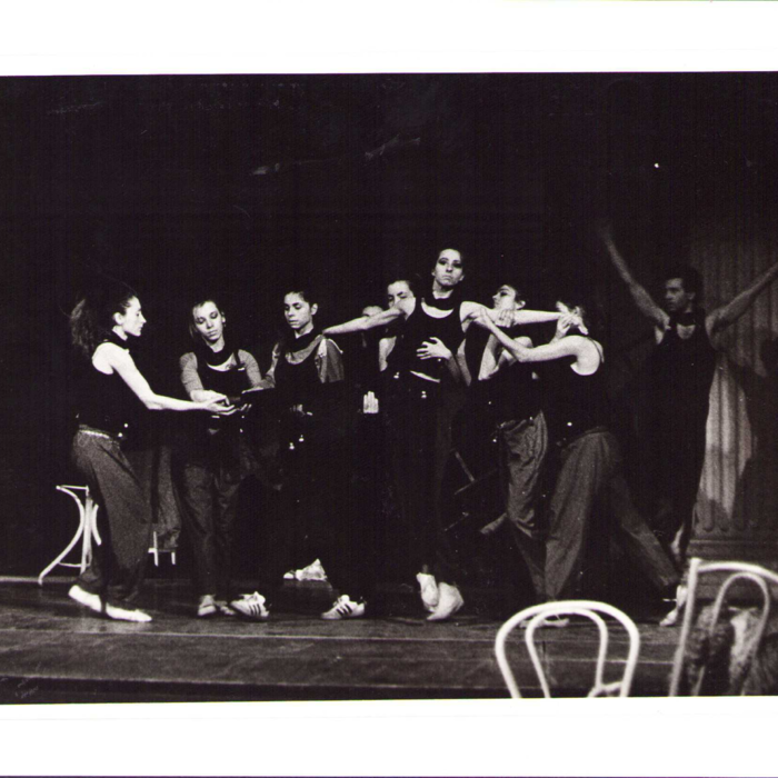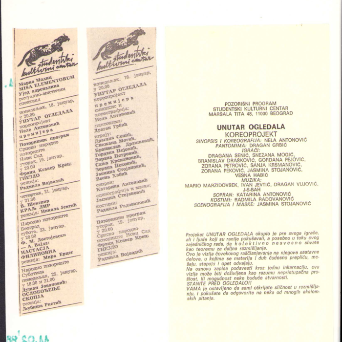 A dance-pantomime collage based on modern ballet expression, with eight female and one male dancer. Inside the Mirror was part of the theatrical program of the Student Cultural Center, where dance theater pieces were often performed.