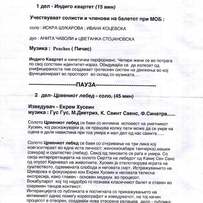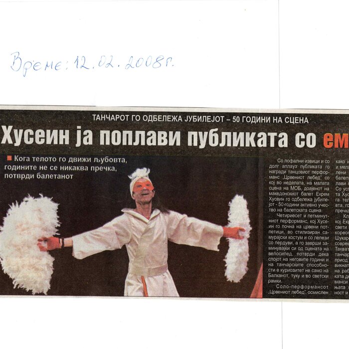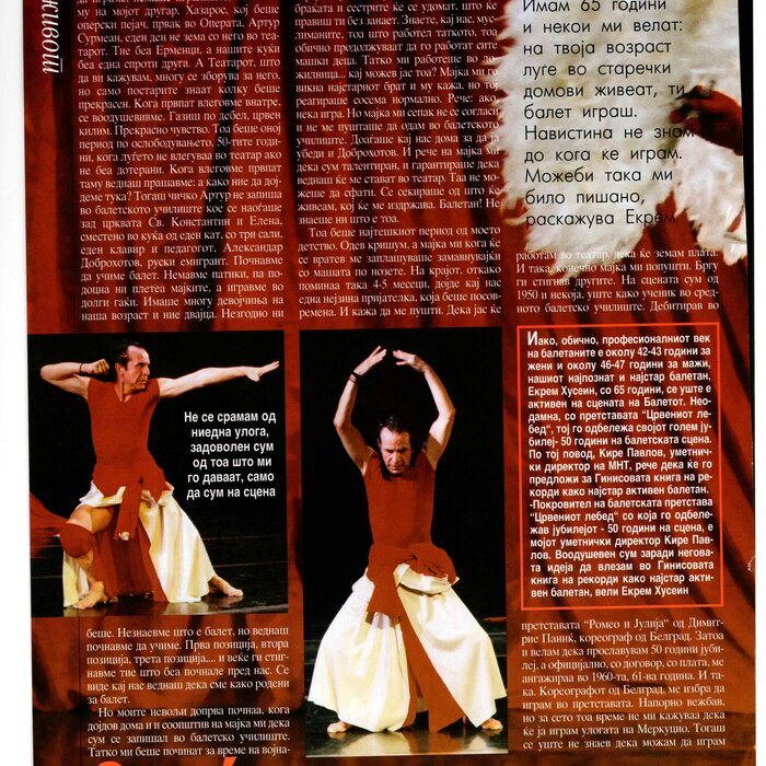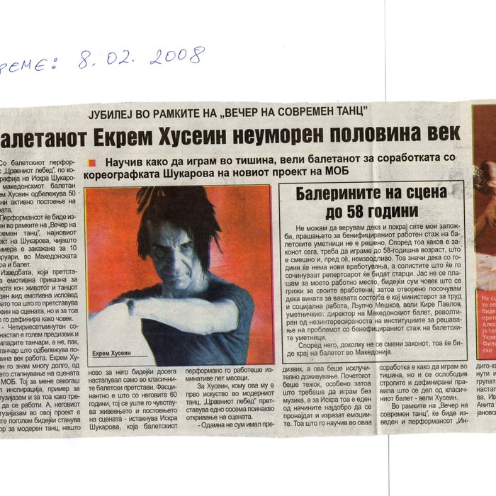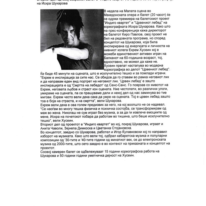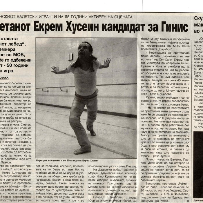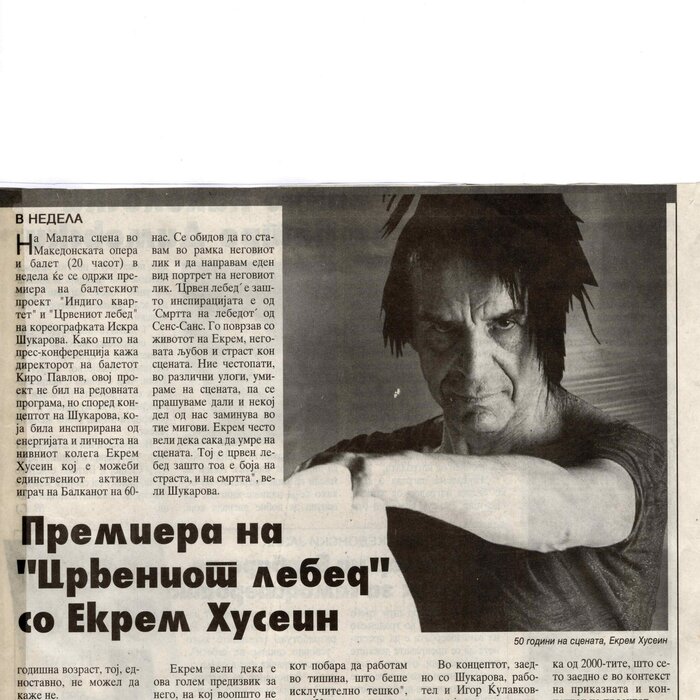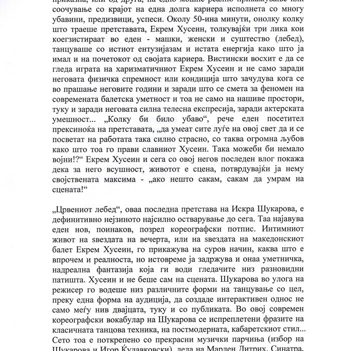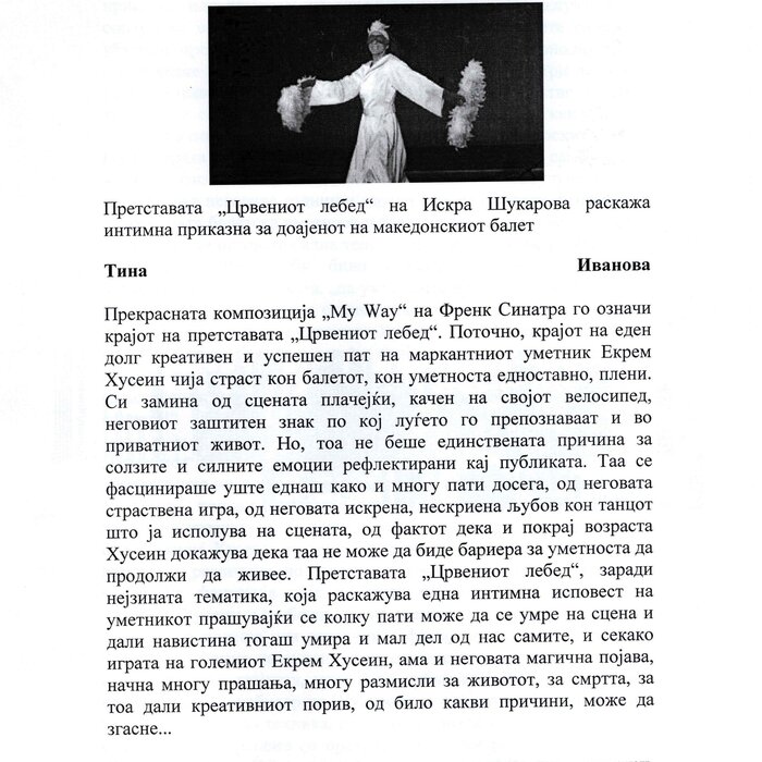Choreographer Shukarova dedicated The Red Swan (Crveniot Lebed) to Ekrem Husein, a ballet dancer, one of the crucial figures in the national Opera and ballet in North Macedonia with a pronounced individuality and ritual devotion to dance, who danced for 50 years. In The Red Swan he makes a dance confession depicting three characters: a female (cabaret dancer), a male (samurai), and the creature (the dying swan, traditionally danced by female dancers). In the final scene, Husein is driving his own bicycle on the stage, offering an introduction of himself as an off-stage personality, thus blurring the boundaries between stage and reality, a role and real-life personality, performance and identity. Going through diverse identity positions, Shukarova and Husein gently refract the gaze with movements and images that dysregulate the ballet vertical body, and step away from the position that is expected in the canonised role that Husein as a (male) artist had in a national ballet institution. Incorporating, in a postmodernist vein, dance movements alien to the ballet repertoire, such as clubbing, cabaret, everyday movement, non-normative gendered movement, while the iconic male ballet dancer performs a grieving female character entranced in love, they make the ballet institution and its hierarchy crumble. Setting Husein’s ageing body on the stage, Shukarova undermines the ballet body norms that demand a perfect, youthful, upright, and geometrically precise body. The very presence of the choreographer herself on stage, visible, sitting and giving live instructions to Husein, discloses the power hierarchies and institutional/ social apparatus that stage the allegedly ethereal bodies of ballet dancers on stage, while simultaneously demonstrate the difficulty of performing and memorising movement vocabulary by an ageing ballet body. This performance can be defined as proto-queer, since it dysregulates the norms (on stage as well as in private life), re-figures the ballet dancer’s body and queers it into a body of a person whose privacy is affected through movements and images on the stage.