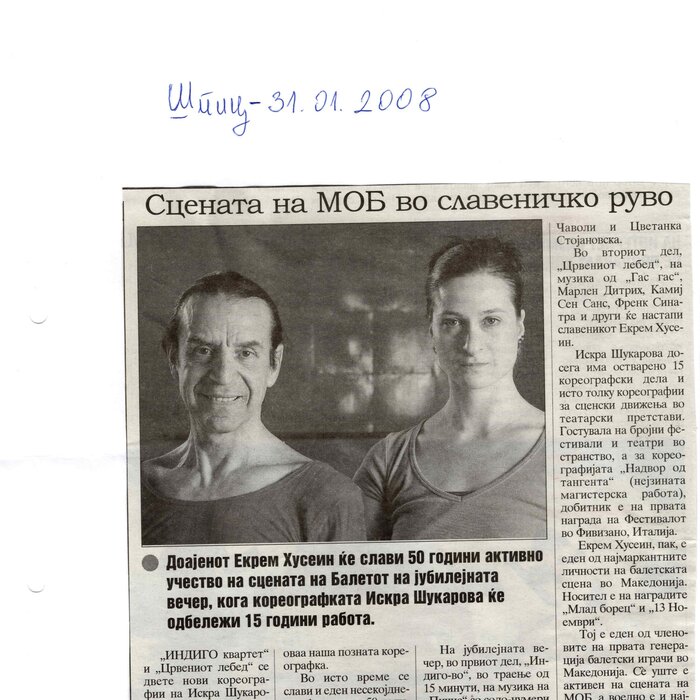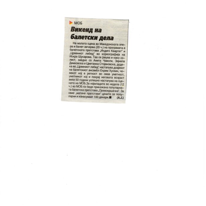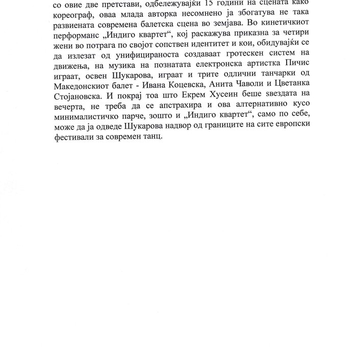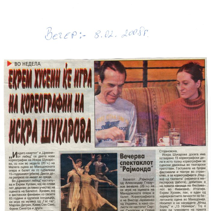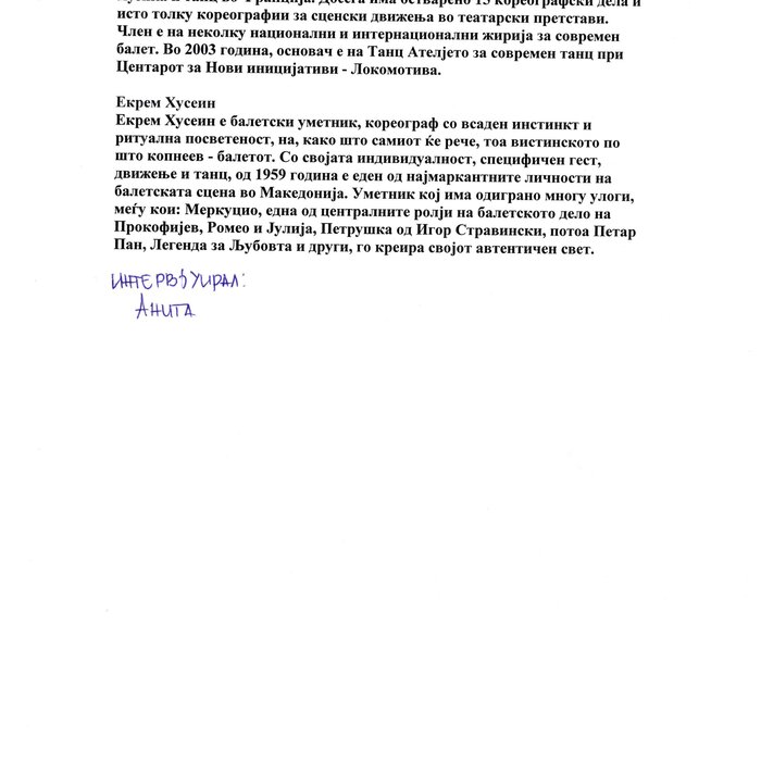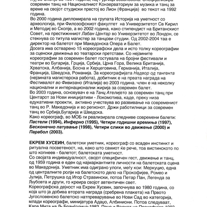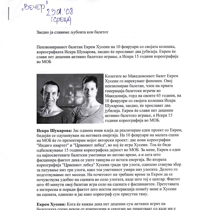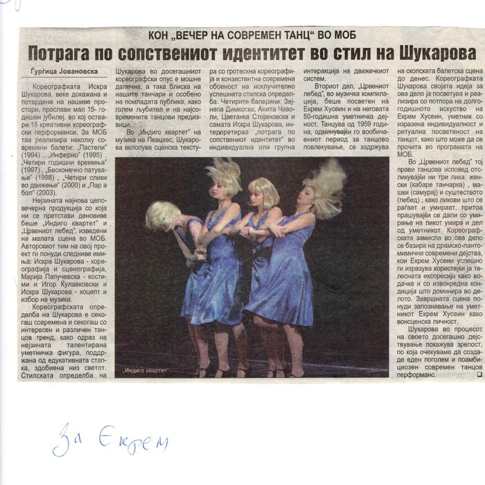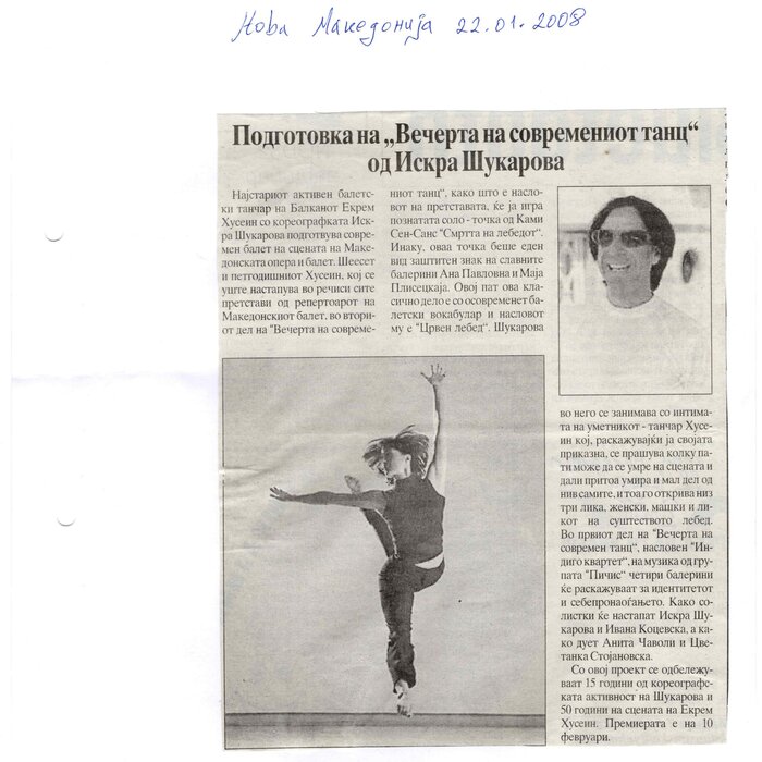 Choreographer Shukarova dedicated The Red Swan (Crveniot Lebed) to Ekrem Husein, a ballet dancer, one of the crucial figures in the national Opera and ballet in North Macedonia with a pronounced individuality and ritual devotion to dance, who danced for 50 years. In The Red Swan he makes a dance confession depicting three characters: a female (cabaret dancer), a male (samurai), and the creature (the dying swan, traditionally danced by female dancers). In the final scene, Husein is driving his own bicycle on the stage, offering an introduction of himself as an off-stage personality, thus blurring the boundaries between stage and reality, a role and real-life personality, performance and identity. Going through diverse identity positions, Shukarova and Husein gently refract the gaze with movements and images that dysregulate the ballet vertical body, and step away from the position that is expected in the canonised role that Husein as a (male) artist had in a national ballet institution. Incorporating, in a postmodernist vein, dance movements alien to the ballet repertoire, such as clubbing, cabaret, everyday movement, non-normative gendered movement, while the iconic male ballet dancer performs a grieving female character entranced in love, they make the ballet institution and its hierarchy crumble. Setting Husein’s ageing body on the stage, Shukarova undermines the ballet body norms that demand a perfect, youthful, upright, and geometrically precise body. The very presence of the choreographer herself on stage, visible, sitting and giving live instructions to Husein, discloses the power hierarchies and institutional/ social apparatus that stage the allegedly ethereal bodies of ballet dancers on stage, while simultaneously demonstrate the difficulty of performing and memorising movement vocabulary by an ageing ballet body. This performance can be defined as proto-queer, since it dysregulates the norms (on stage as well as in private life), re-figures the ballet dancer’s body and queers it into a body of a person whose privacy is affected through movements and images on the stage.