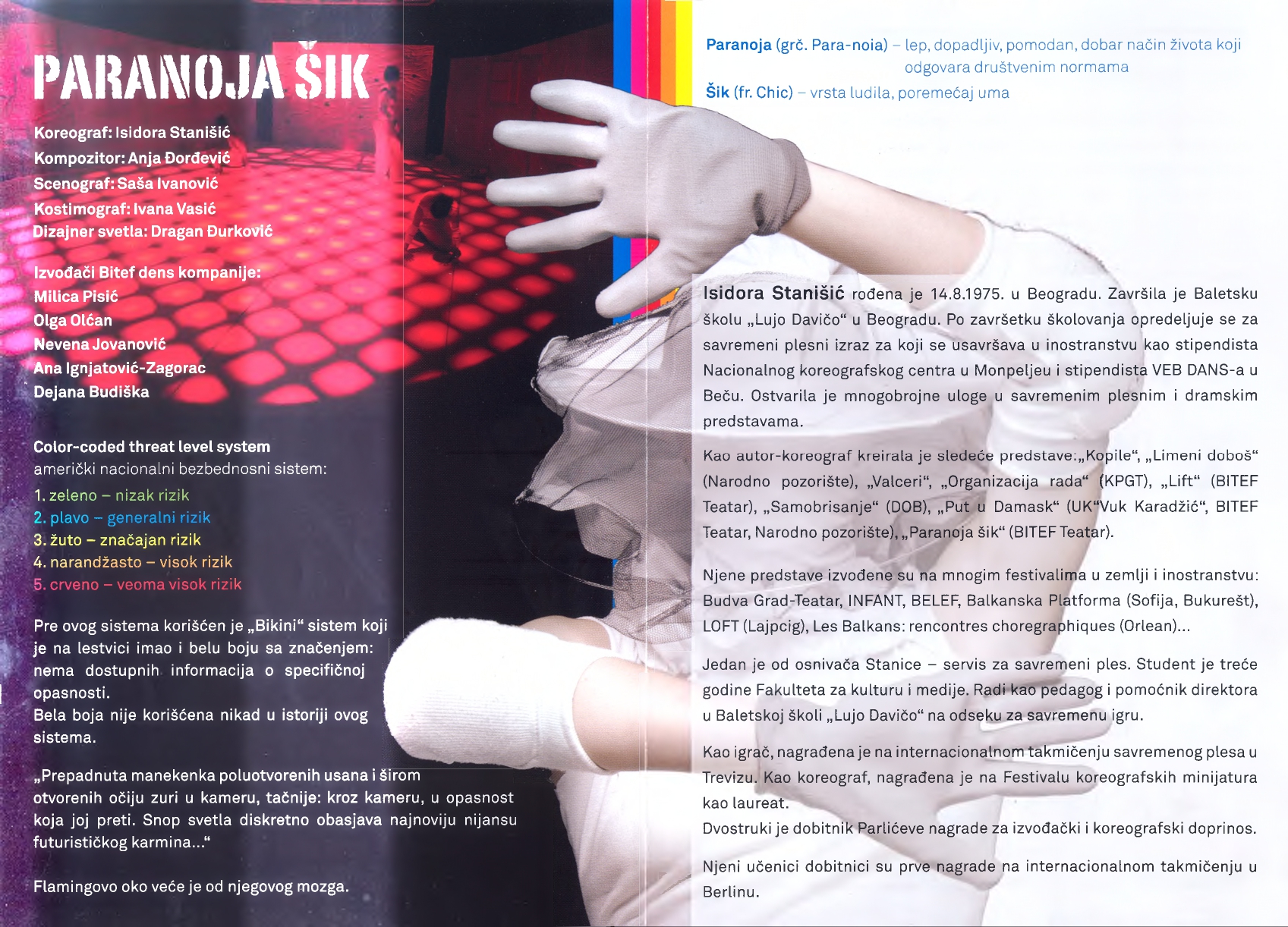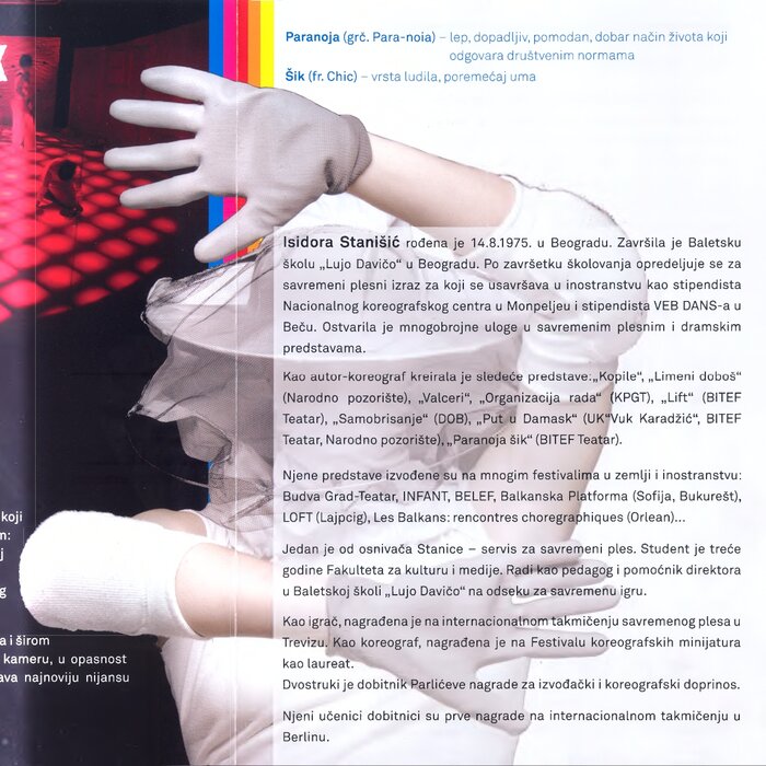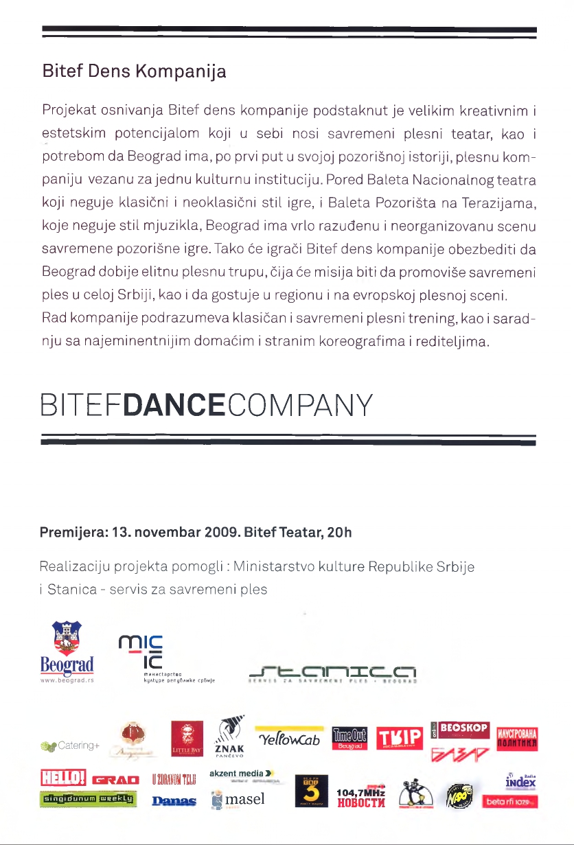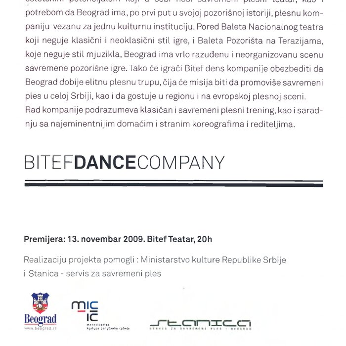 Bitef dance company was founded in 2009 as the first contemporary dance troupe in Serbia tied to a cultural institution, enabling the audience to follow high-quality dance theater throughout the entire theater season. Over fifteen years of existence, Bitef Dance Company has produced over forty dance productions and participated in over two hundred performances both domestically and internationally (Slovenia, Croatia, Montenegro, Poland, Sweden, Hungary, Romania, Japan, Bosnia and Herzegovina, Macedonia...). The company has won twenty-seven awards and collaborated with some of the most eminent domestic, regional, and European choreographers, such as Guy Weizman, Roni Haver, Jasmin Vardimon, Isidora Stanišić, Edward Clug, Constanza Macras, Matjaž Farič, Dalija Aćin, Zoran Marković, Maša Kolar, Branko Potočan, Leo Mujić, Dunja Jocić, and Felix Landerer. The performances *Scents of Cinnamon, Othello, Divine Comedy, Space for Revolution, Alpha Boys, Sonnets, Yesterday, Birds, Cities That No Longer Exist...* have contributed to forming a new audience that regularly follows dance theater. In 2017, the *Young Bitef Dance Company* was formed, consisting of students from the Contemporary Dance Department of the Lujo Davičo Ballet School. The very first production of this company was called Paranoia Chic, choreographed by Isidora Stanišić. The performance explored topics of alienation, lack of communication and overall paranoia from various natural and non only natural catastrophes imposed by modern civilization (flu, fatal infections etc). The unstoppable growth of paranoia is shown through various stage means: from the shocking, yet due to its carnival nature, comical "trick" of crashing through the walls of the set (a metaphor for "banging one's head against a wall"), to the change in light color from green to red - the American alert scale. The very four dancers of this performance (Milica Pisić, Olga Olćan, Nevena Jovanović, and Ana Ignjatović-Zagorac) were also first members of the company, which was suppose to provide a permanent space for work, returning Bitef Theatre to its original mission of promoting new and different theatrical tendencies. Unfortunately, fifteen years later, the company is not structurally supported by the local governmental bodies responsible to distribute resources for arts and culture.