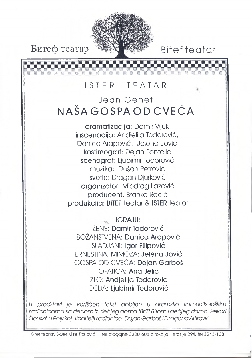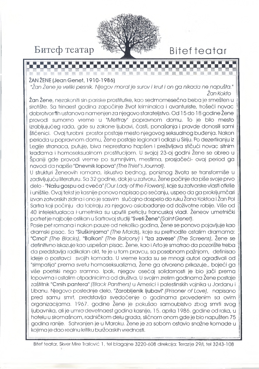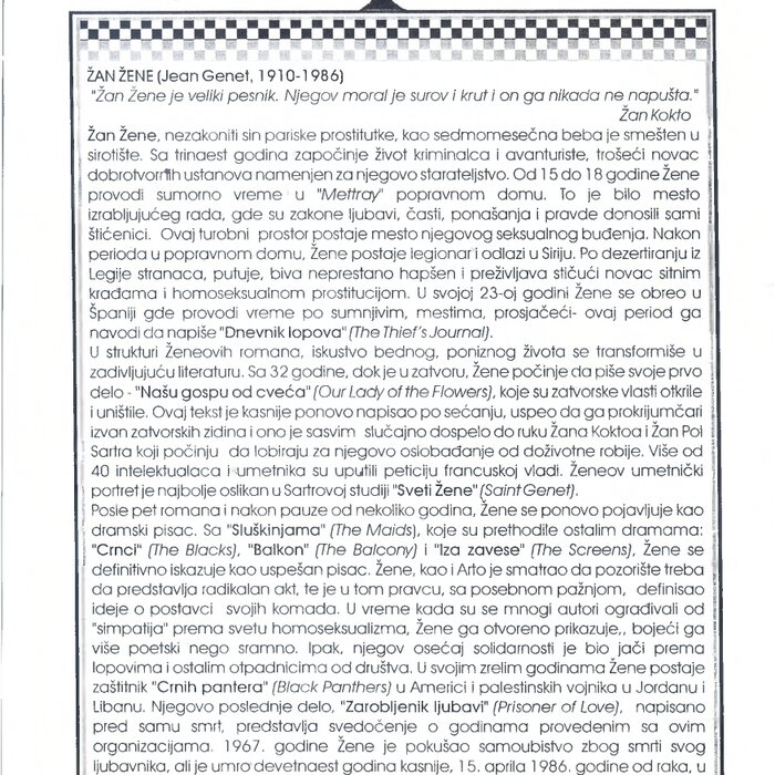 After five novels and after a break of several years, Genet reappears as a playwright. With "The Maids", which preceded the other dramas: "The Blacks", "The Balcony" and "Behind the Curtain", Genet definitely proves to be a successful writer. Genet, like Arto, believed that the theater should represent a radical act, and in that direction, with special care, he defined ideas about the staging of his plays. At a time when many authors were dissuaded from "sympathy" towards the world of homosexuality, Genet openly portrays it, painting it more poetically than shamefully. However, his sense of solidarity was stronger towards thieves and other renegades from society. In his mature years, Genet became the protector of the "Black Panthers" (Black Panthers) in America and the Palestinian soldiers in Jordan and Lebanon. His last work, "Prisoner of Love" (Prisoner of Love), written before his death, is a testimony of the years spent with these organizations. In 1967, Genet attempted suicide due to the death of his lover, but died nineteen years later, on April 15, 1986, of cancer, in hotel in a poor, working-class part of town, similar to the one where it had been abandoned 75 years earlier. He was buried in Morocco. Genet left behind powerful pieces in which he gave a realistic critique of bourgeois values.