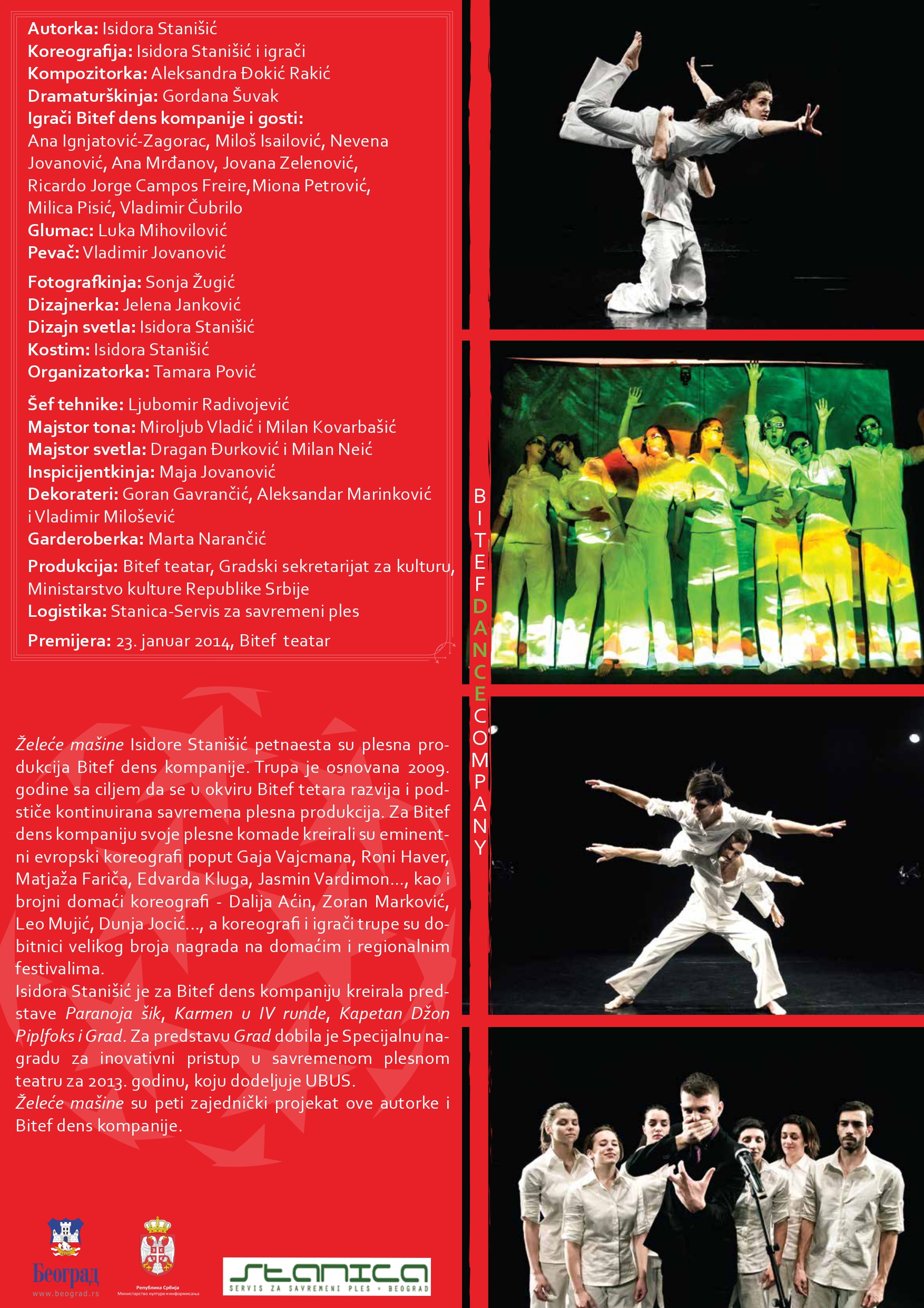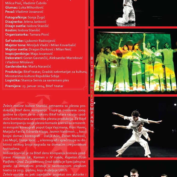 Isidora Stanišić's Wishing machines are the fifteenth dance production of the Bitef dance company. The troupe was founded in 2009, with the aim of developing and encouraging continuous contemporary dance production within the Bitef Theater. For Bitef dance company, its dance pieces were created by eminent European choreographers such as Guy Weitzman, Ronnie Haver,