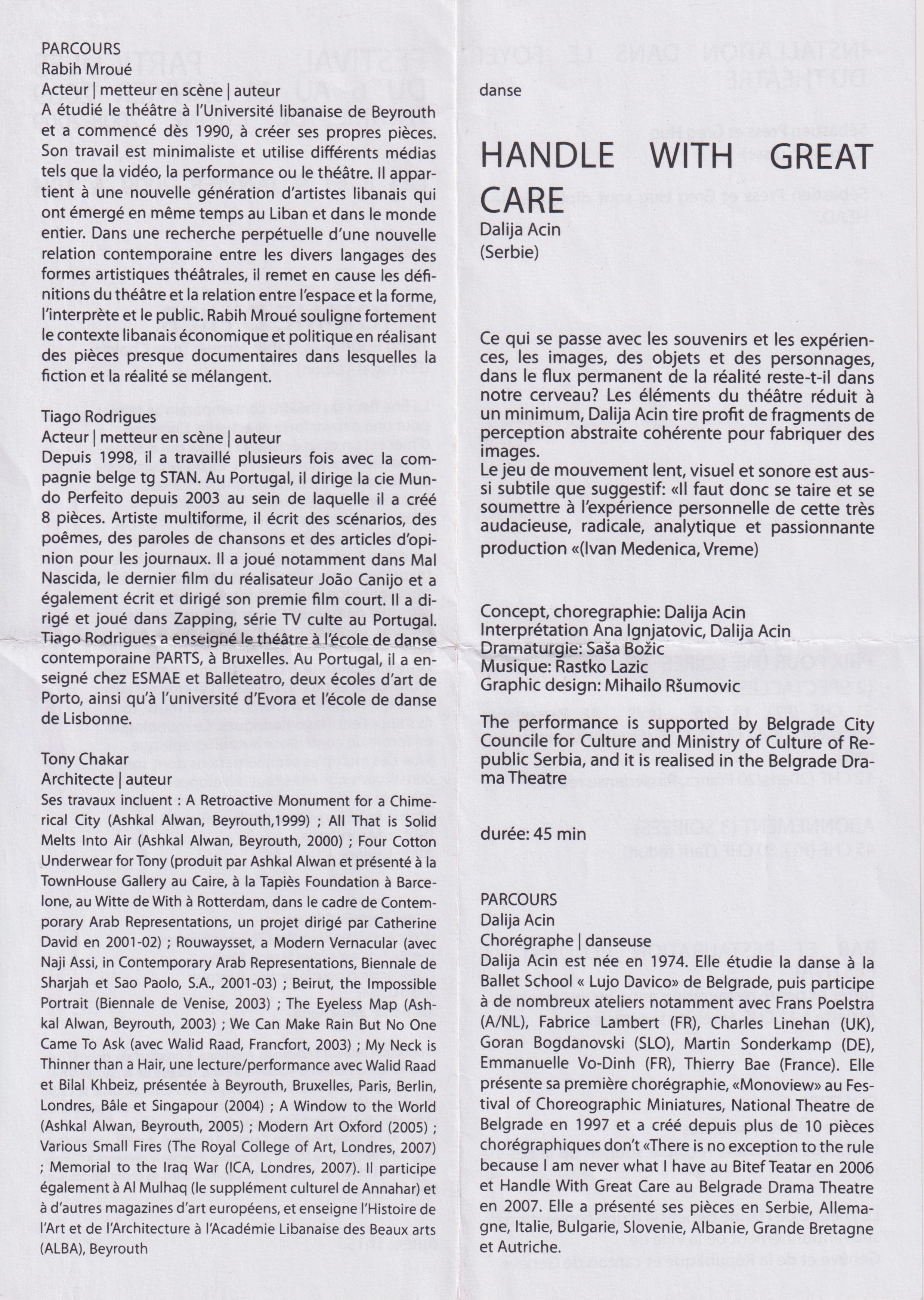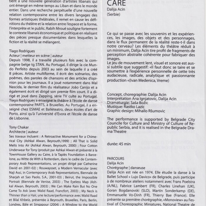 It is an unusall, suggestive and imaginative exploration of the phenomenon of memories: those images, objects and figures, which are fading away in the constant flux of reality.... In unnamed, unmesured space, made of reconstructed momories, imaginary acts/scenes, reproductions of lapses, the bodies are floating in between of what is shown and what stays forever unspoken...