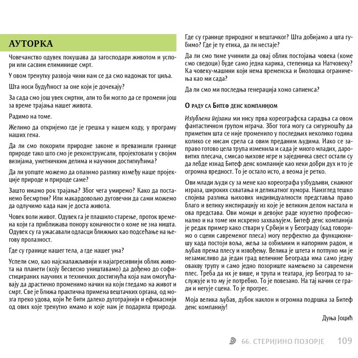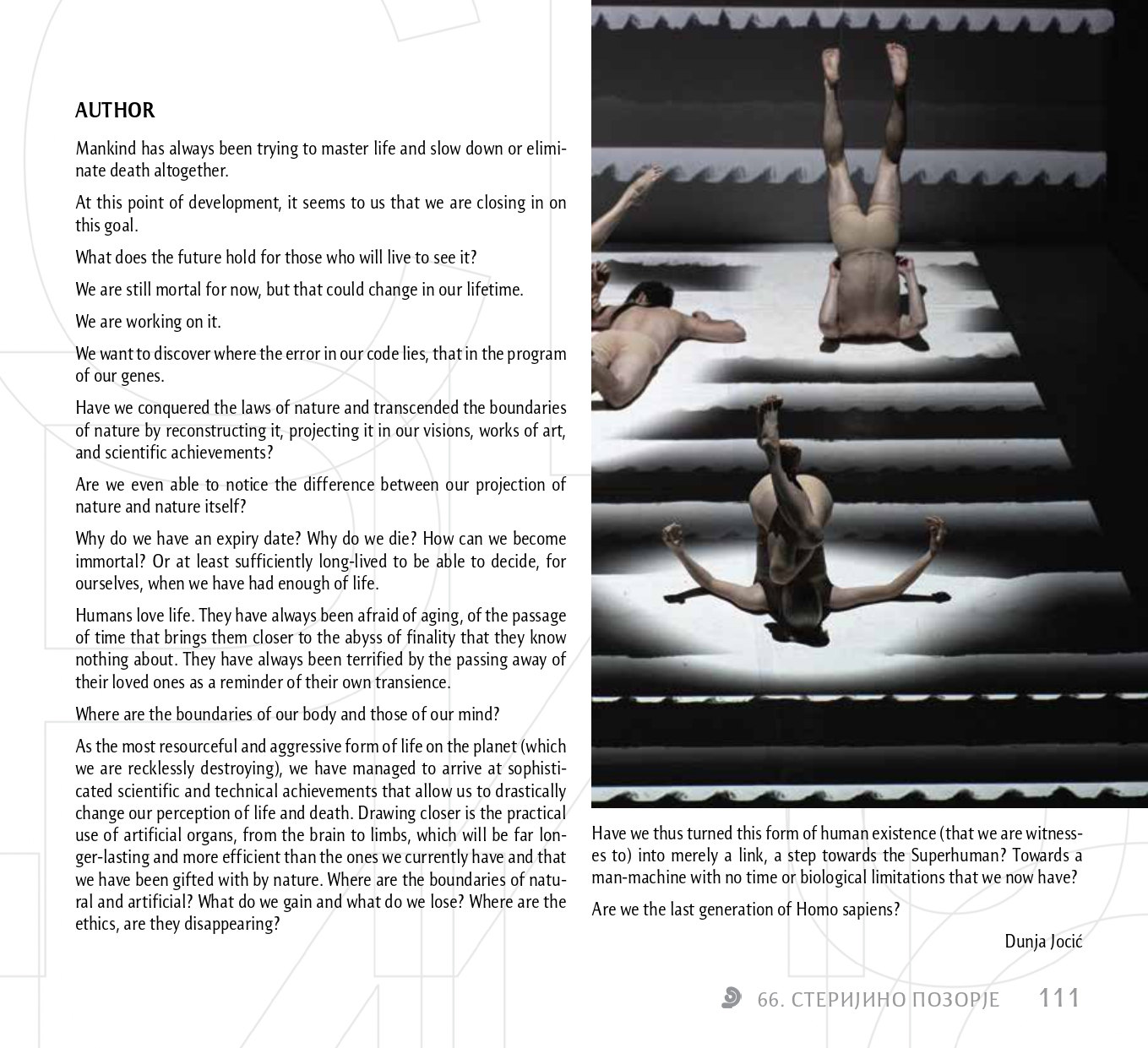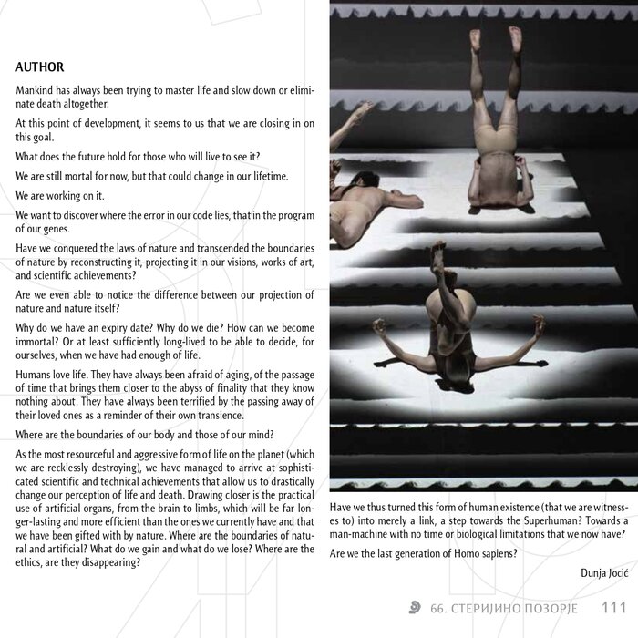 Humanity has always tried to master life and slow down or completely eliminate death. At this point in development, we seem to be within reach of that goal. What does the future hold for those who welcome it? For now, we are still mortal, but that could change within our lifetime. We are working on it. We want to find out where the error is in our code, in the program of our genes. Have we conquered the natural laws and overcome the limits of nature by reconstructing it, projecting it in our visions, works of art and scientific achievements? Can we even perceive the difference between our projection of nature and nature itself? Why do we have an expiration date? What are we dying for? How do we become immortal? Or long-lived enough to decide for ourselves when we've had enough of life. Man loves life. He has always been afraid of aging, the passage of time that brings him closer to the abyss of finitude of which he knows nothing. He was always horrified by the departure of loved ones as a reminder of his transience. Where are the limits of our body and where are our minds? We have managed, as the most resourceful and aggressive form of life on the planet (which we are unconsciously destroying), to reach sophisticated scientific and technical achievements that allow us to drastically change the way we look at life and death. The practical application of artificial organs, from the brain to the limbs, is getting closer and closer, which will be far more durable and effective than the ones we currently have and which were given to us by nature. Where are the boundaries between natural and artificial? What do we gain and what do we lose? Where is the ethics, is it disappearing? Did we thereby make this form of human existence (which we are witnessing) to be only one link, a step towards the Overman? Towards a man-machine that has no time and biological limitations like we do now? Are we the last generation of homo sapiens?