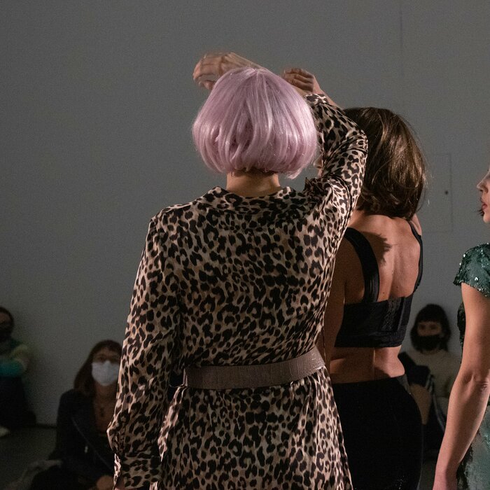 This work is a commission, upon the invitation of the TRAS Studio members to the choreographer Sonja Pregrad, with the interest to work with her specific approach to physicality. The work leans onto her earlier solo performances, that dealt with the objecthood of the (female) body, and takes it’s title question from there. In a gesture of perhaps paradoxical challenge to the affirmed drag performance strategy of taking up space by agency of over-performing, this work is constructed of a sequence of opportunities to witness sensuous surfaces (as used in the queer phenomenology) that make it up – being in touch with the materials such as lipstick, Lycra, another’s skin, concrete floor, gendered gaze, language, light… by this the performance proposes another space of experiencing the embodiment of the performance (of gender). Patriarchy looks at female body as an object, and drag, in it’s overdone voluntary performance, emancipates this. In the double-twist-gesture, that is the performance of female to female drag, objecthood of femininity is re-appropriated by the one (drag queen) that is performing it, that operates it’s construction and destabilizes the way it is percieved by the spectator. At the same time, performance deals with the production or performance of contemporary dance. In it, performers in drag are instructed how to perform drag, and observed in their performance by the figure (of the choreographer?), as well in drag, while all of them being women: ‘Female voice, speaking about female body, performing in a female genre, an objectification of femininity.’ The work aligns thinking with female to female drag performers and artists, such as Victoria Sin, Dynasty Handbag and others.