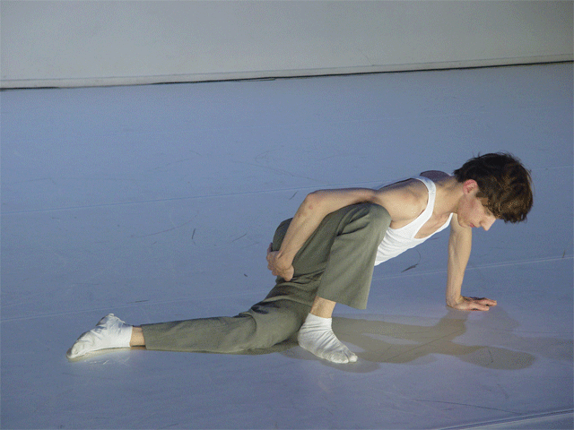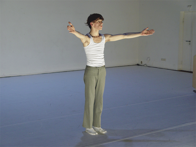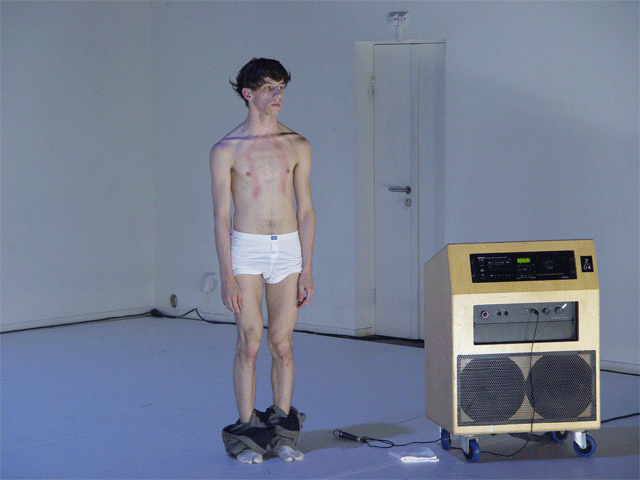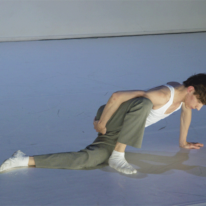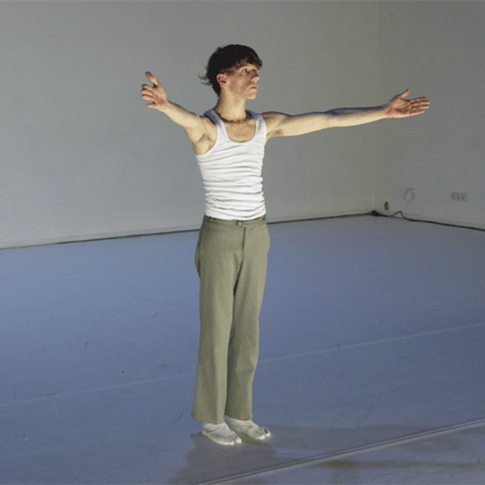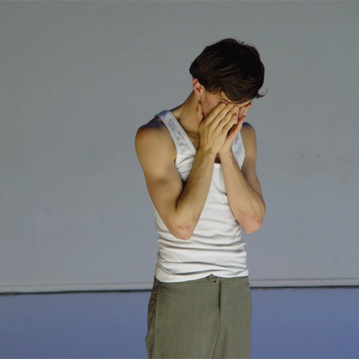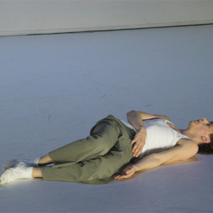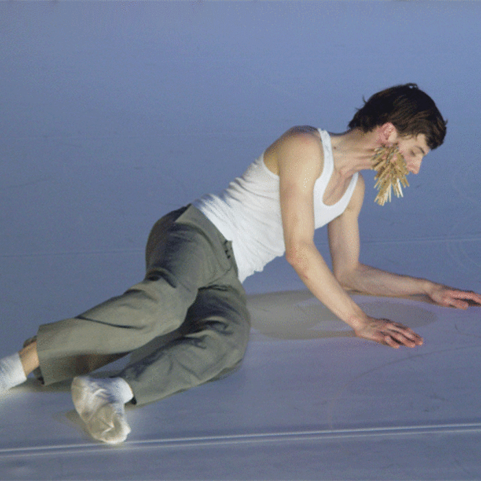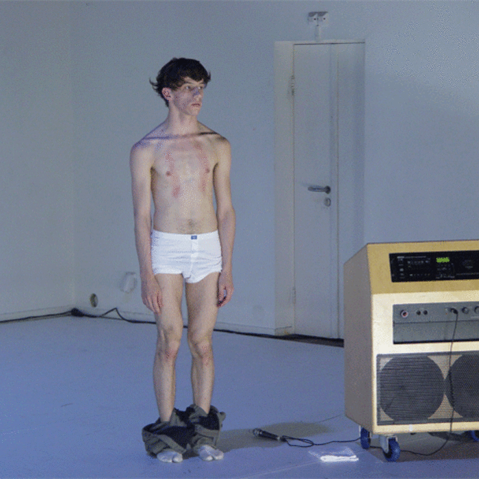 Ferlin’s first solo performance unfolds as a series of anti-actions that push his body and mind to their limits. Using minimal yet intense gestures, such as lip-syncing nostalgic songs and rubbing a microphone on his chest until his skin reddens, Ferlin’s presence fluctuates between stark visibility and partial concealment. His choreographic choices, including repetitive walking patterns and gestural restraint, resist conventional dance categorization, exploring an intense focus on bodily presence and emotional immediacy. The staging creates a raw, introspective atmosphere that underscores themes of intimacy, isolation, and vulnerability through sustained moments of bodily auto-fixation.