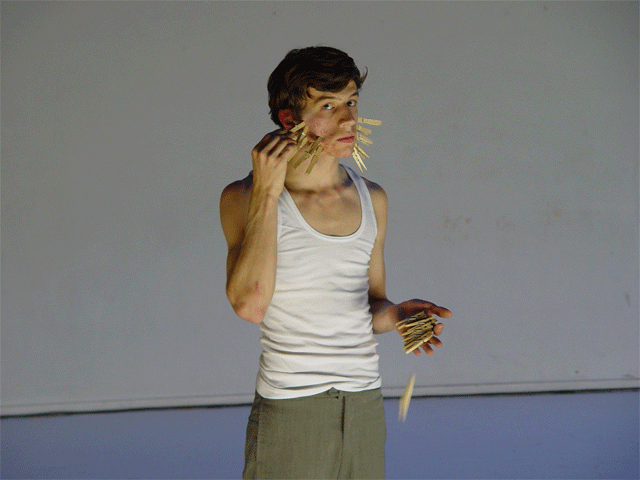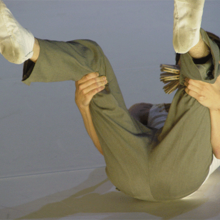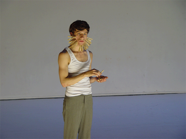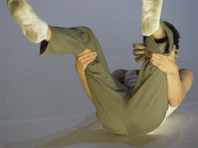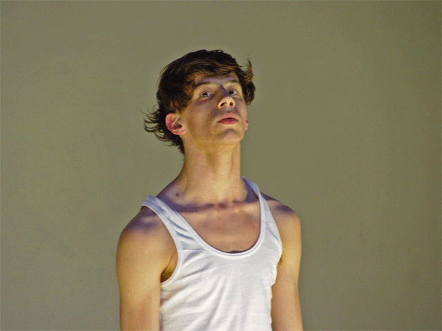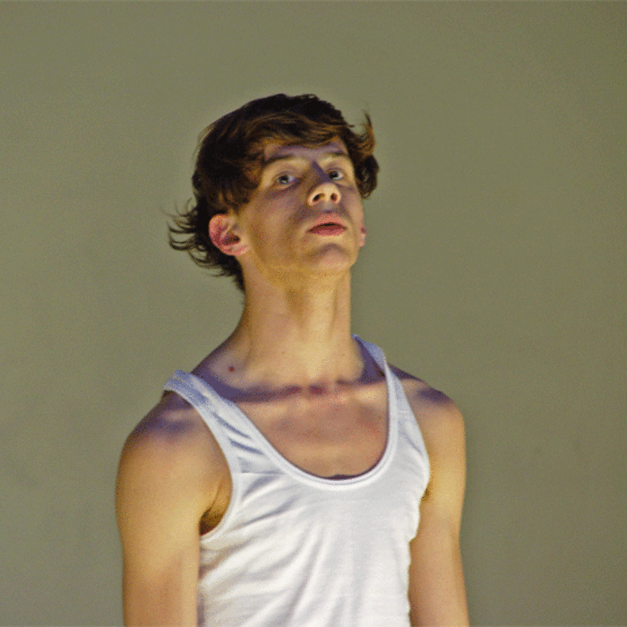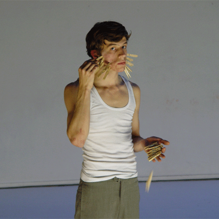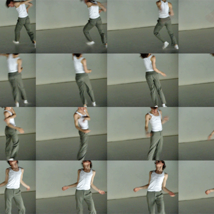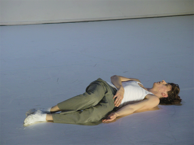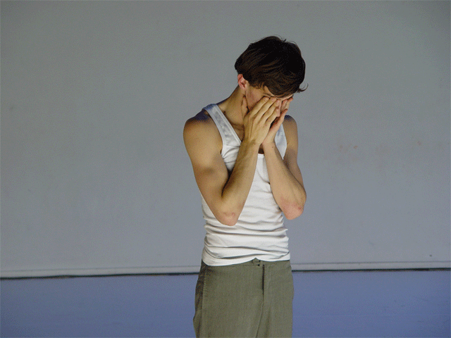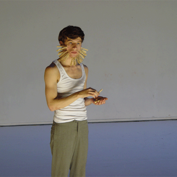 Ferlin’s first solo performance unfolds as a series of anti-actions that push his body and mind to their limits. Using minimal yet intense gestures, such as lip-syncing nostalgic songs and rubbing a microphone on his chest until his skin reddens, Ferlin’s presence fluctuates between stark visibility and partial concealment. His choreographic choices, including repetitive walking patterns and gestural restraint, resist conventional dance categorization, exploring an intense focus on bodily presence and emotional immediacy. The staging creates a raw, introspective atmosphere that underscores themes of intimacy, isolation, and vulnerability through sustained moments of bodily auto-fixation.