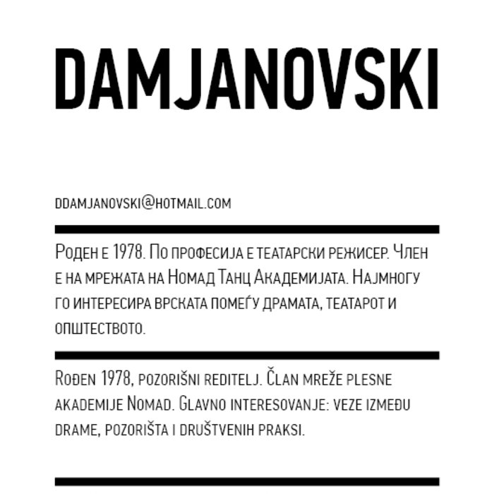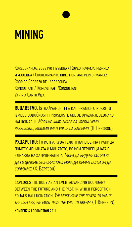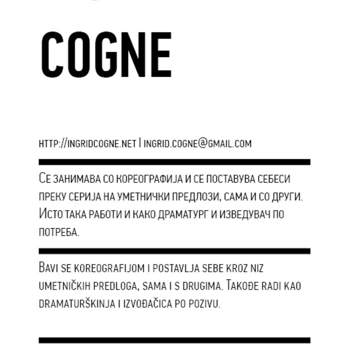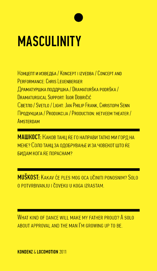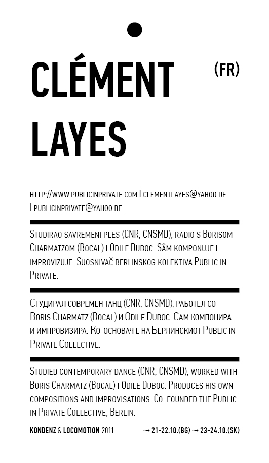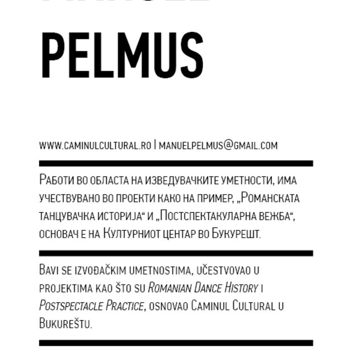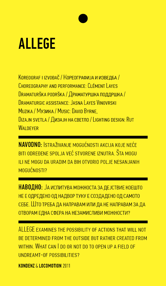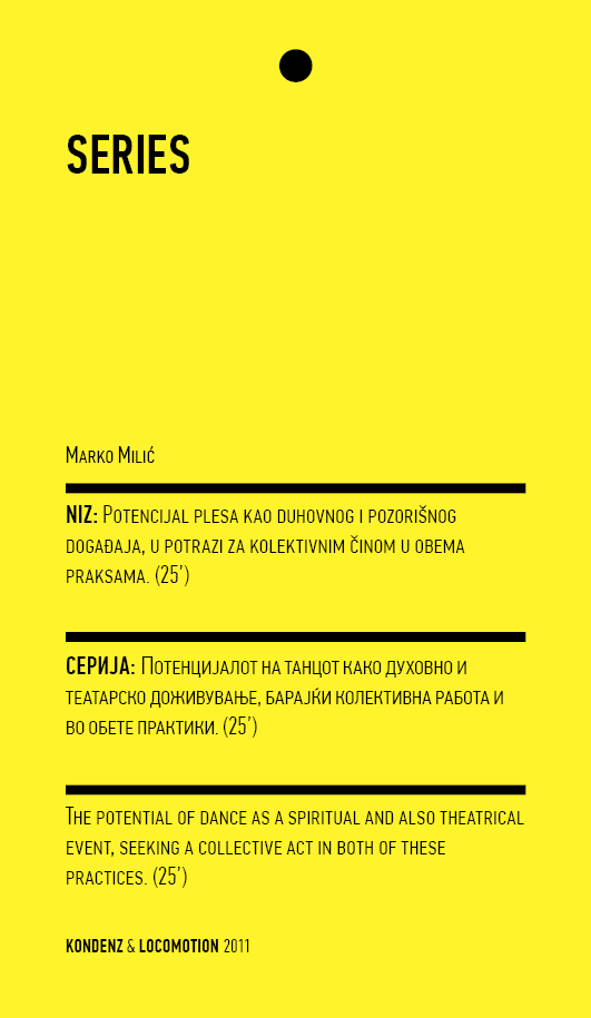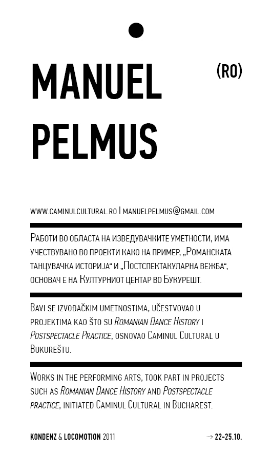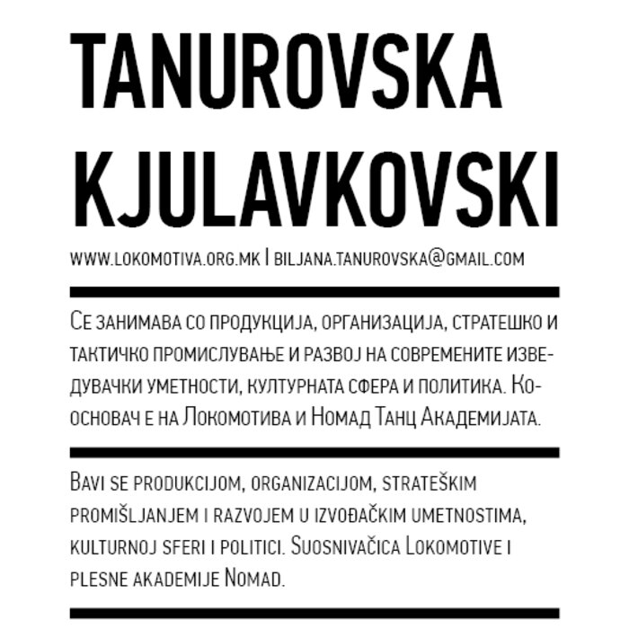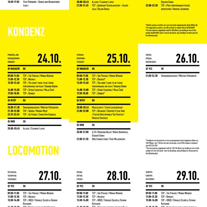 Four years ago, the Station Service for Contemporary Dance and the Lokomotiva Centre for New Initiatives in Arts and Culture founded two regional festivals: the Kondenz in Belgrade and the Locomotion in Skopje. Both festivals were formed under the auspices of the Nomad Dance Academy network with the aim to present the latest, most innovative works by choreographers from the region and beyond. The goal is to familiarise our local audiences with different aspects of contemporary dance and performance. Festivals can be seen as ephemeral venues that can both appear and disappear rather quickly. We realise that nowadays artists travel and present their work all over the world, without being able to affect local contexts, to engage in exchange, to learn, or even to acquire experience. Under the logic of neoliberal capitalism festivals have become venues for marketing artistic work, with little to offer in terms of their social, educational, and developmental value and without fostering exchange, intervention, or generation of knowledge. Therefore, this year we have decided to realise the programme in a different way, dedicating most of it to an attempt to alleviate those lacks. We have decided to join the two festivals together and open up more space for communicating with the audience, offering a programme that will challenge the borders between authorities, space, the audience, performers, programmers, territories, and festivals. Sharing their responsibilities in curating and organisation and in collaboration with Hybris Konstproduktion from Sweden, Kondenz and Locomotion devised a part of their respective programmes together and named it “The Curatorial Programme”. Both festivals feature pre-selected programmes consisting of several performances. Kondenz invited four performances by authors active in the European context: Rodrigo Sobarzo, Clément Layes, Dragana Bulut, Maria Baroncea, Eduard Gabia, and Chris Leuenberger; Locomotion also invited four performances, by Clément Layes, Dragana Bulut, Maria Baroncea, Eduard Gabia, Torvald Silver, Tehvan Ratsanik, Kire Miladinovski, and Aleksandra Kočovska. “The Curatorial Programme” consists of proposals by a pool of participants, artists, theorists, and organisers working in the field of contemporary performing arts, from a number of countries, including Macedonia, Serbia, Croatia, Slovenia, Romania, Sweden, France, and Switzerland, among others. The Curatorial Programme was developed by means of a different festival methodology: rather than inviting a selection of specific performances, our team of curators invited a set of artists, theorists, and organisers. The selected participants were then asked to propose and co-create the programme with the curating team, bringing different approaches to work creativity, knowledge, aesthetics, etc. Also, they will be present for the duration of the festival and the Curatorial Programme. The idea is to give the participants a chance to meet their audience, so that together we may try and reconstruct the notion of the festival and spend quality time together. Also, we hope that this will result in producing new fields of interest and knowledge, in exchanging information, sharing, learning about the differences and similarities among various methodologies of creativity, contextual circumstances, and logic.