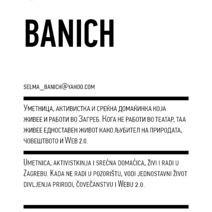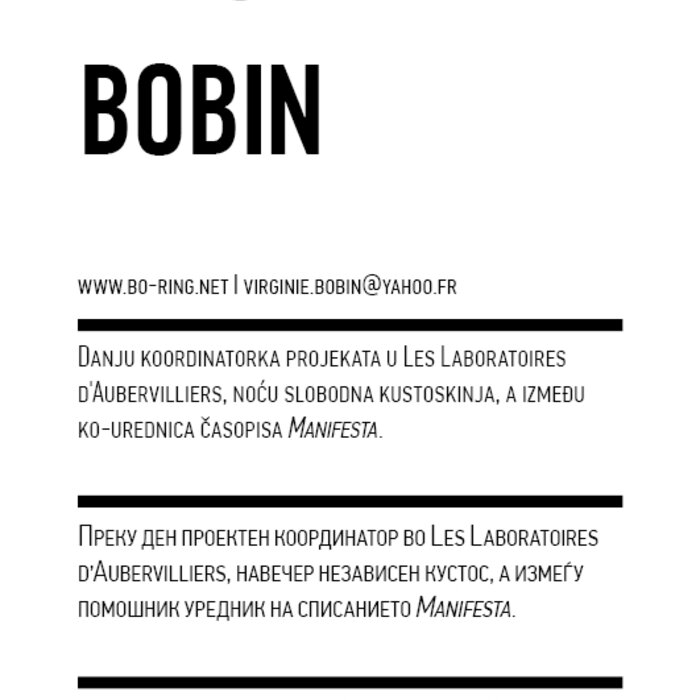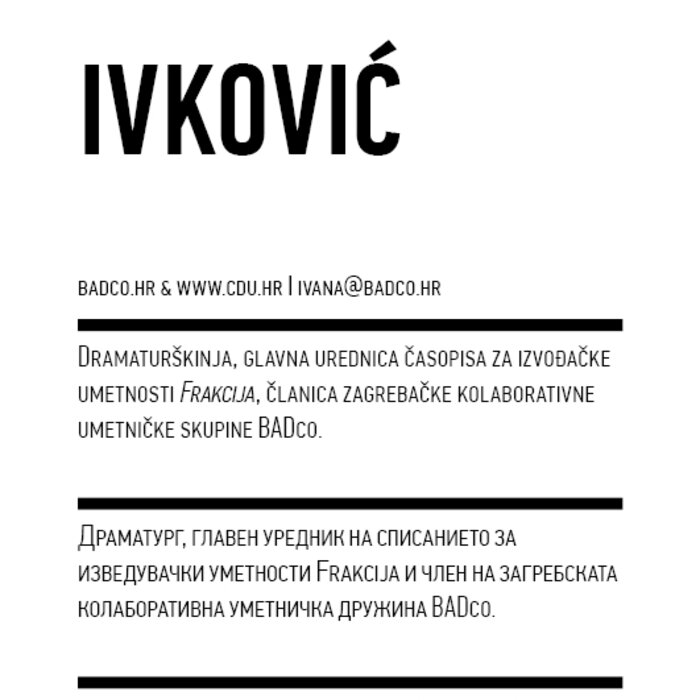 To make this possible, we have invited a selection of performances/pieces that we find particularly interesting and important to share in our respective local contexts. In addition to this, we have initiated what we call The Curatorial Programme, with a group of fifteen specially invited artists, theorists, and curators from Western Europe and the Balkans, thinkers who can offer, we believe, interesting combinations of artistic and discursive practices and experiences, as well as relations to the problems of curating. They are invited to act as co-curators, that is, to submit proposals, pieces, practices, situations, discussions, games, meals, reading sessions, etc. The proposals may be individual or collective, existing or new or emerging. The purpose of this format is to create a space that will be nurturing both for the artistic communities and the public, as well as for the discourses that we are developing together, on what the performing arts could do and become. All events in The Curatorial Programme are free of charge (marked TCP in the schedule).