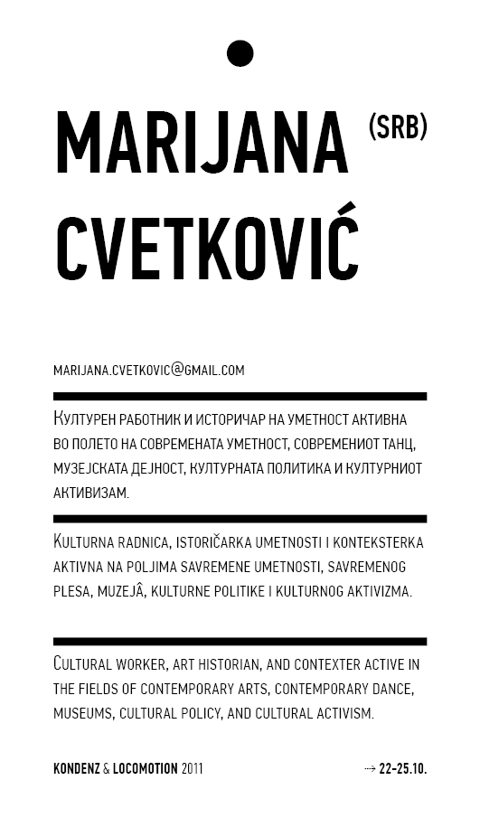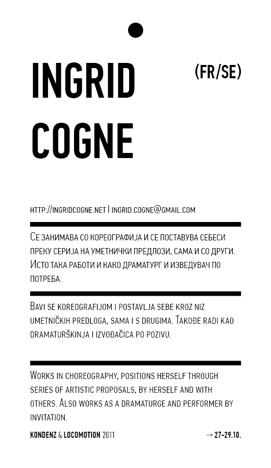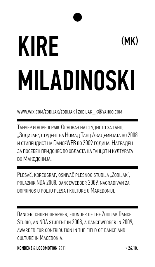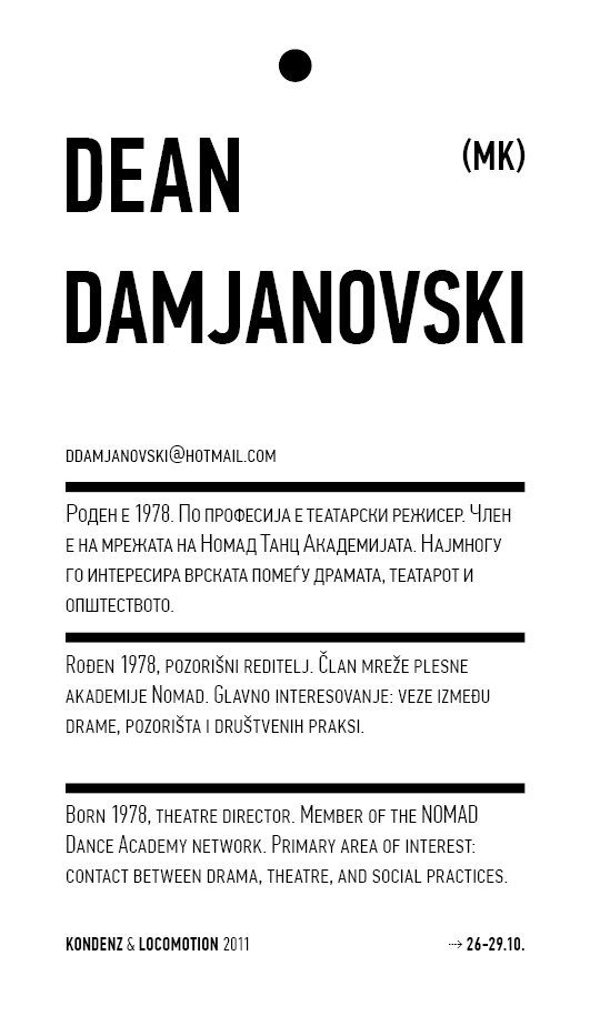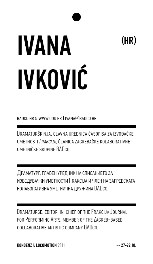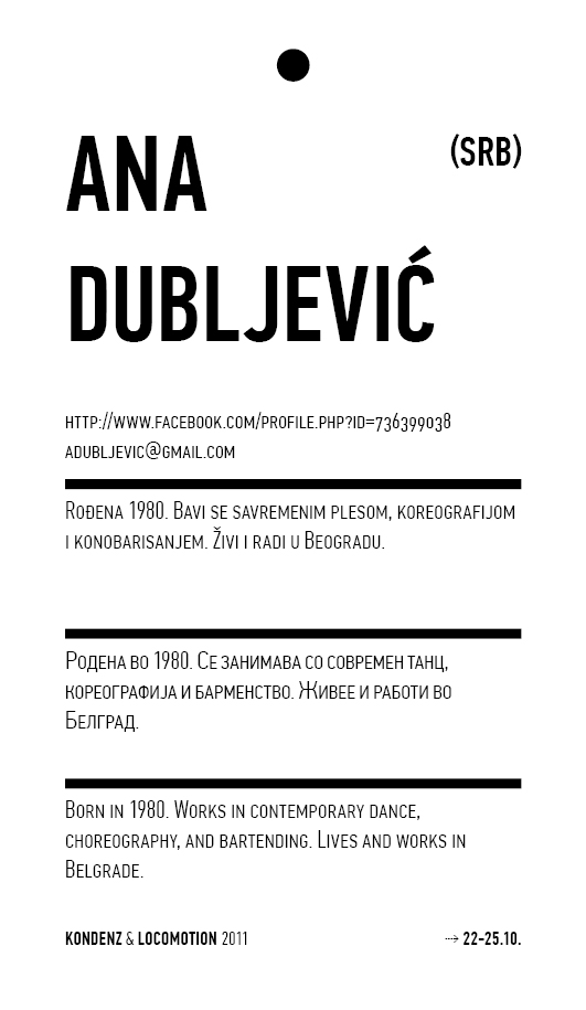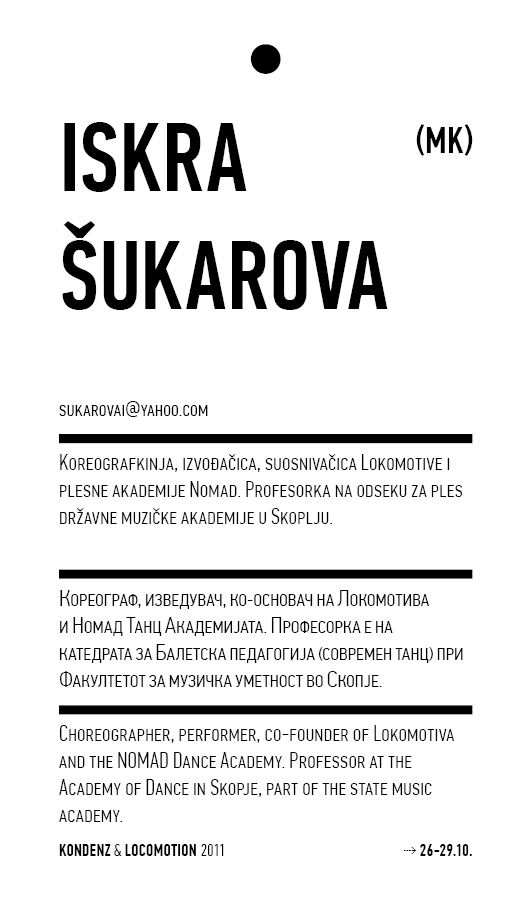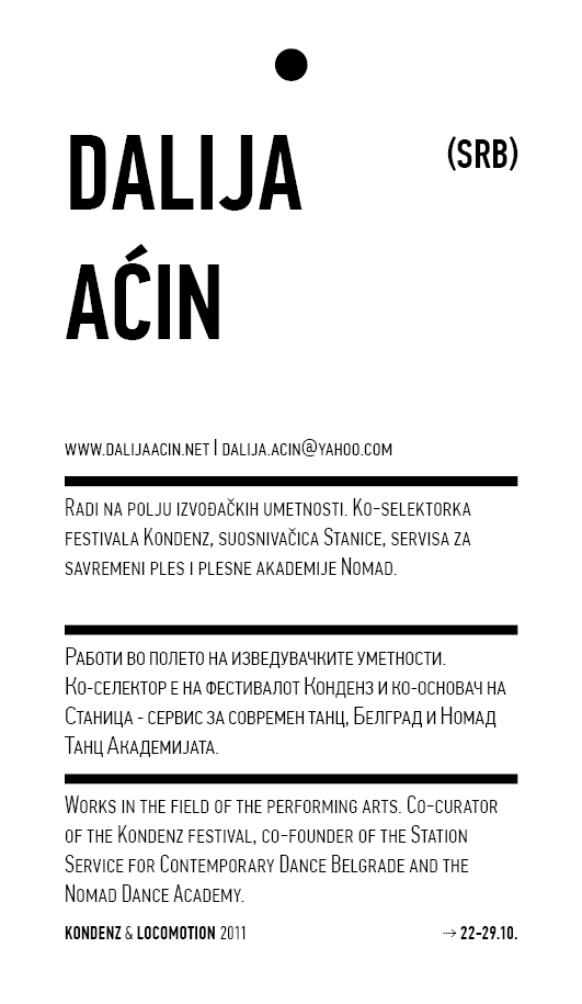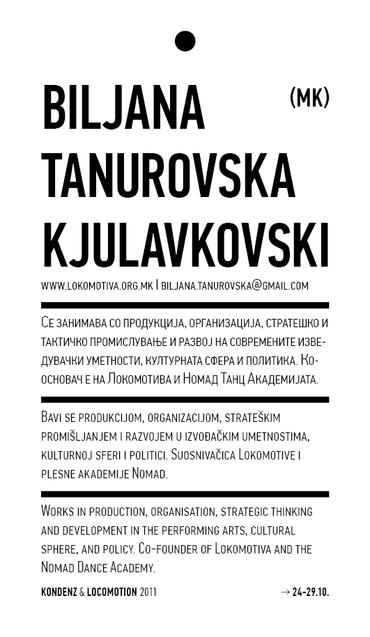 Kondenz, Belgrade and LocoMotion, Skopje are two festivals dedicated to contemporary dance and the performing arts. They were both launched in 2008, in response to a challenge we had been encountering for some time – the gap between big and market-oriented local festivals of the performing arts and local contemporary performing arts communities. We started by presenting smaller, new, and different works, and inviting our audiences to learn about the state of the performing arts today, as seen by the festival programmers. This year, we want to broach the issues of co-curating, of giving a different kind of space to our colleagues, a selection of practitioners working in different contexts, to come and propose what they would like to do and how they would like to do it.