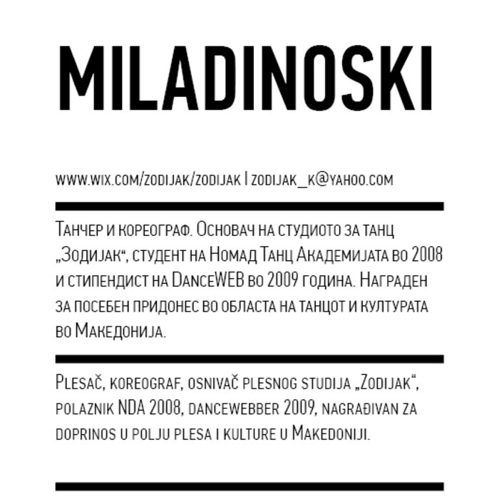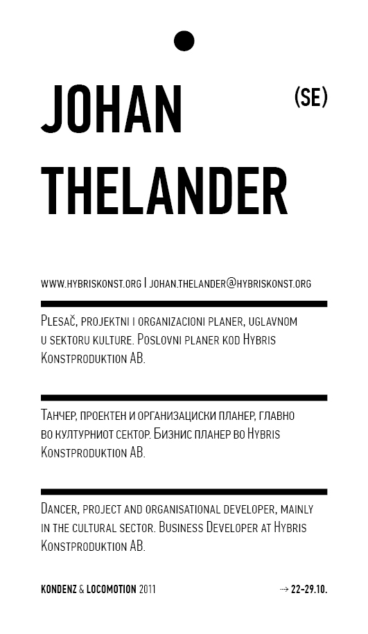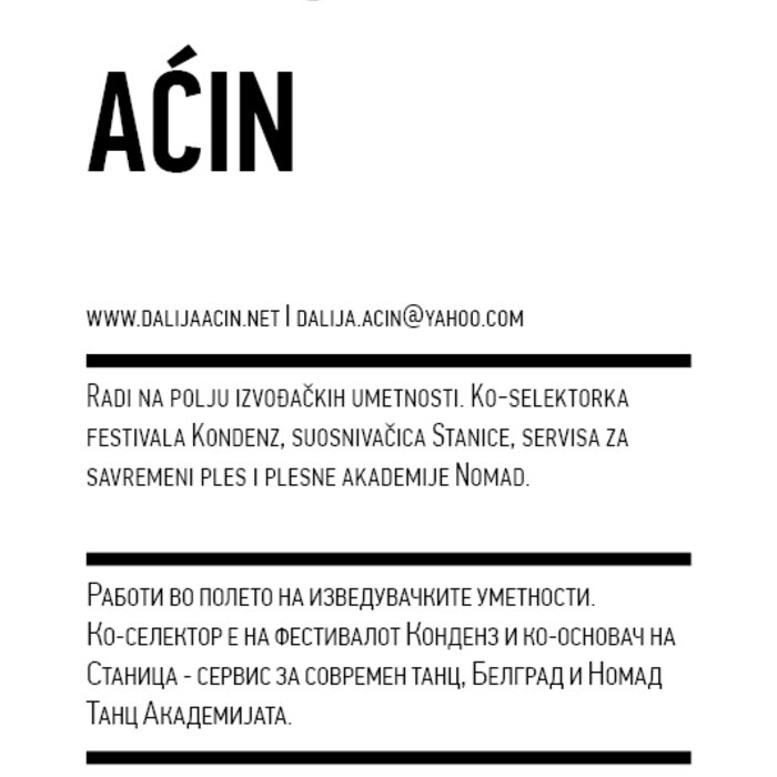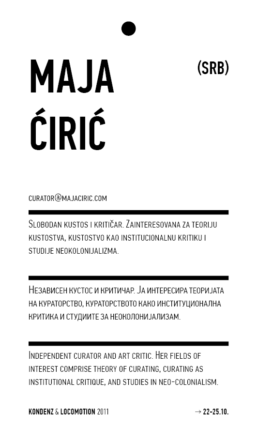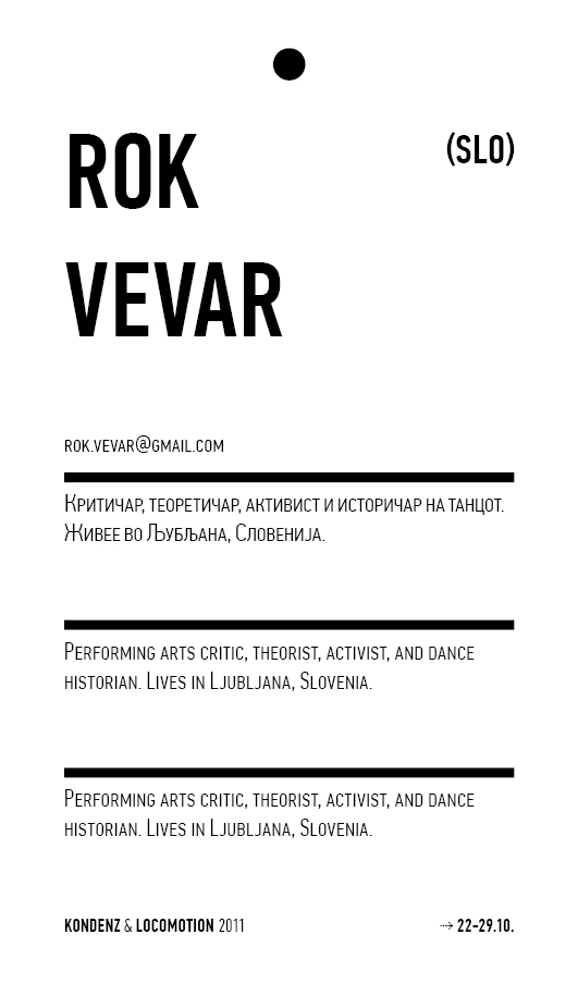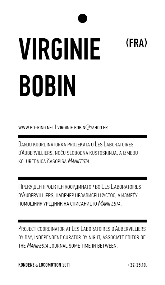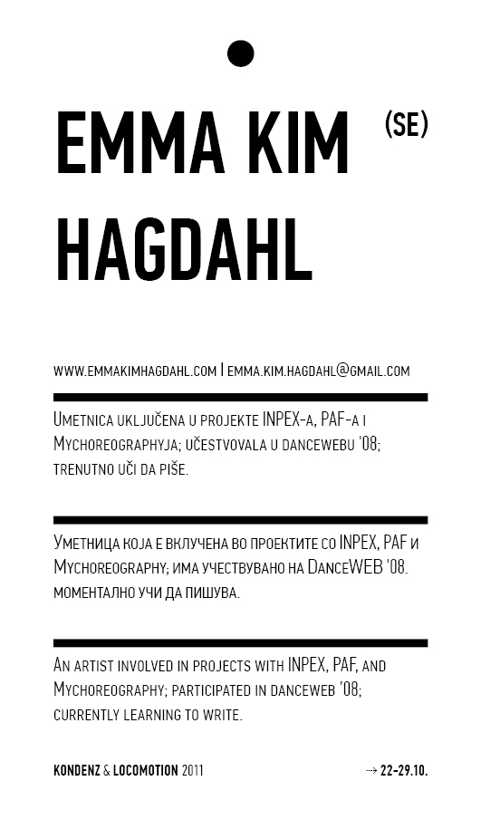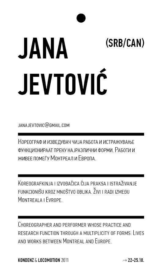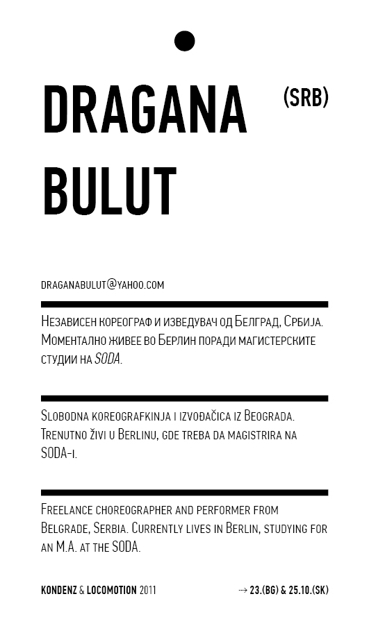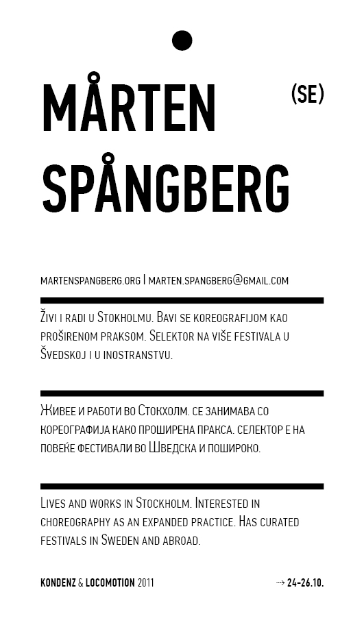 Kondenz, Belgrade and LocoMotion, Skopje are two festivals dedicated to contemporary dance and the performing arts. They were both launched in 2008, in response to a challenge we had been encountering for some time – the gap between big and market-oriented local festivals of the performing arts and local contemporary performing arts communities. We started by presenting smaller, new, and different works, and inviting our audiences to learn about the state of the performing arts today, as seen by the festival programmers. This year, we want to broach the issues of co-curating, of giving a different kind of space to our colleagues, a selection of practitioners working in different contexts, to come and propose what they would like to do and how they would like to do it.