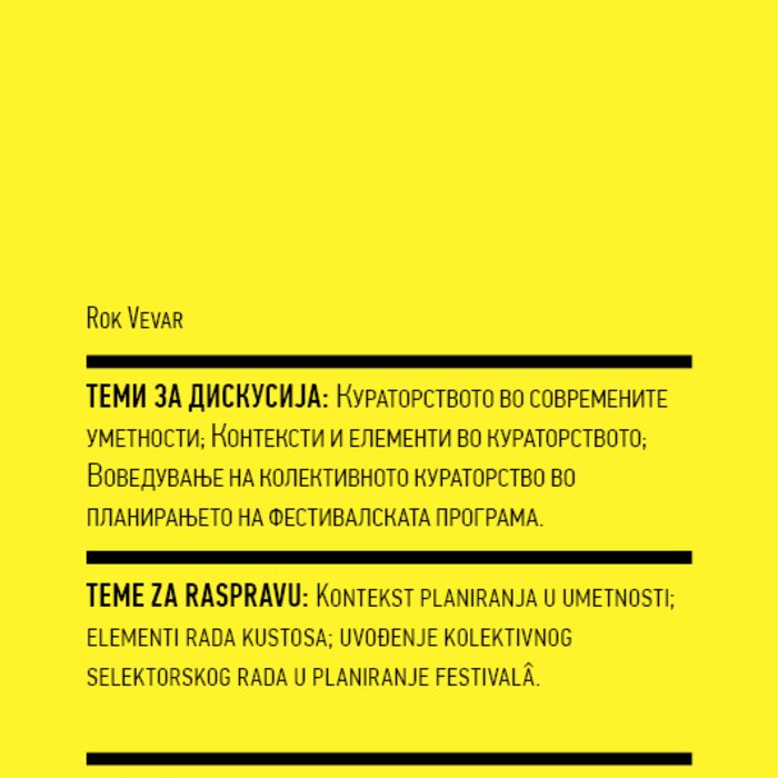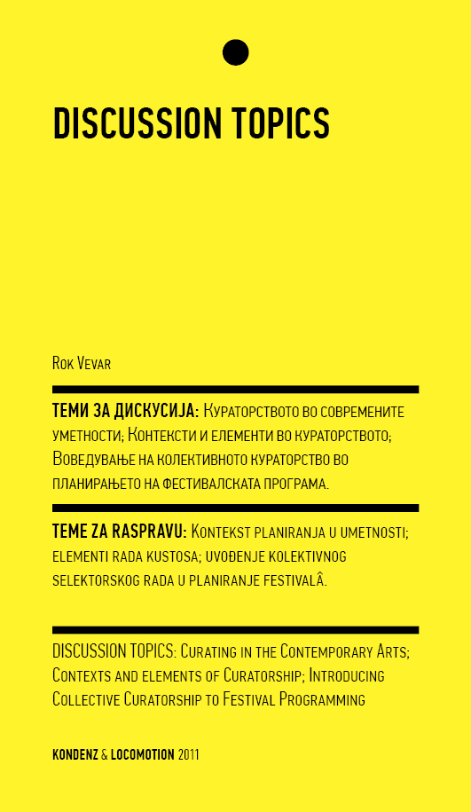 This year, an underlying interest of both festivals concerns the issue of selecting and organising in the performing arts; in other words, curating (which used to be called programming). Curating in contemporary performing arts has been increasingly discussed over the last five to ten years, lately also in publications (e.g. Frakcija, No. 55: Curating Performing Arts, summer 2010), conferences (e.g. Beyond Curating: Strategies of Knowledge Transfer in Dance, Performance and Visual Arts, Essen, Germany, January 2011), workshops (e.g. Towards Curating as a Critical Practice, Novi Sad, Serbia, April 2011), and festivals (e.g. Pleskavica, Ljubljana, Slovenia, June 2011).
