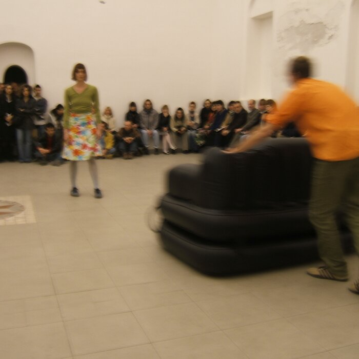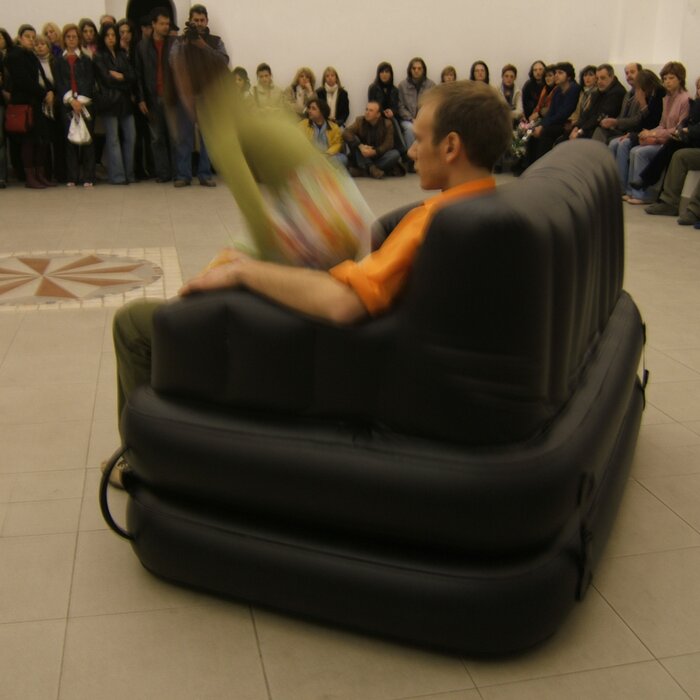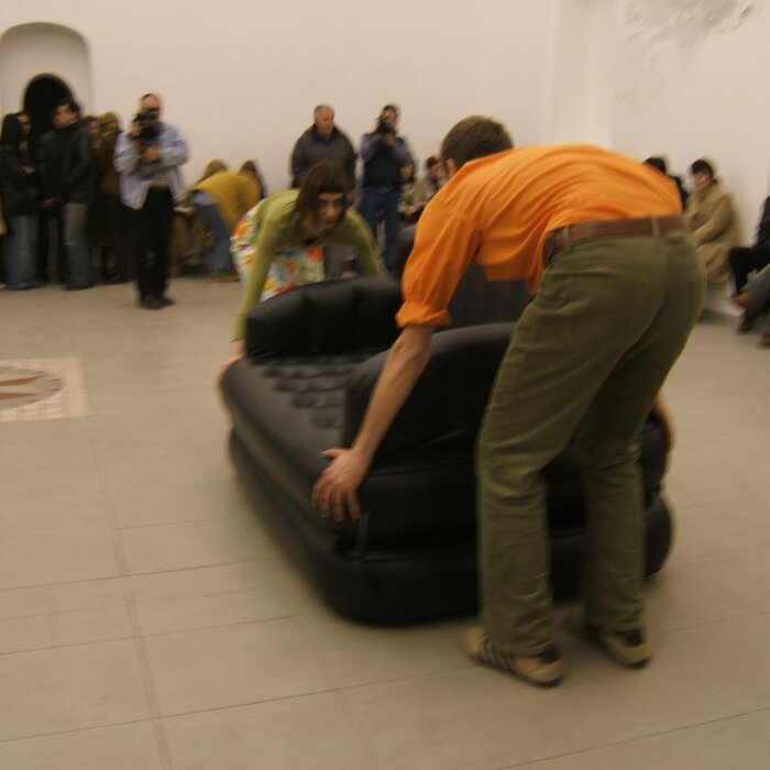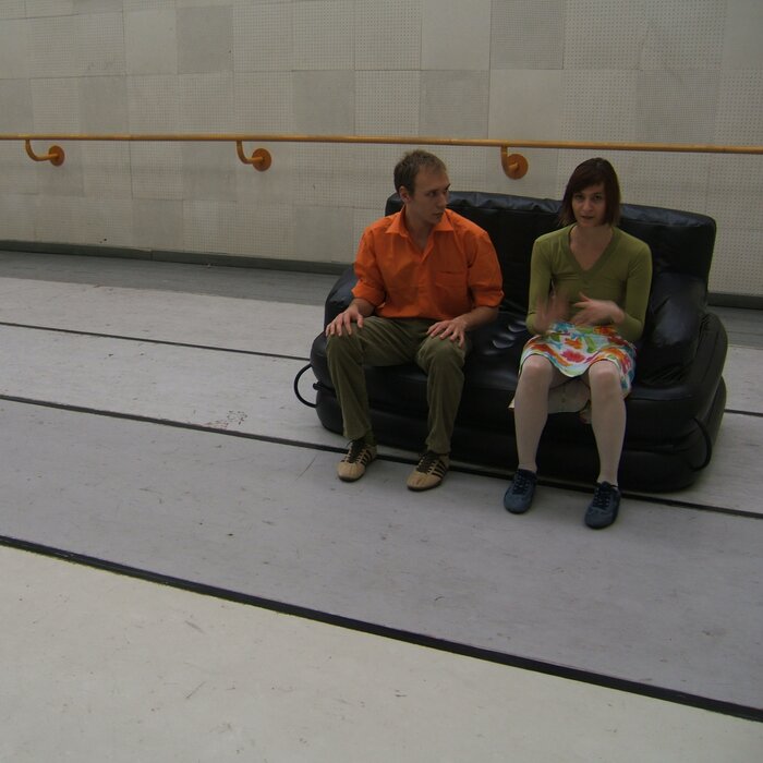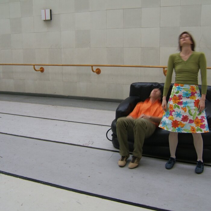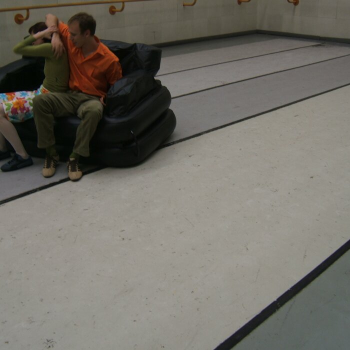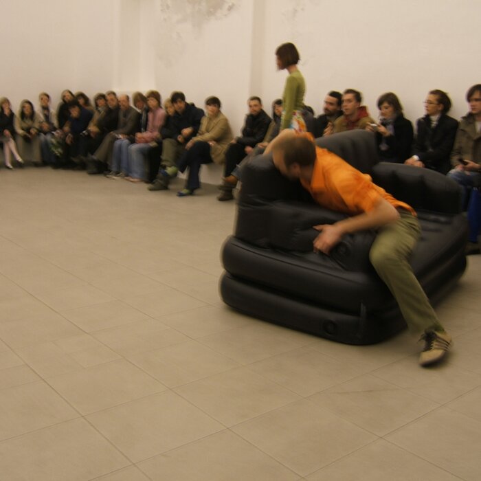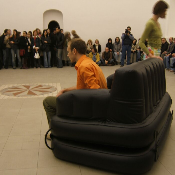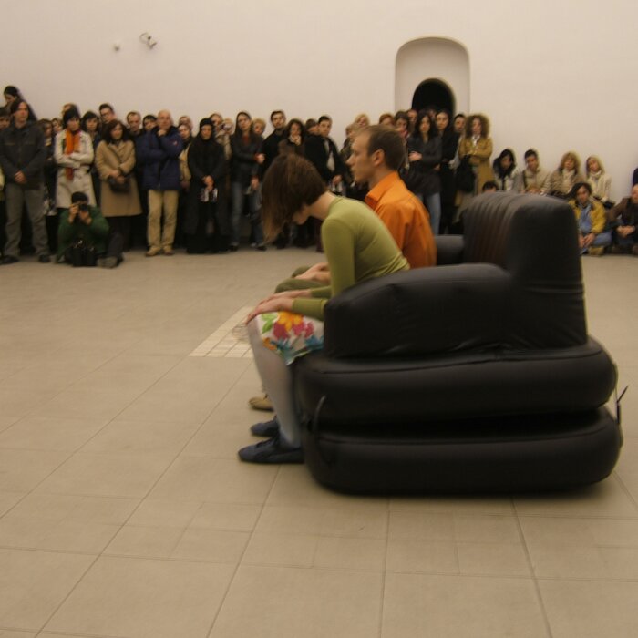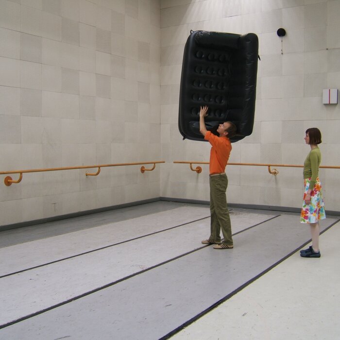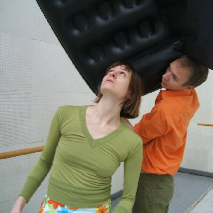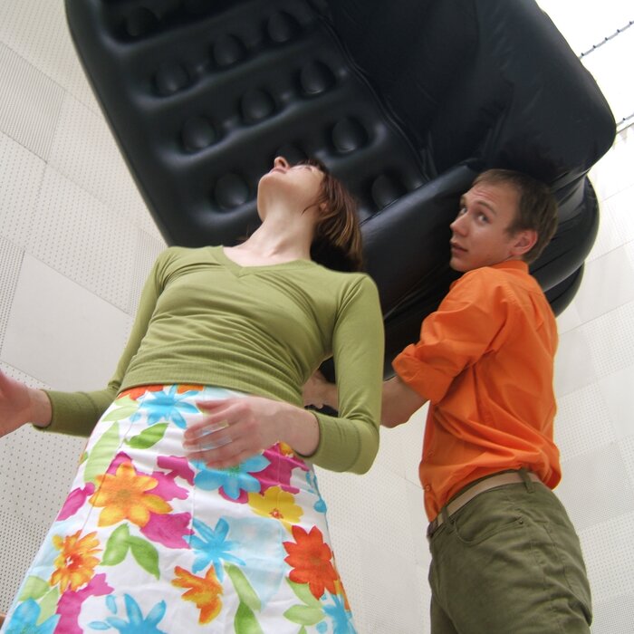 A collaboration between two artists choreographer and composer who explore the relation in sound and movement. The inspiration of the work stems from the different conditions created as a result of the relationship between a man, woman and a air filled - plastic couch..