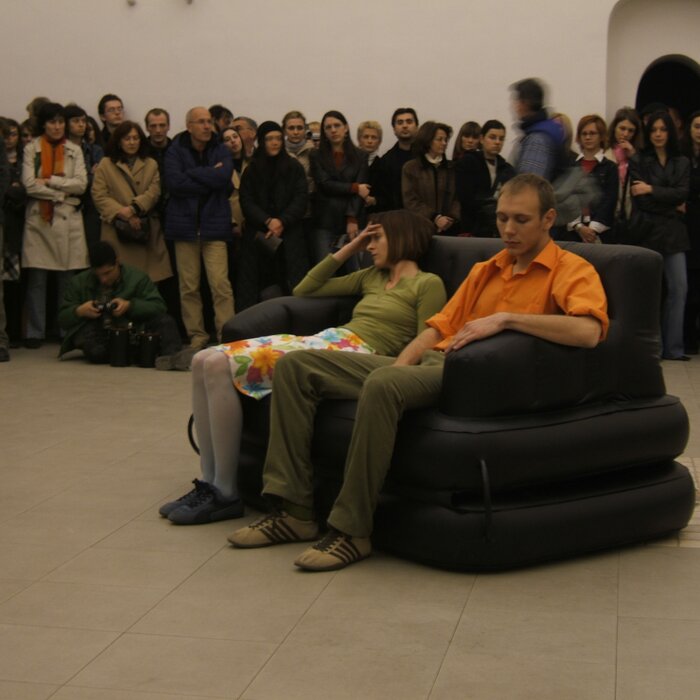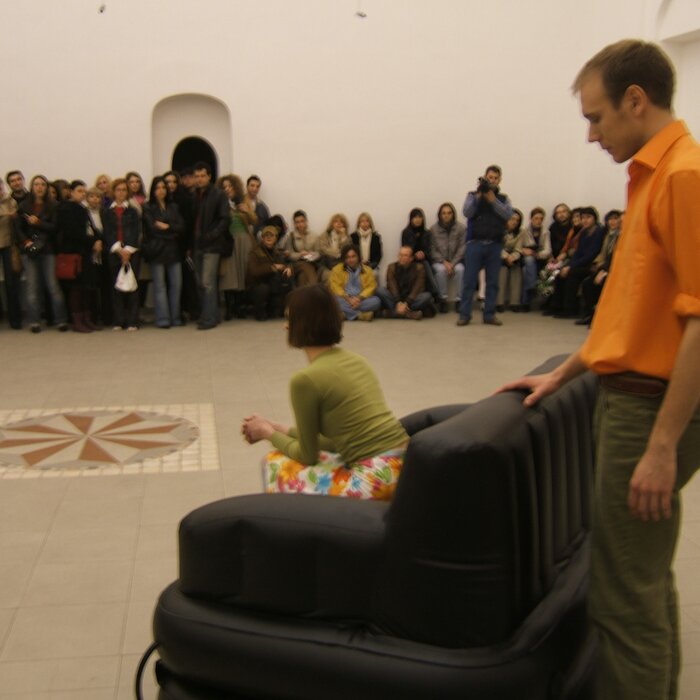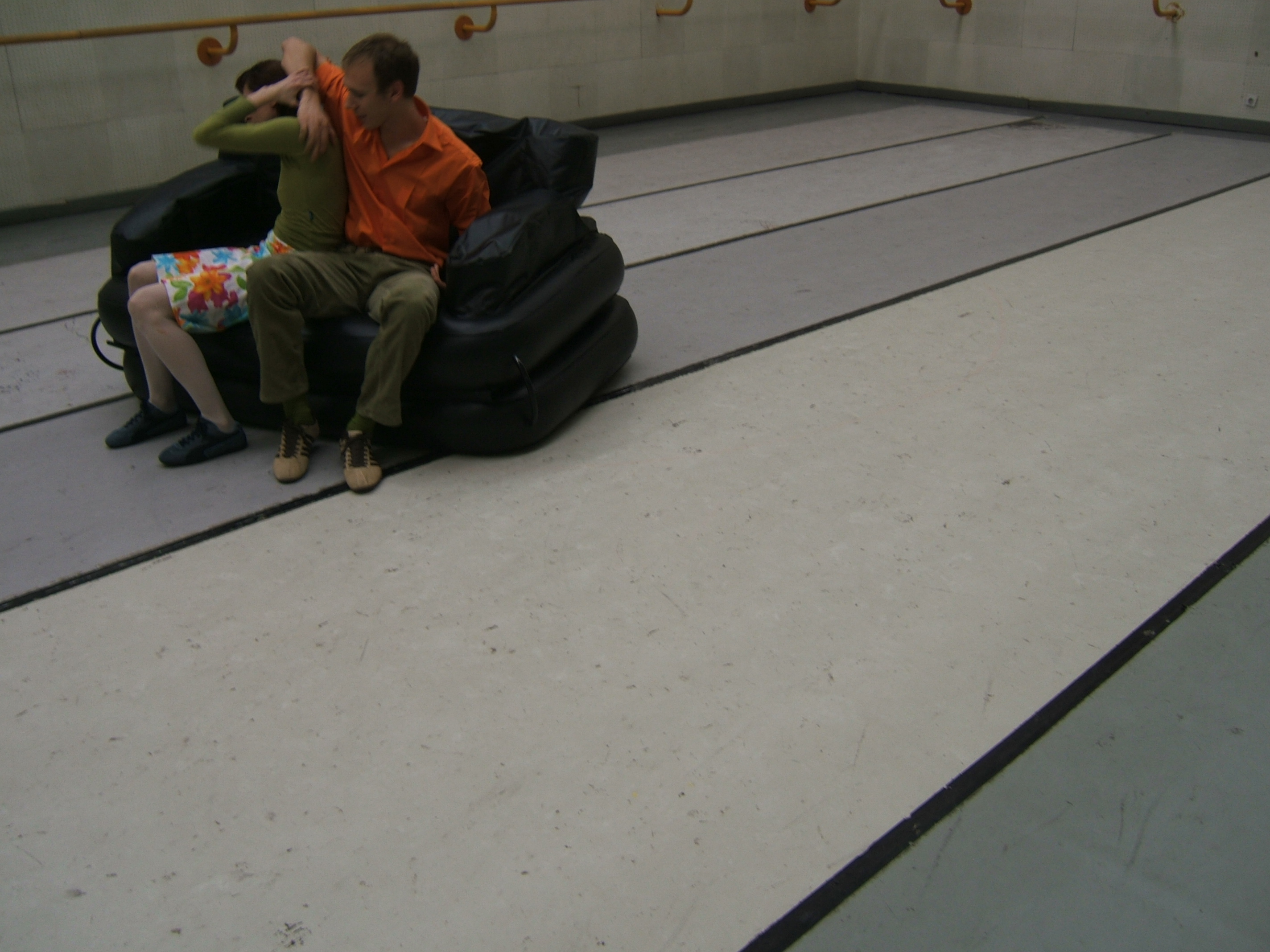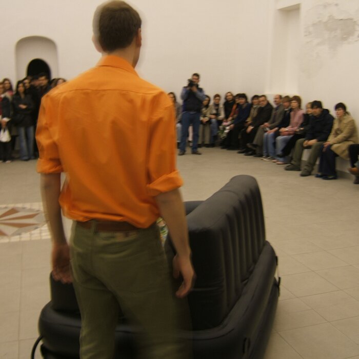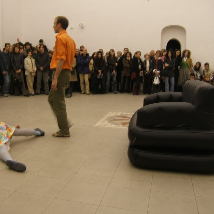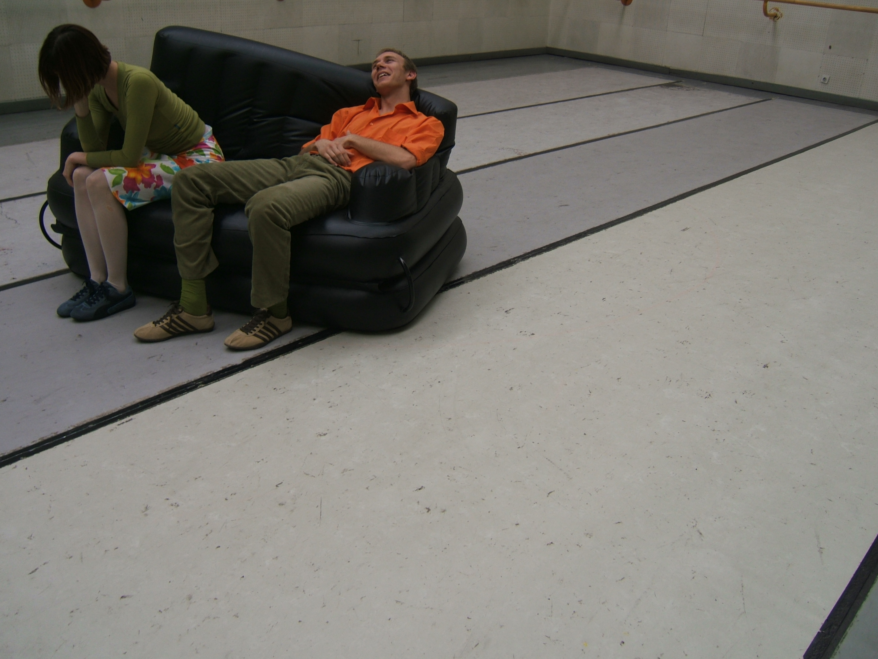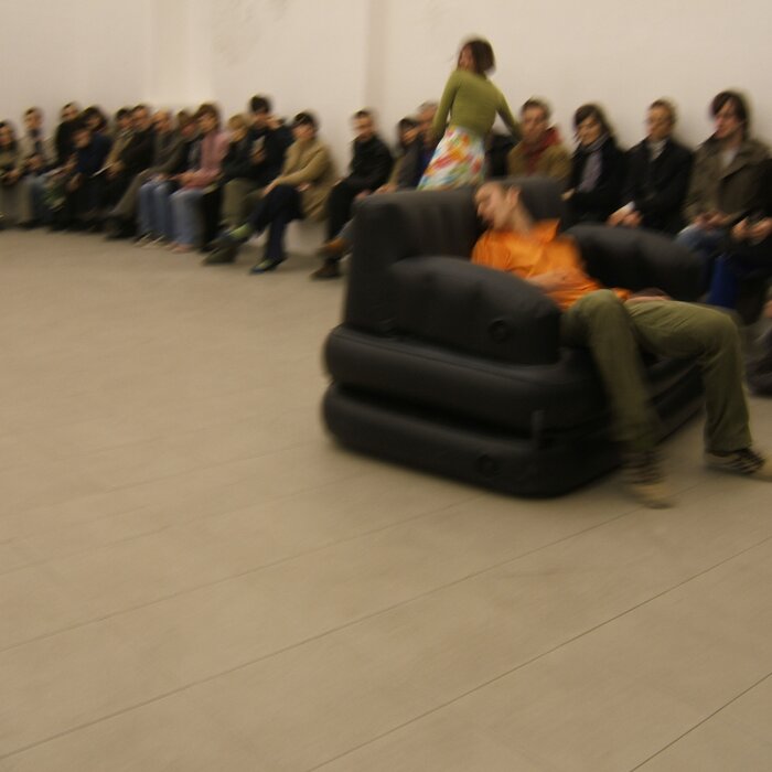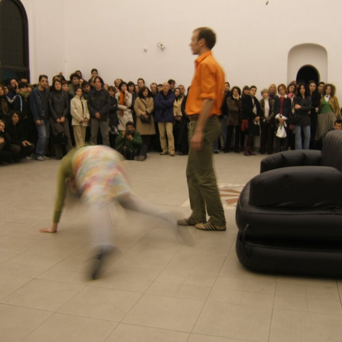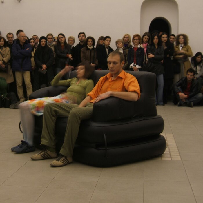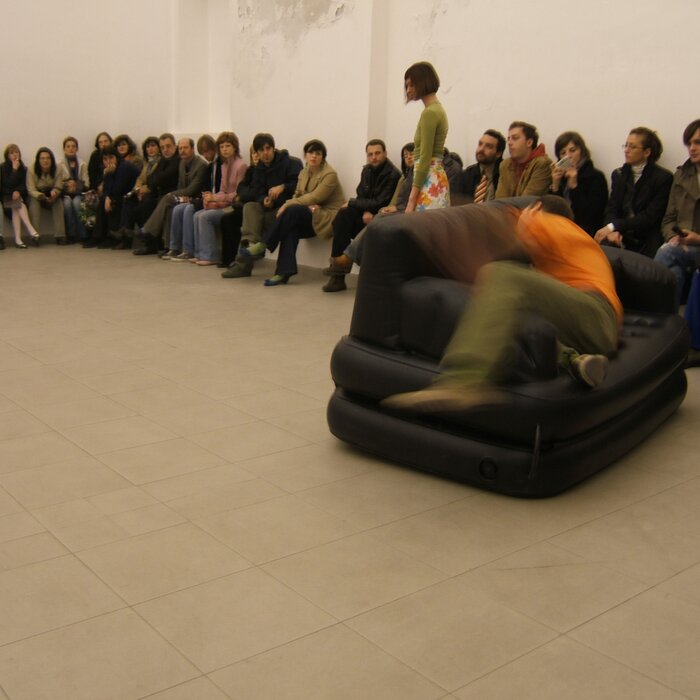 A collaboration between two artists choreographer and composer who explore the relation in sound and movement. The inspiration of the work stems from the different conditions created as a result of the relationship between a man, woman and a air filled - plastic couch..