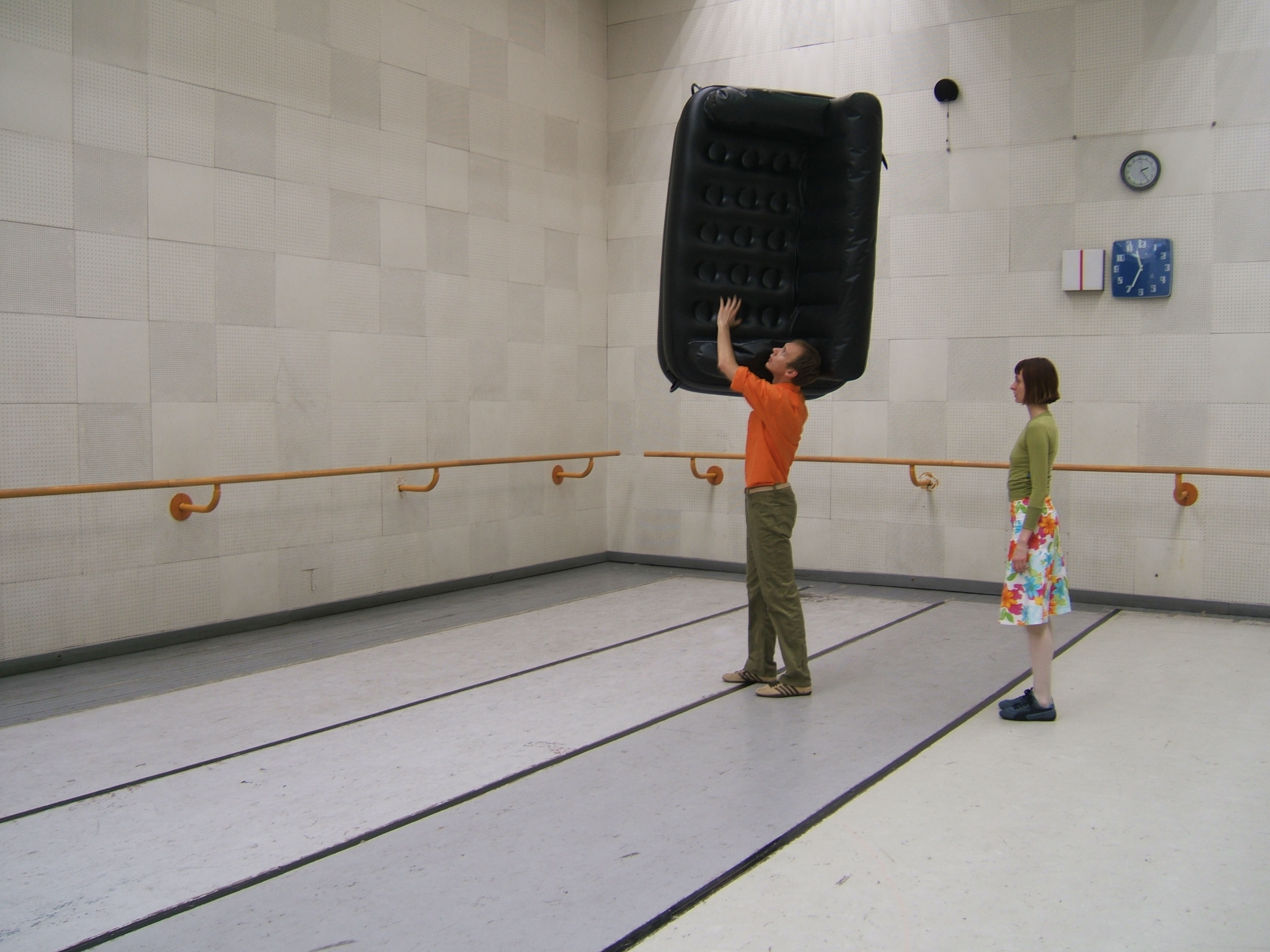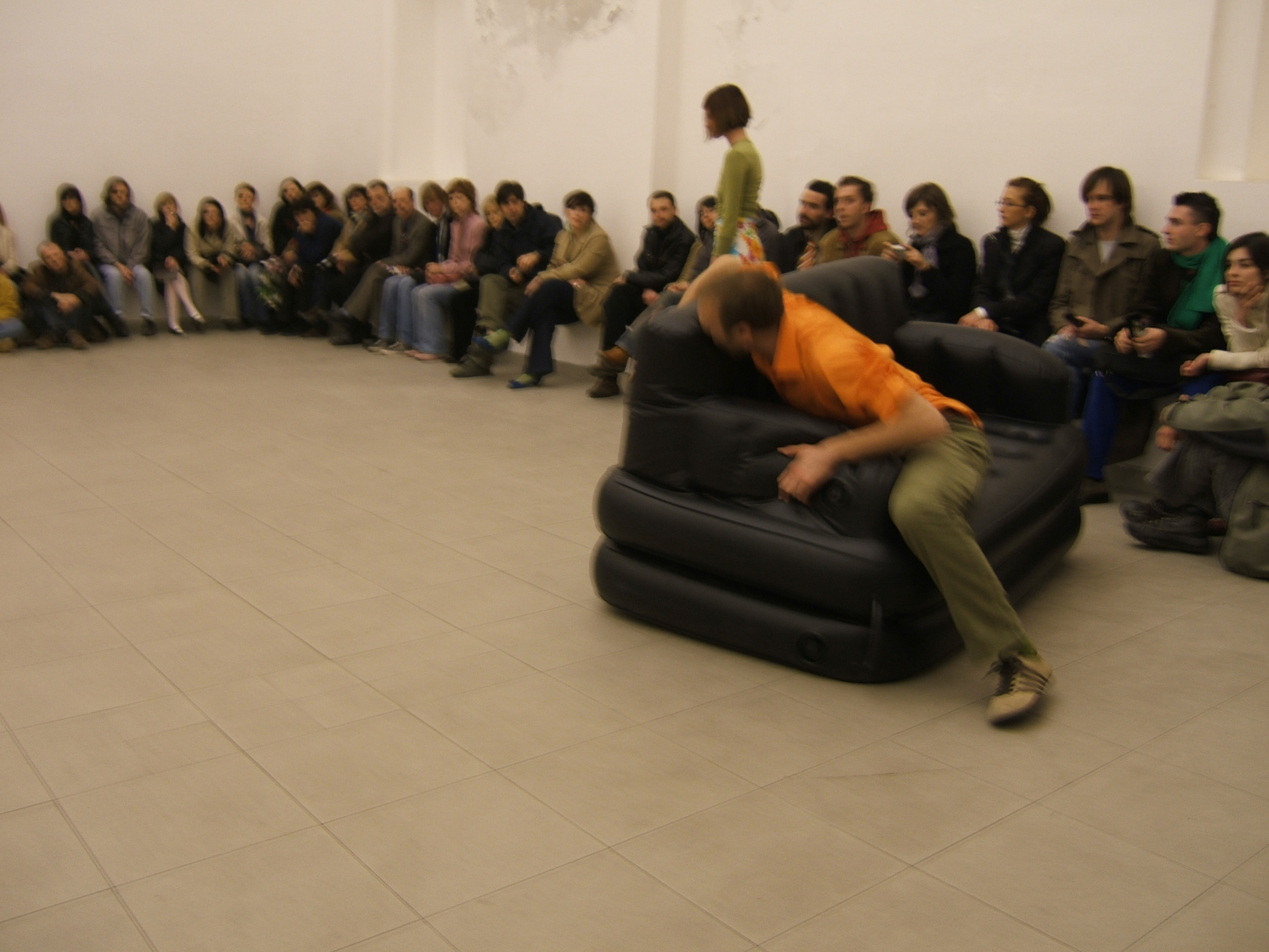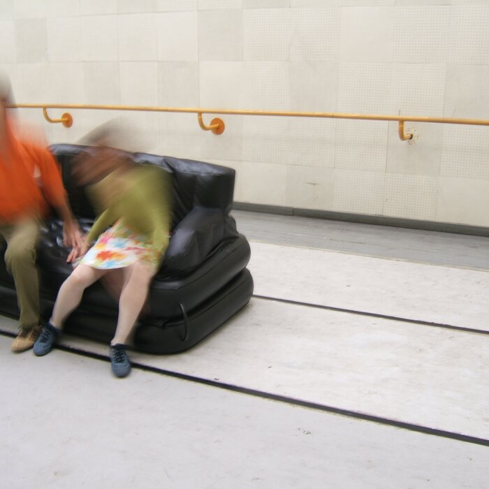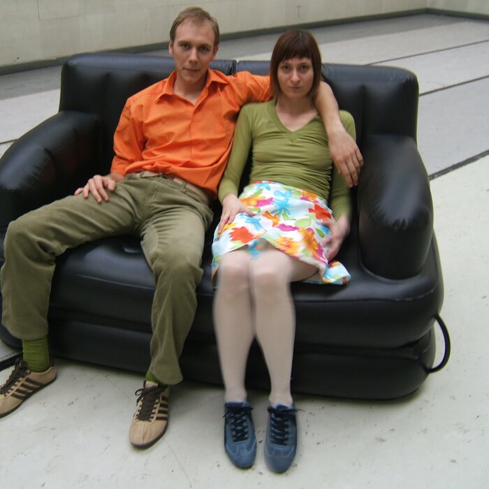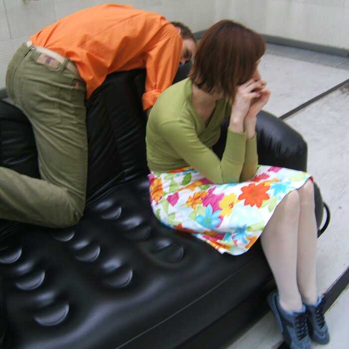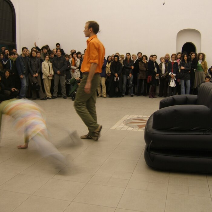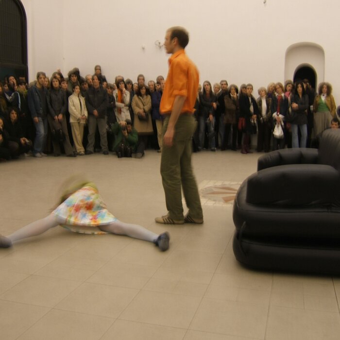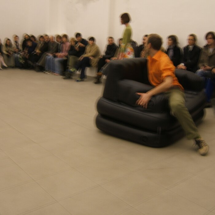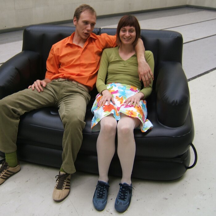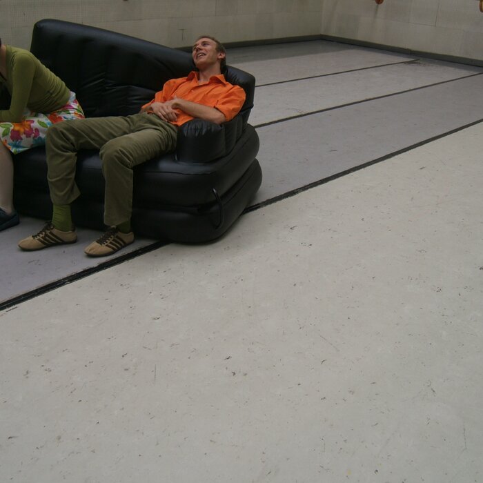 A collaboration between two artists choreographer and composer who explore the relation in sound and movement. The inspiration of the work stems from the different conditions created as a result of the relationship between a man, woman and a air filled - plastic couch..