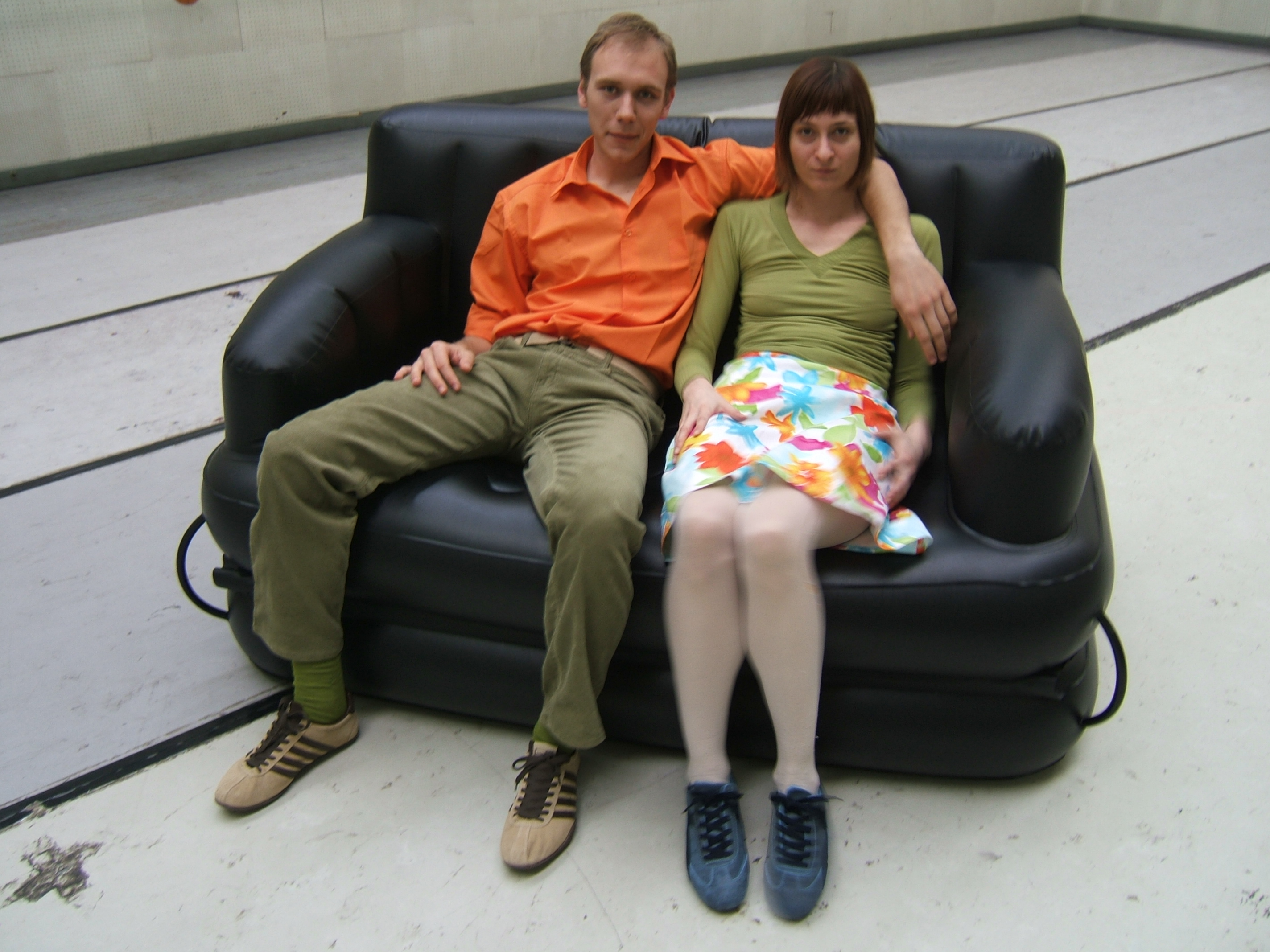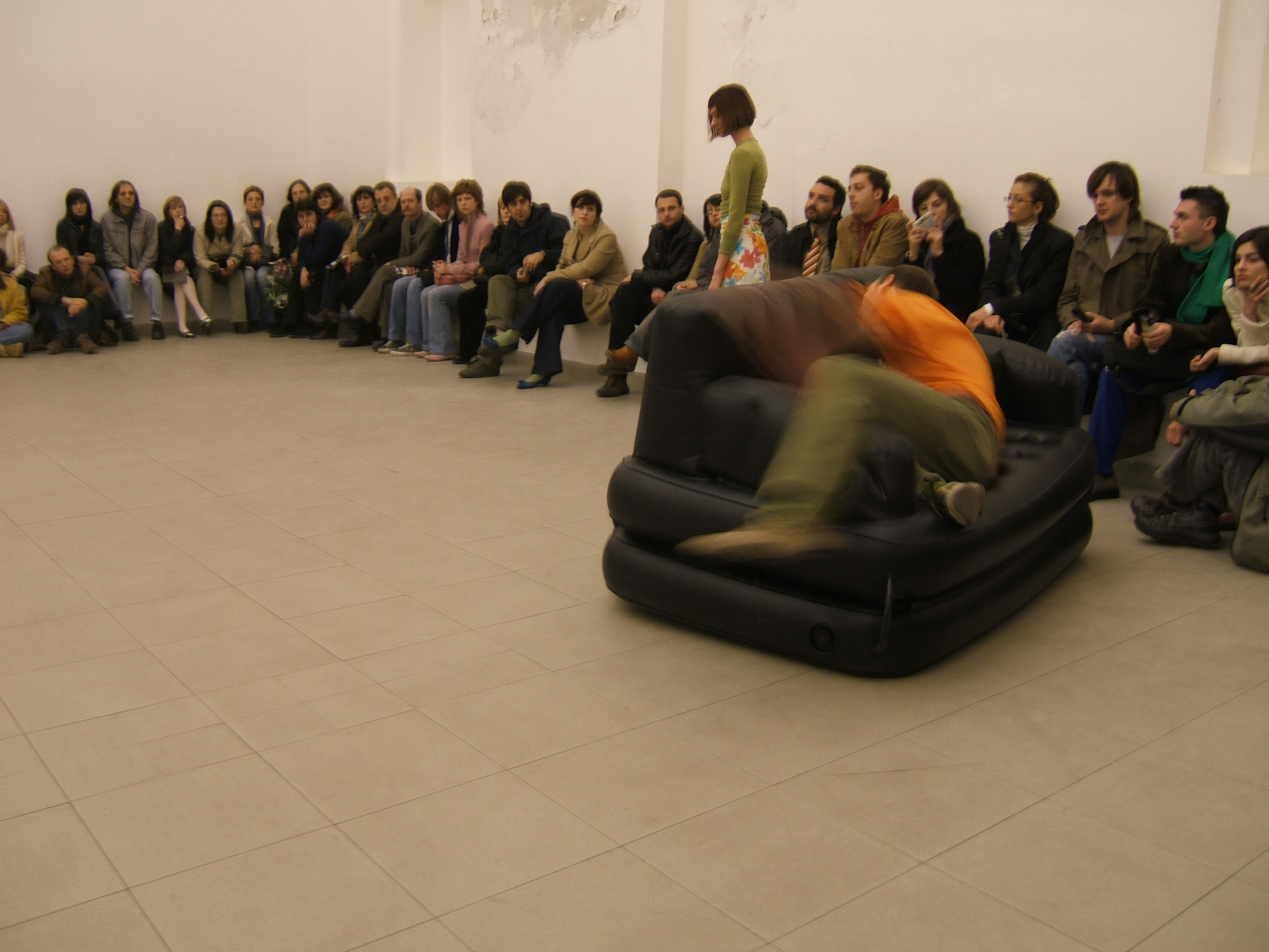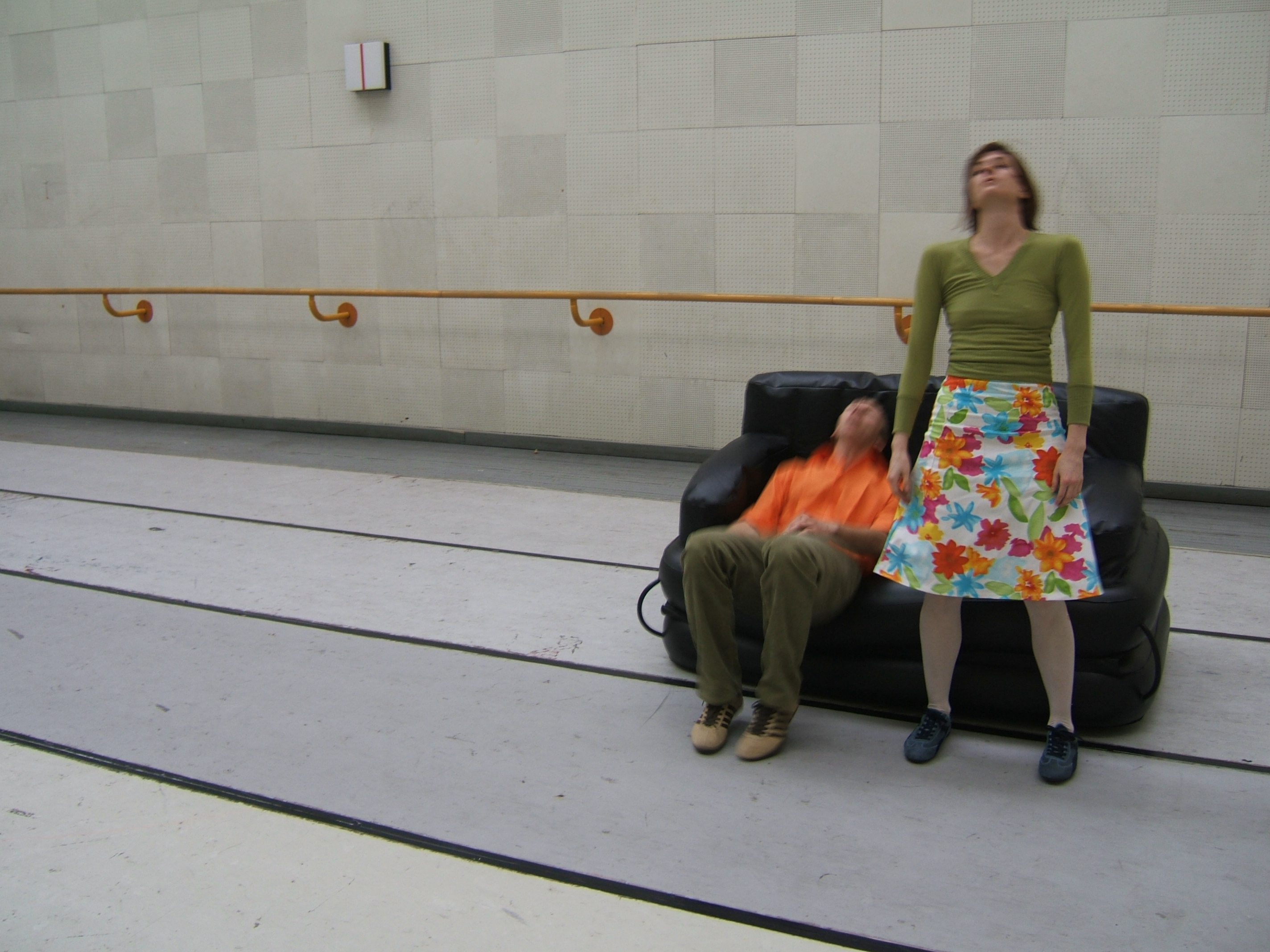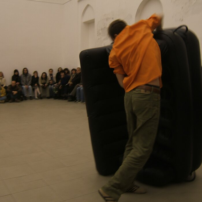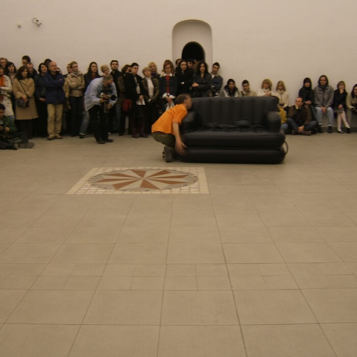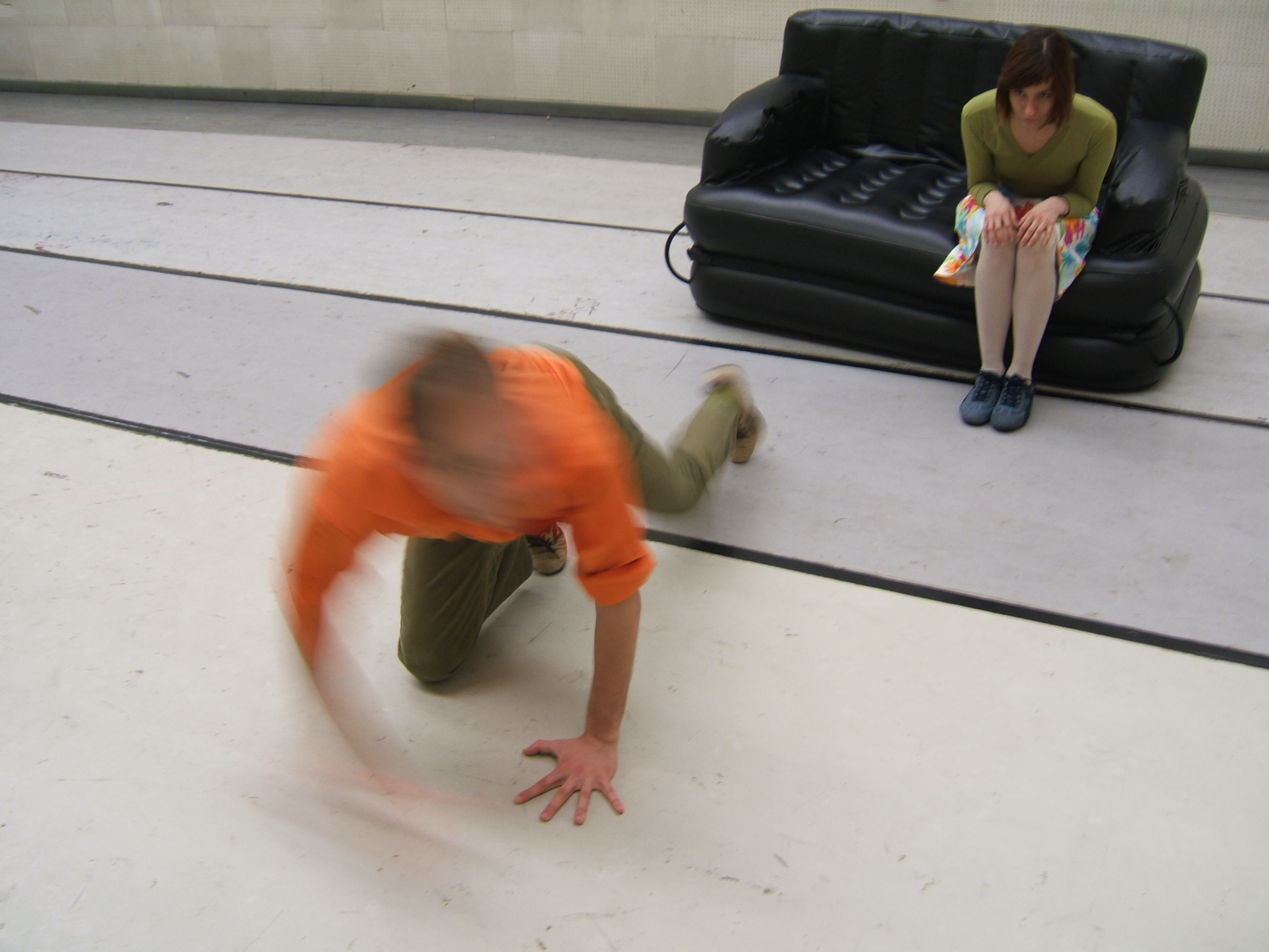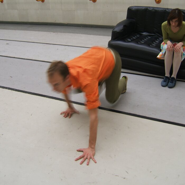 A collaboration between two artists choreographer and composer who explore the relation in sound and movement. The inspiration of the work stems from the different conditions created as a result of the relationship between a man, woman and a air filled - plastic couch..