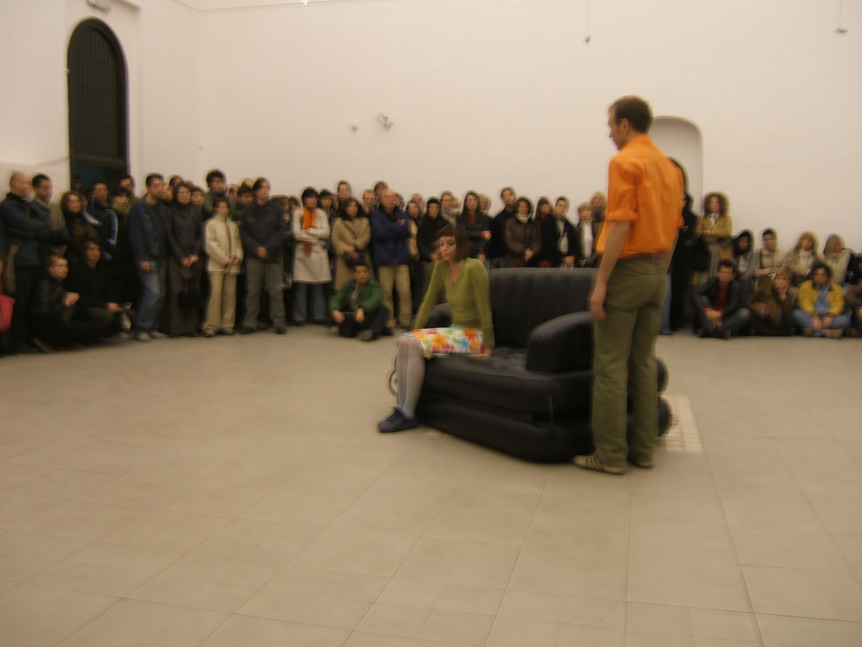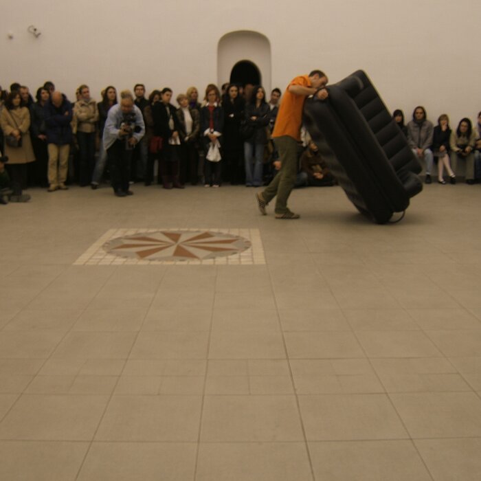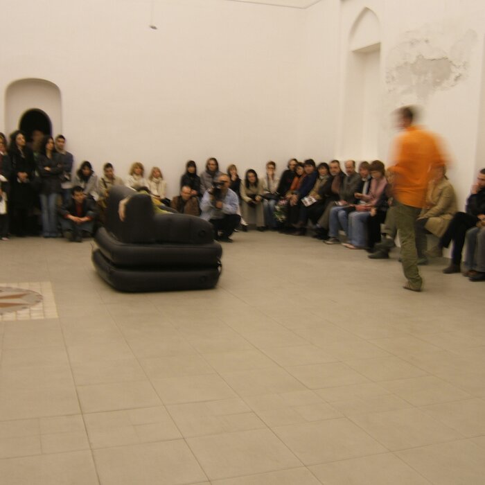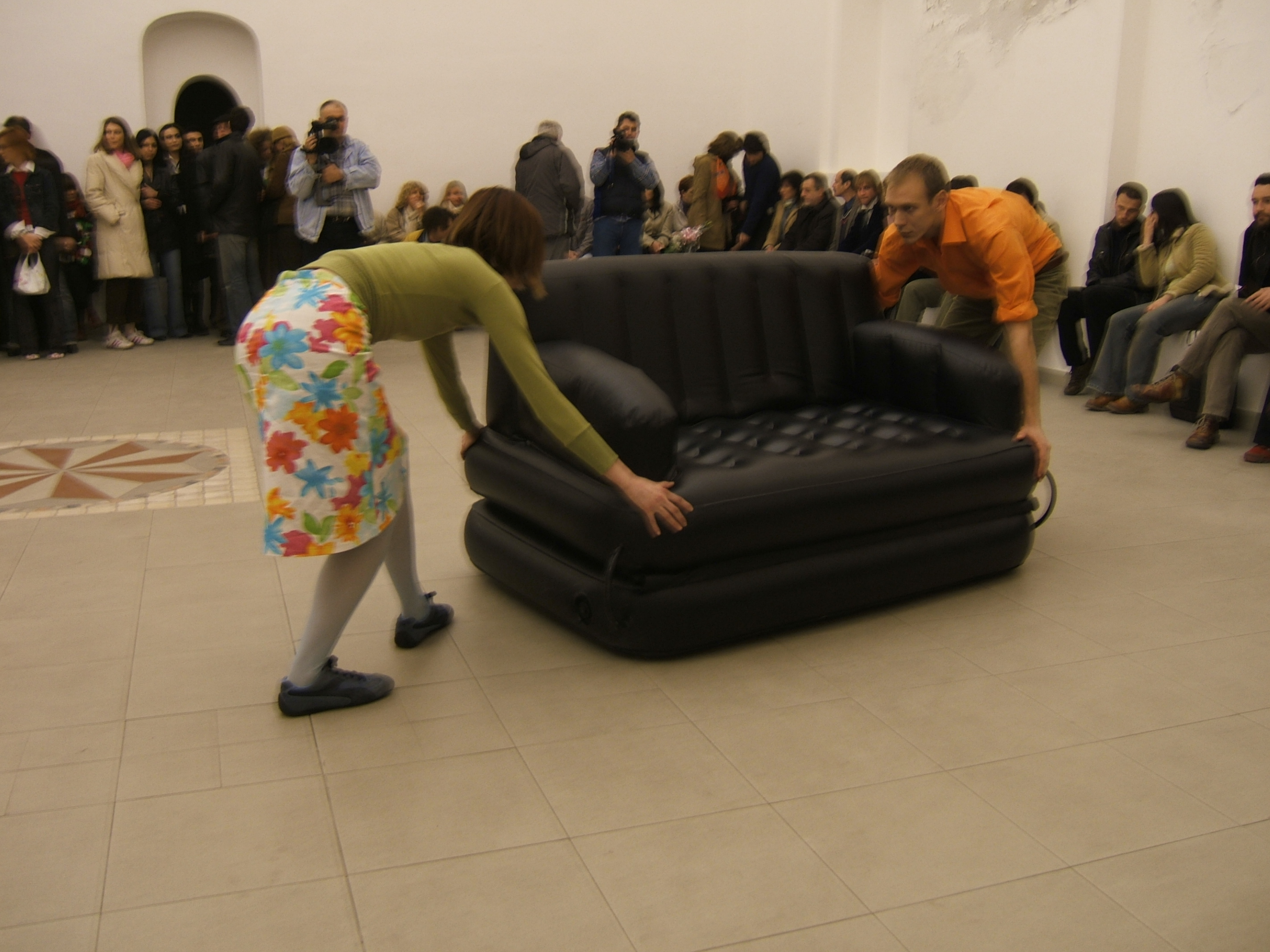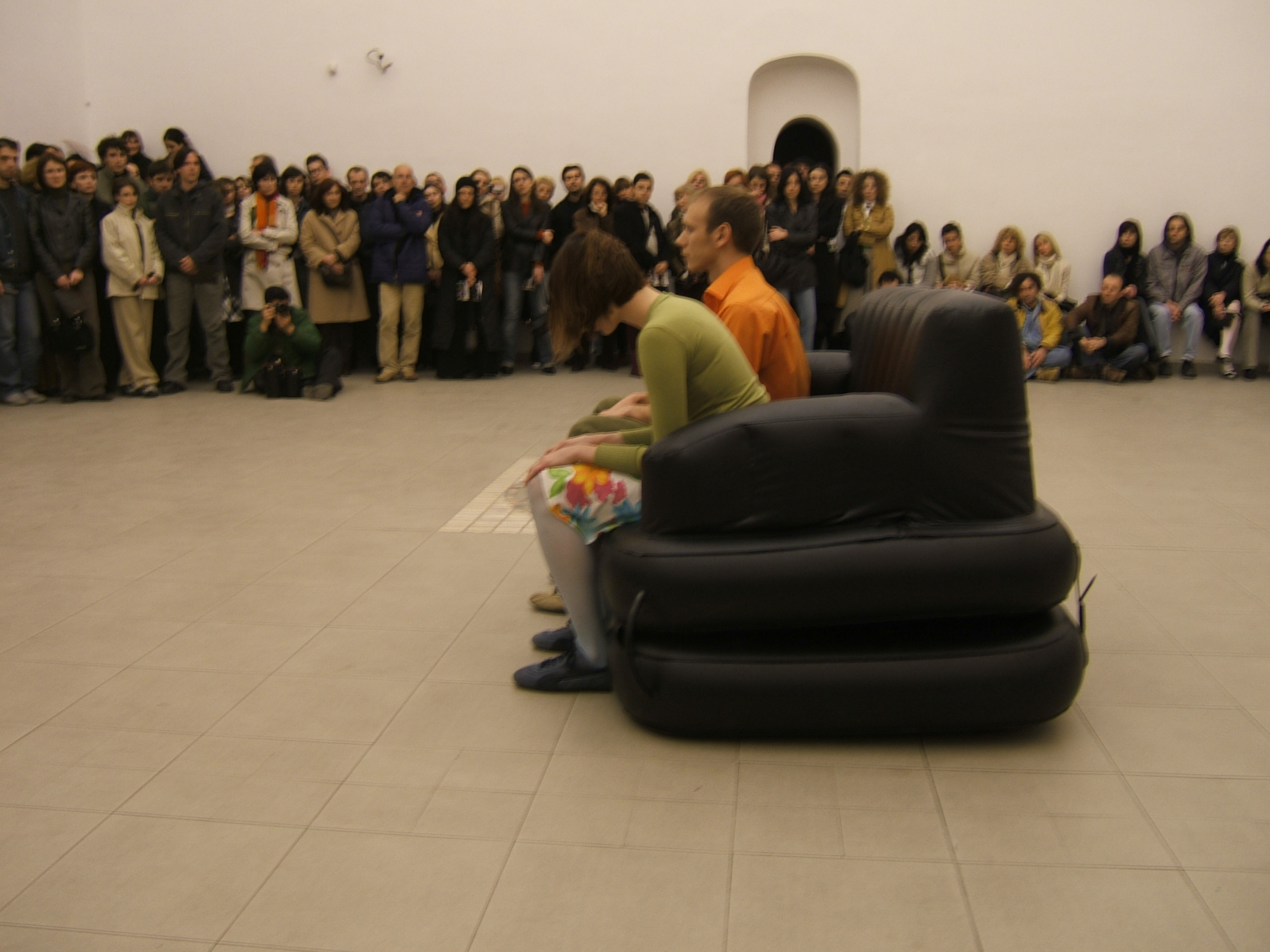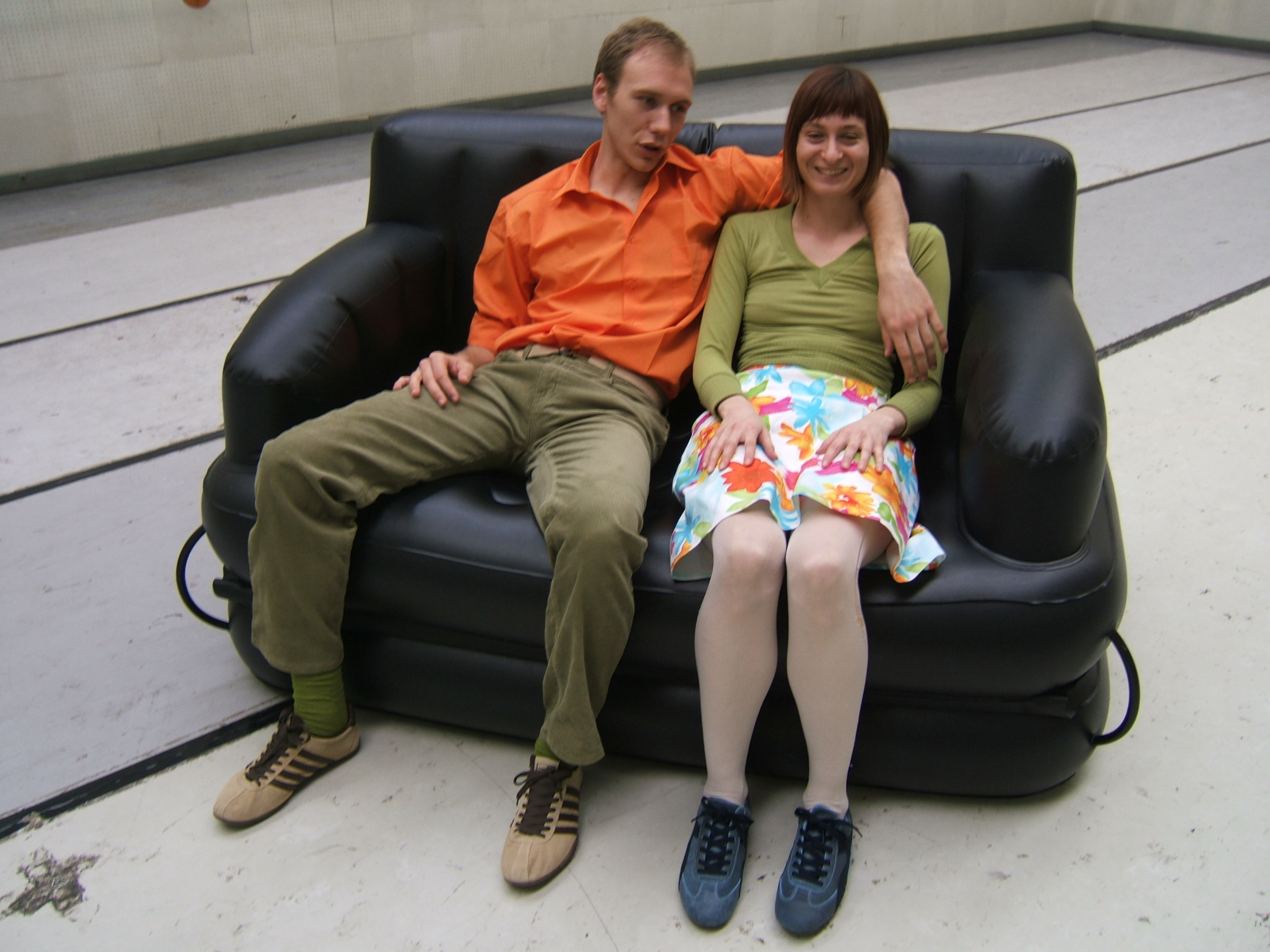 A collaboration between two artists choreographer and composer who explore the relation in sound and movement. The inspiration of the work stems from the different conditions created as a result of the relationship between a man, woman and a air filled - plastic couch..
