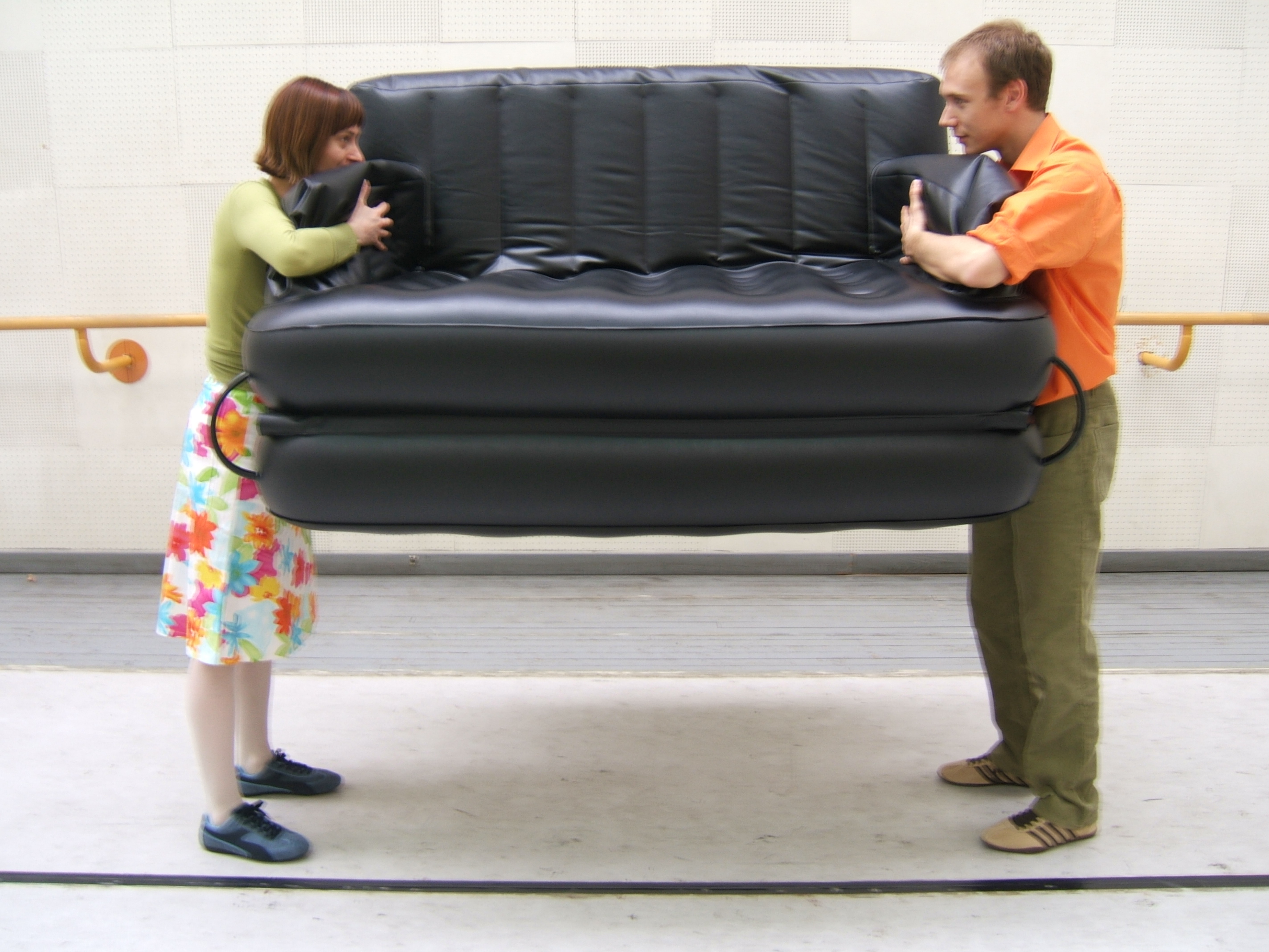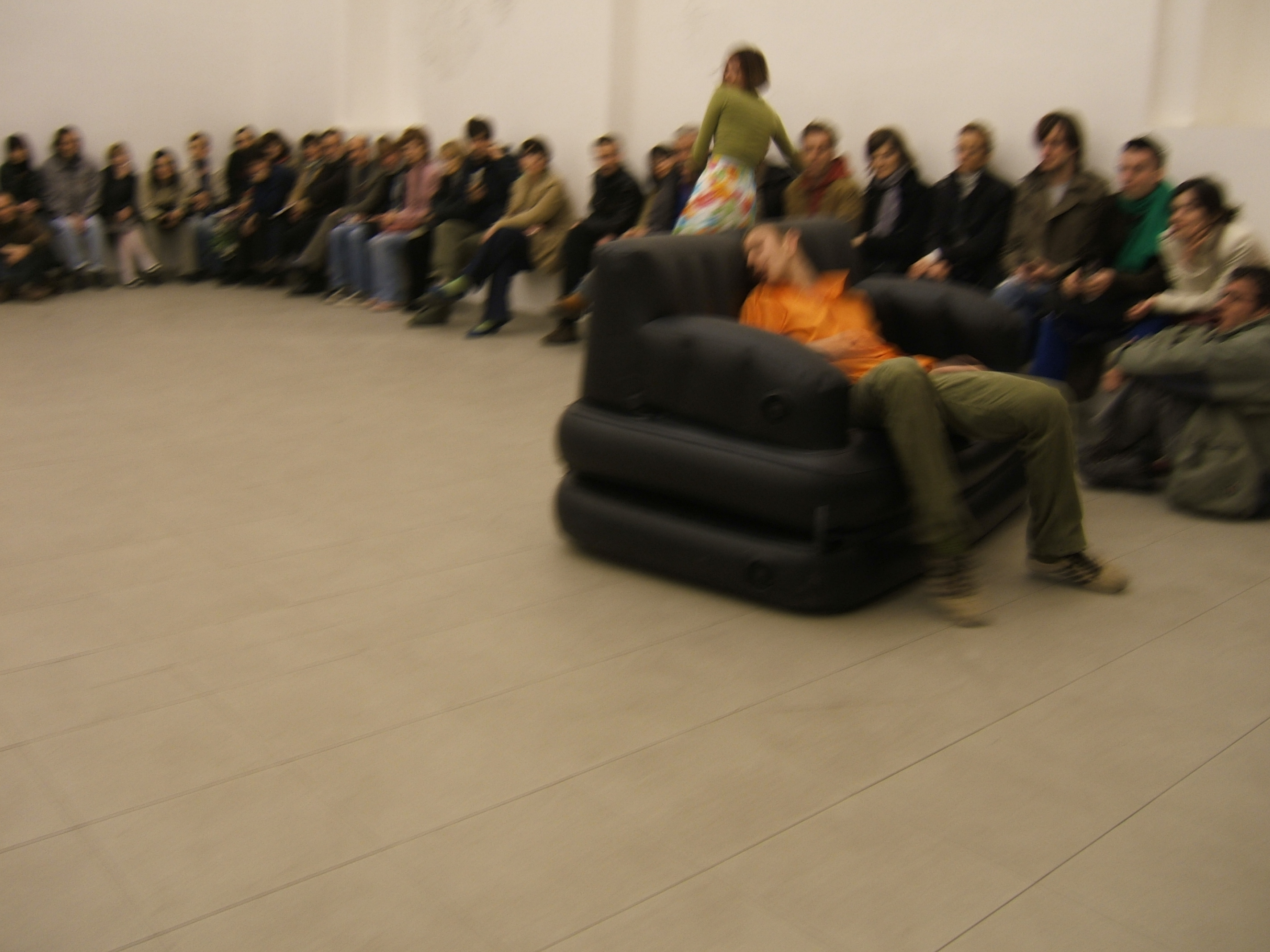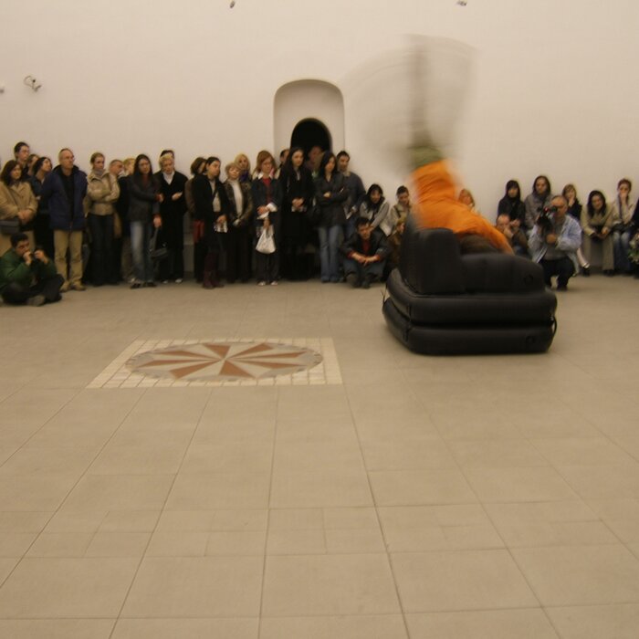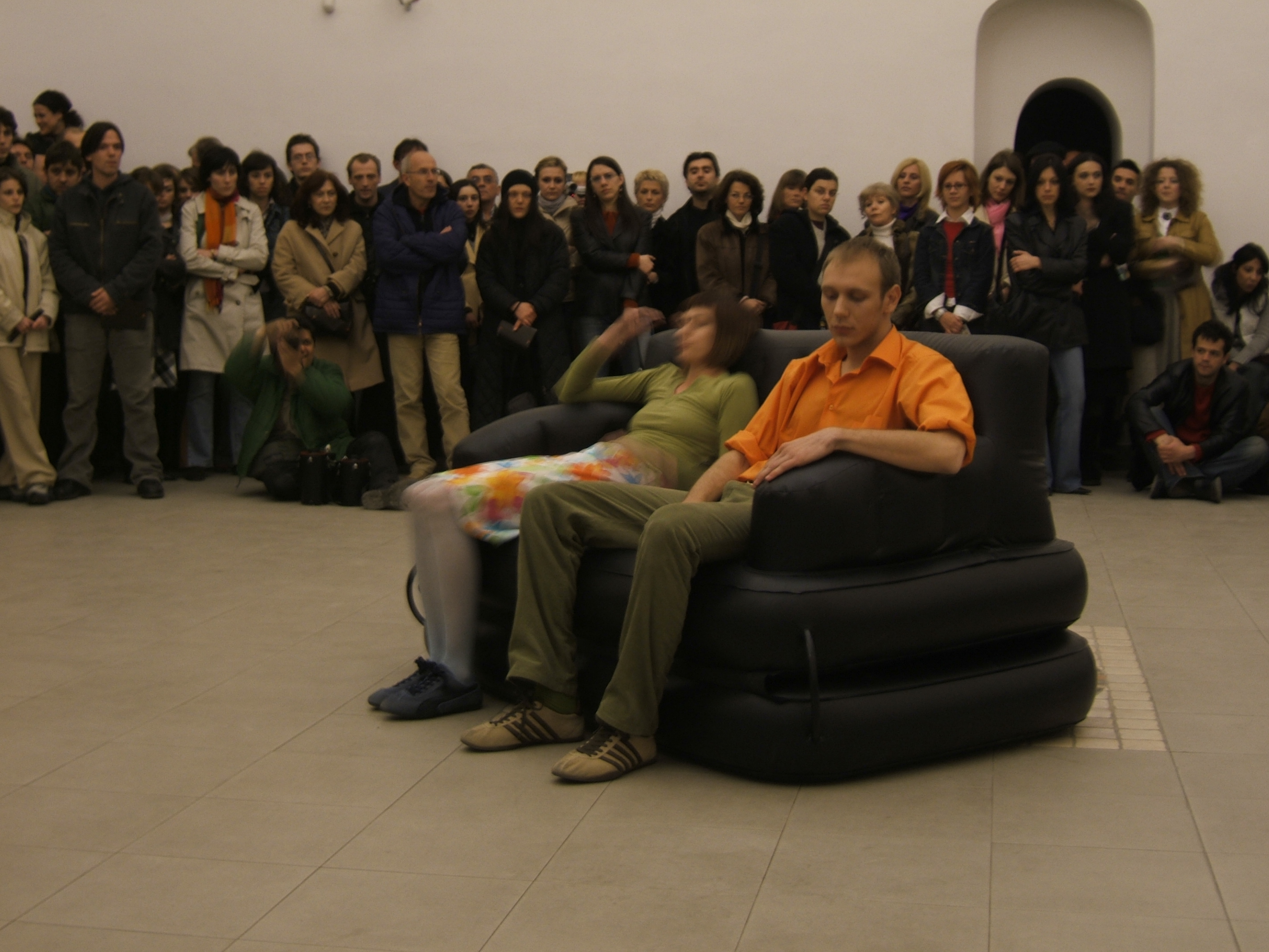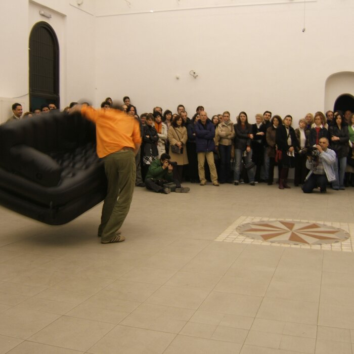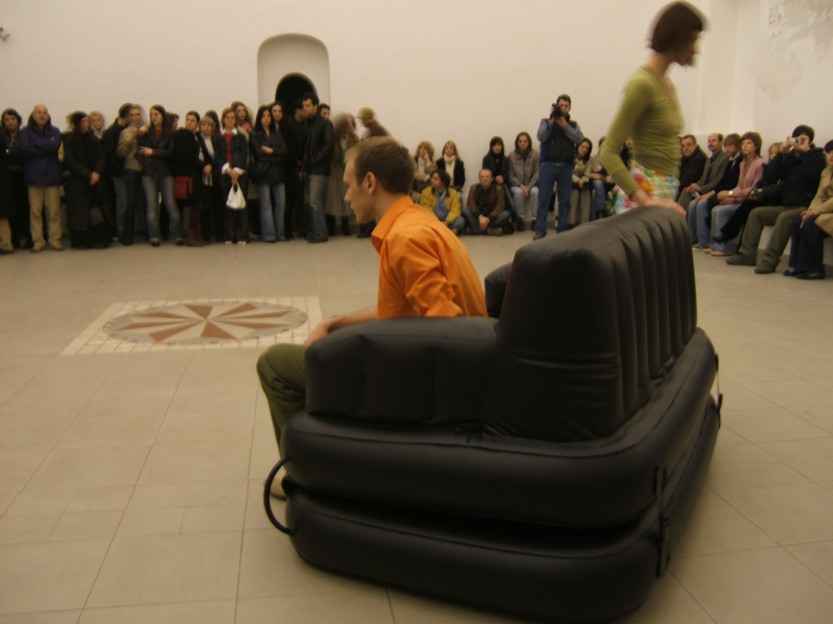 A collaboration between two artists choreographer and composer who explore the relation in sound and movement. The inspiration of the work stems from the different conditions created as a result of the relationship between a man, woman and a air filled - plastic couch..
