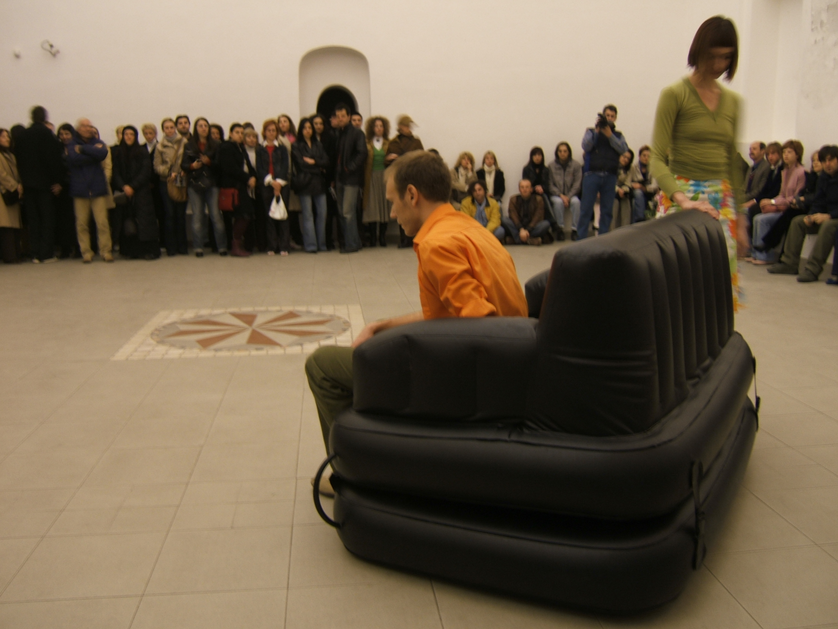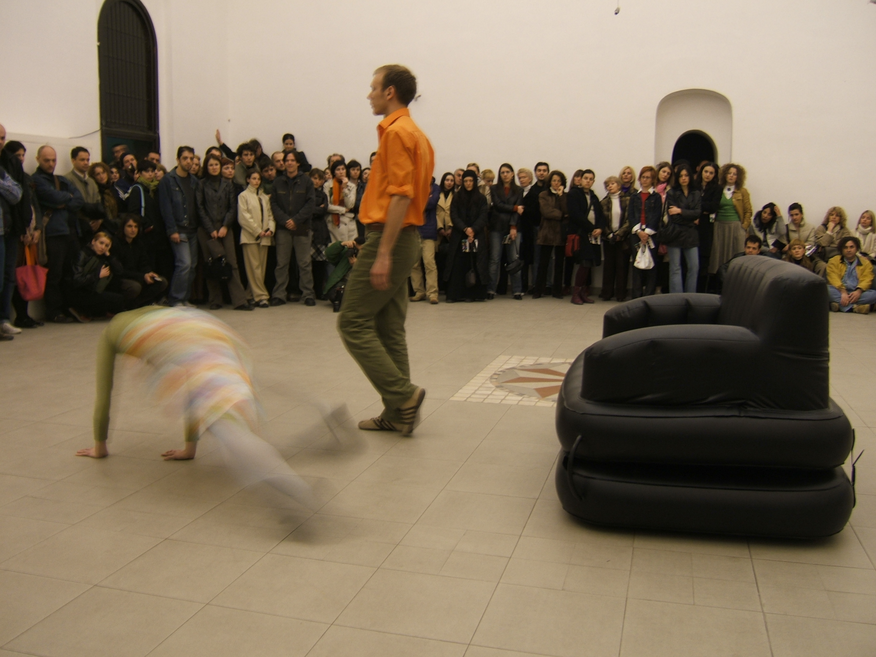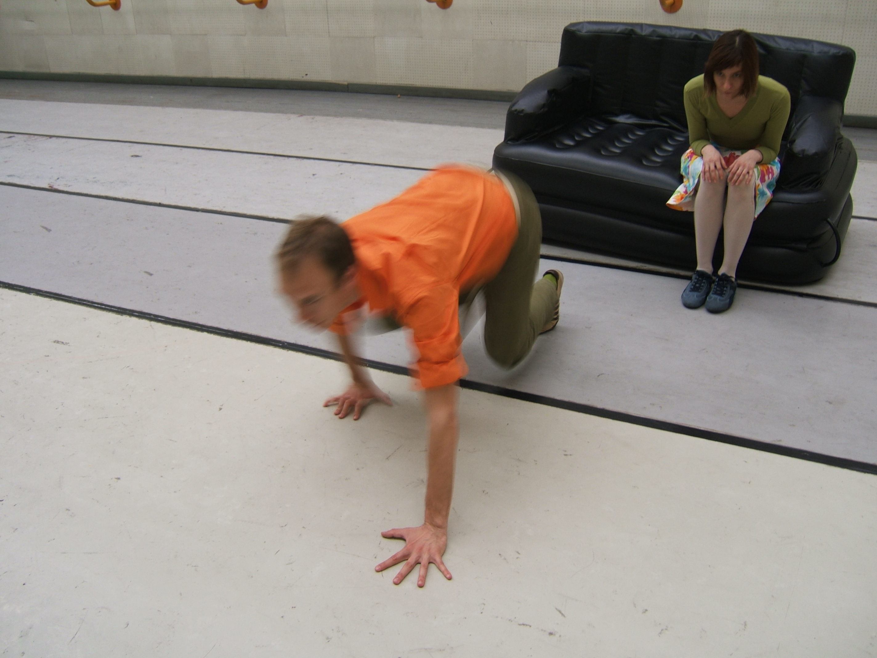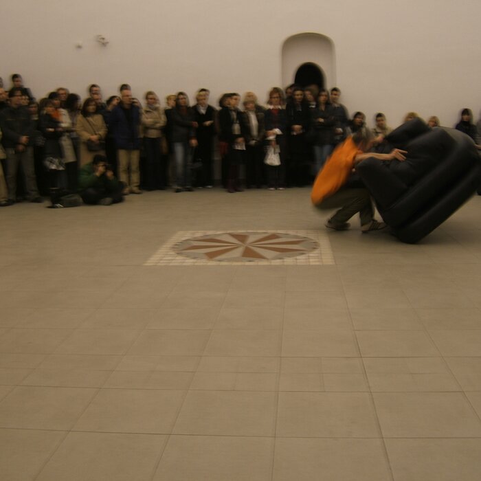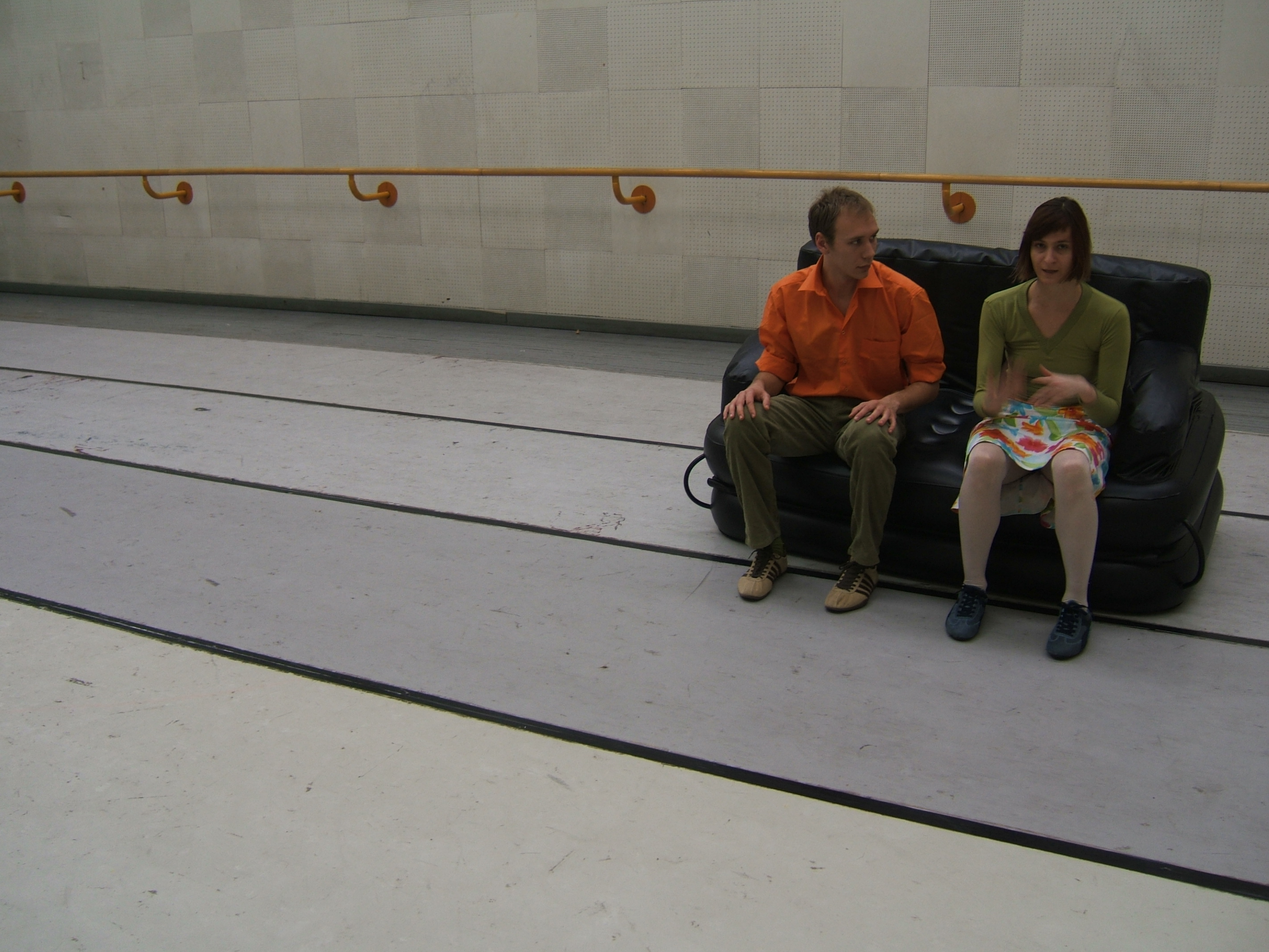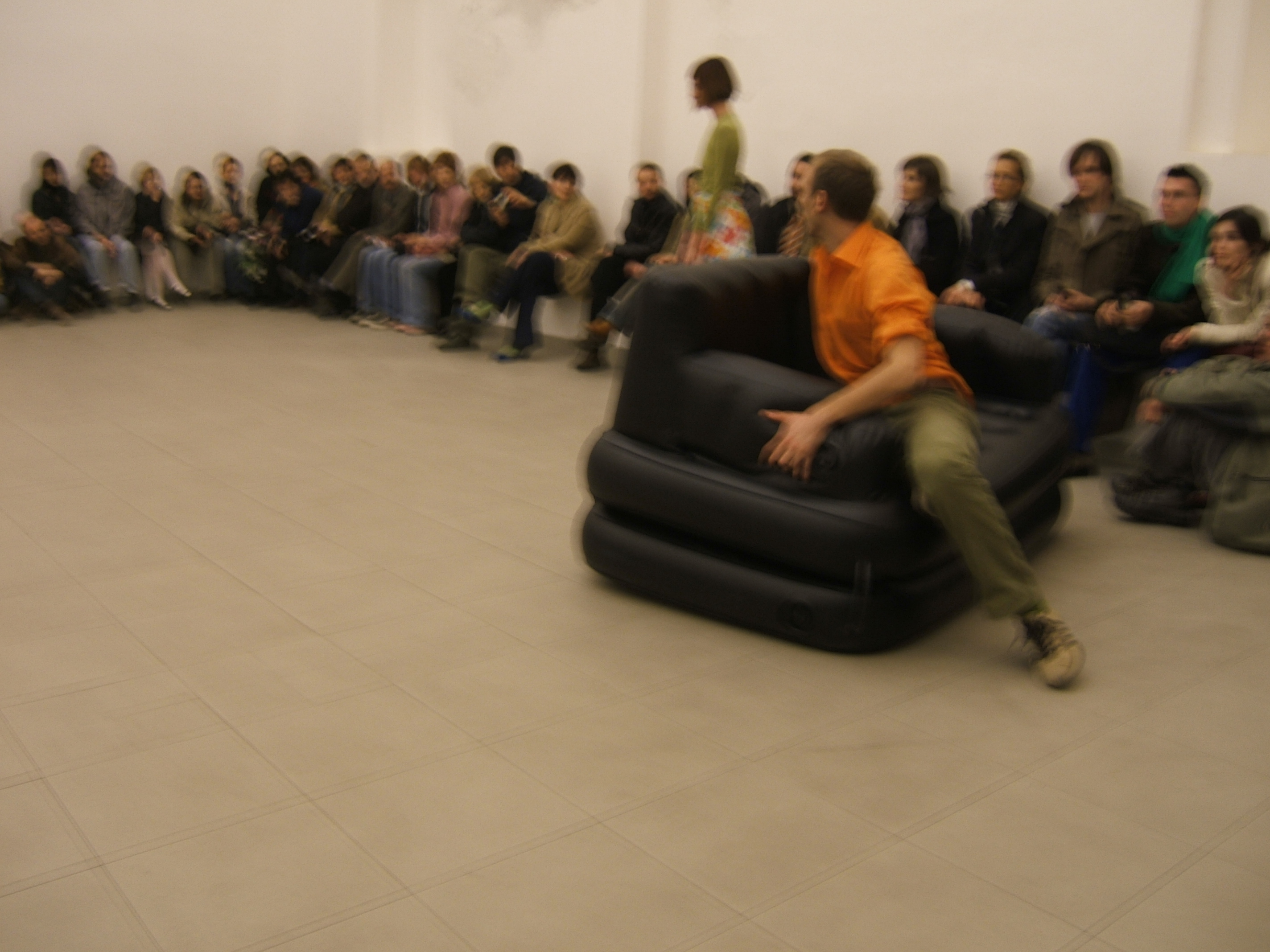 A collaboration between two artists choreographer and composer who explore the relation in sound and movement. The inspiration of the work stems from the different conditions created as a result of the relationship between a man, woman and a air filled - plastic couch..