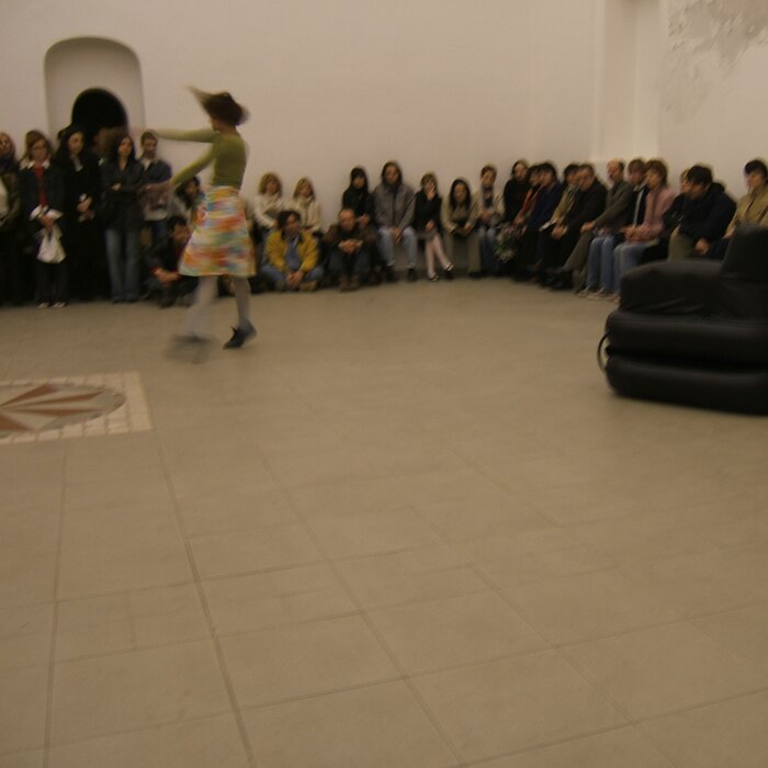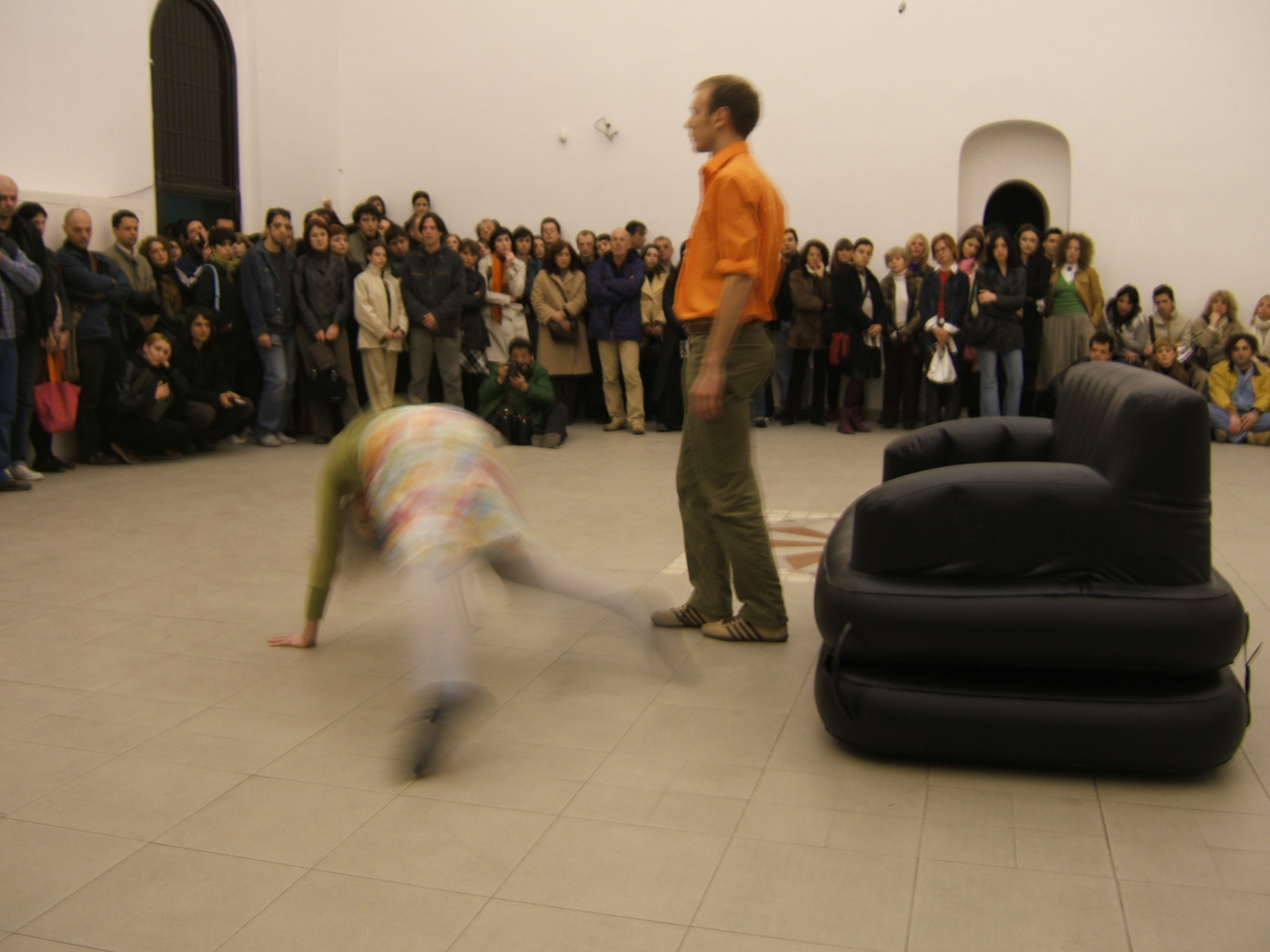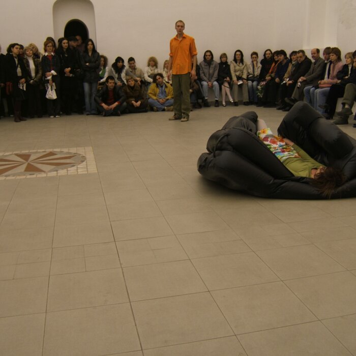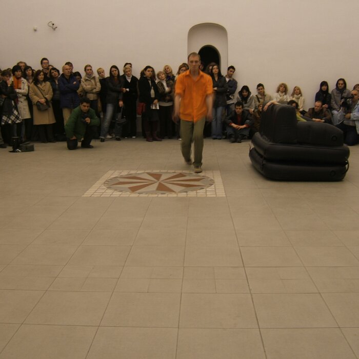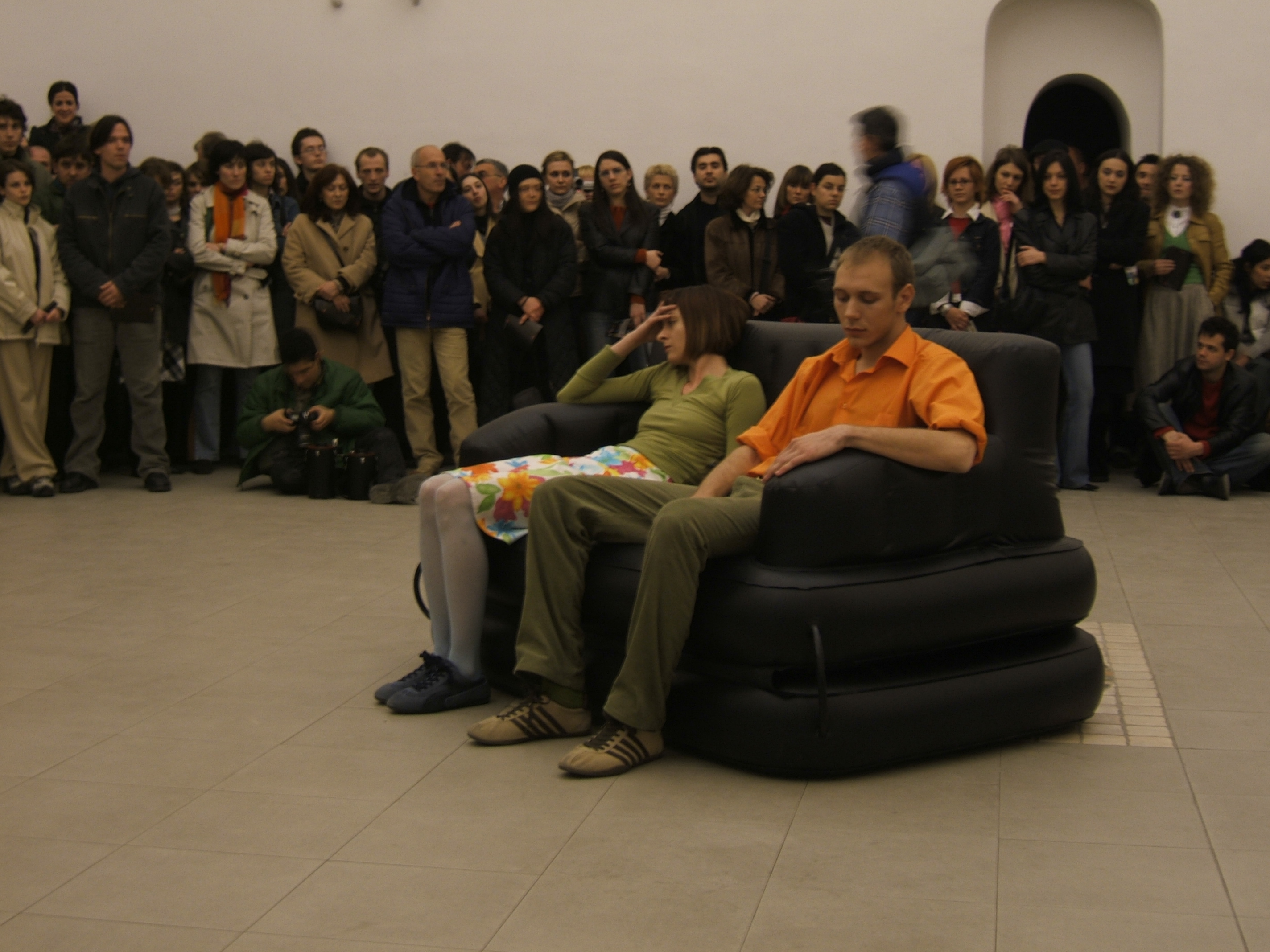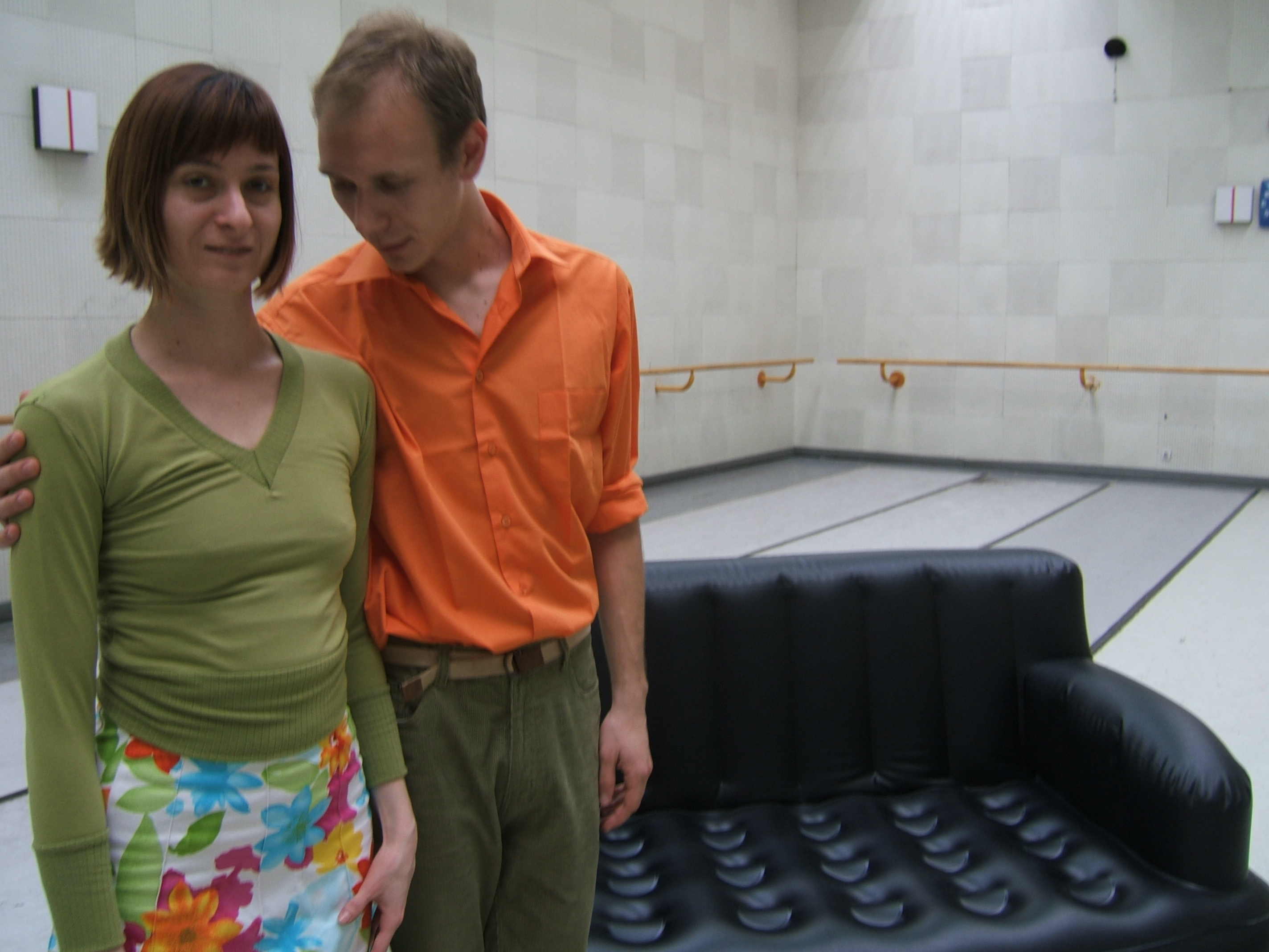A collaboration between two artists choreographer and composer who explore the relation in sound and movement. The inspiration of the work stems from the different conditions created as a result of the relationship between a man, woman and a air filled - plastic couch..