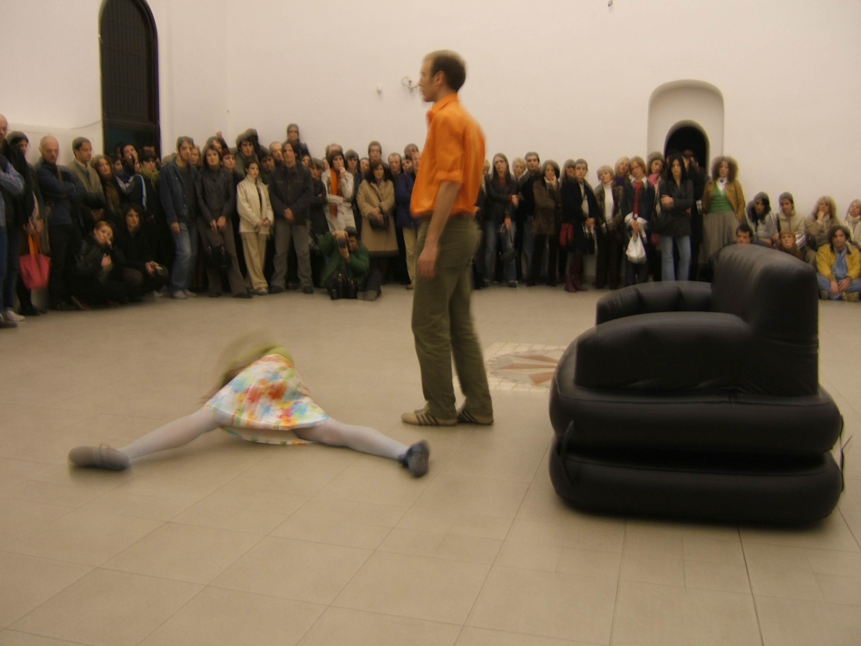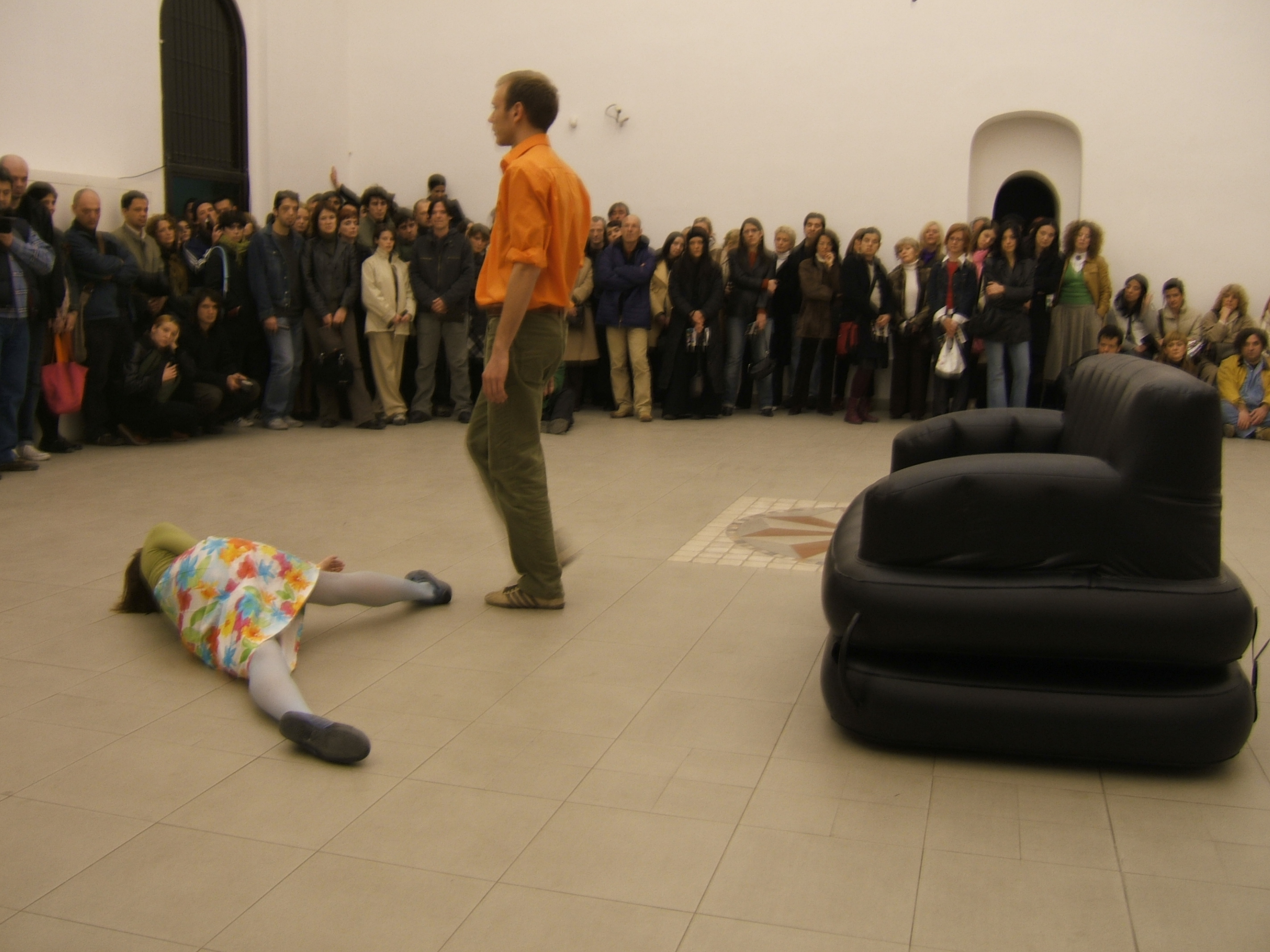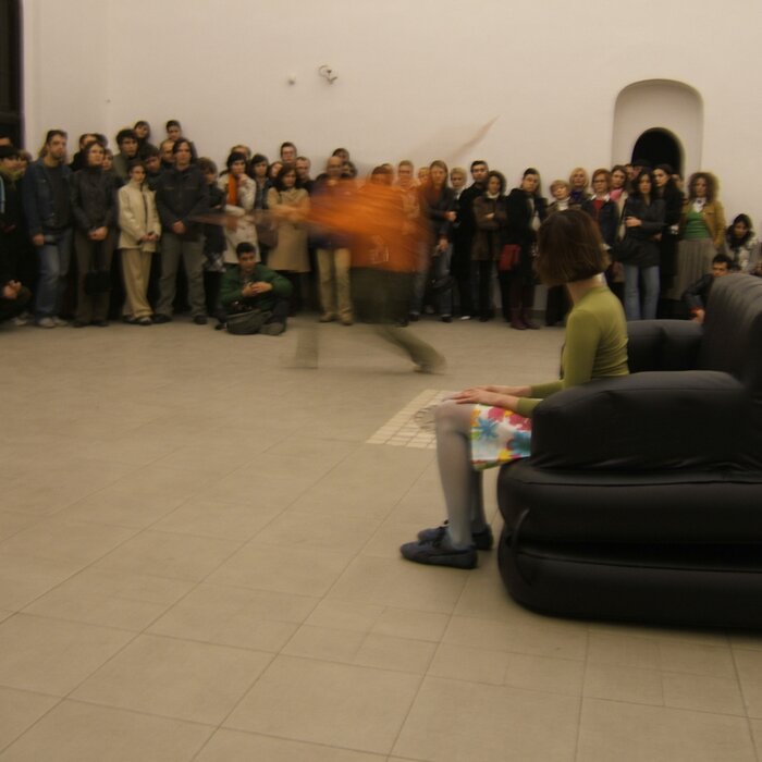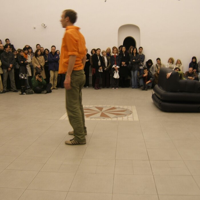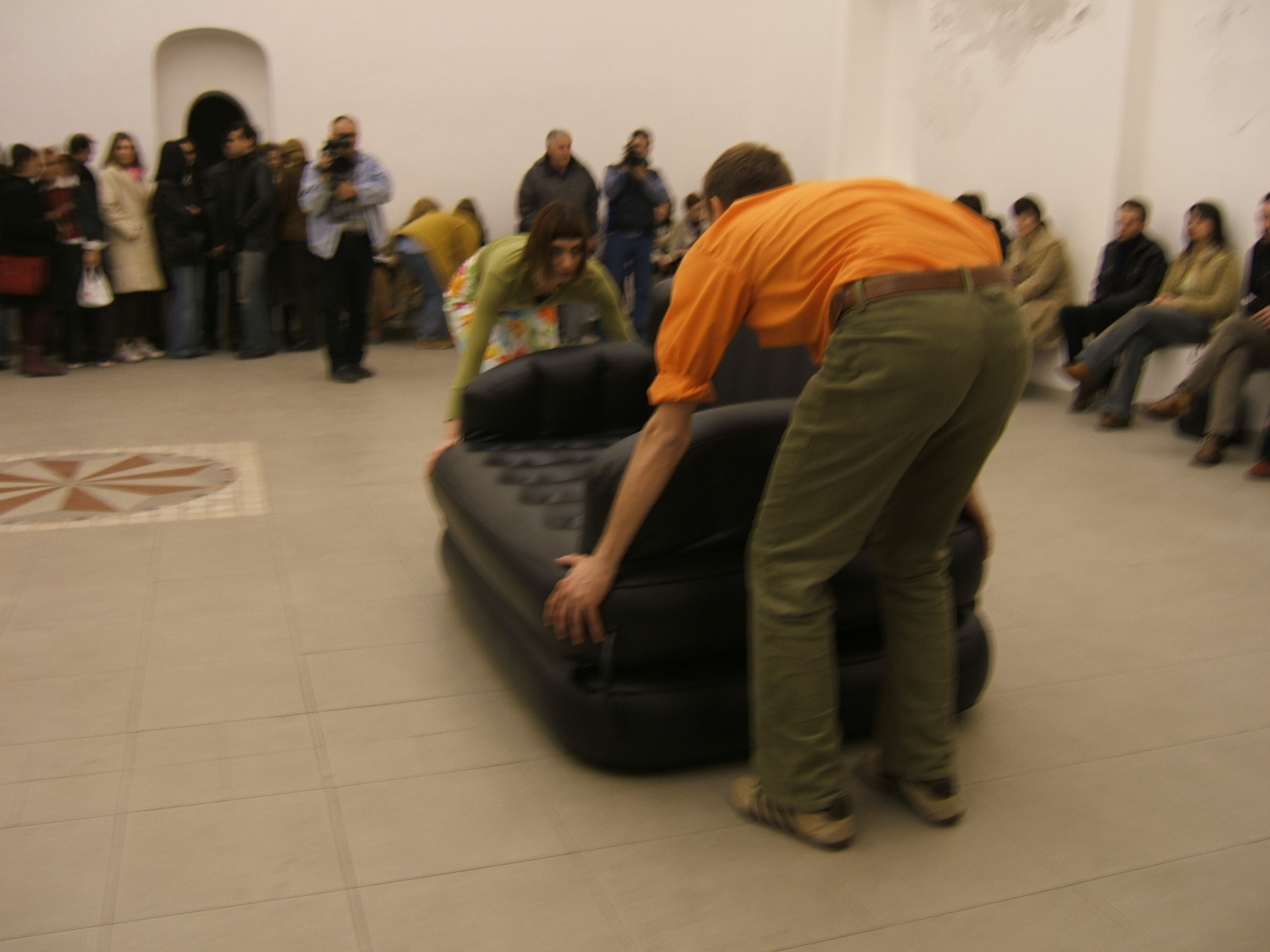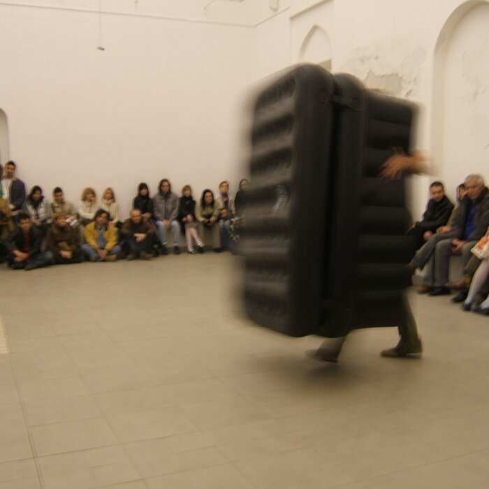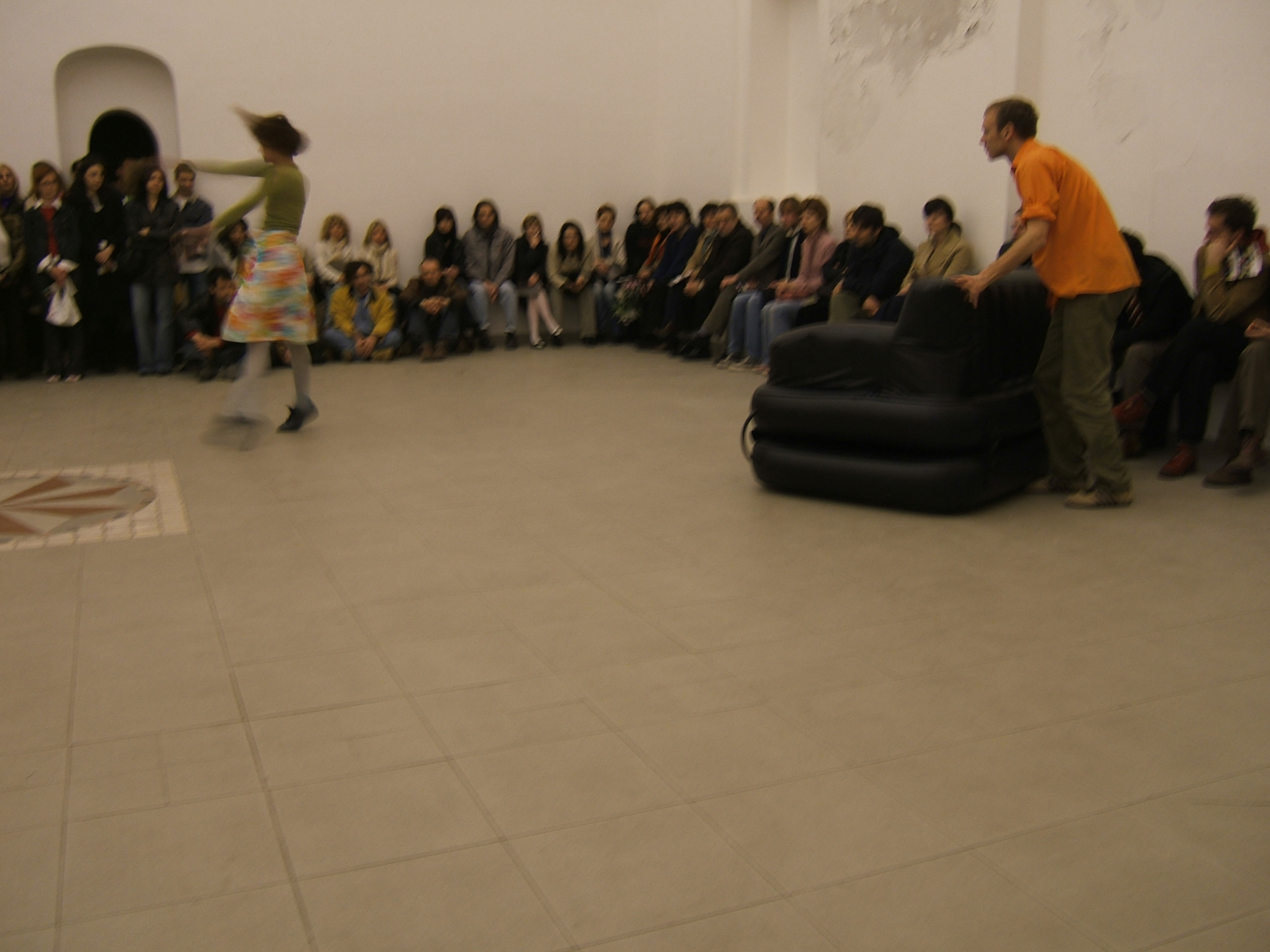 A collaboration between two artists choreographer and composer who explore the relation in sound and movement. The inspiration of the work stems from the different conditions created as a result of the relationship between a man, woman and a air filled - plastic couch..