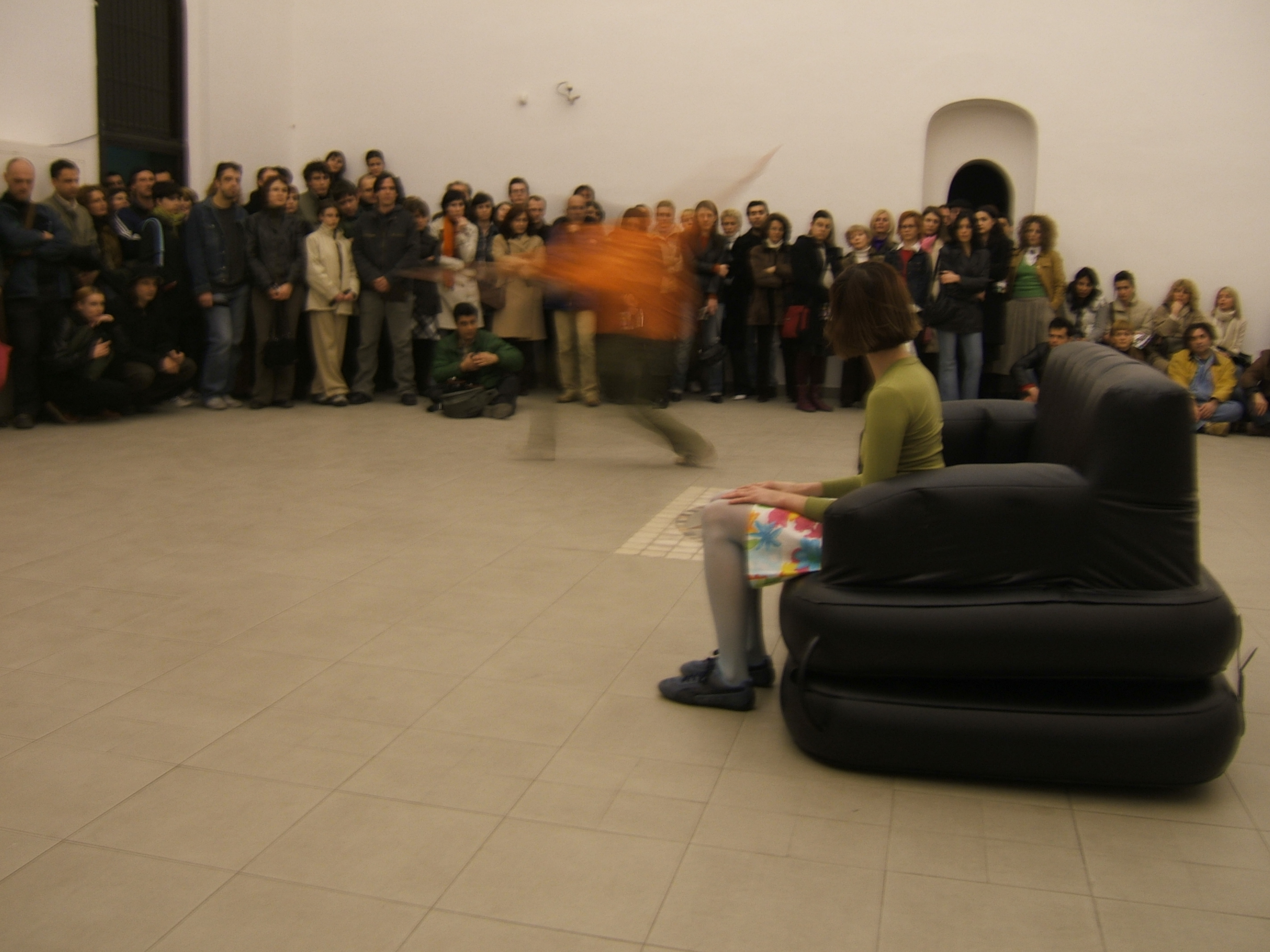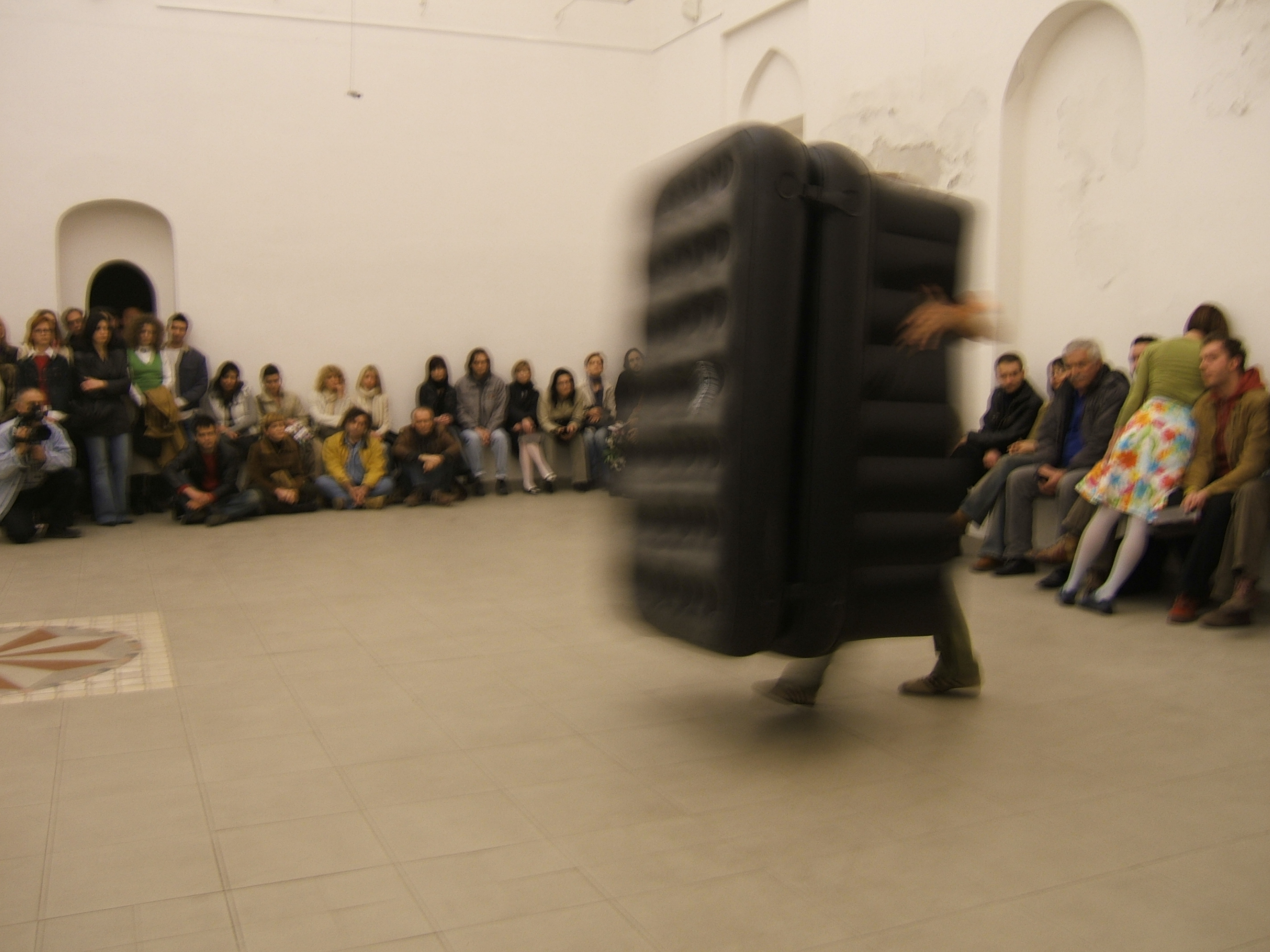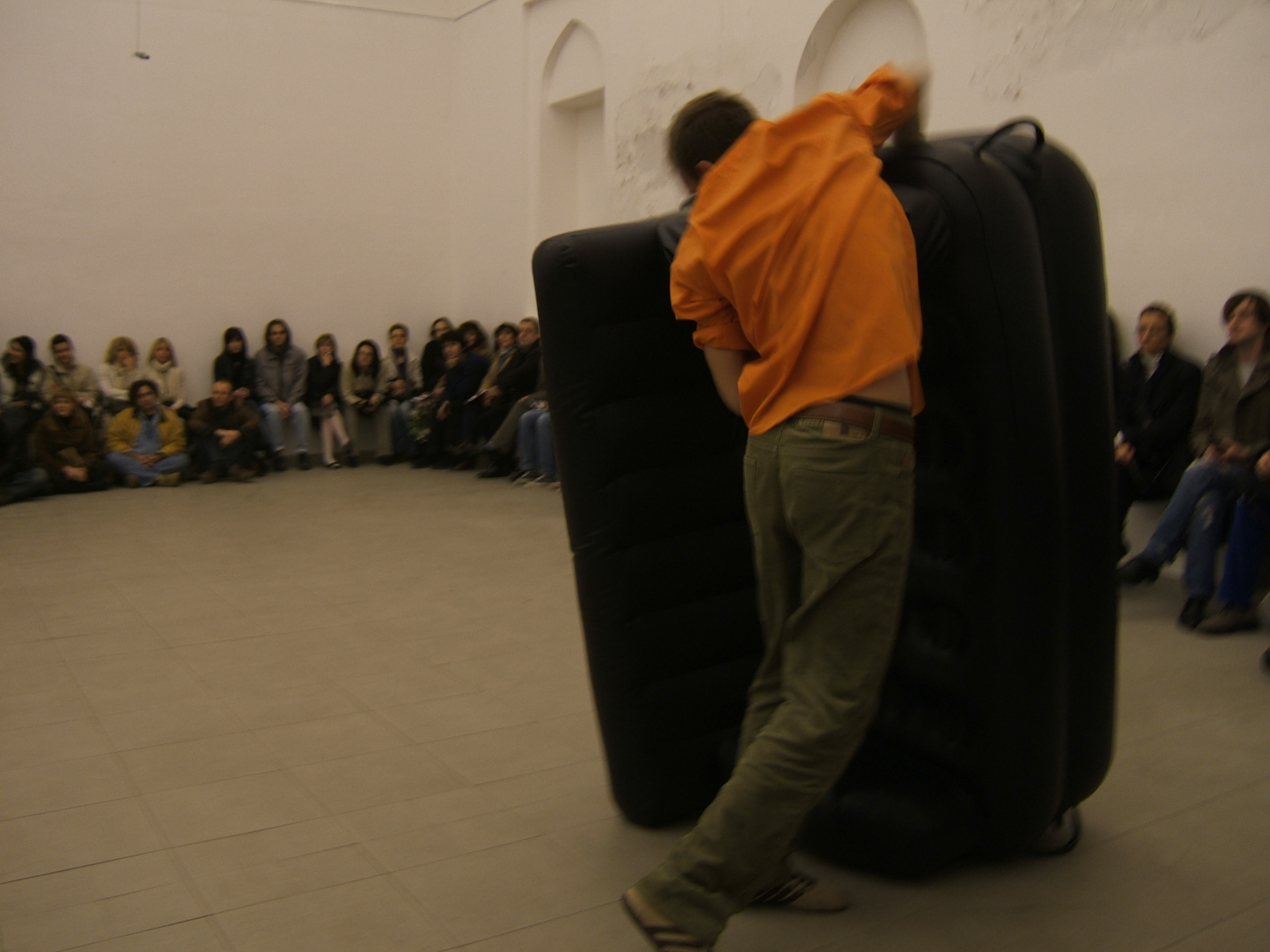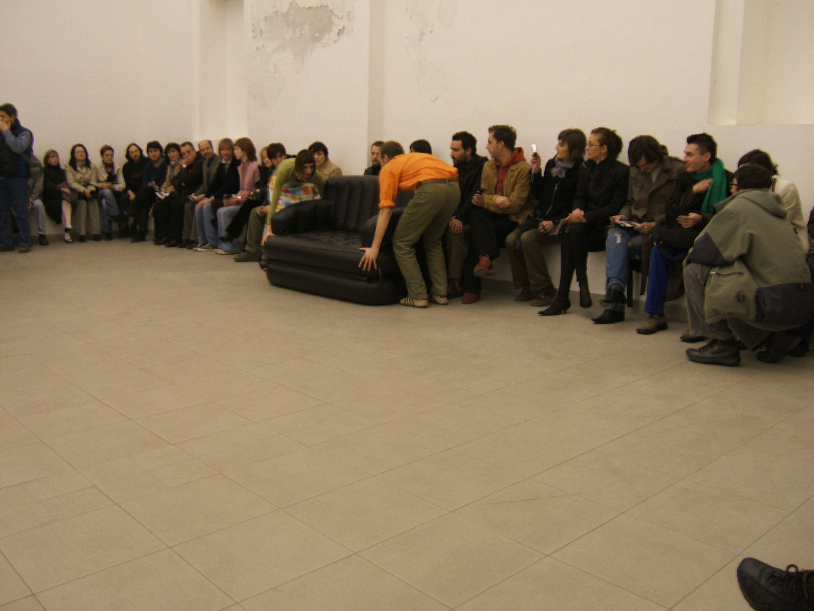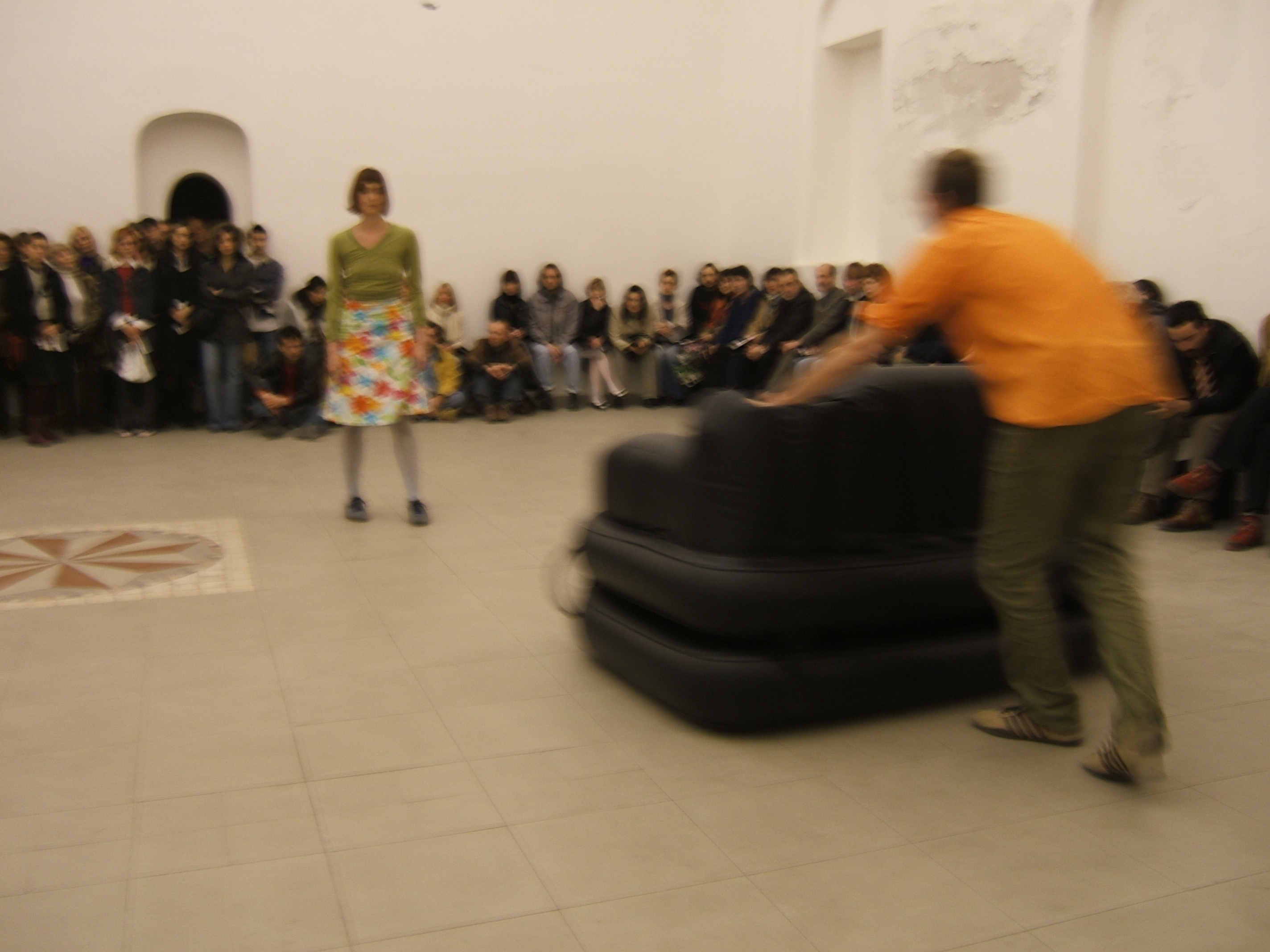 A collaboration between two artists choreographer and composer who explore the relation in sound and movement. The inspiration of the work stems from the different conditions created as a result of the relationship between a man, woman and a air filled - plastic couch..