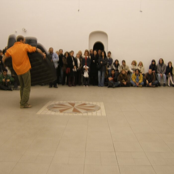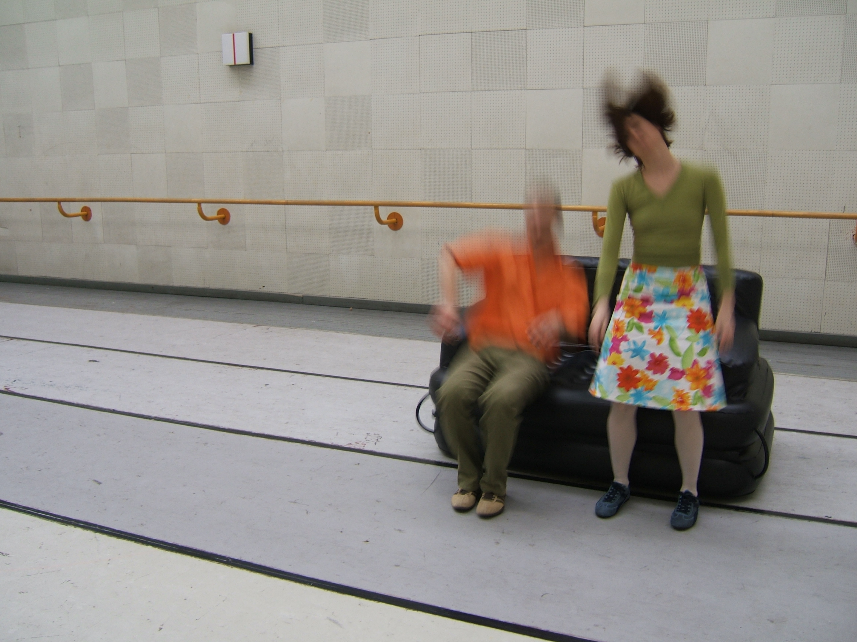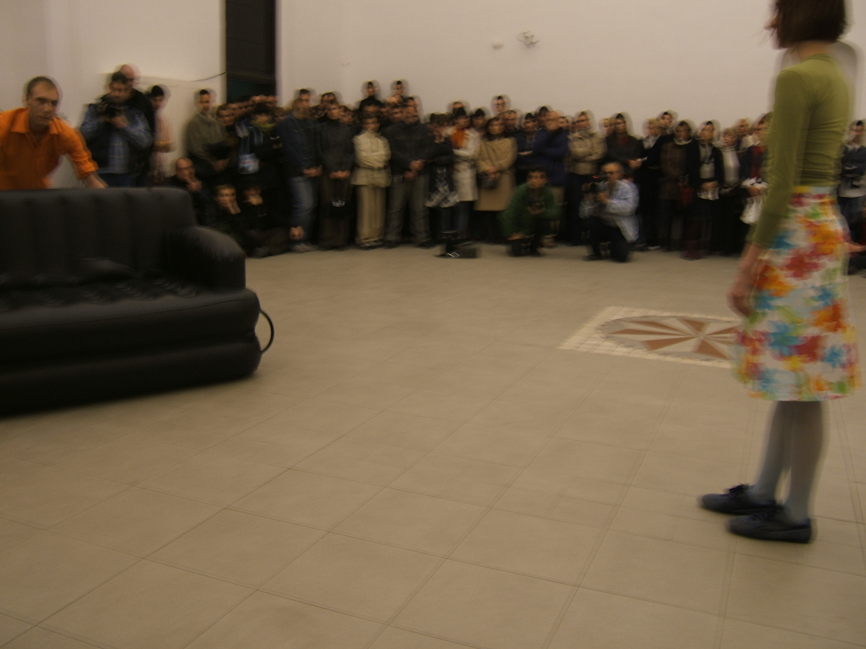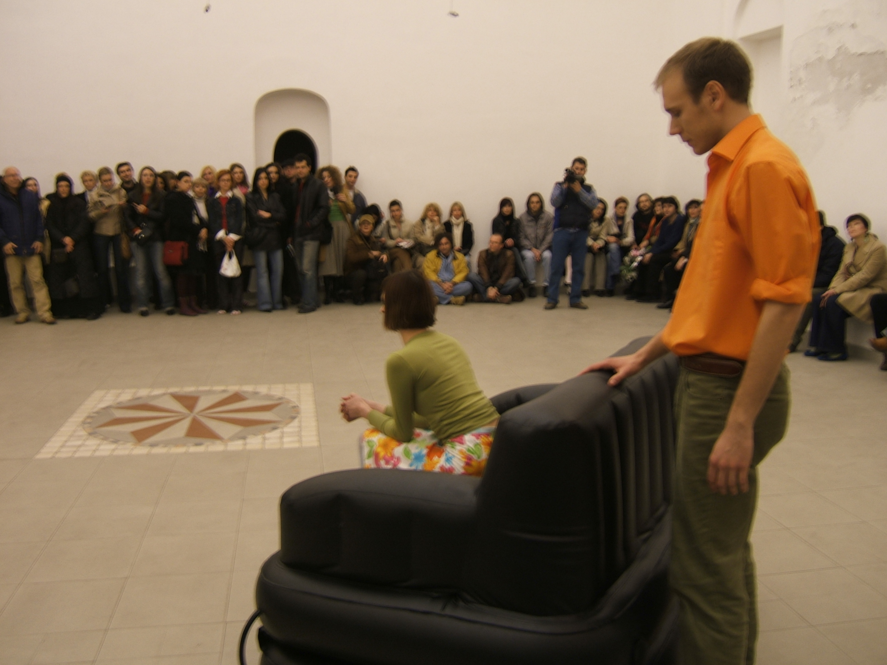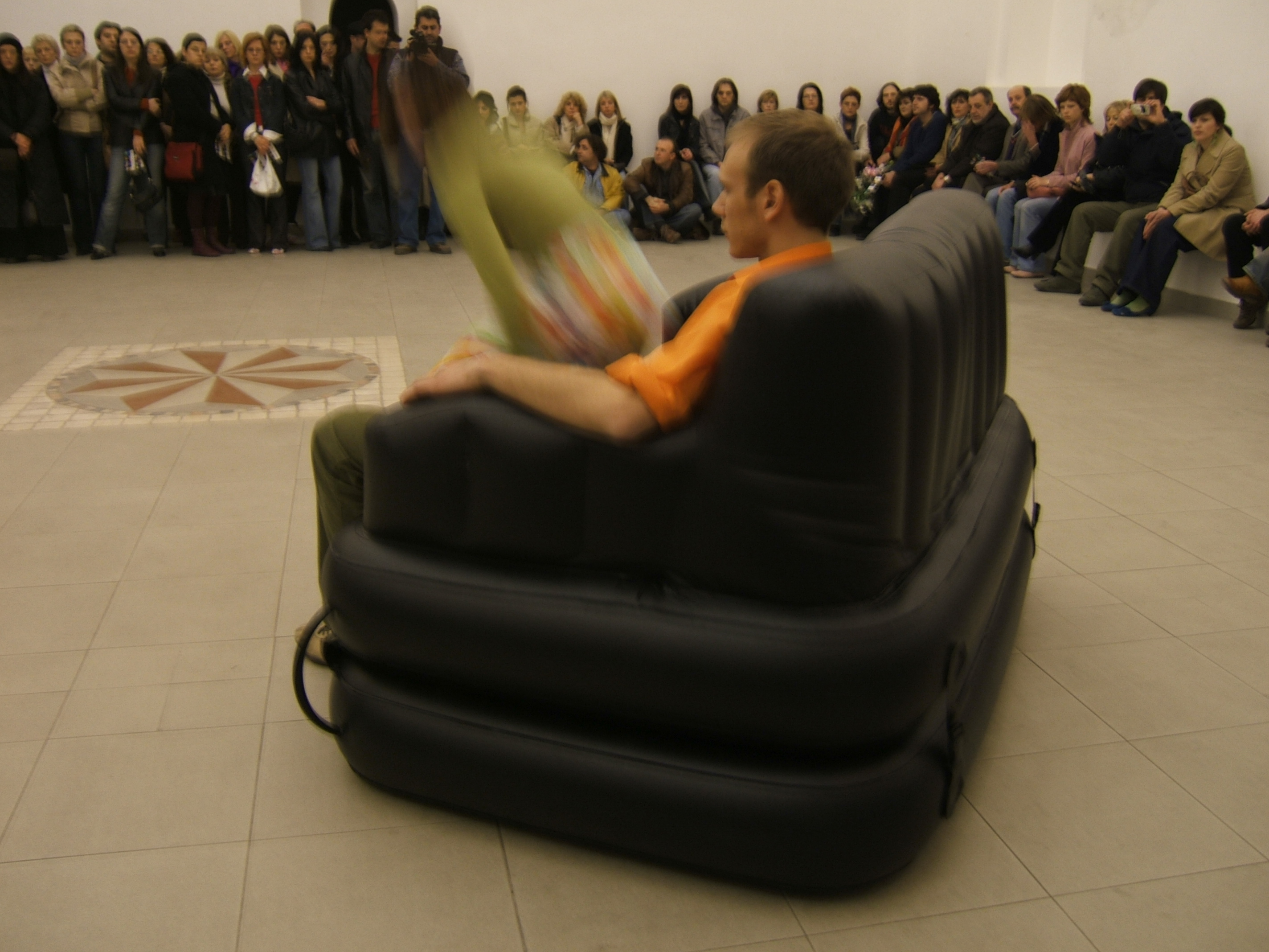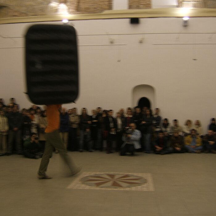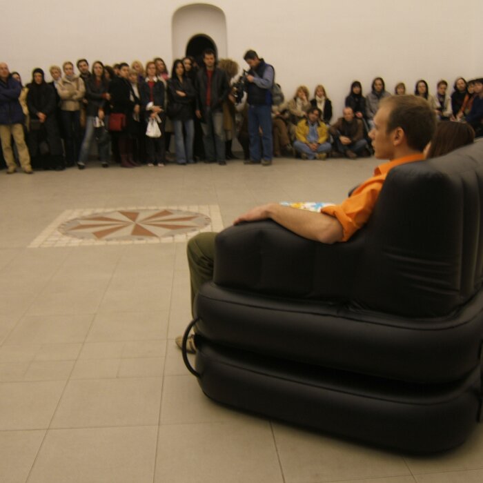A collaboration between two artists choreographer and composer who explore the relation in sound and movement. The inspiration of the work stems from the different conditions created as a result of the relationship between a man, woman and a air filled - plastic couch..