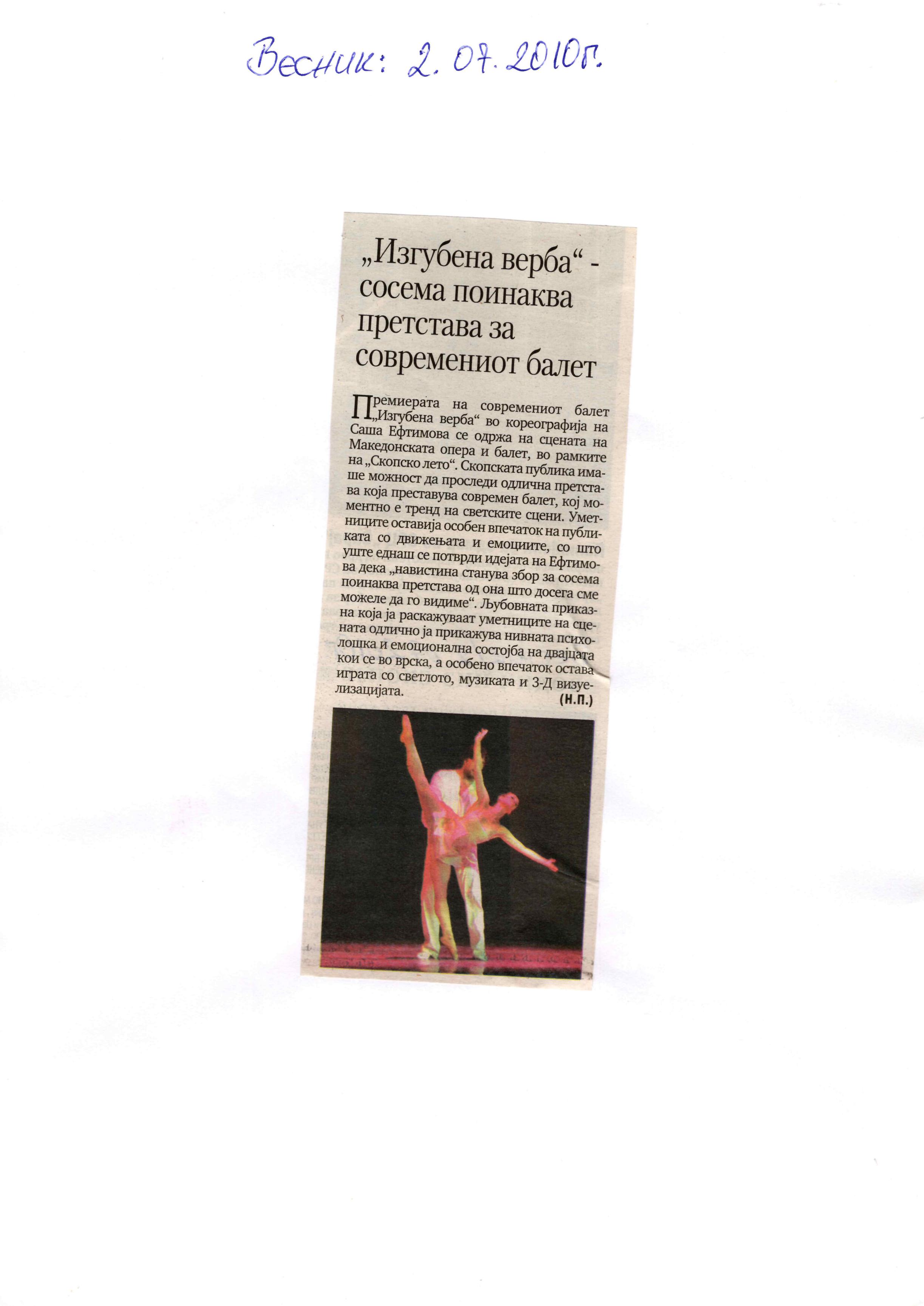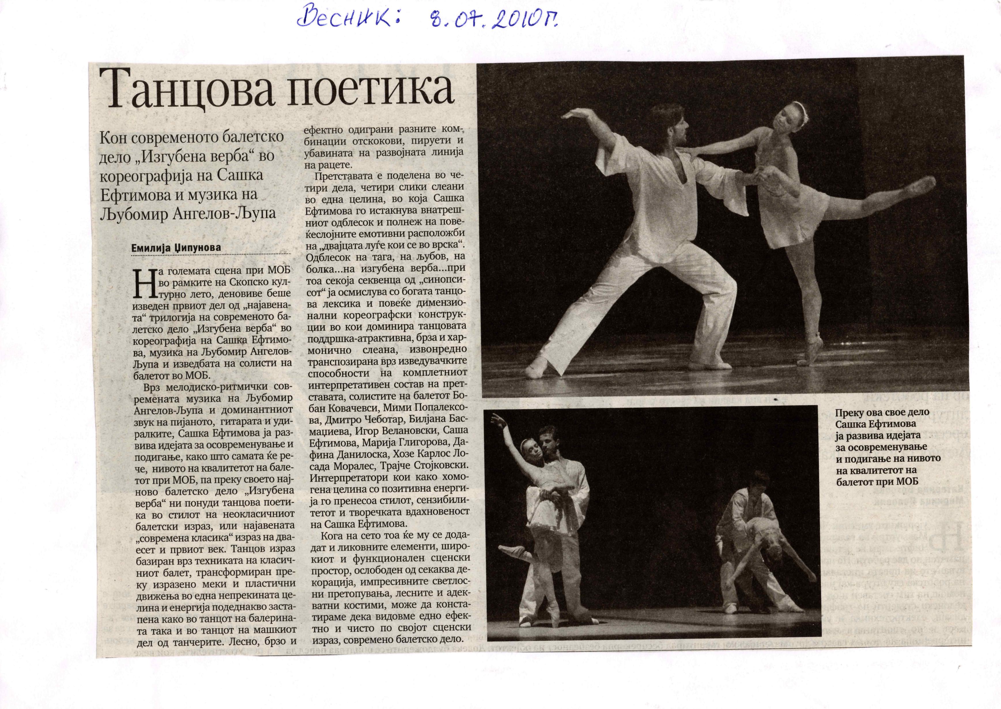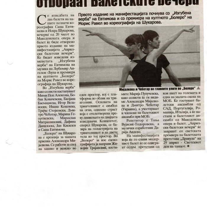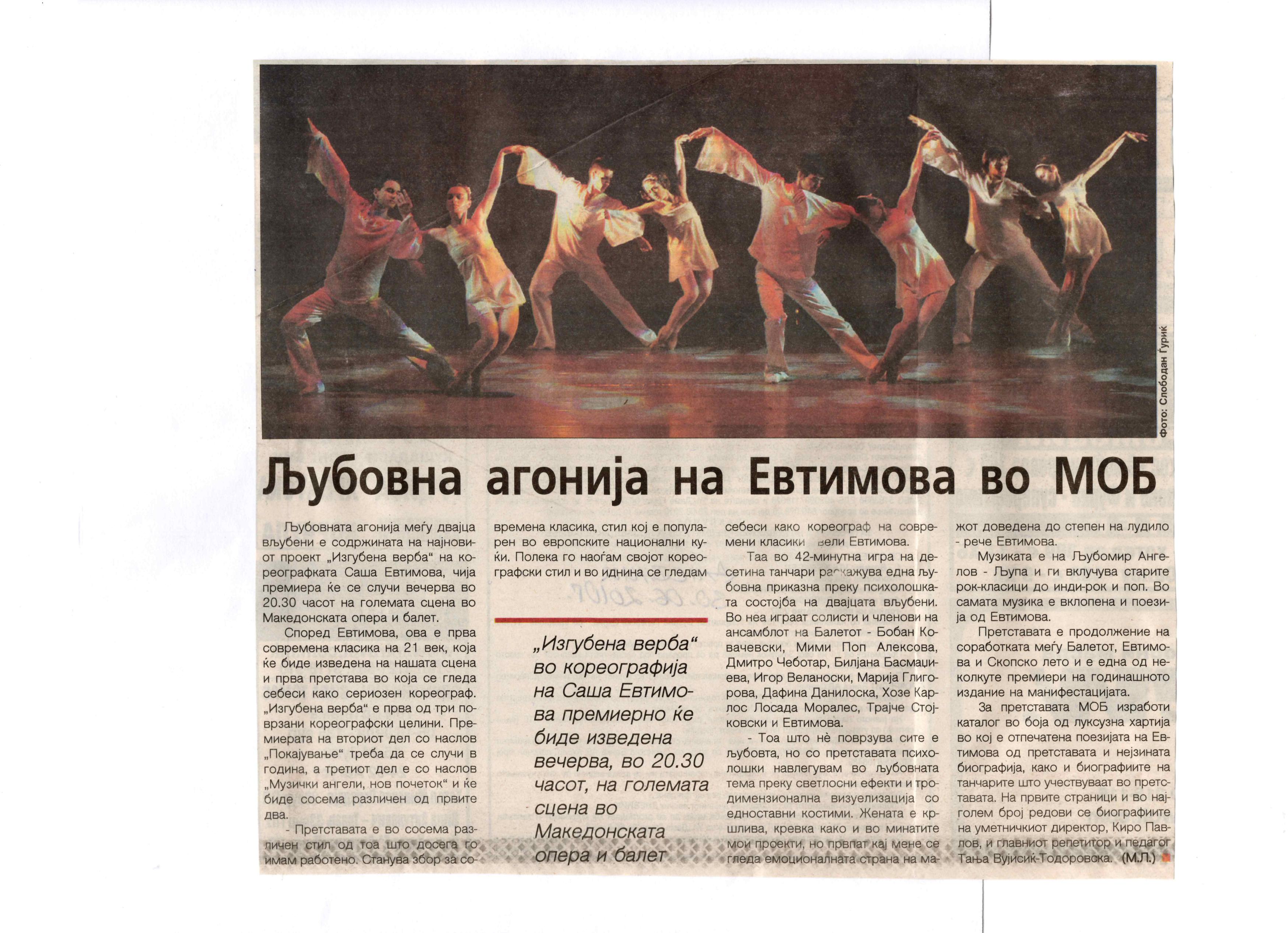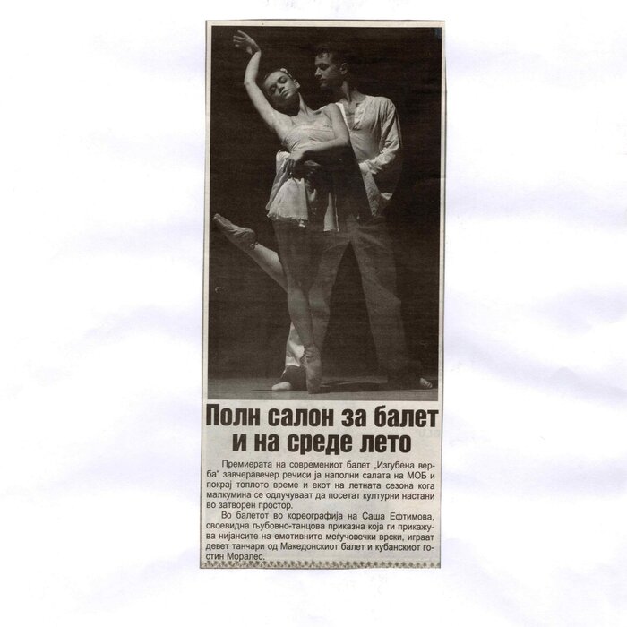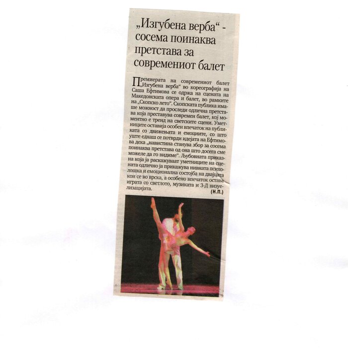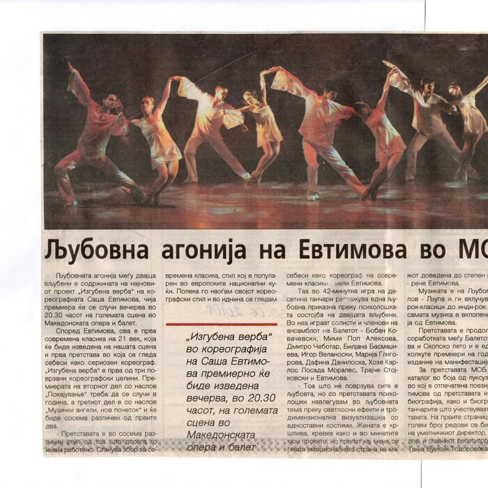 The contemporary ballet "Lost Faith", choreographed by Sasha Eftimova and music by Lubomir Angelov-Lupa, premiered in the large hall of the MOB. The performance is a co-production project between the MOB and the Directorate for Culture and Arts. The ballet was performed as part of the "Skopje Summer" event. "Lost Faith" is completely different from what I have done so far. This is the first and only performance that will be a contemporary classic of the 21st century. This is something new and you will see it for the first time on the stage of the MOB - says choreographer Sasha Eftimova. Her idea is for the performance to have three parts, "Lost Faith" is the first part, the second part, which is to be staged next year, is "Repentance" and the third is "Musical Angels. A New Beginning". Eftimova explained that all three parts should be performed in a full-length performance together with the MOB orchestra. - "Lost Faith" is a love story that explores the psychological and emotional state of two people in a relationship, shown through movements, light, "movement in motion" and 3D visualization - says Eftimova. In addition to the choreographer, the performance features the soloists of the Ballet: Kovachevski, Mimi Pop Aleksova, Dmitro Chebotar, Biliana Basmacieva, Igor Veljanoski, Marija Gligorova, Dafina Daniloska, Trajce Stokovski and the guest José Carlos Losada Morales from Cuba. (According to the announcement in Nova Makedonija, 30.06.2010)