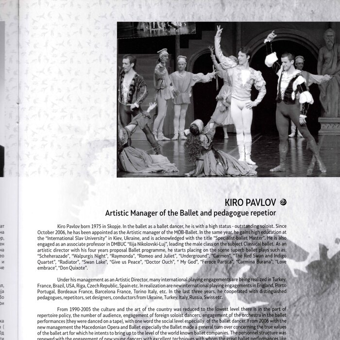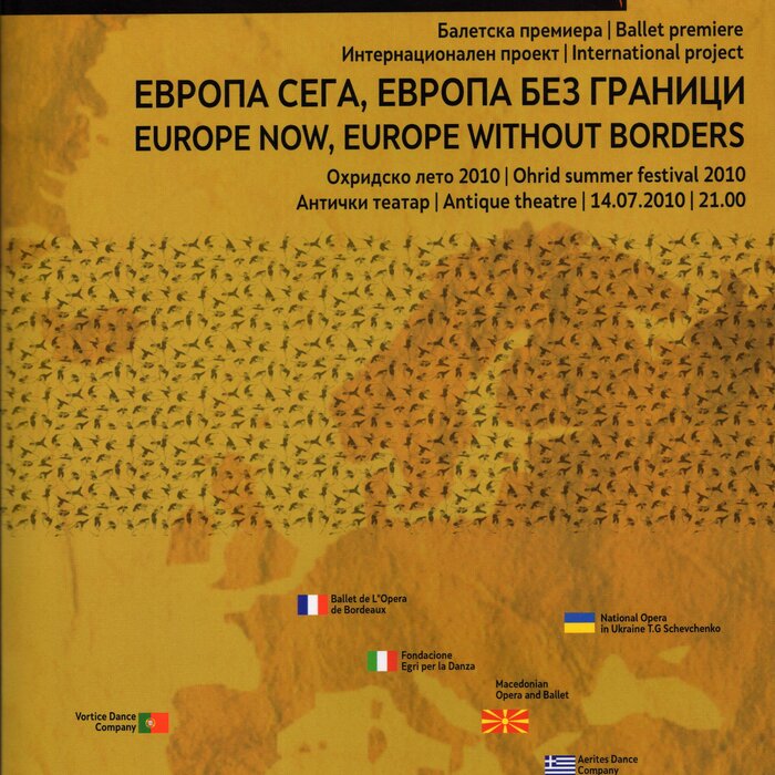 The premiere of the ballet performance "Europe Now, Europe Without Borders" performed by ballet ensembles from France, Greece, Italy, Portugal, Ukraine and Macedonia will take place tonight on the stage of the Lower Palace (9 p.m.) as part of the "Ohrid Summer". The performance is choreographed by Sasha Eftimova from the MOB from Skopje, Charles Judd from Bordeaux, Patricia Apergi from Greece, Rafael Bianco from Italy, Rafaele Paz from Portugal, and Viktor Yaremenko from the National Opera of Ukraine. The conceptual framework of the play in the catalogue of "Ohrid Summer" reads: "We dream of a place where we can dream and make those dreams come true, where we can be carefree and not have to wait for a better tomorrow and a happier day. Where we all walk along a long life path in one direction, hand in hand, one after another. For this better world that we dream of, all we have to do is allow our hearts to forget, to forgive, to believe." (According to the announcement in the newspaper Vreme, 14.07.2010)