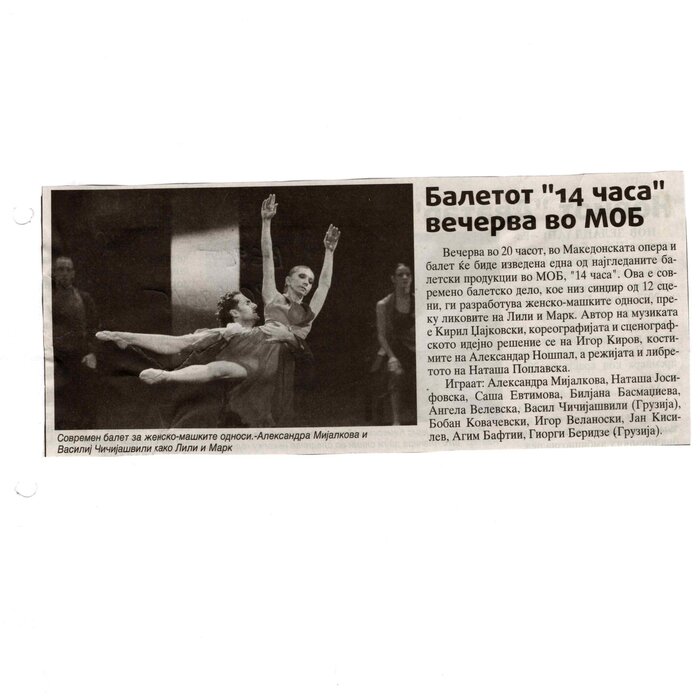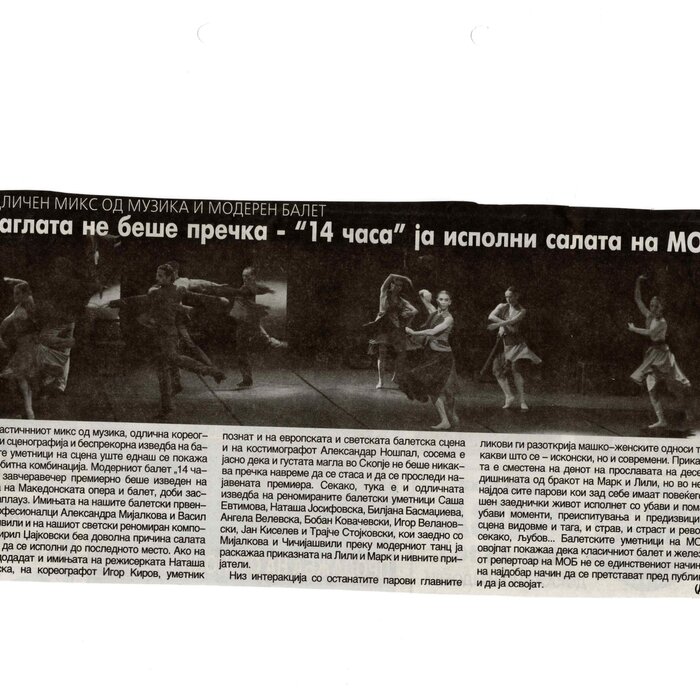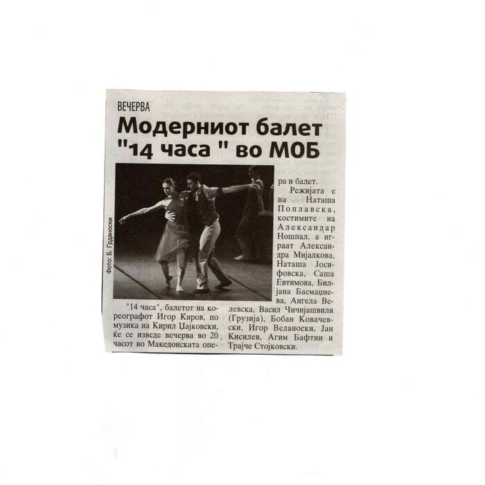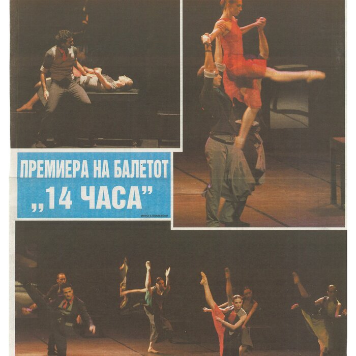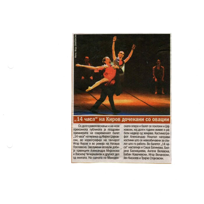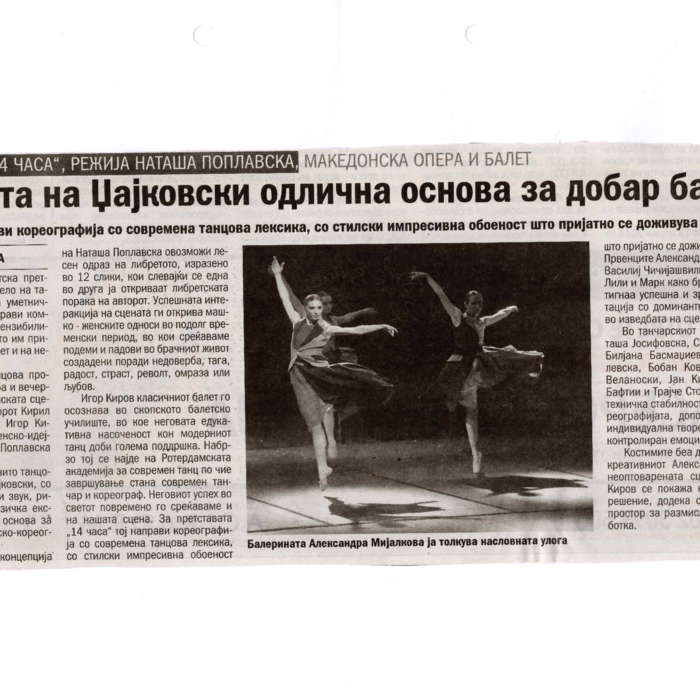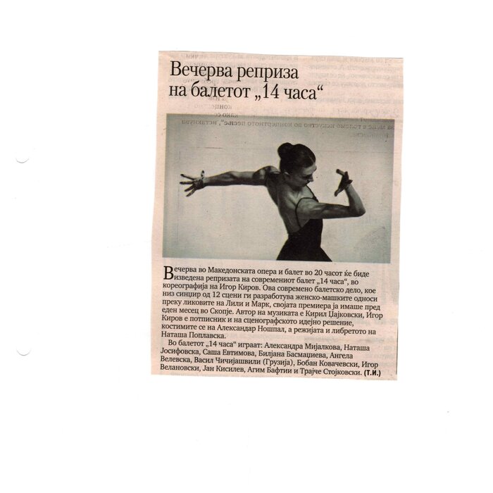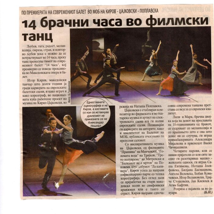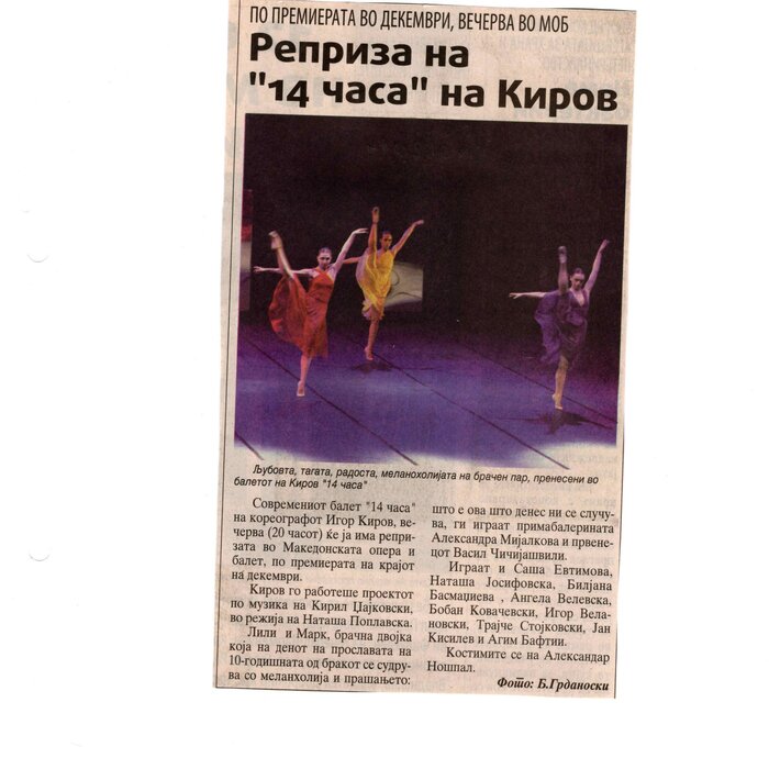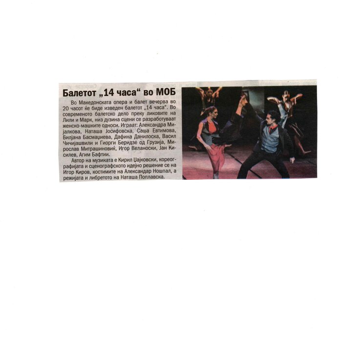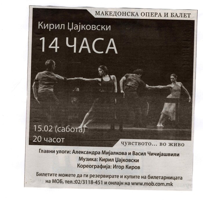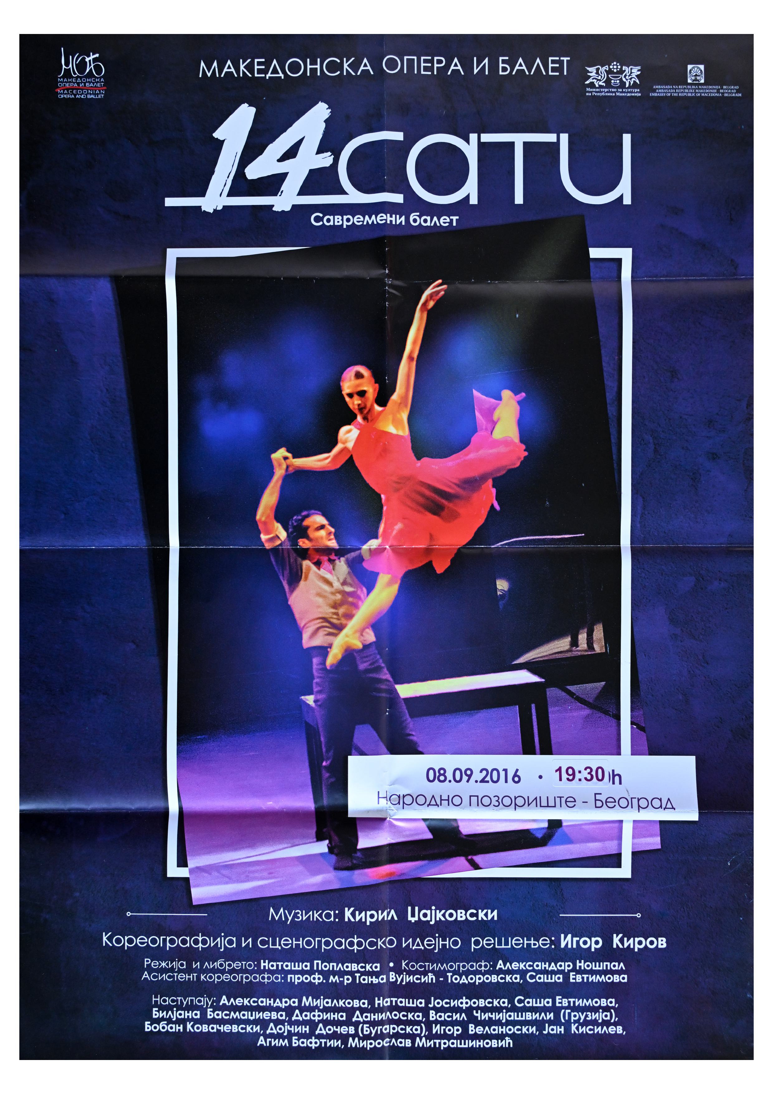 “14 Hours” is a contemporary ballet performance by Igor Kirov, created for the stage of the Macedonian Opera and Ballet. The music for the performance was composed by Kiril Džajkovski, while the libretto and direction were done by Natasha Poplavska.