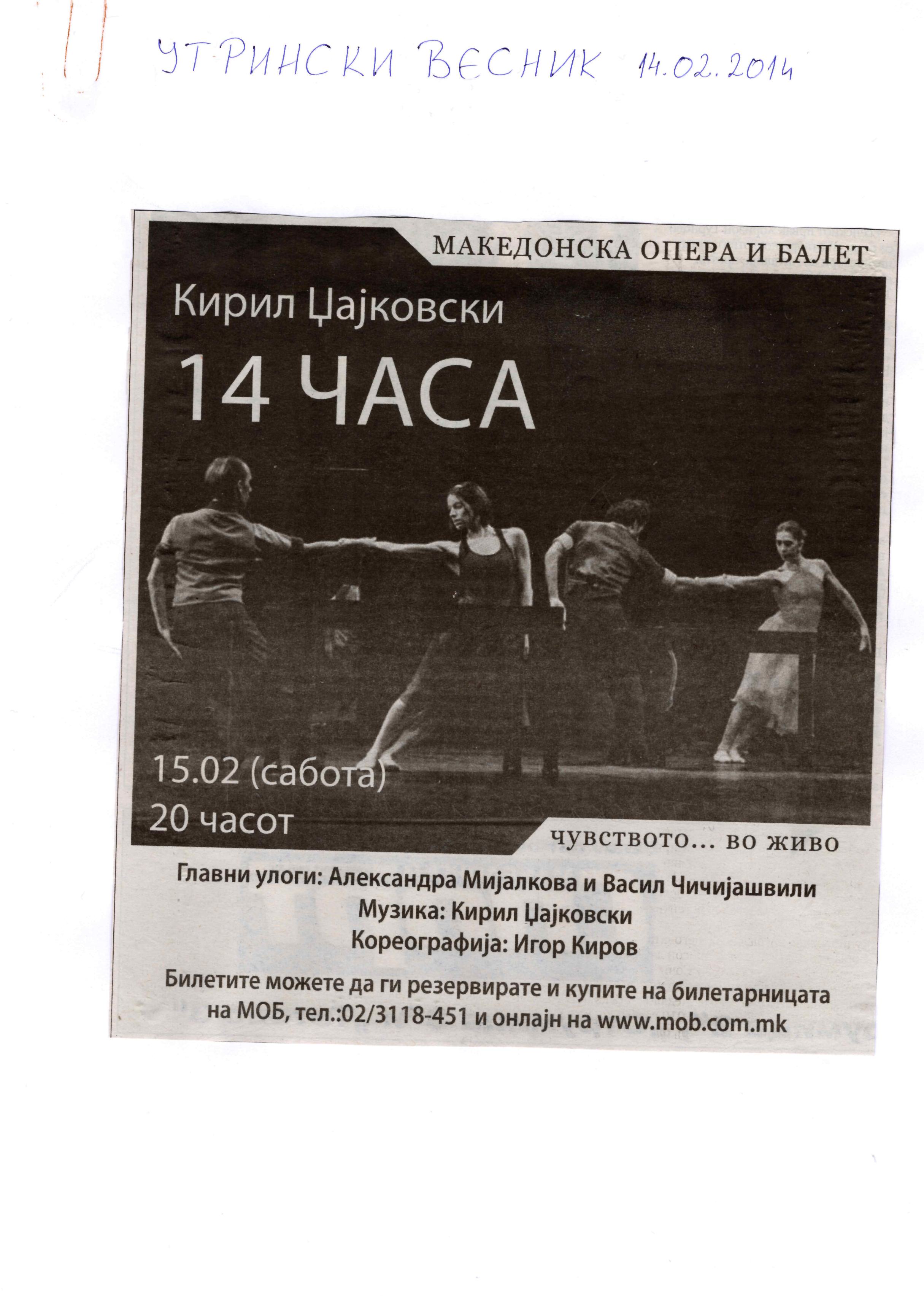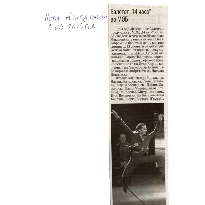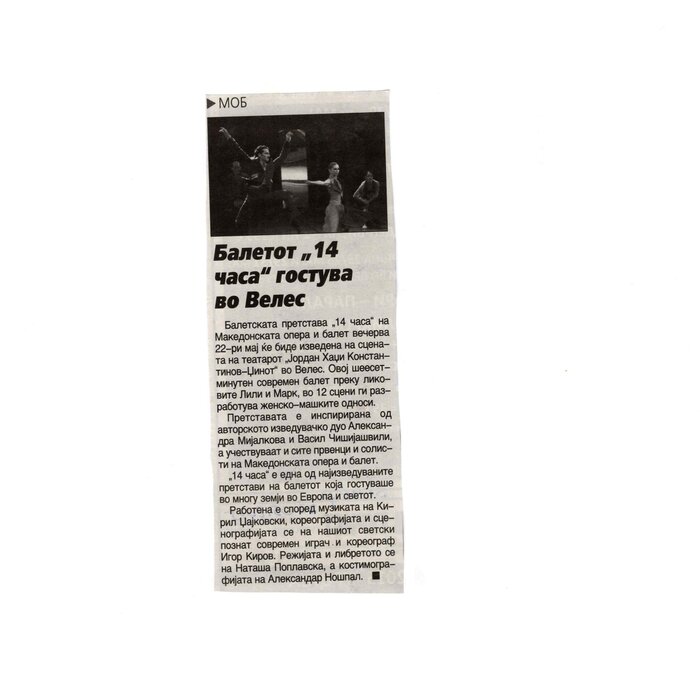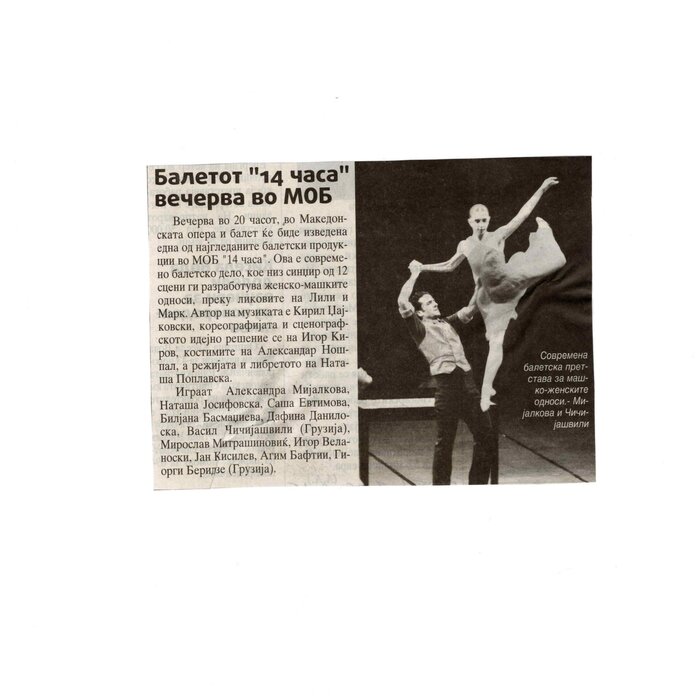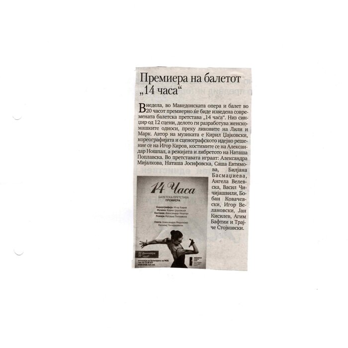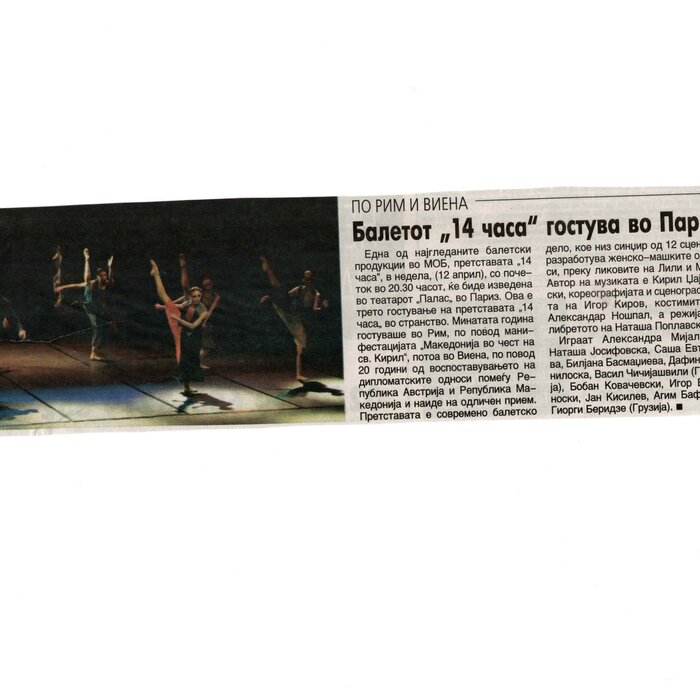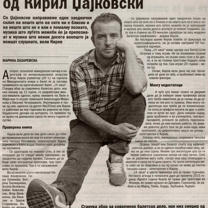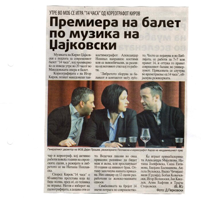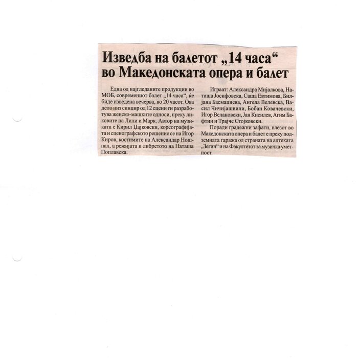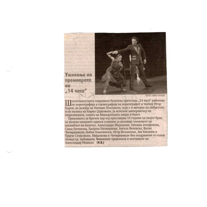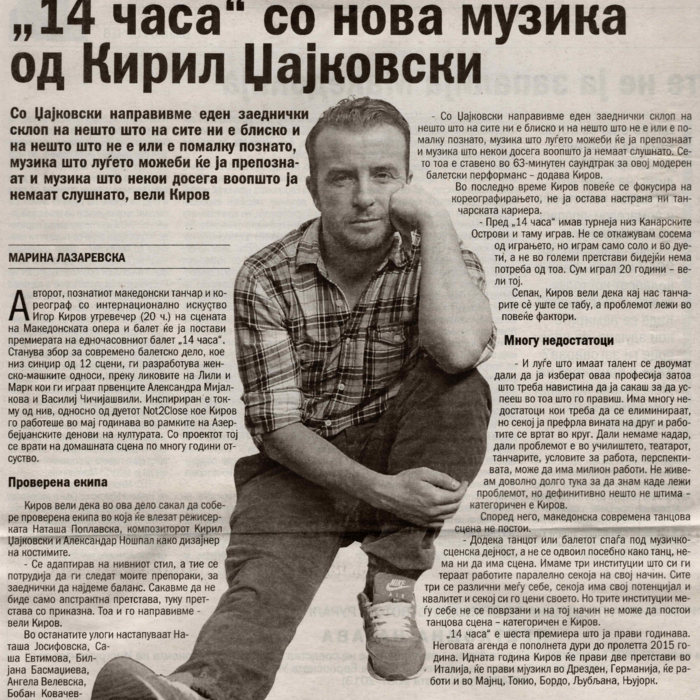 “14 Hours” is a contemporary ballet performance by Igor Kirov, created for the stage of the Macedonian Opera and Ballet. The music for the performance was composed by Kiril Džajkovski, while the libretto and direction were done by Natasha Poplavska.
