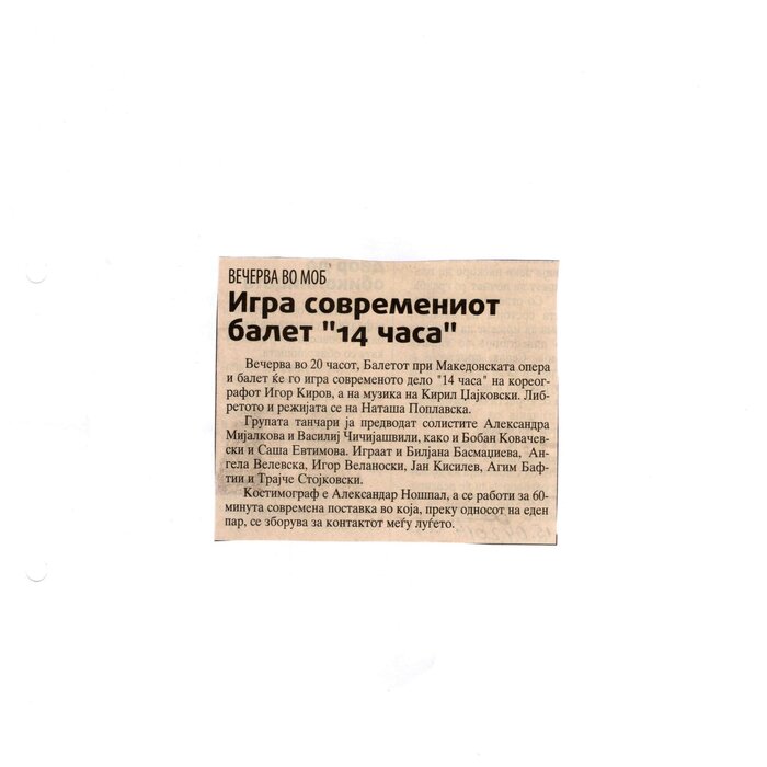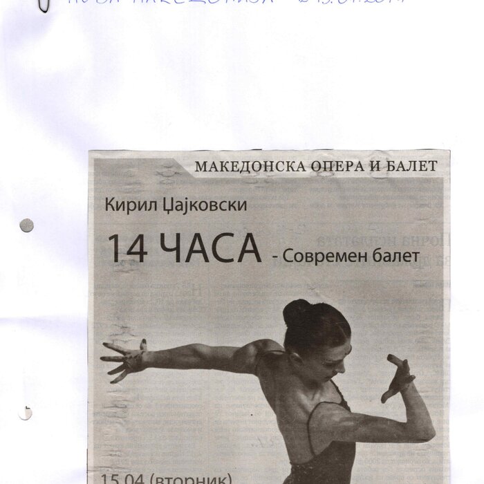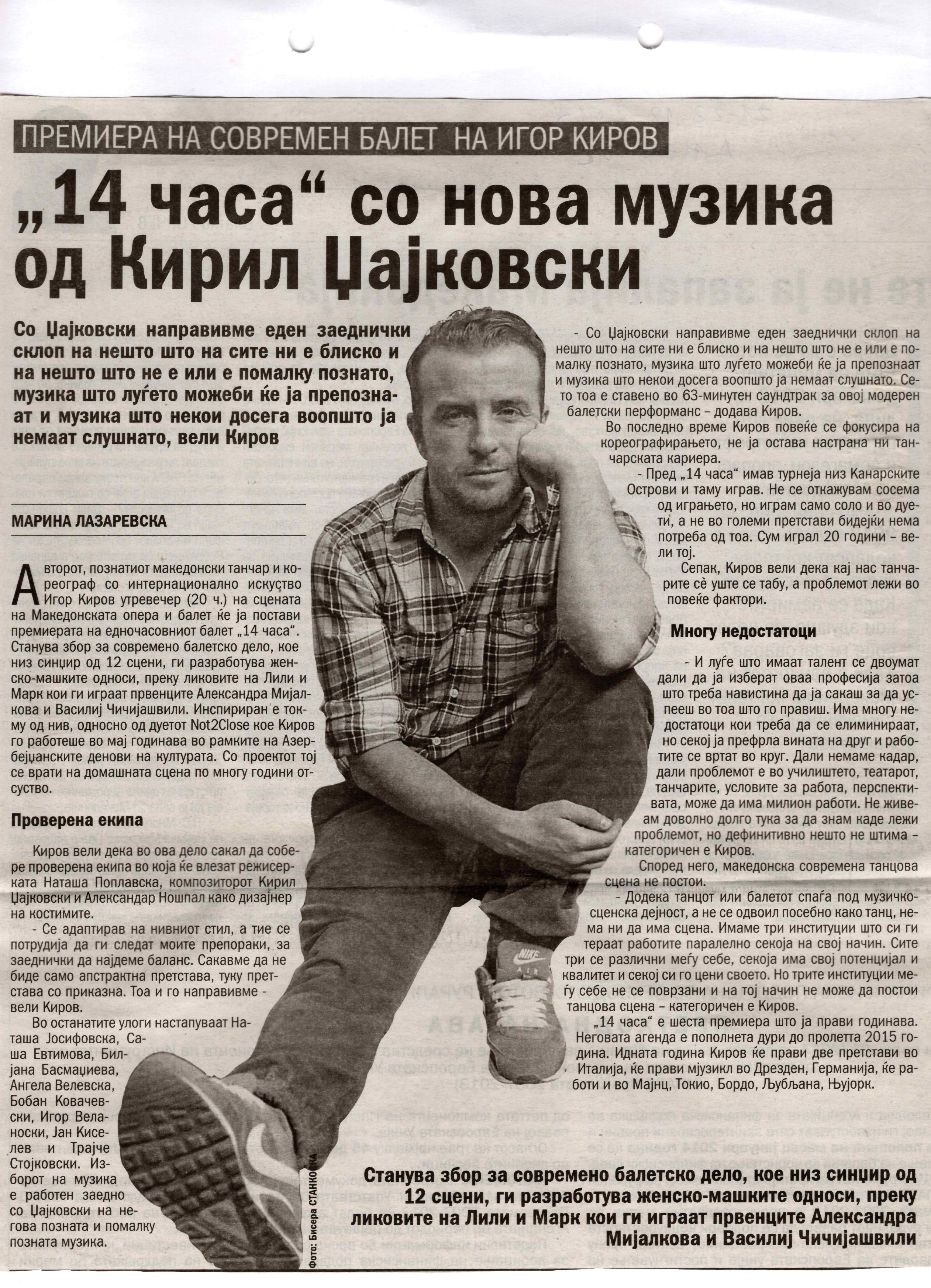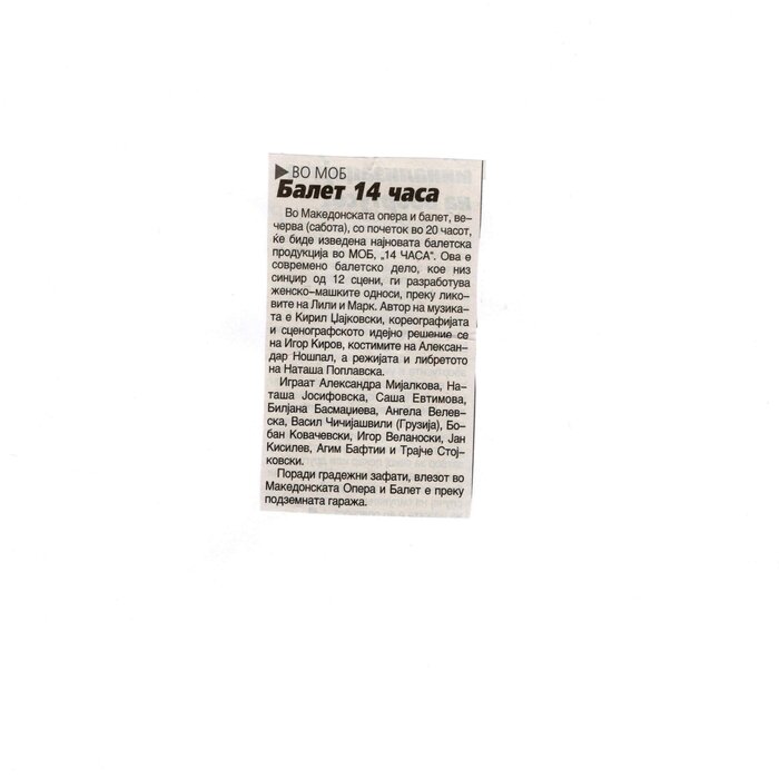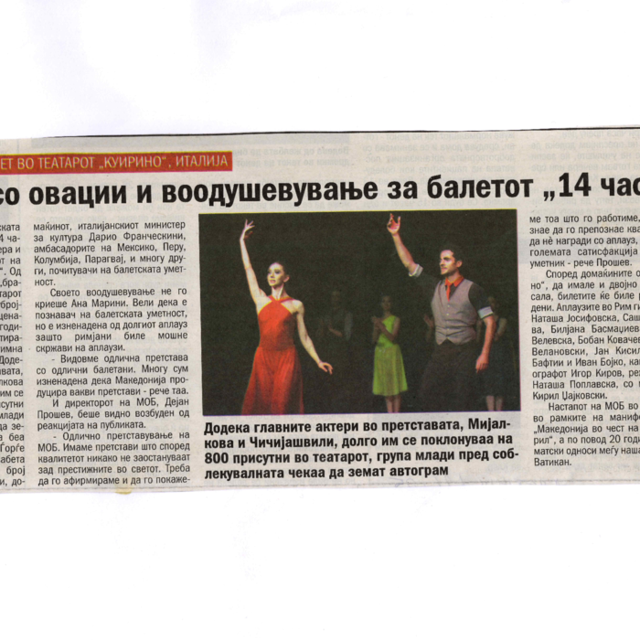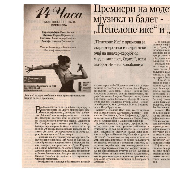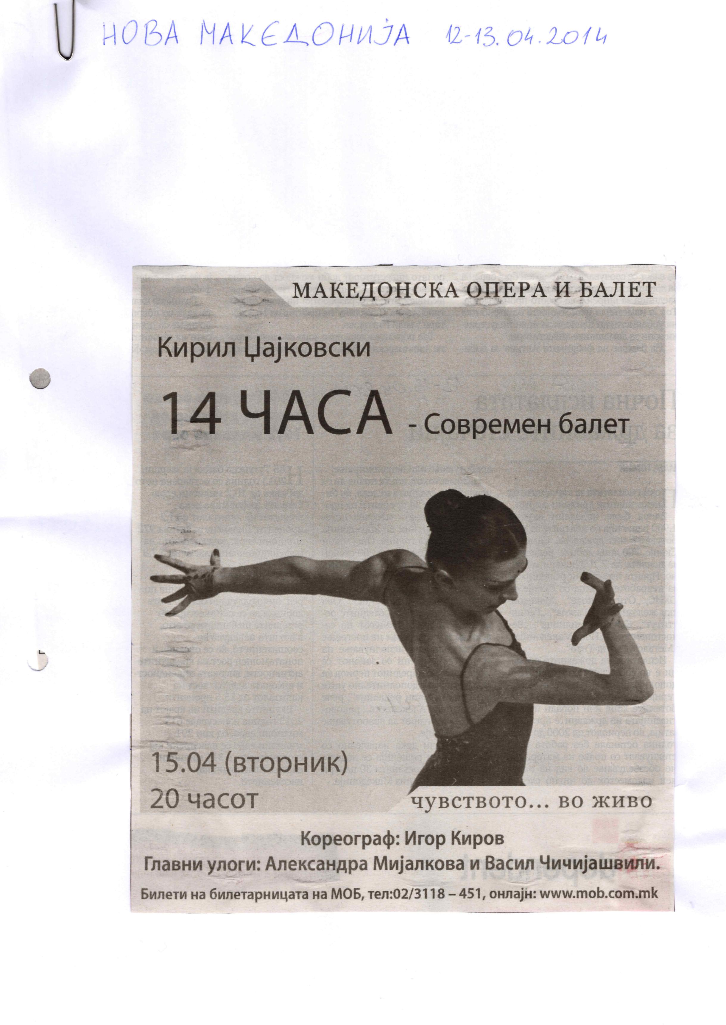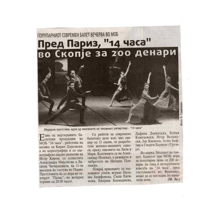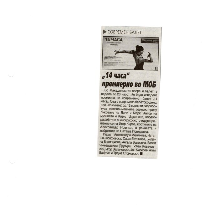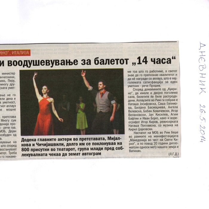 “14 Hours” is a contemporary ballet performance by Igor Kirov, created for the stage of the Macedonian Opera and Ballet. The music for the performance was composed by Kiril Džajkovski, while the libretto and direction were done by Natasha Poplavska.