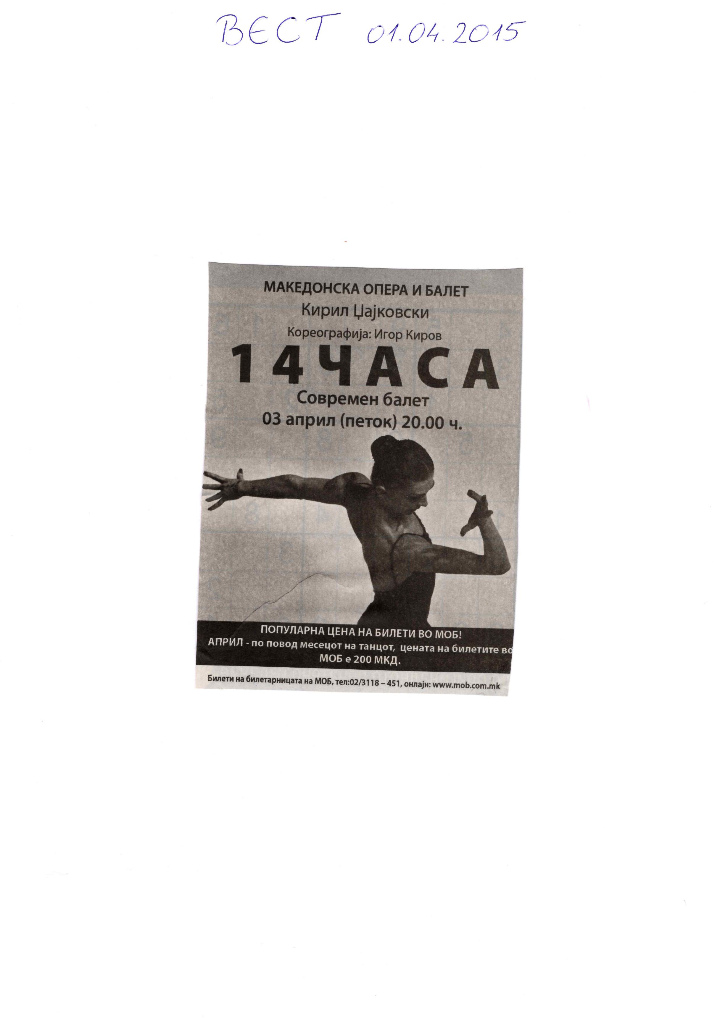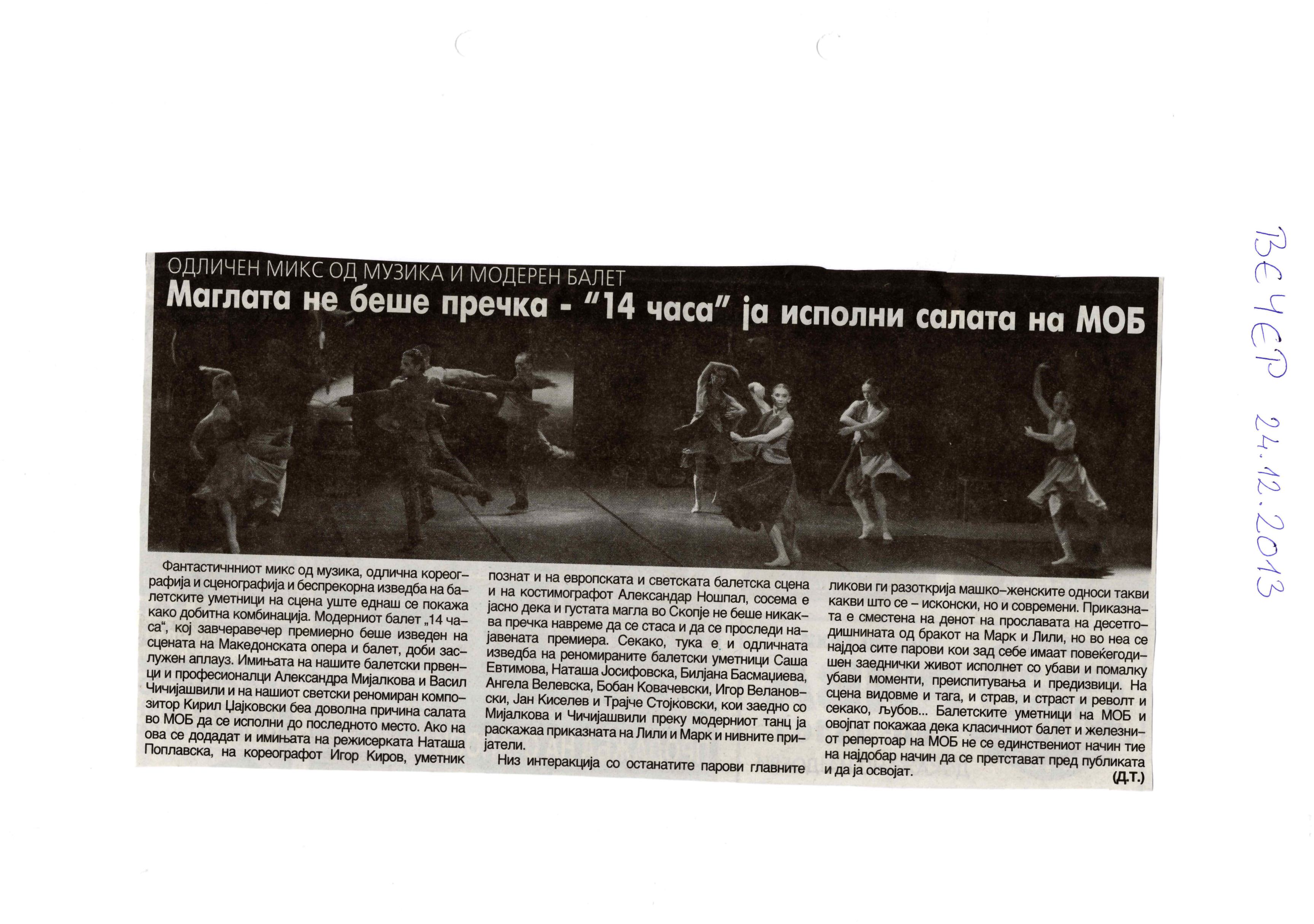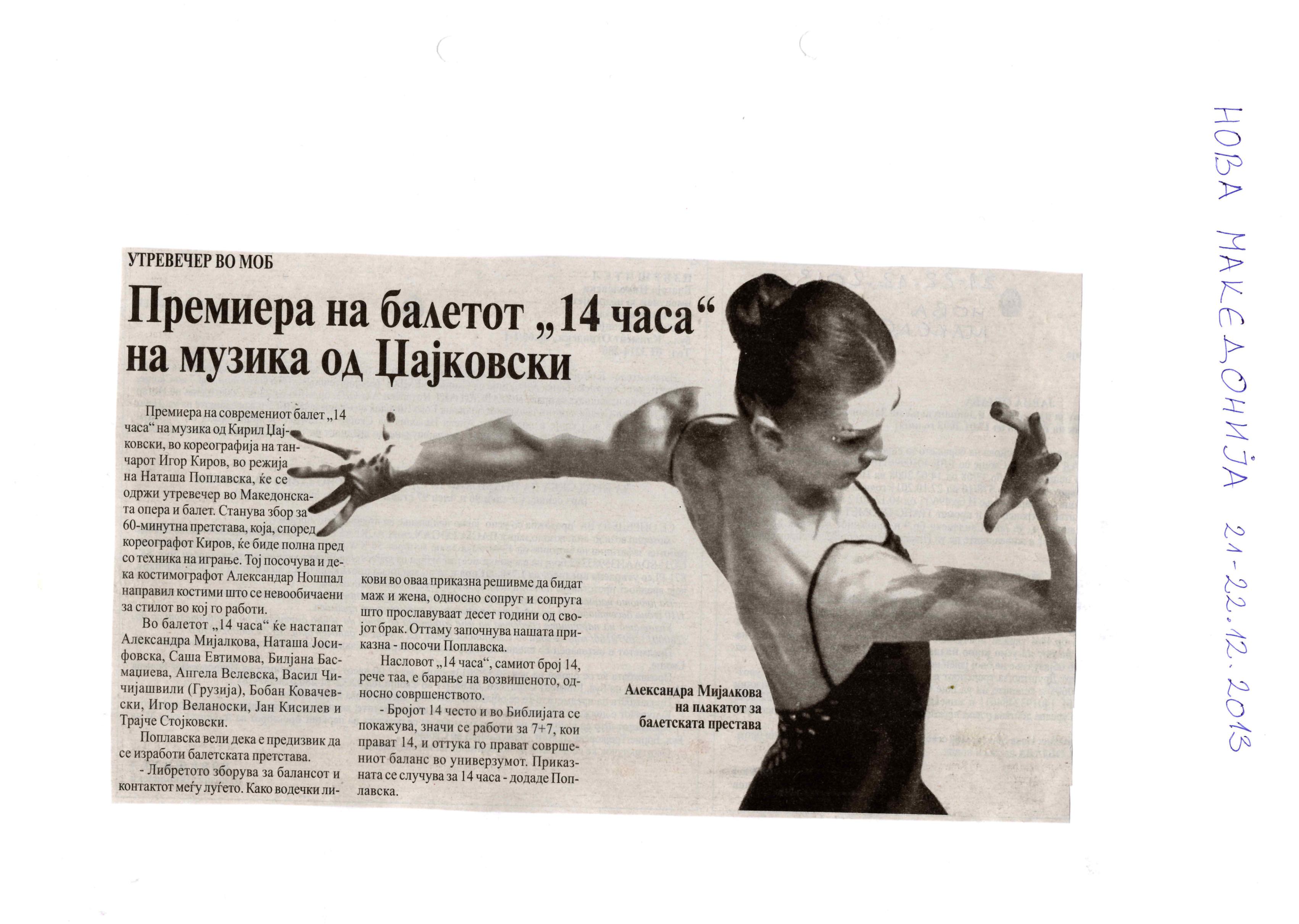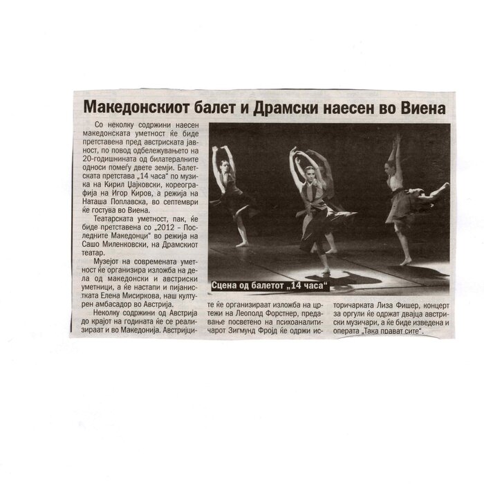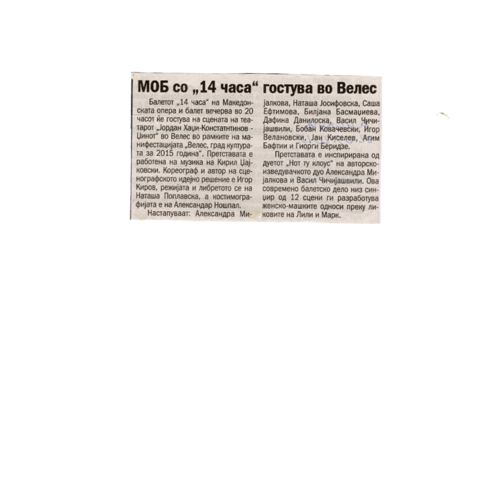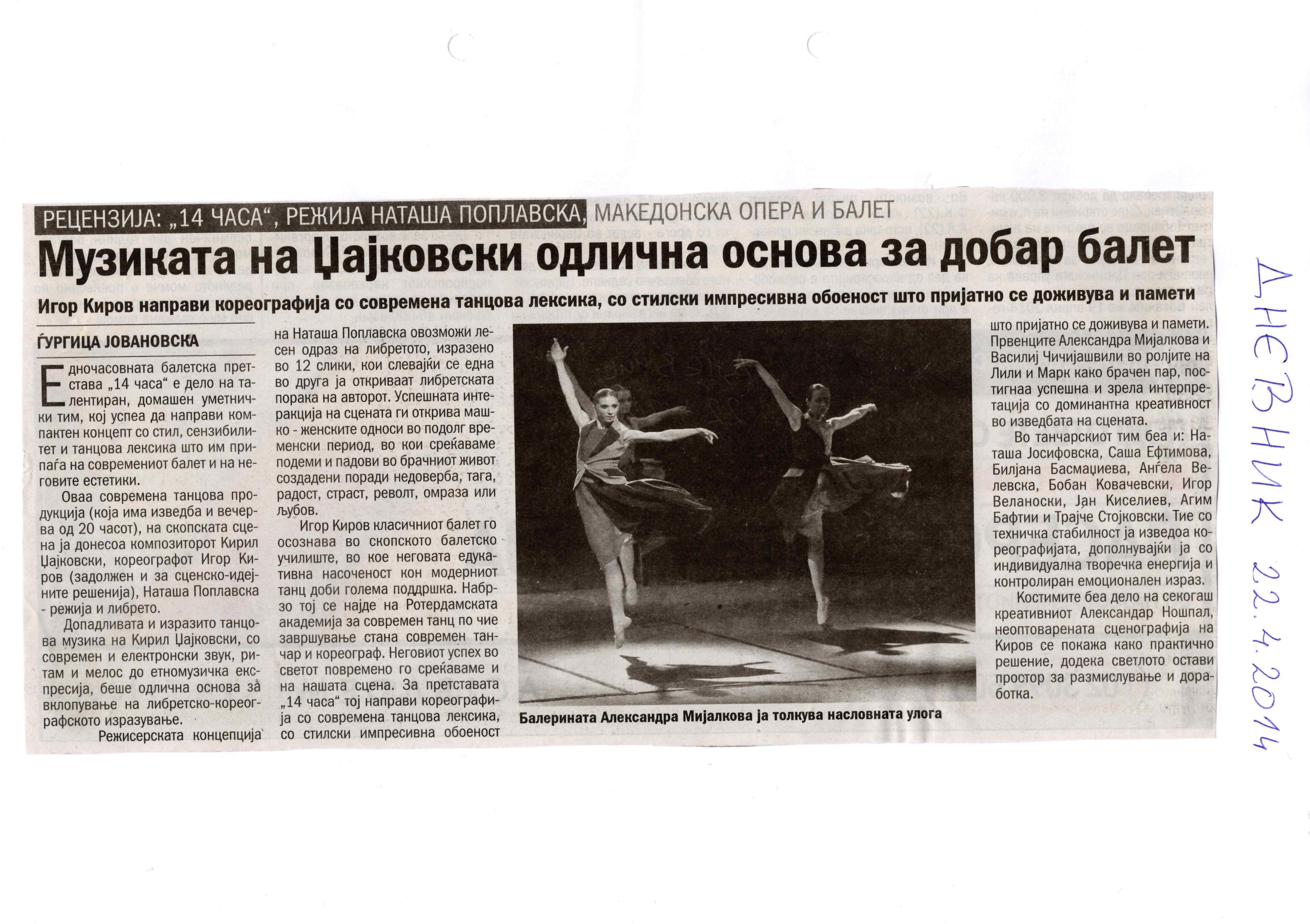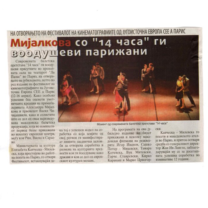 “14 Hours” is a contemporary ballet performance by Igor Kirov, created for the stage of the Macedonian Opera and Ballet. The music for the performance was composed by Kiril Džajkovski, while the libretto and direction were done by Natasha Poplavska.