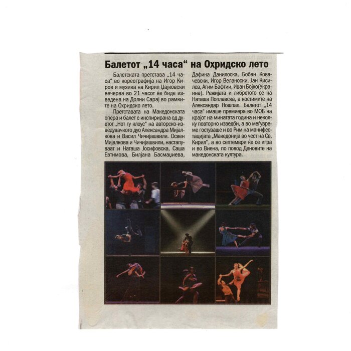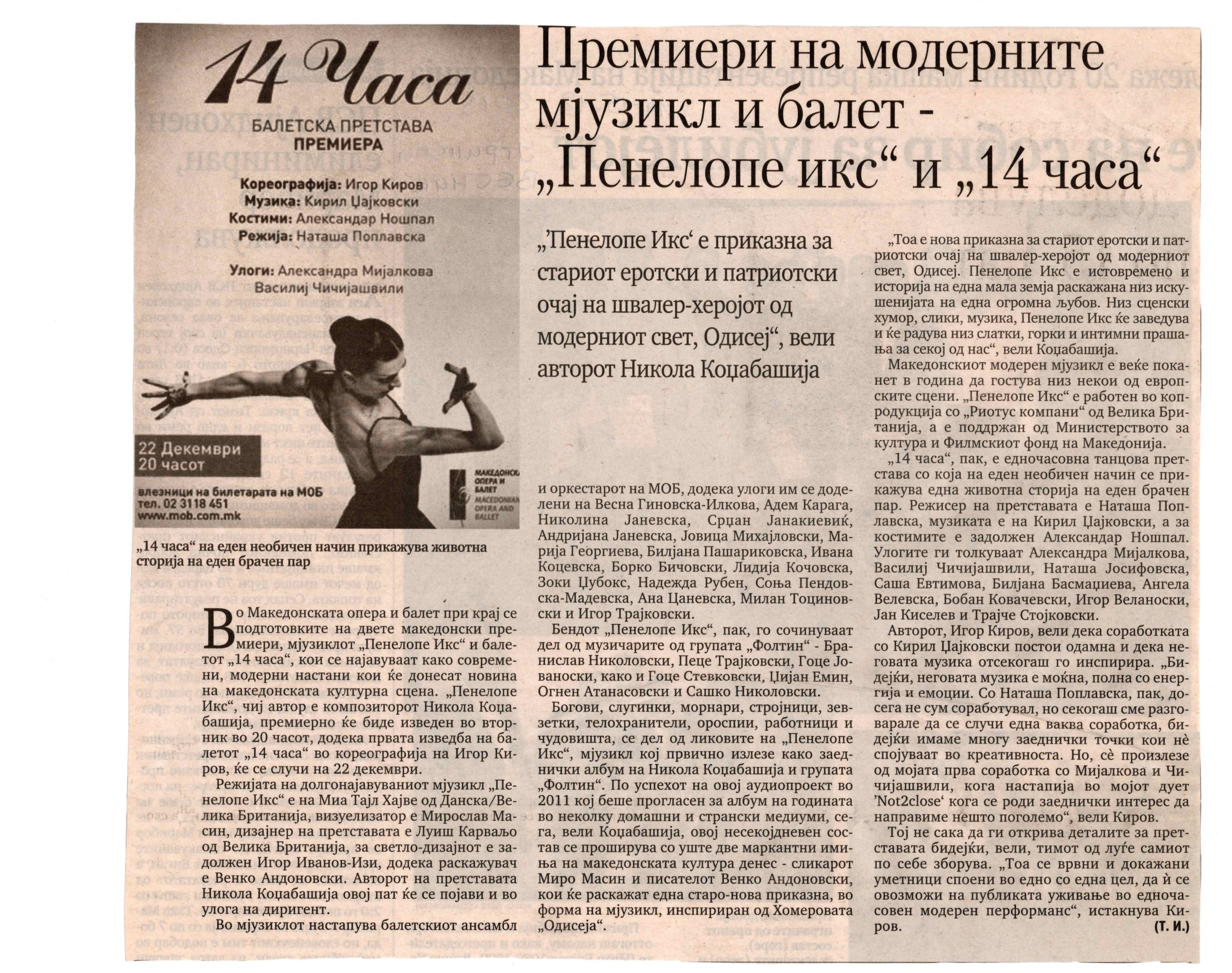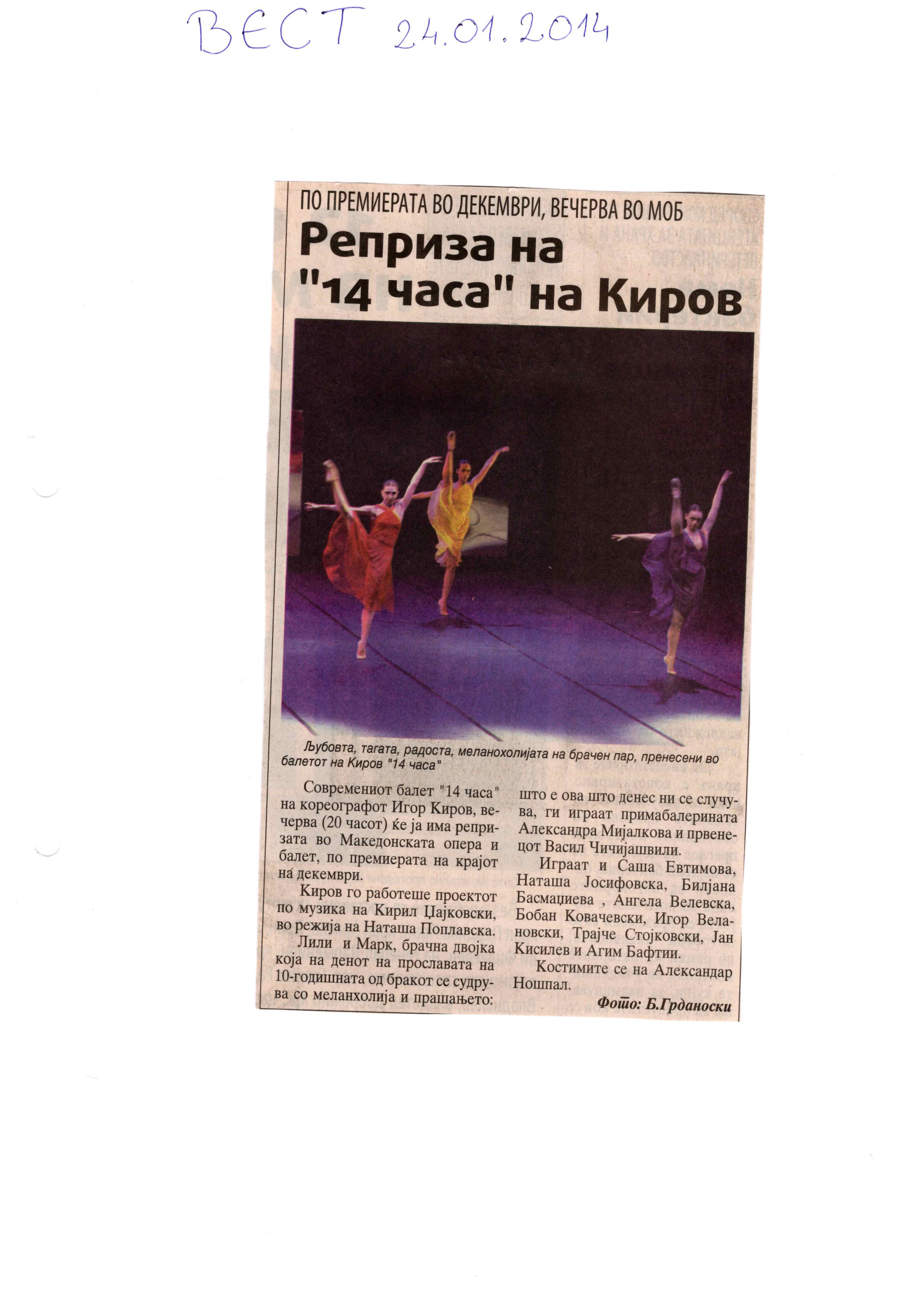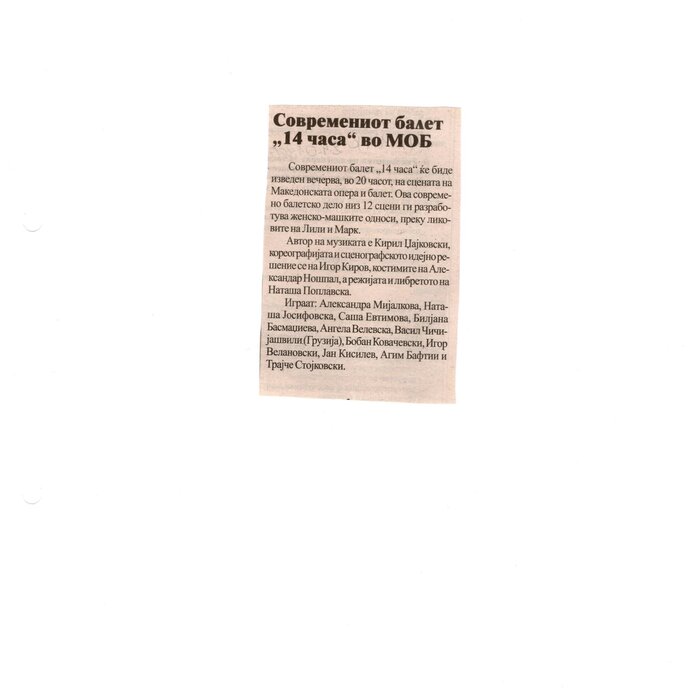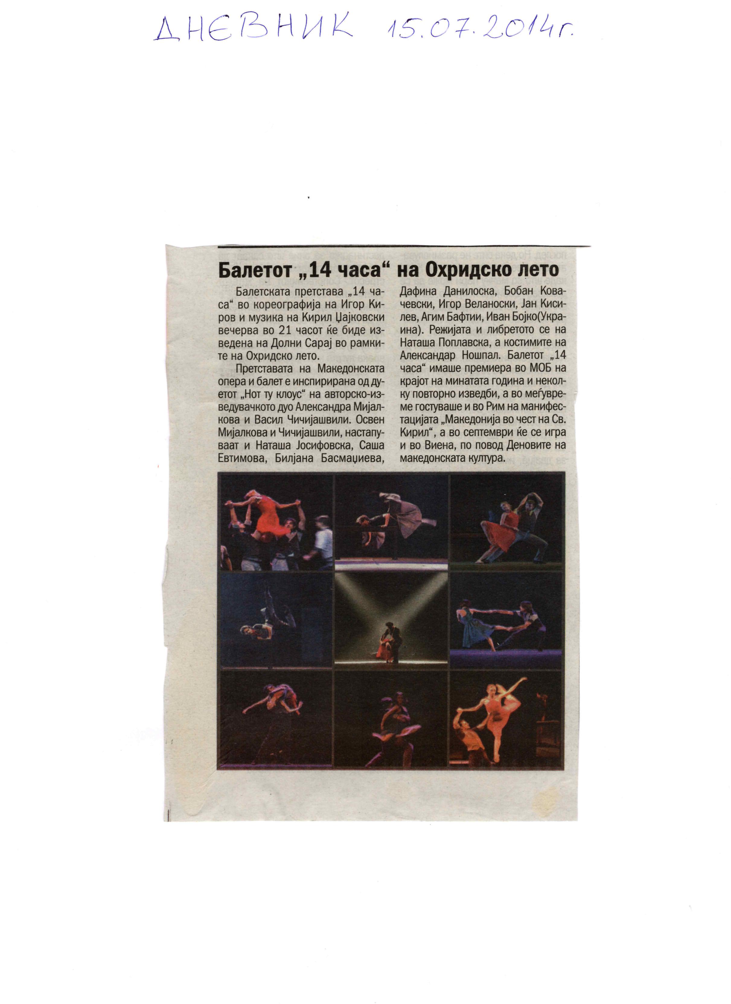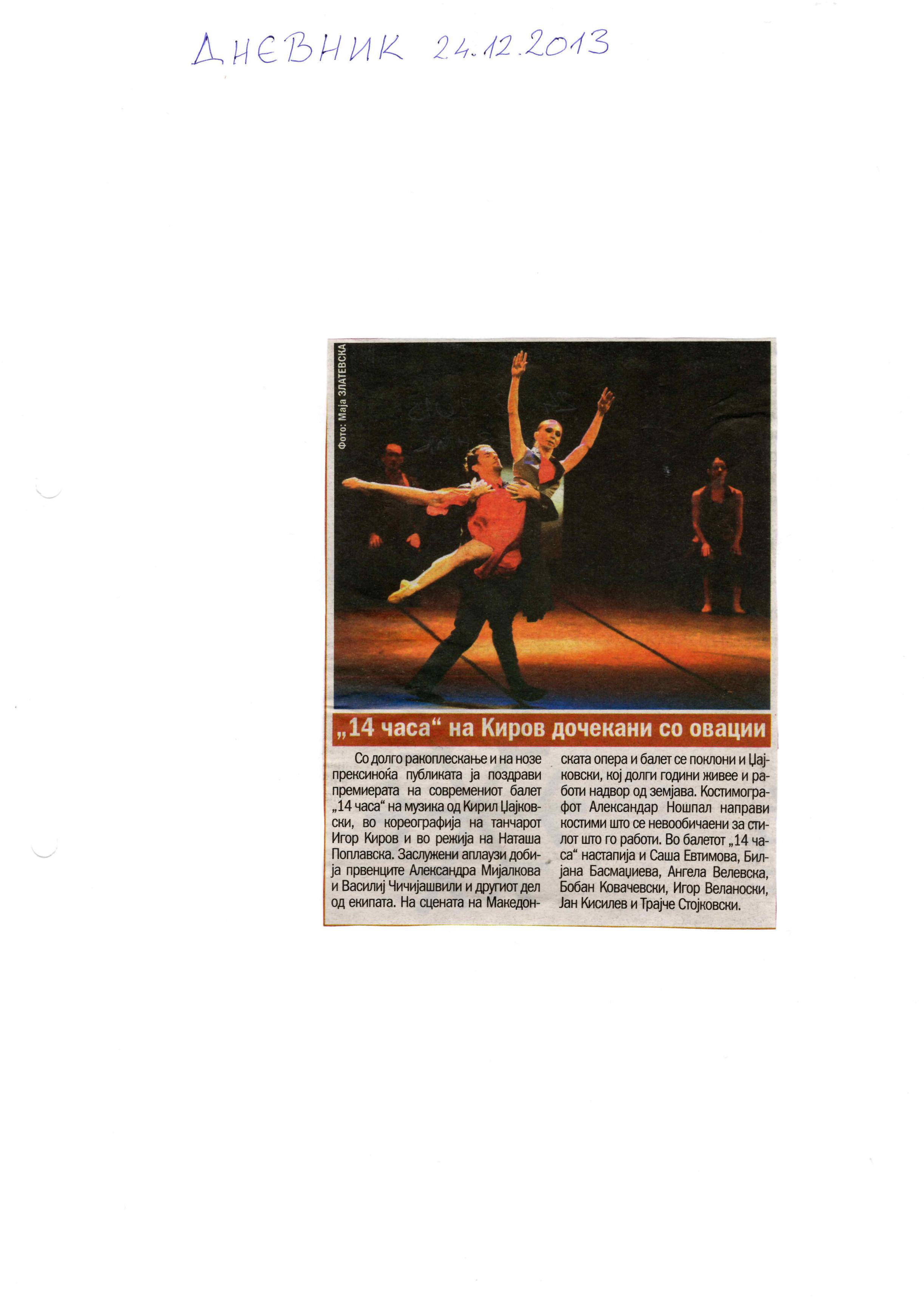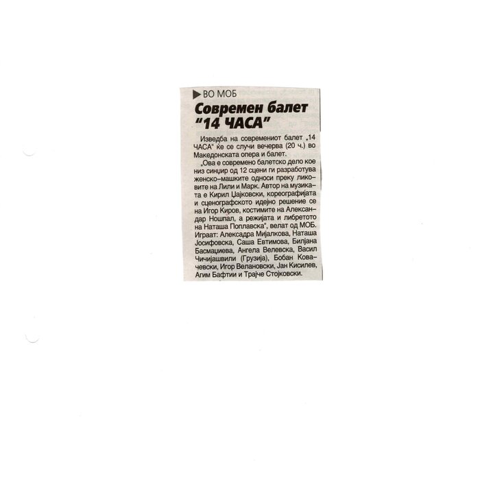 “14 Hours” is a contemporary ballet performance by Igor Kirov, created for the stage of the Macedonian Opera and Ballet. The music for the performance was composed by Kiril Džajkovski, while the libretto and direction were done by Natasha Poplavska.
