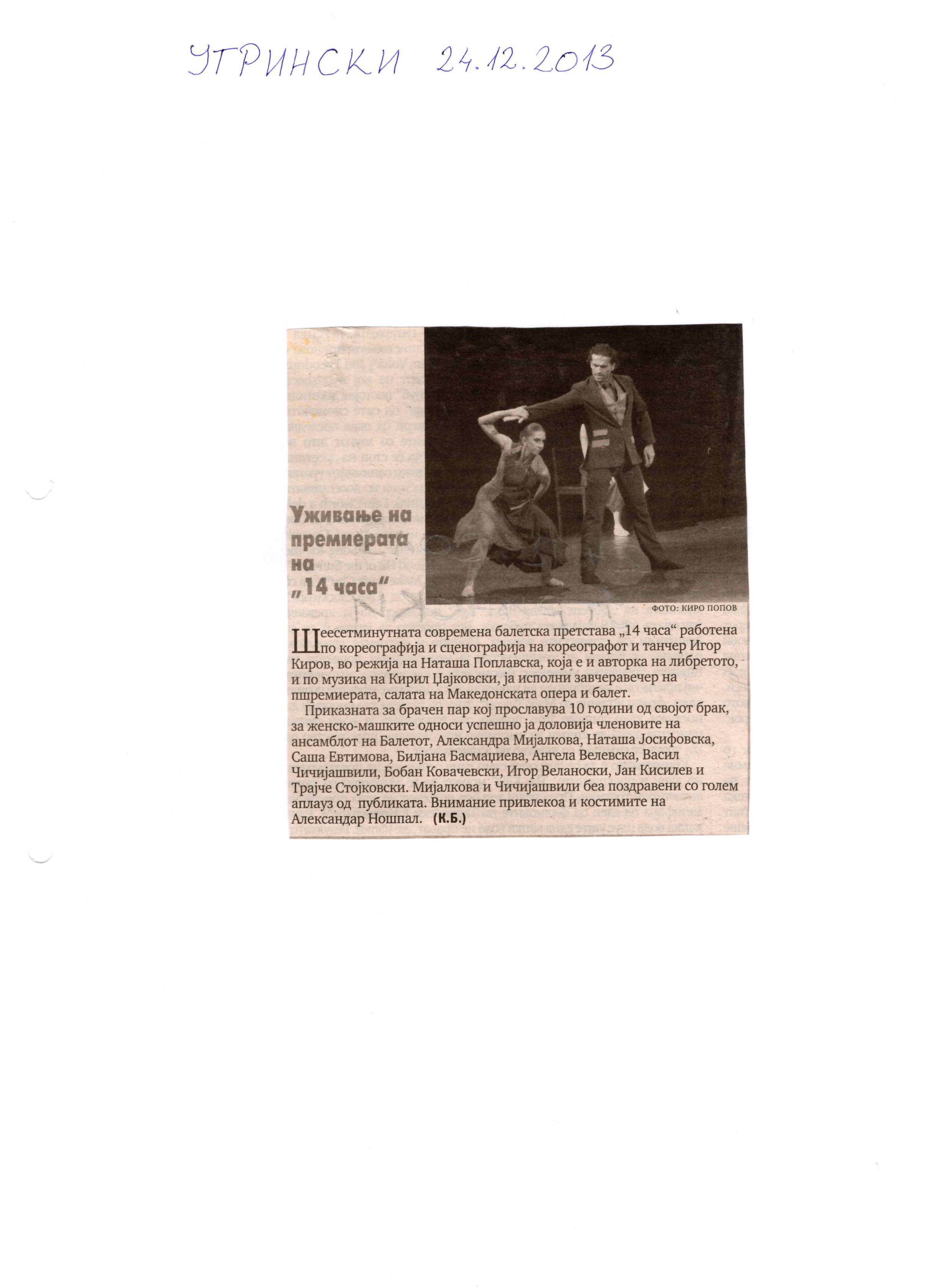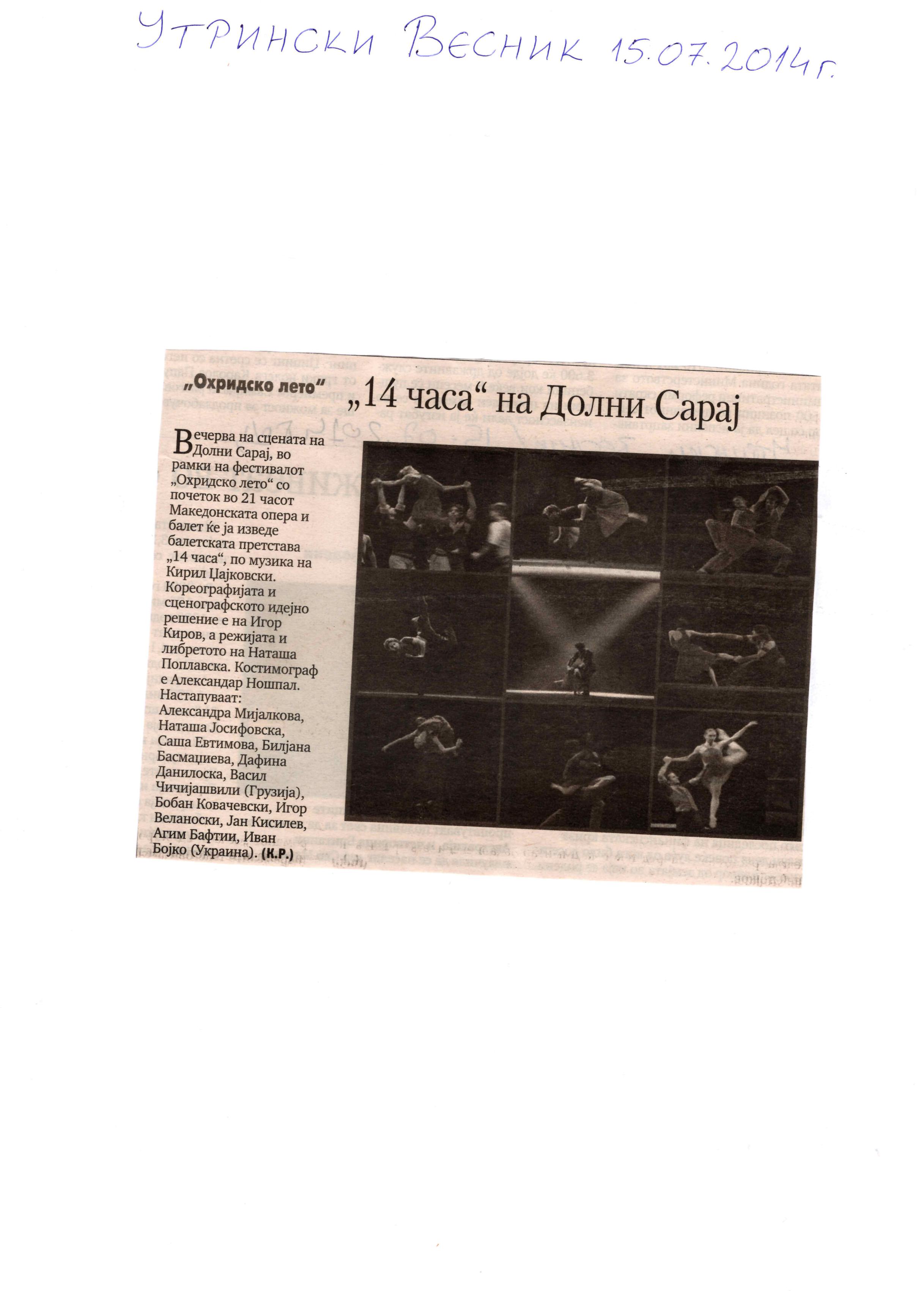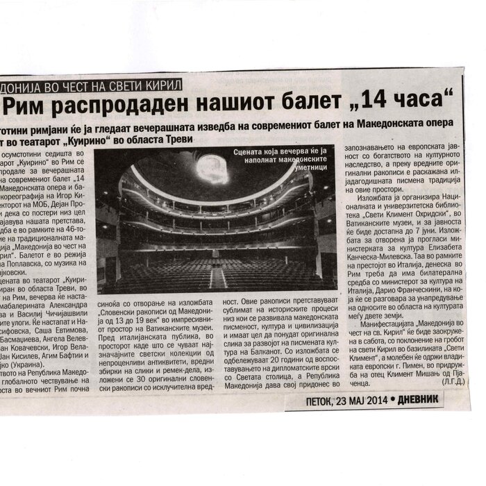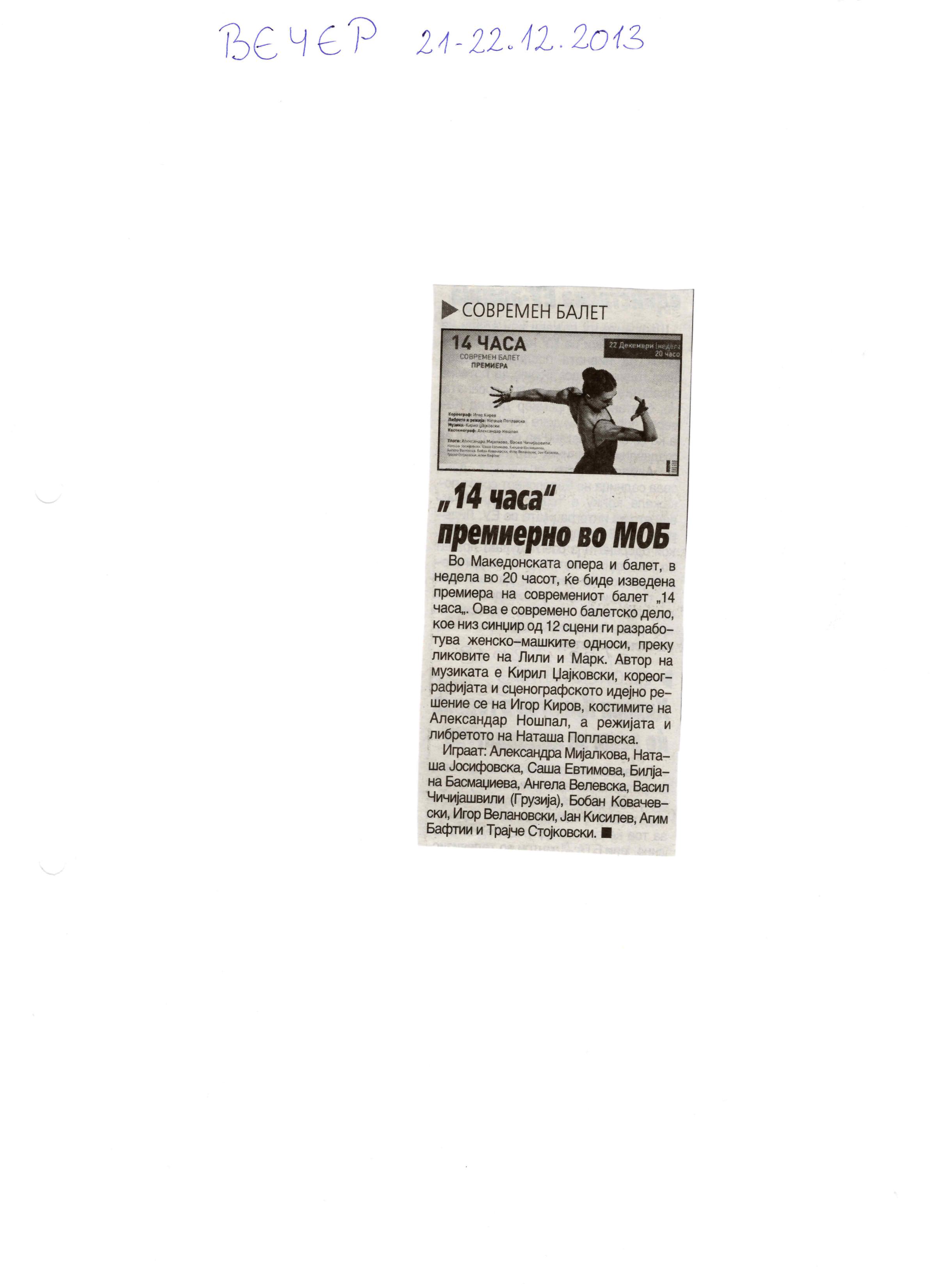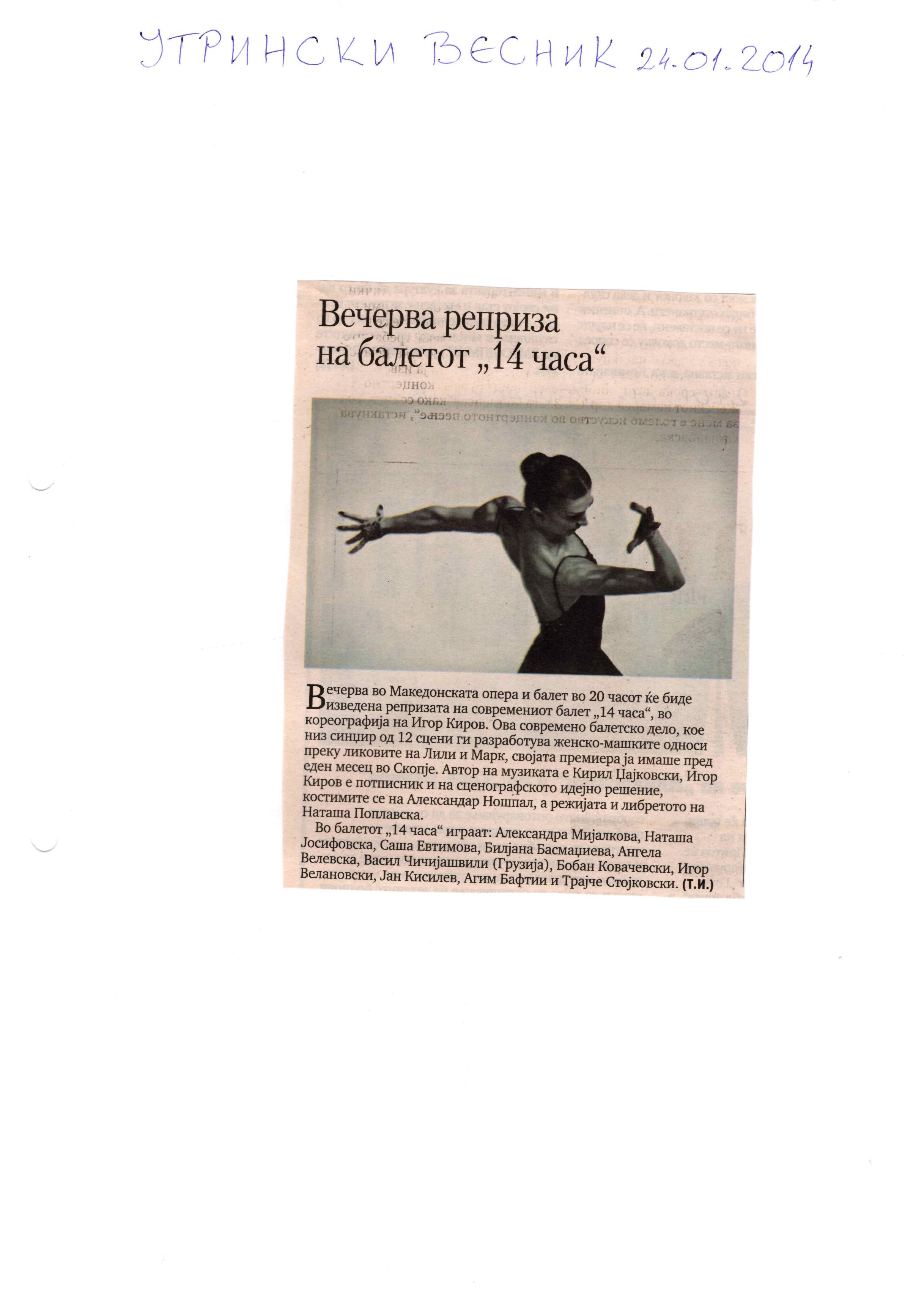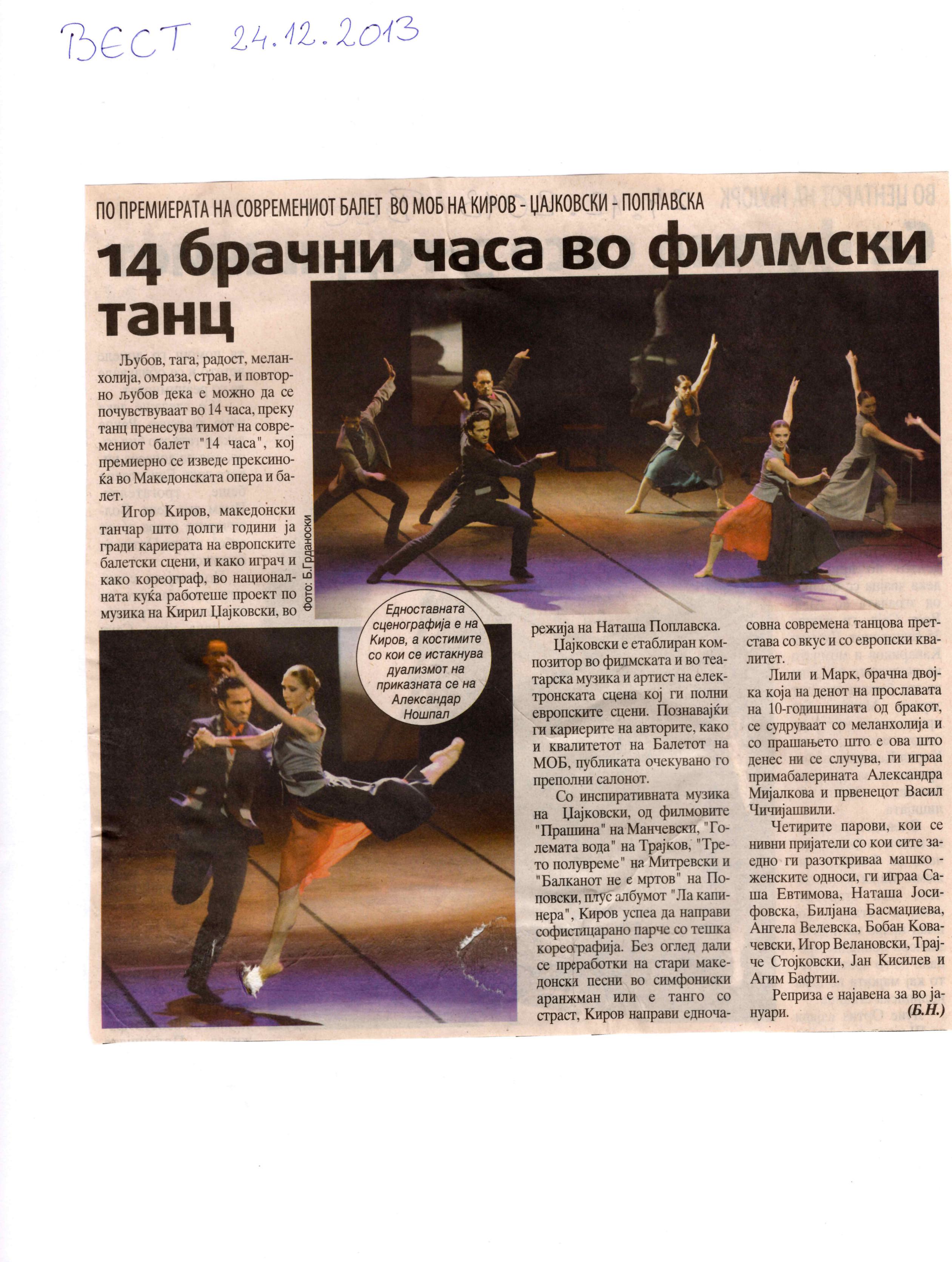 “14 Hours” is a contemporary ballet performance by Igor Kirov, created for the stage of the Macedonian Opera and Ballet. The music for the performance was composed by Kiril Džajkovski, while the libretto and direction were done by Natasha Poplavska.