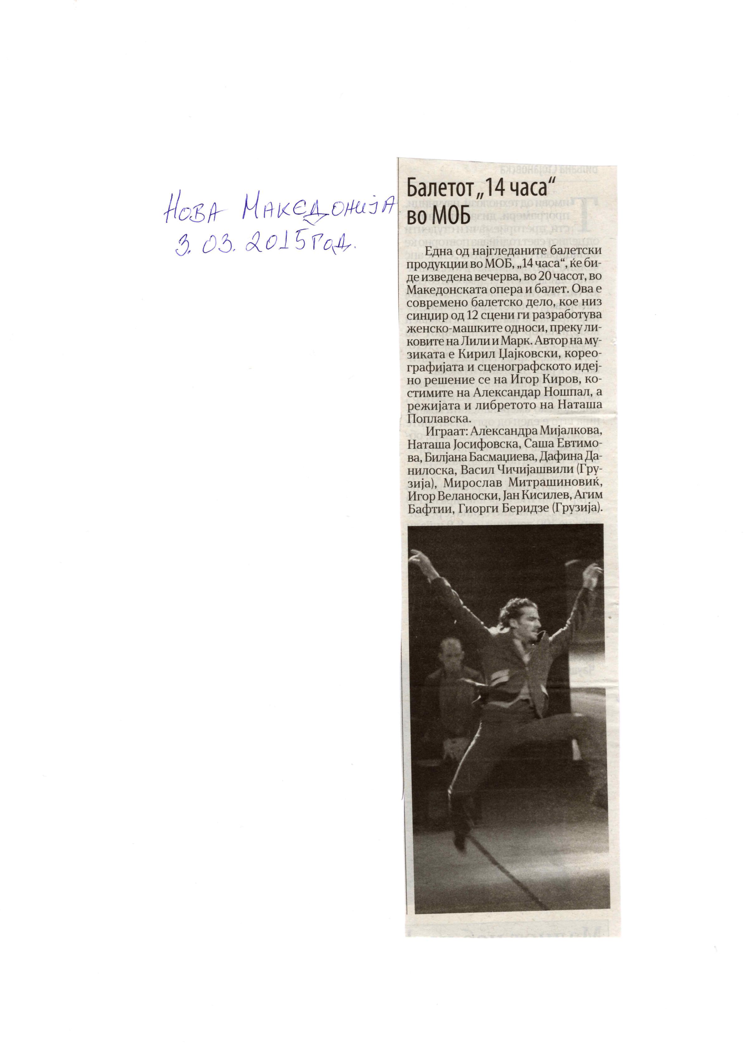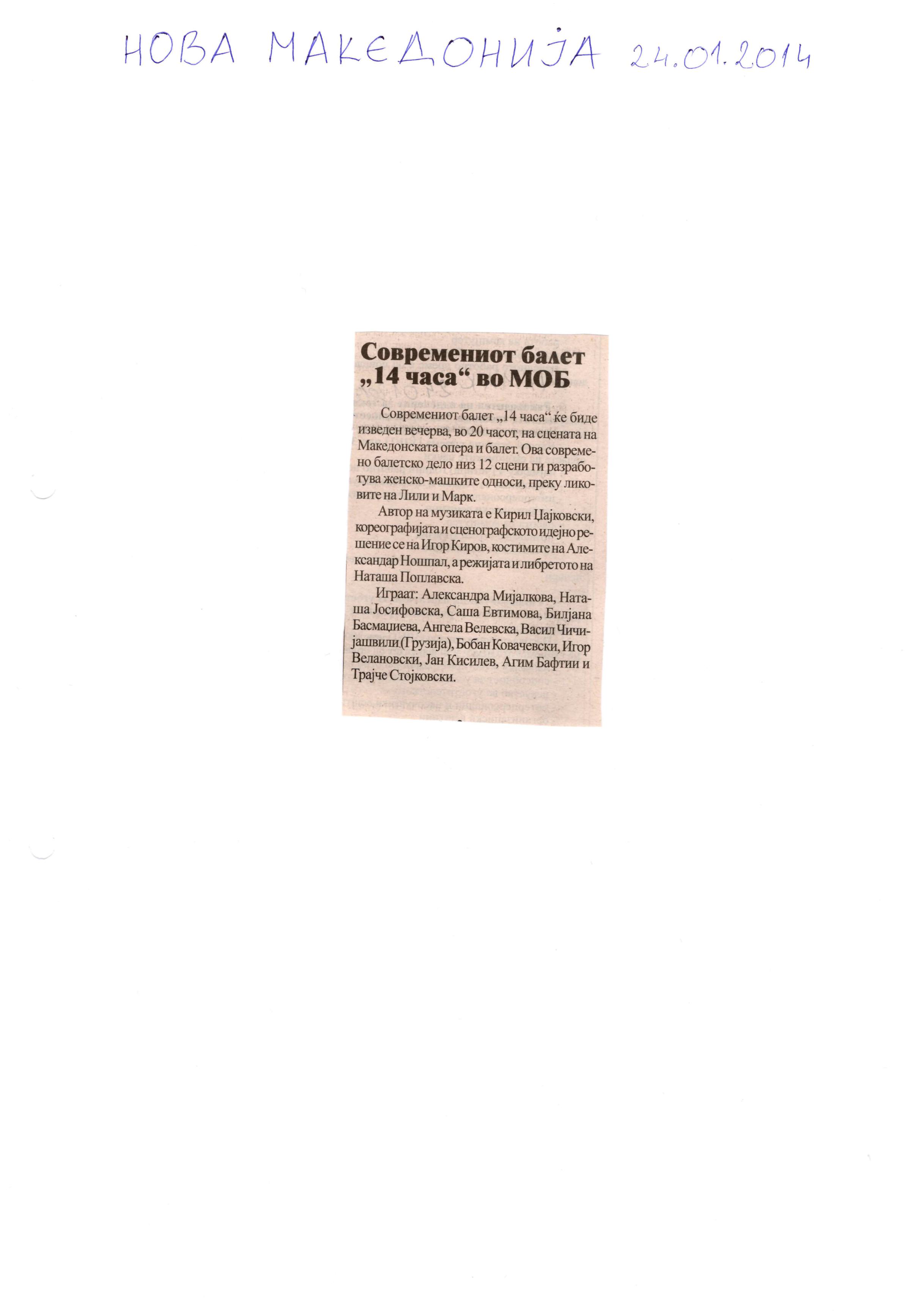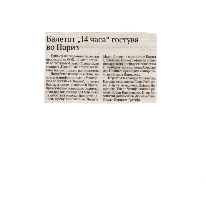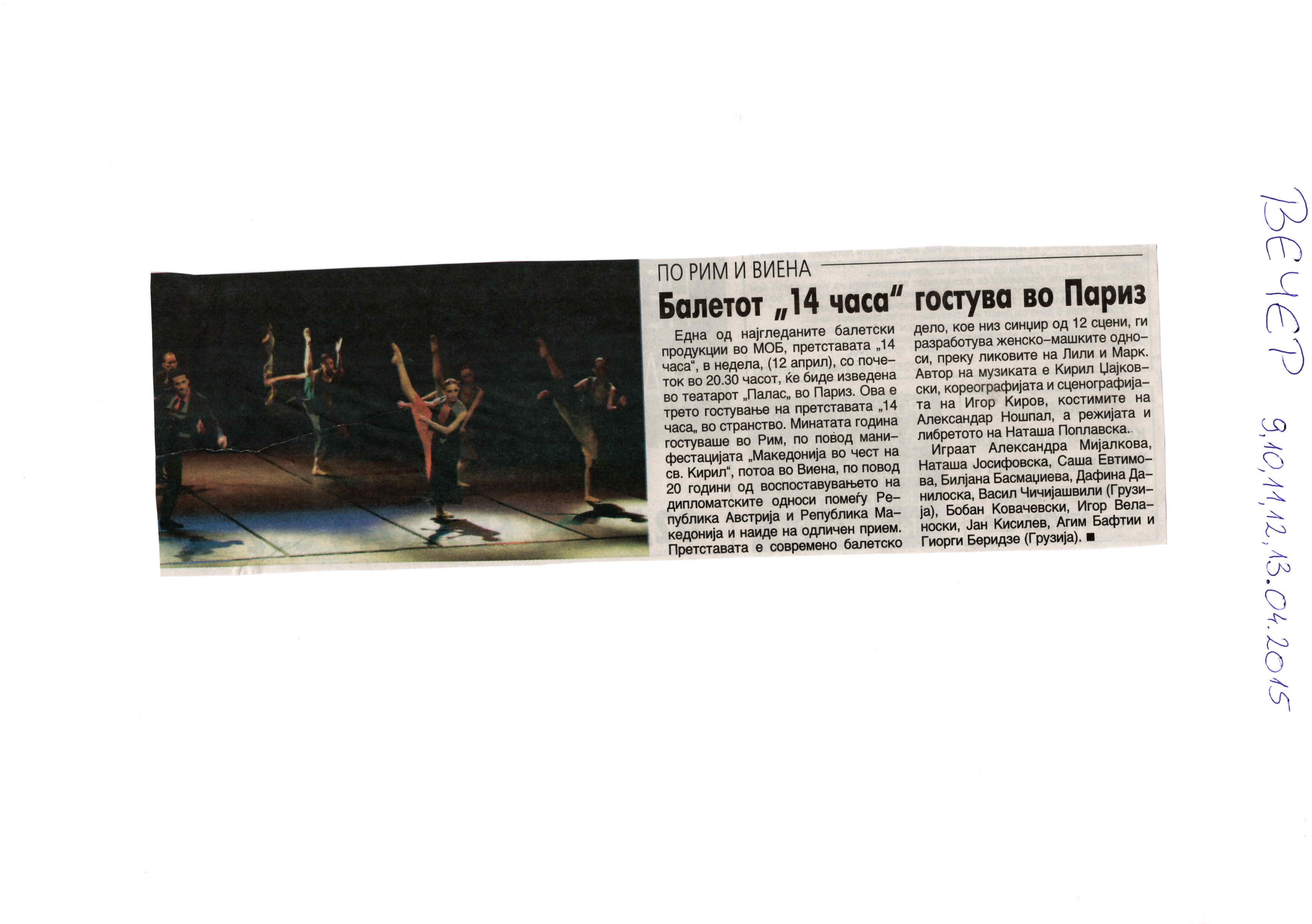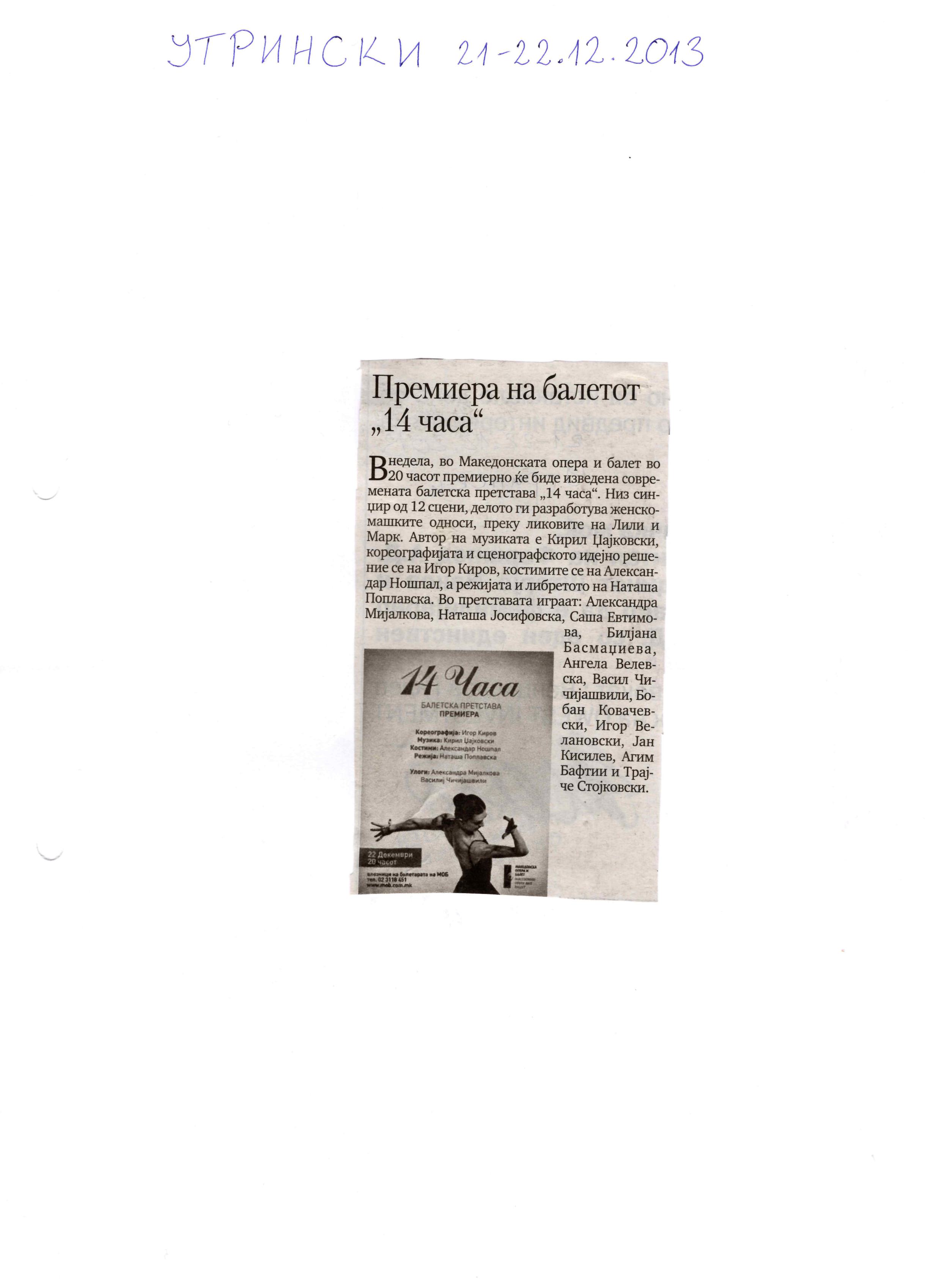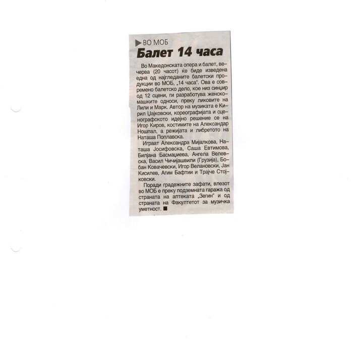 “14 Hours” is a contemporary ballet performance by Igor Kirov, created for the stage of the Macedonian Opera and Ballet. The music for the performance was composed by Kiril Džajkovski, while the libretto and direction were done by Natasha Poplavska.