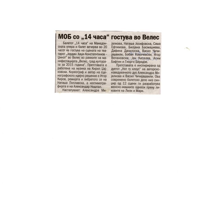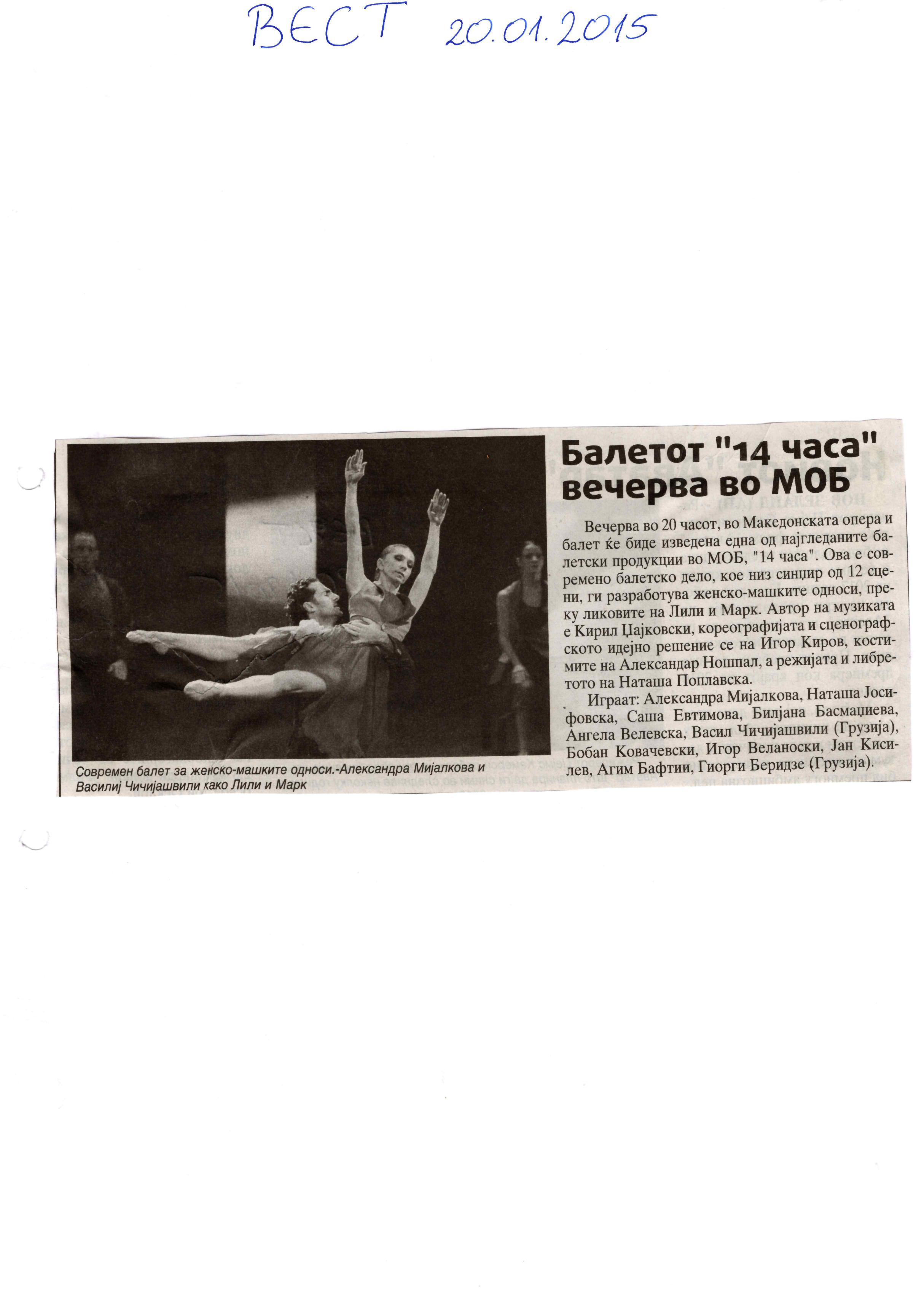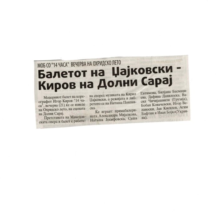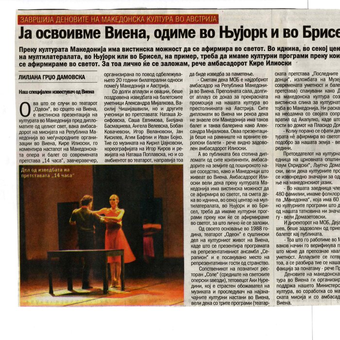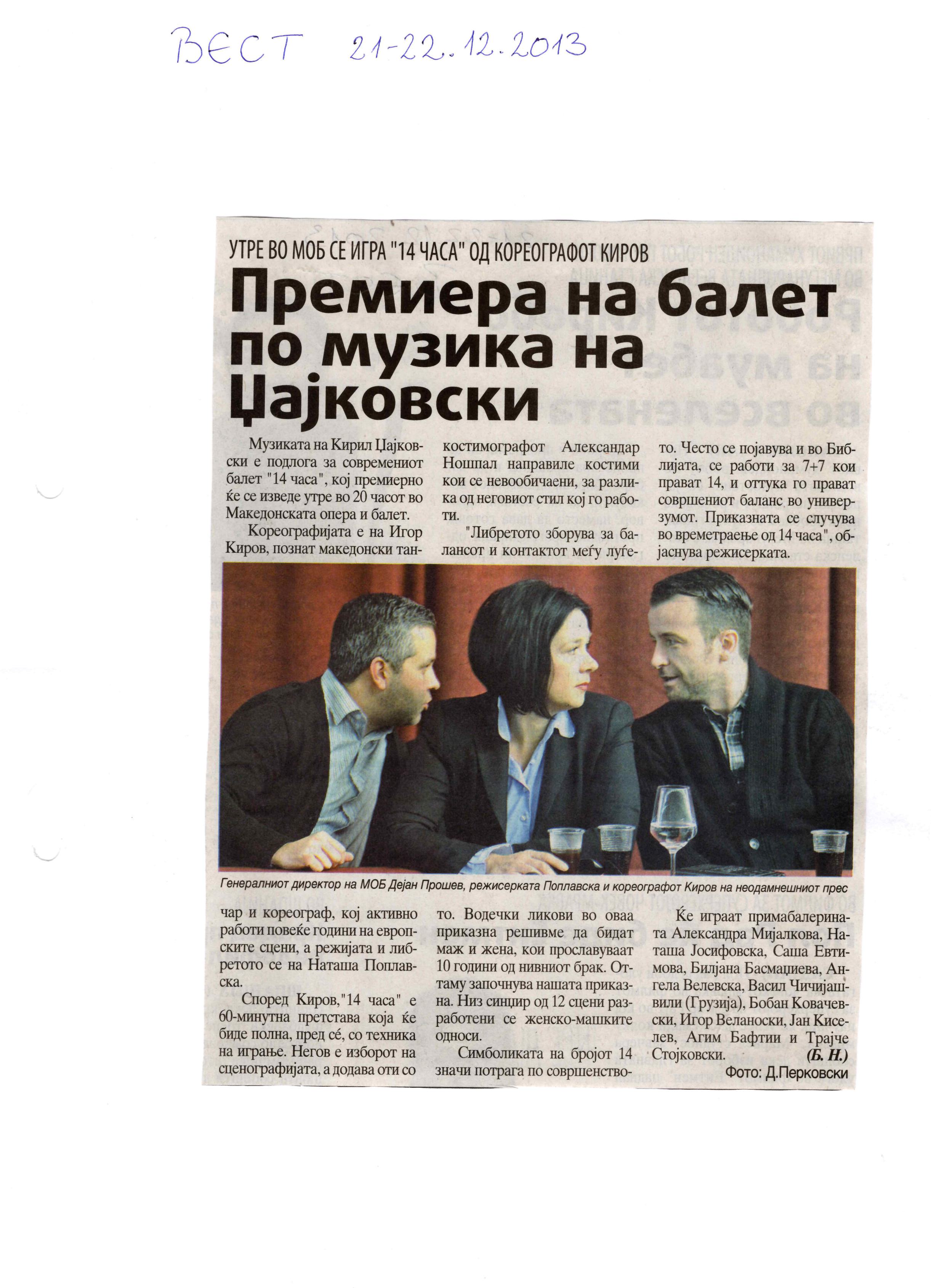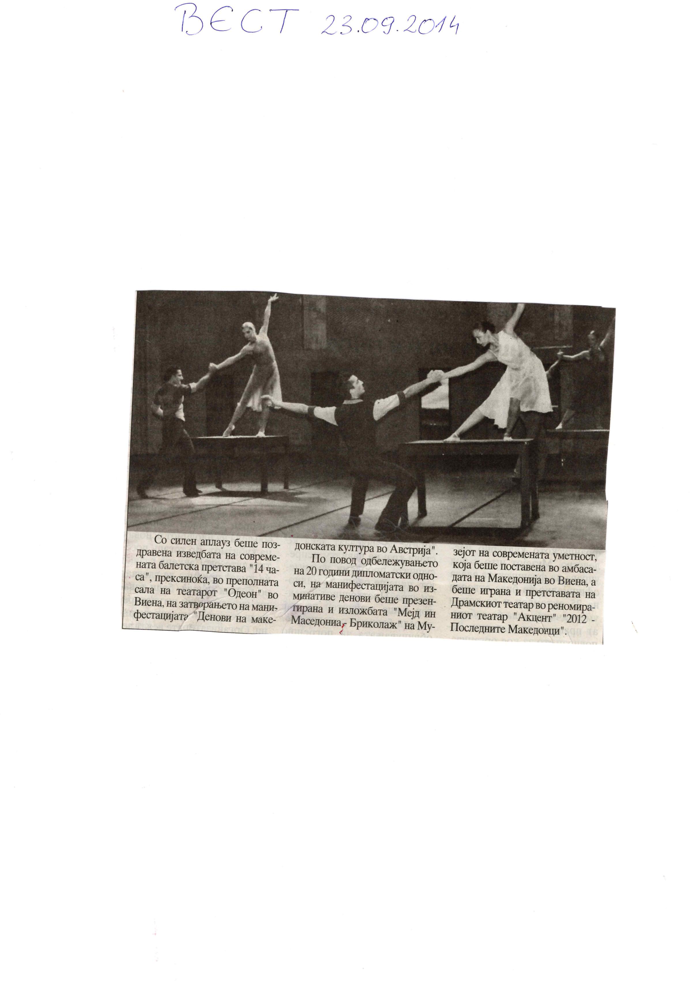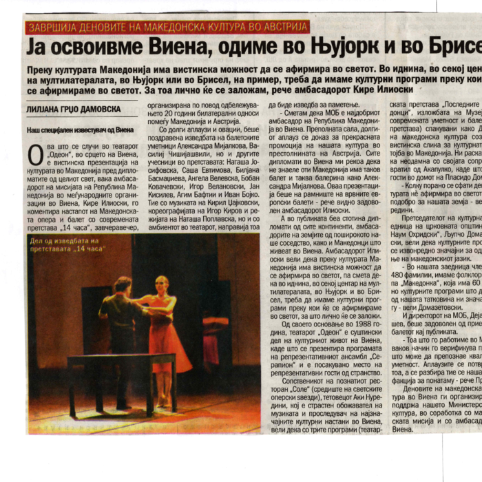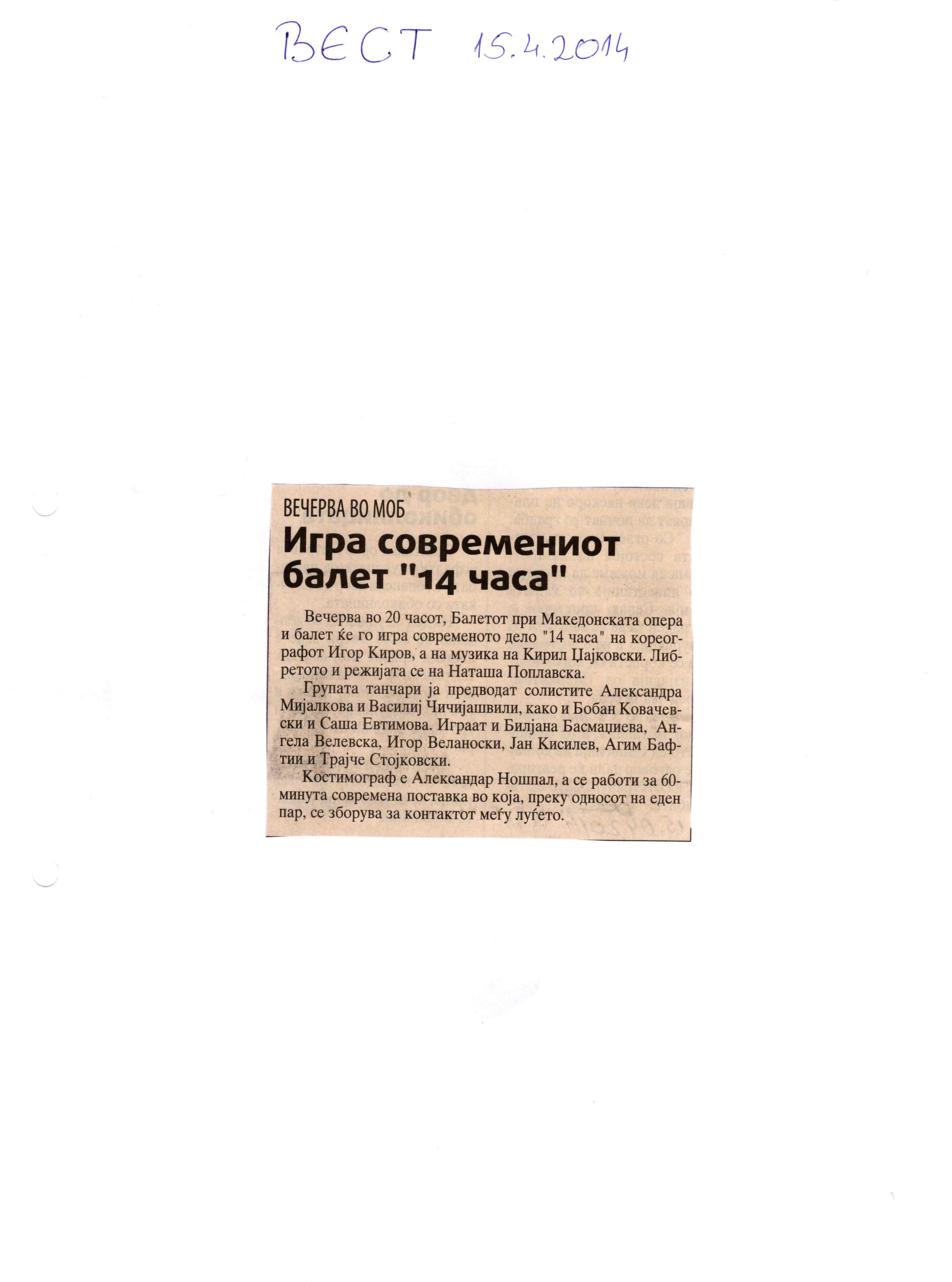 “14 Hours” is a contemporary ballet performance by Igor Kirov, created for the stage of the Macedonian Opera and Ballet. The music for the performance was composed by Kiril Džajkovski, while the libretto and direction were done by Natasha Poplavska.