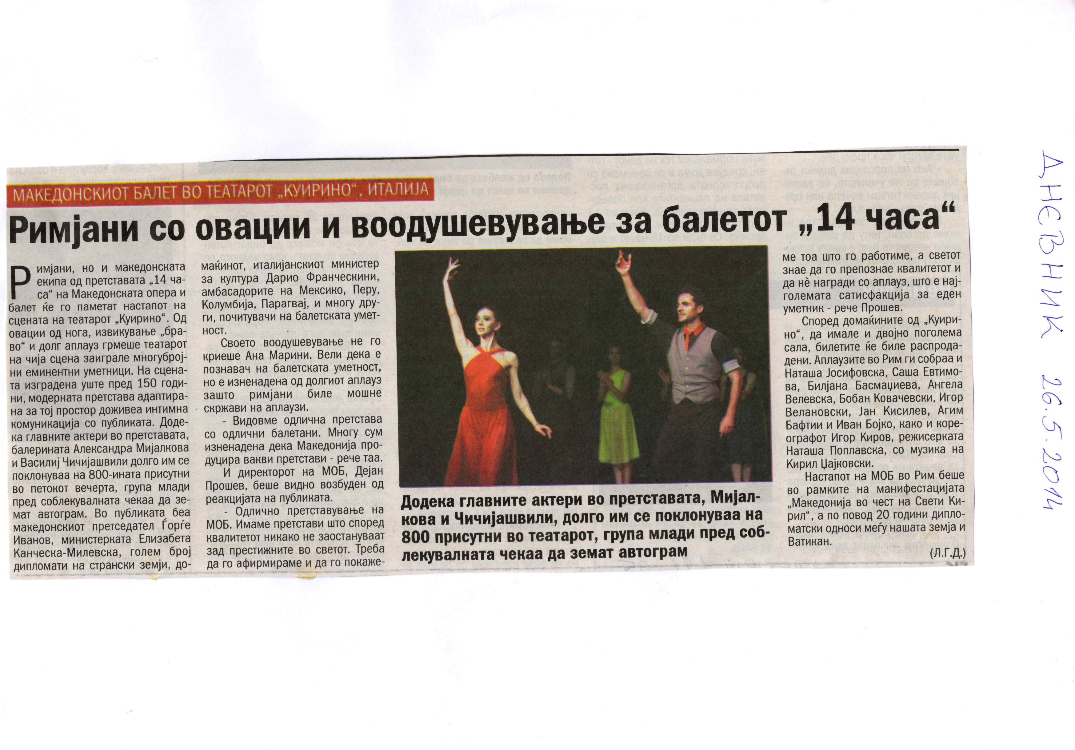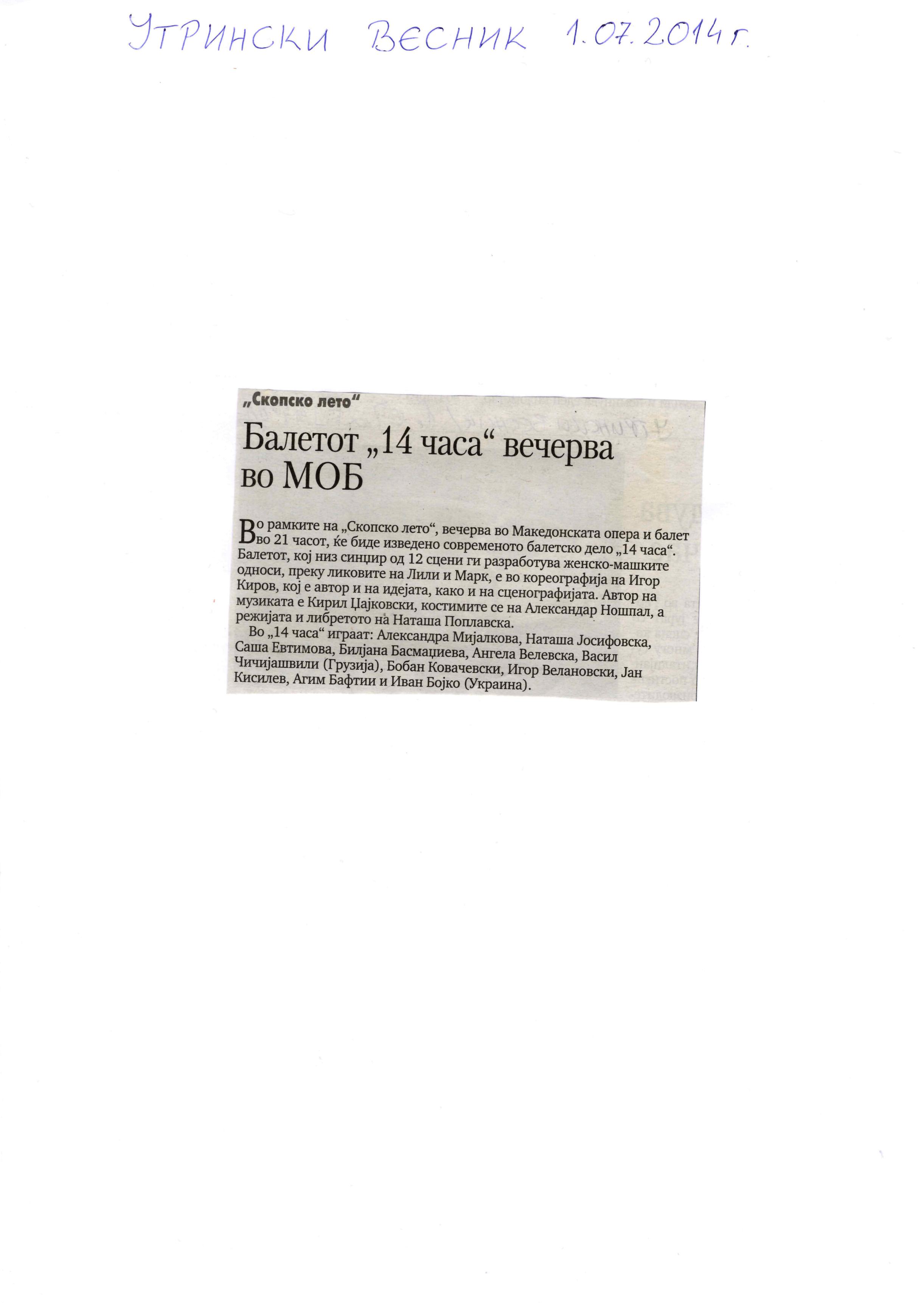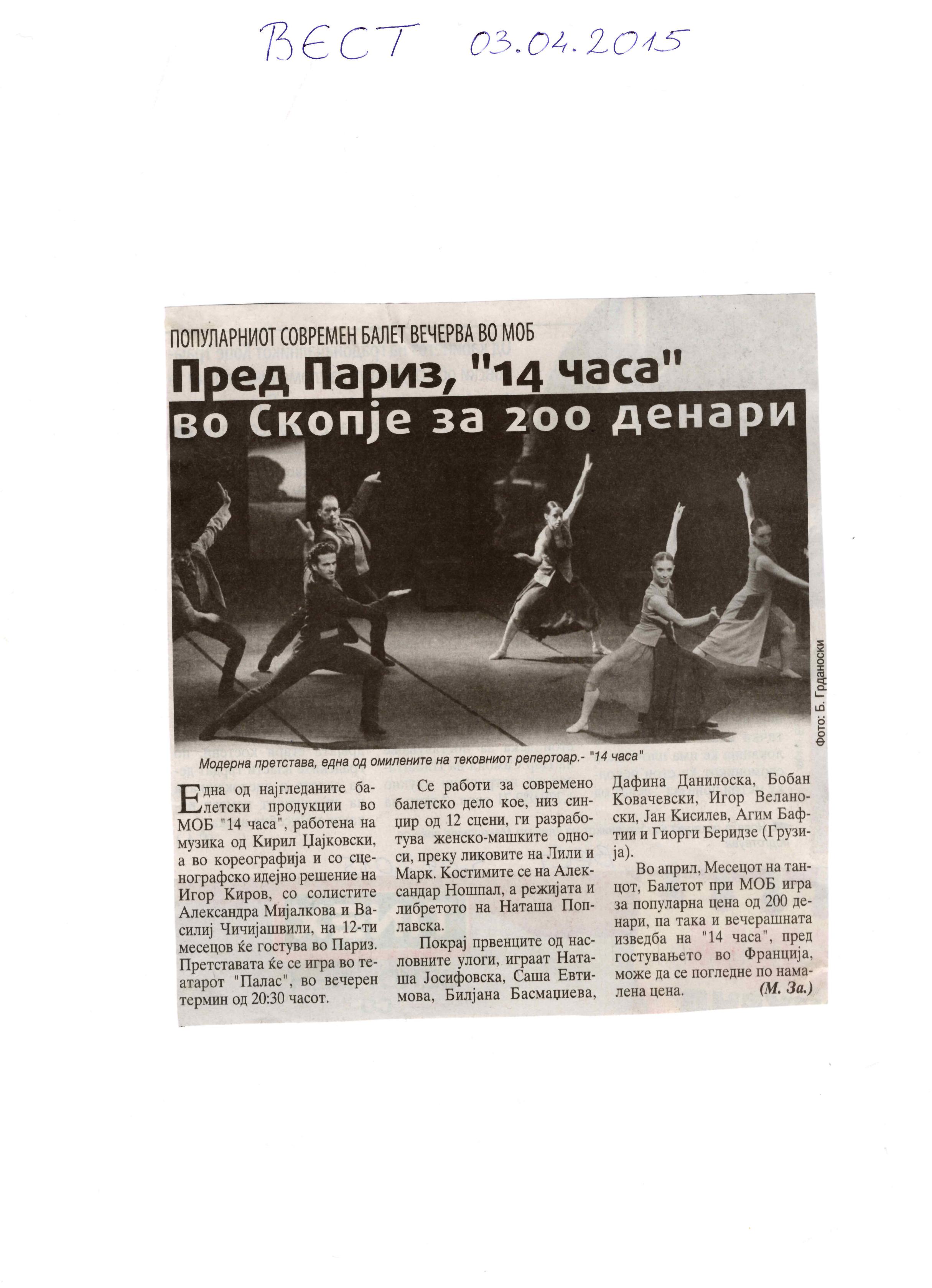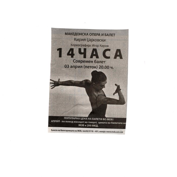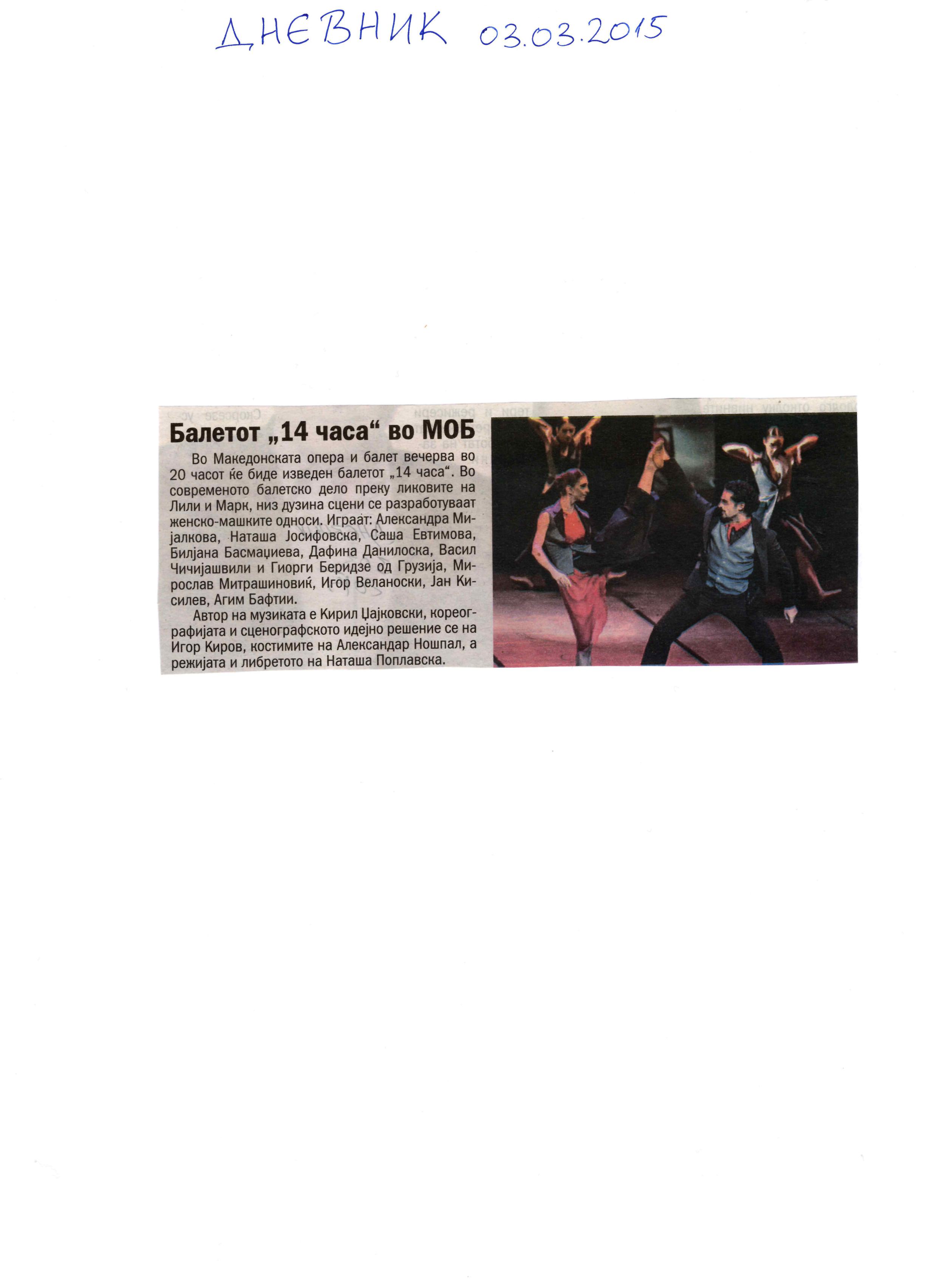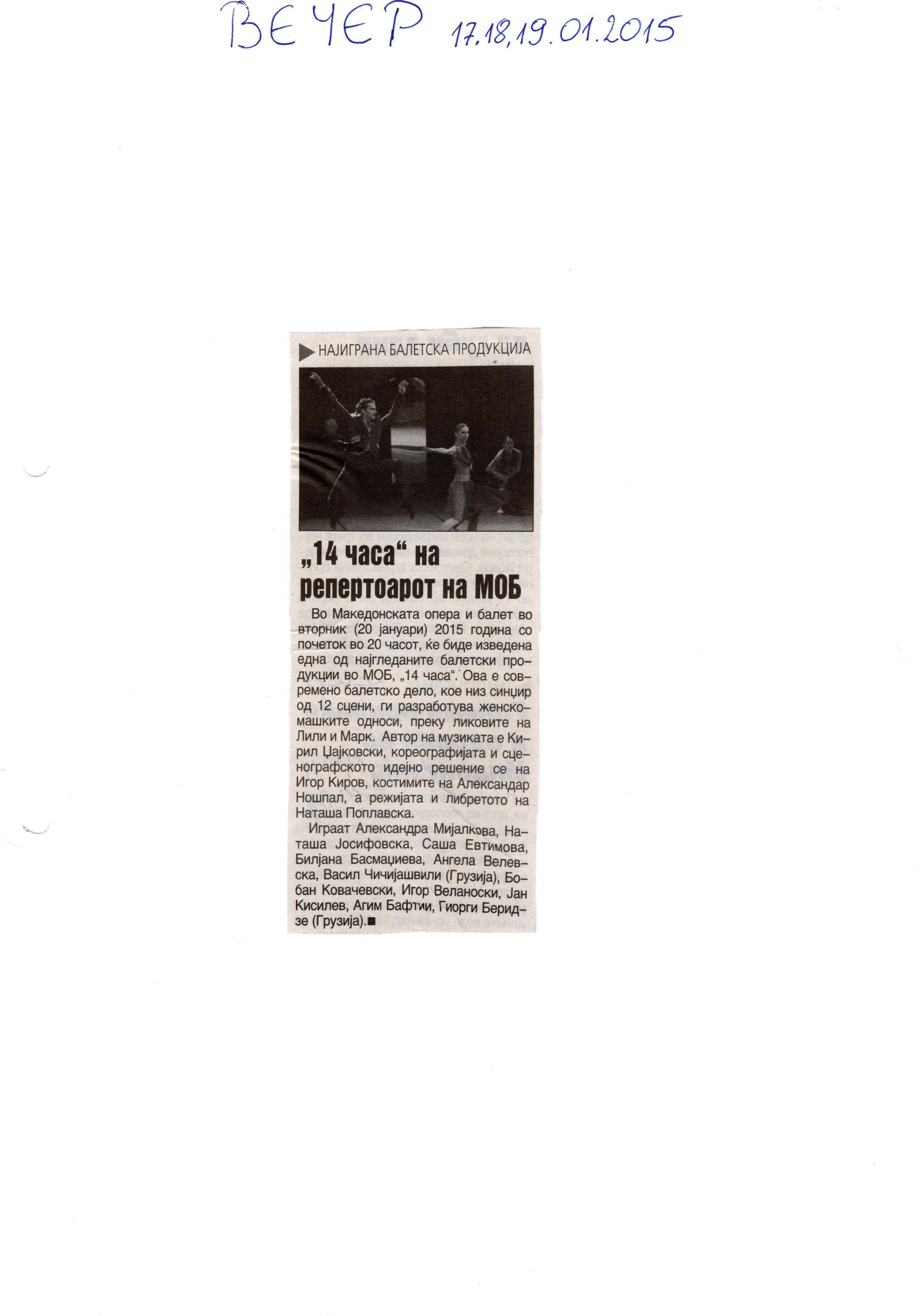 “14 Hours” is a contemporary ballet performance by Igor Kirov, created for the stage of the Macedonian Opera and Ballet. The music for the performance was composed by Kiril Džajkovski, while the libretto and direction were done by Natasha Poplavska.