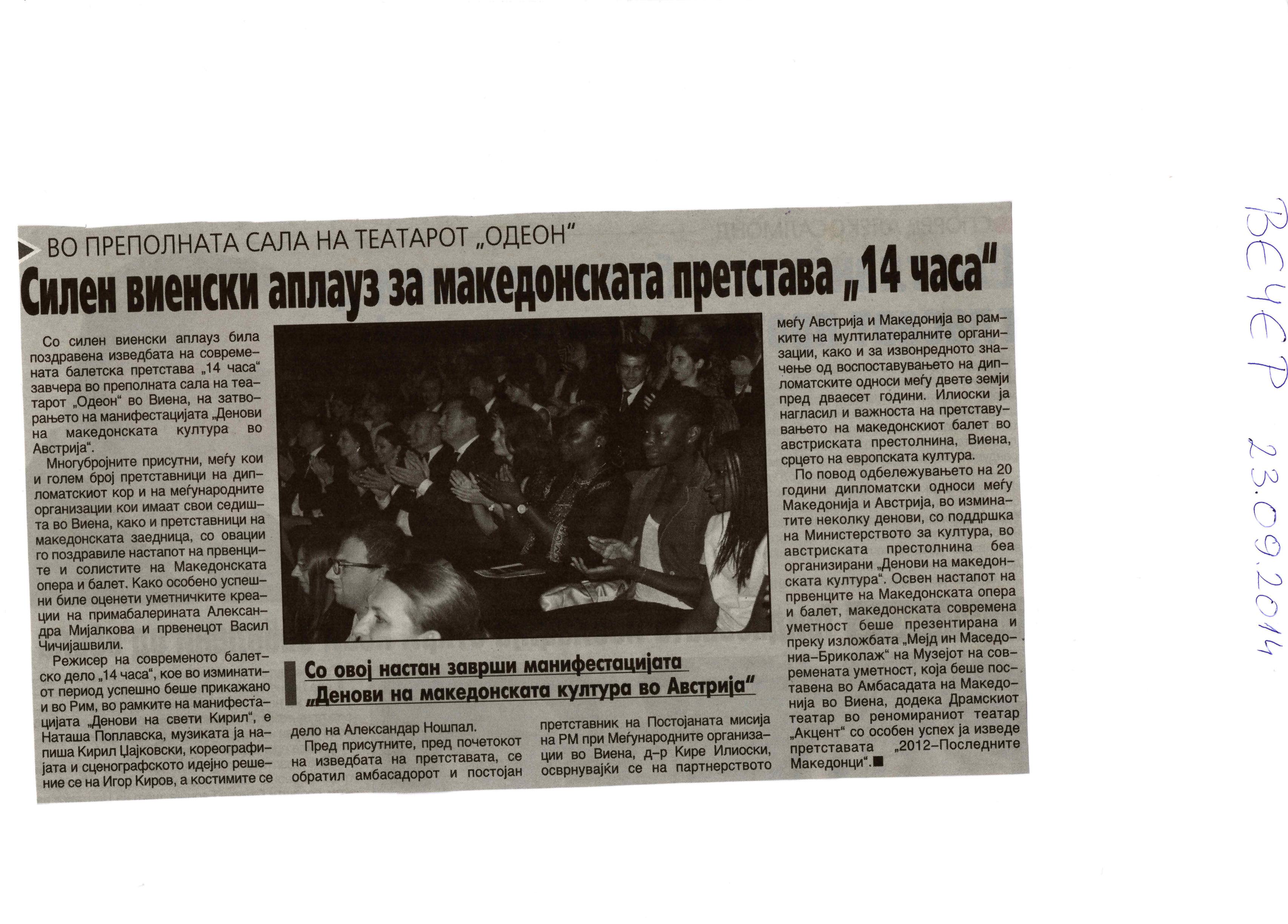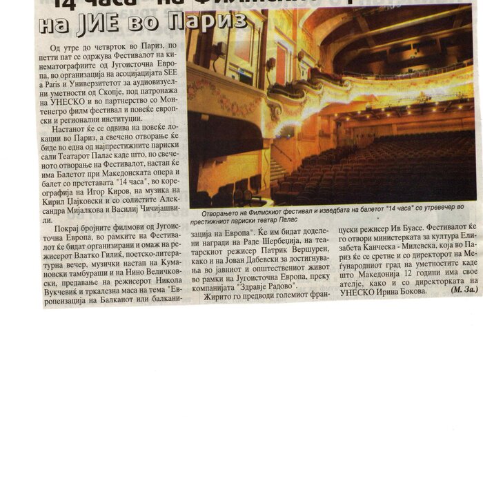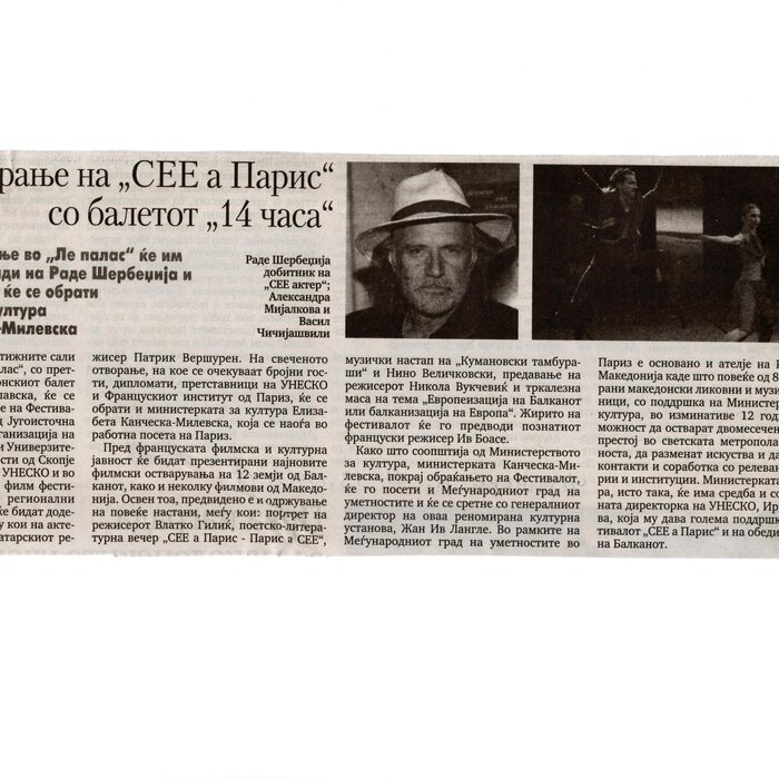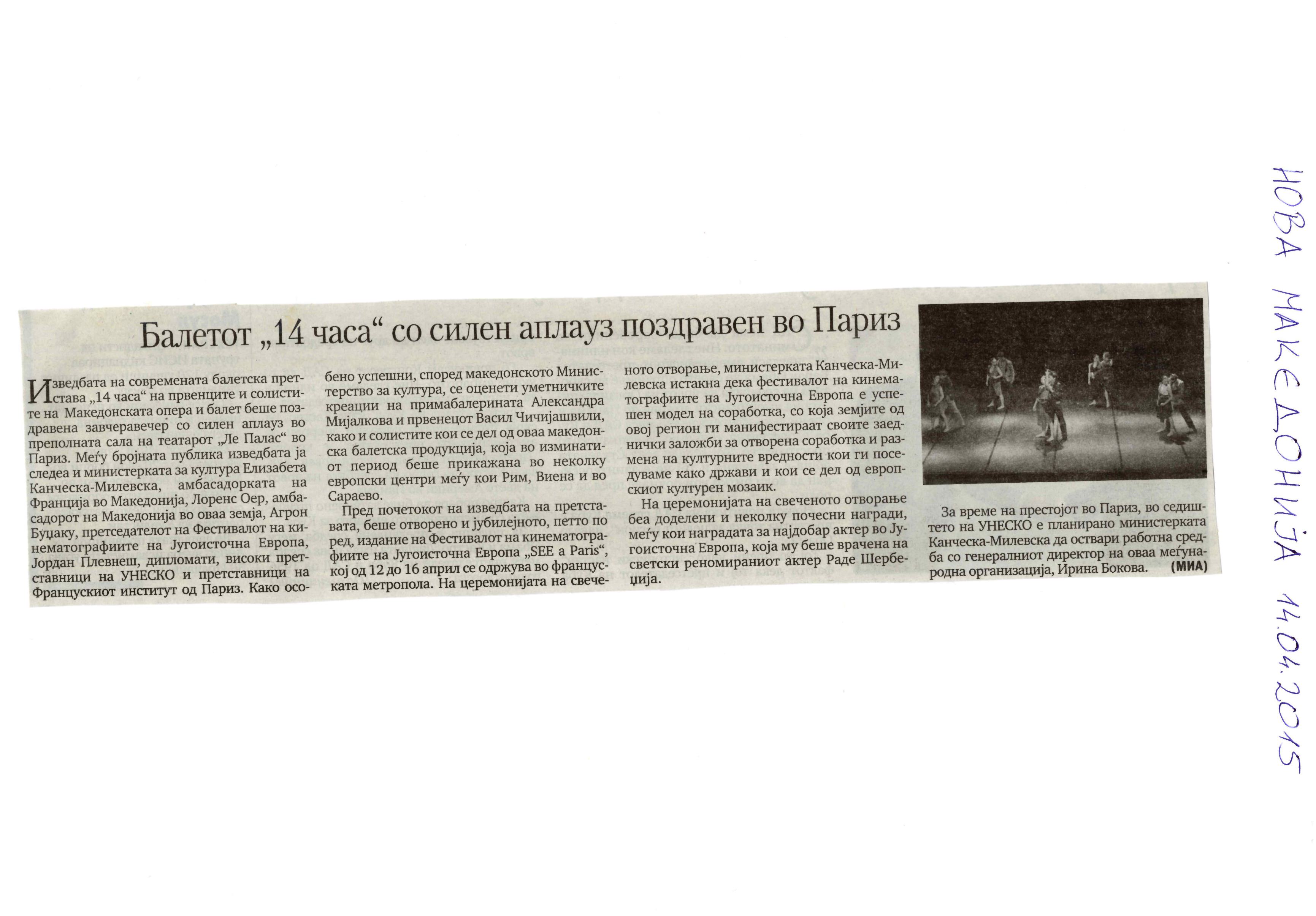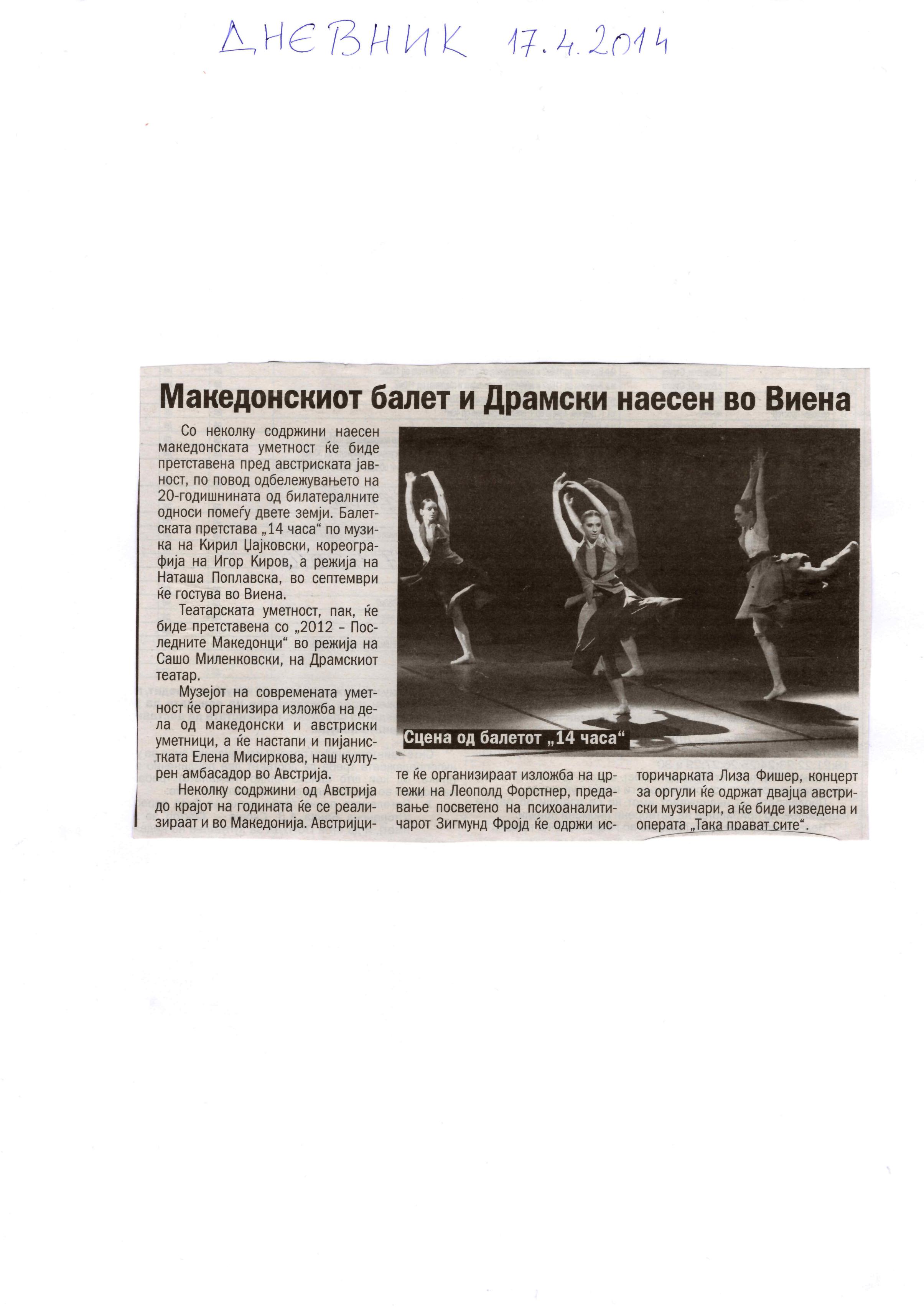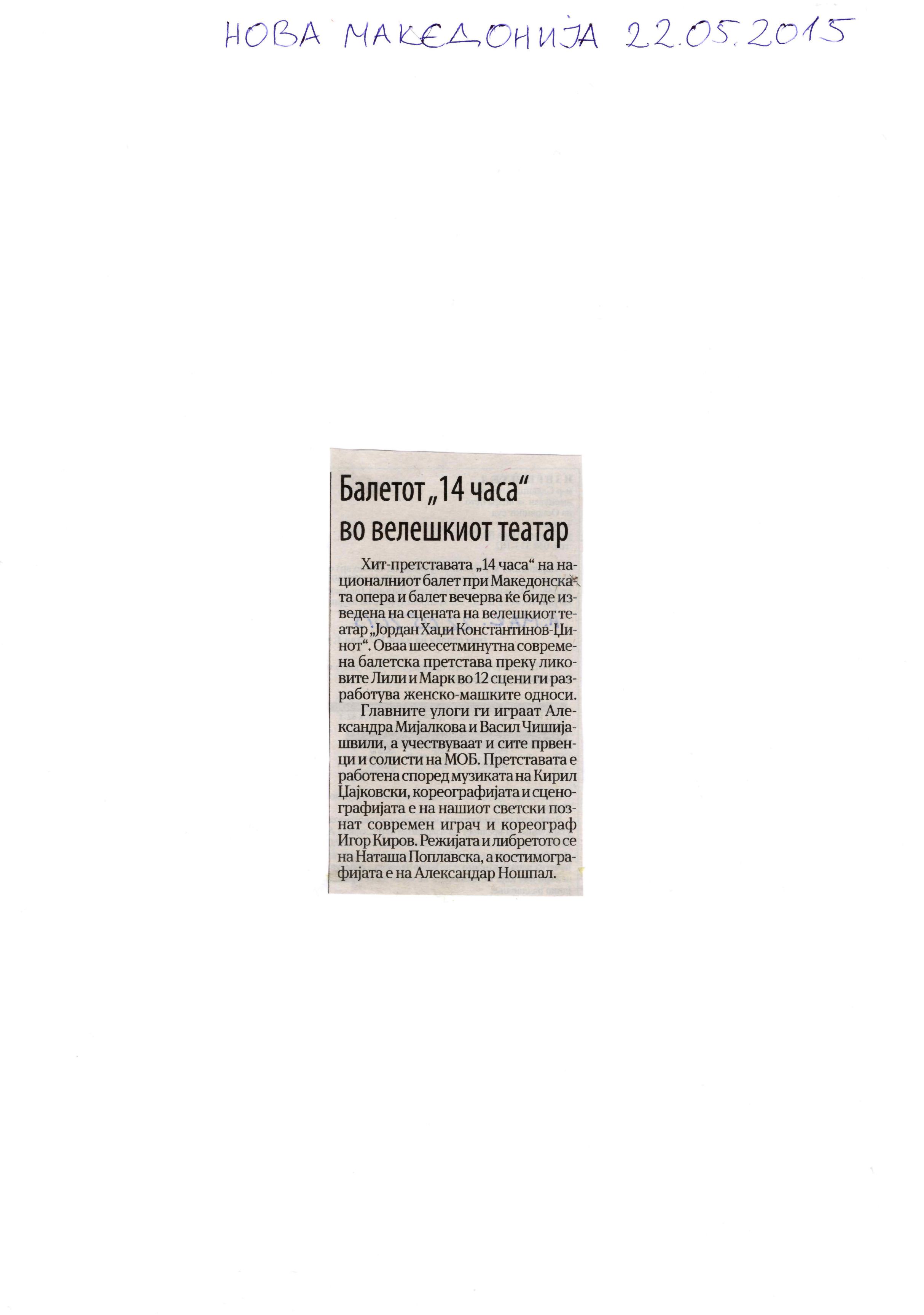 “14 Hours” is a contemporary ballet performance by Igor Kirov, created for the stage of the Macedonian Opera and Ballet. The music for the performance was composed by Kiril Džajkovski, while the libretto and direction were done by Natasha Poplavska.