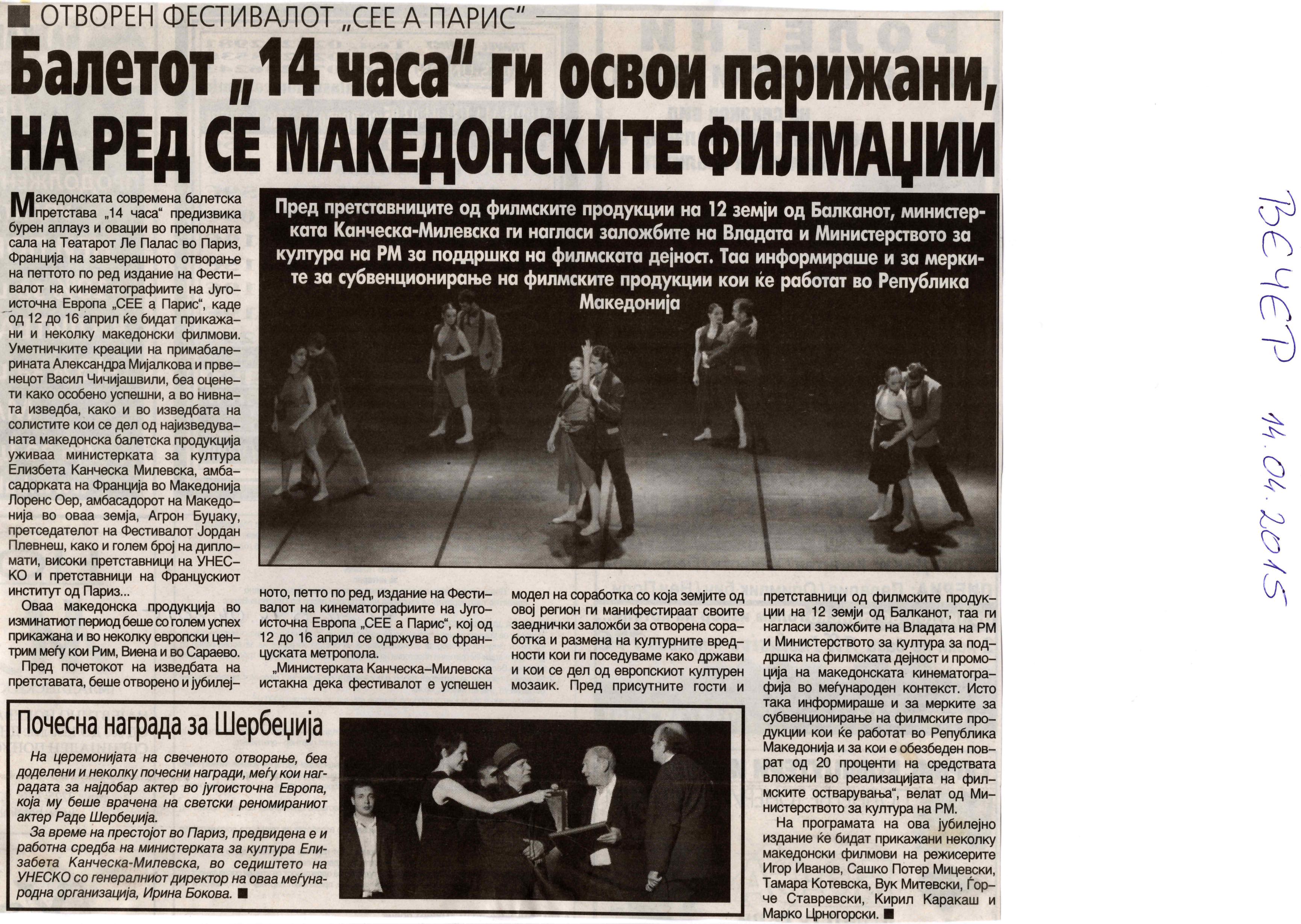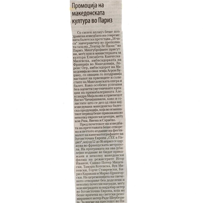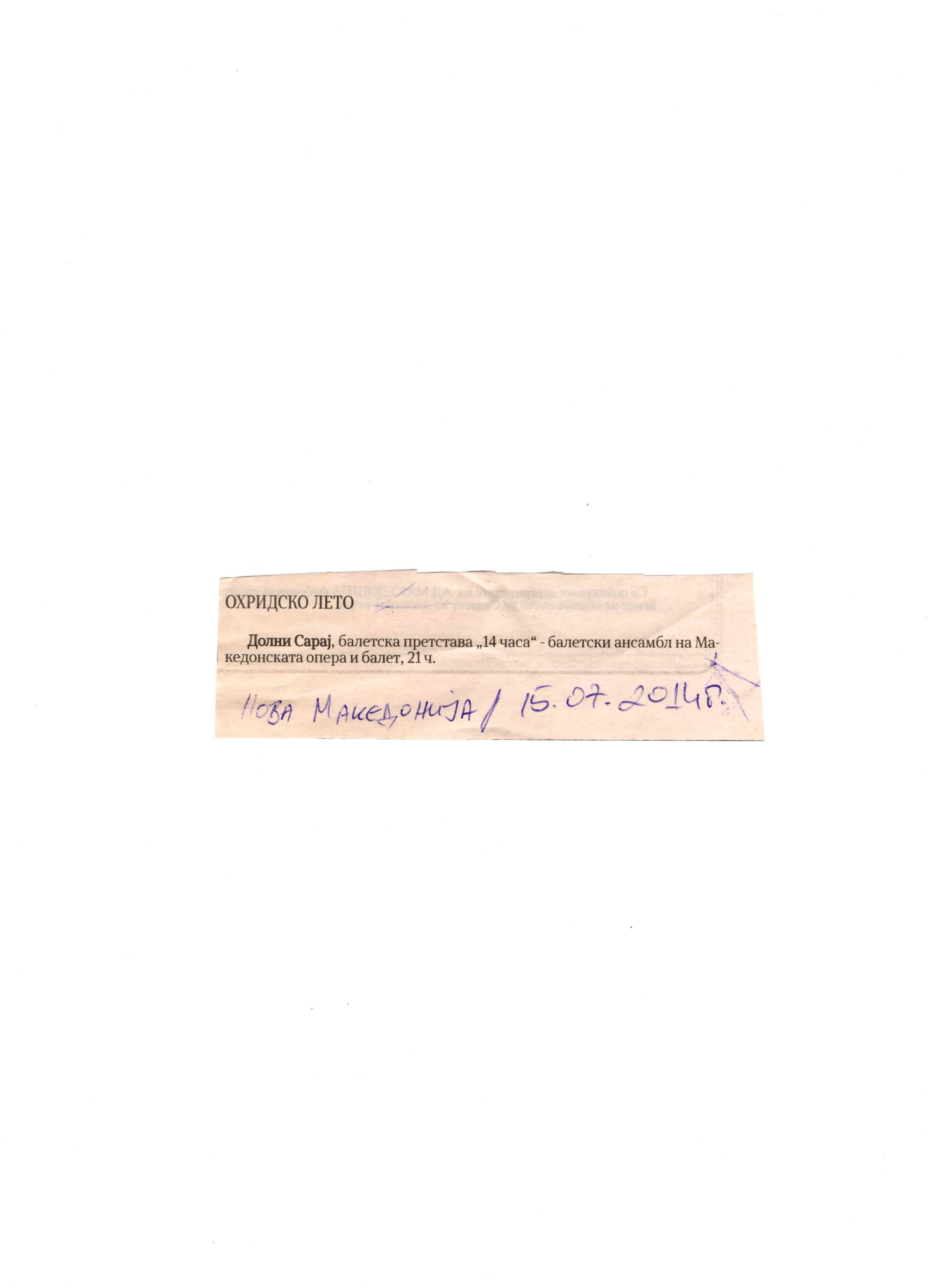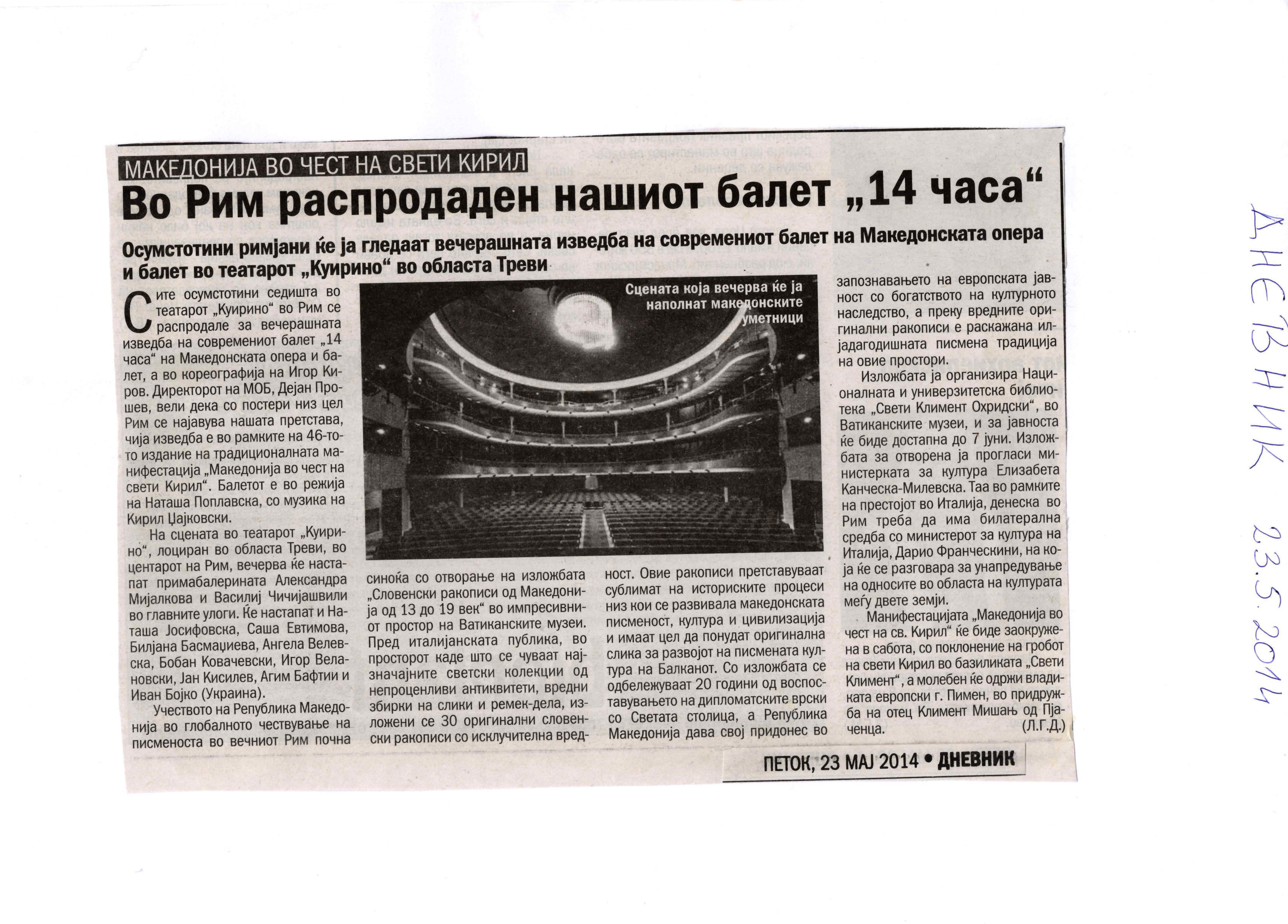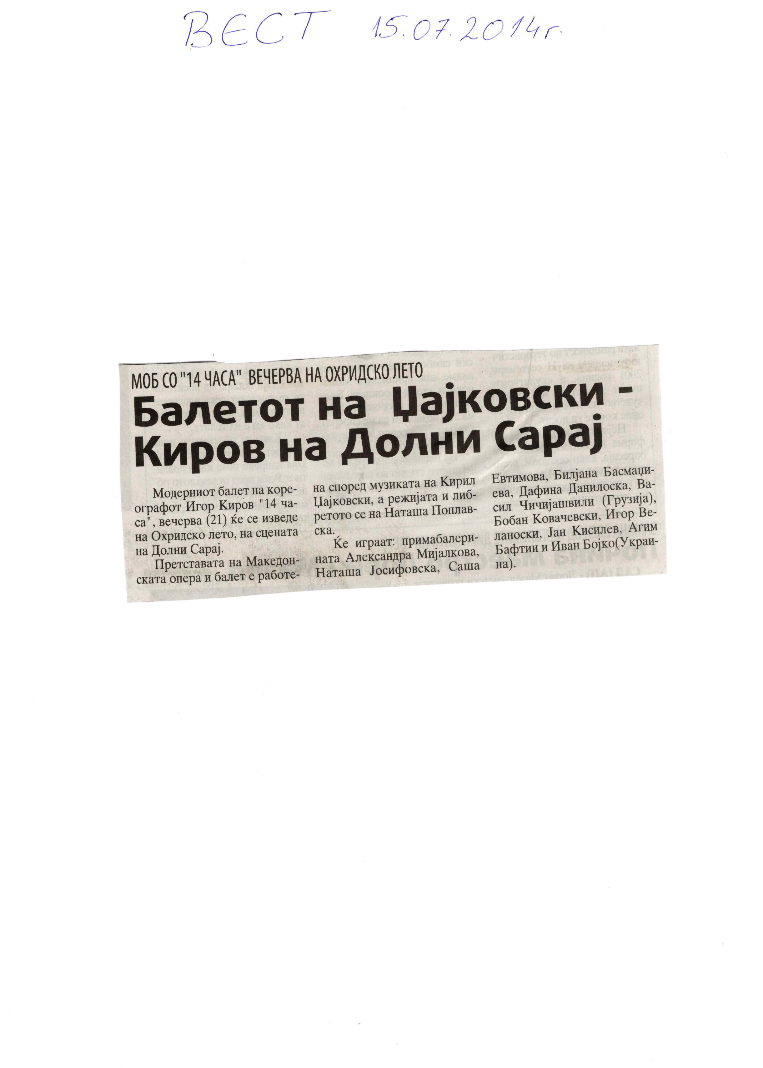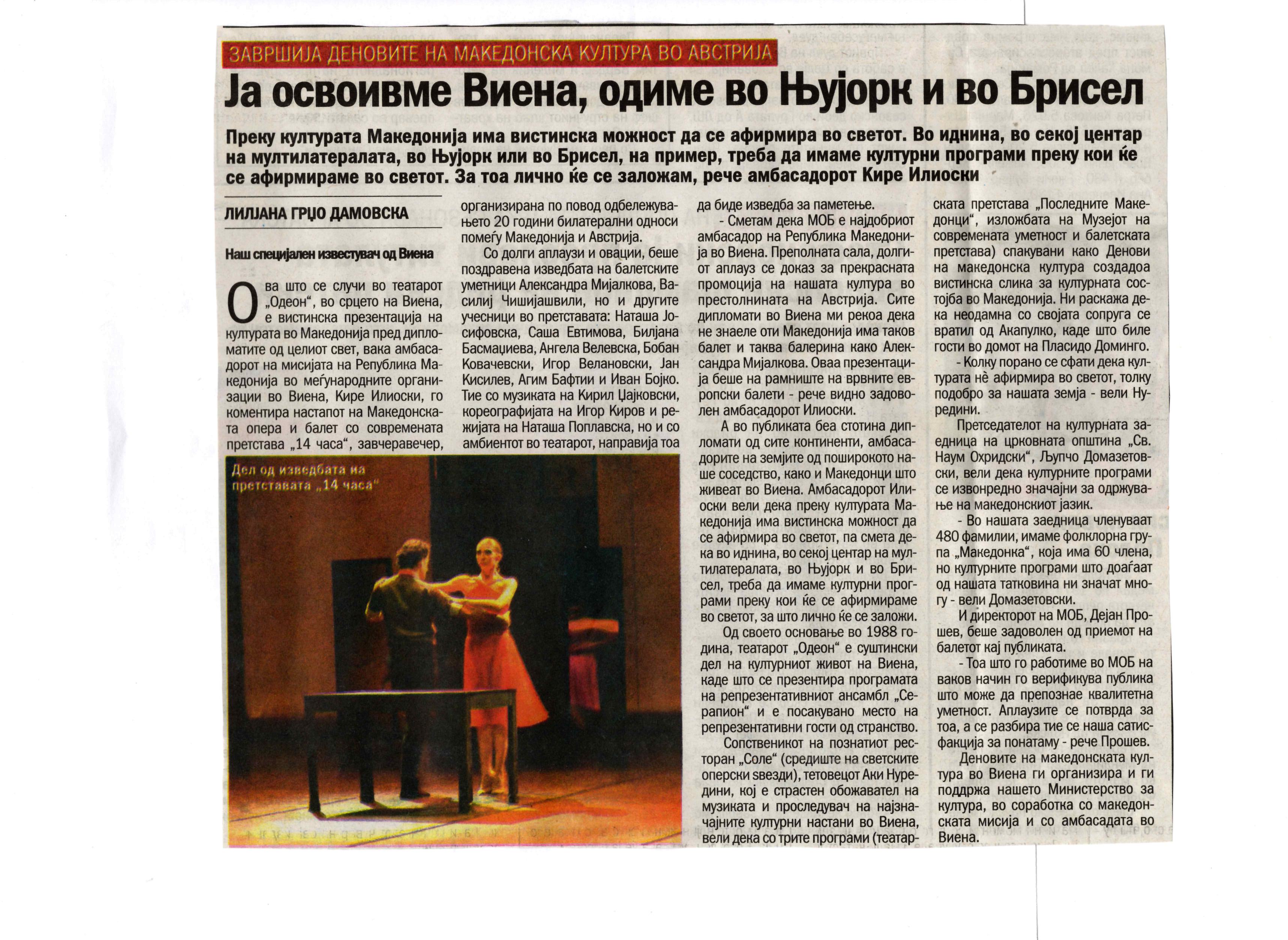 “14 Hours” is a contemporary ballet performance by Igor Kirov, created for the stage of the Macedonian Opera and Ballet. The music for the performance was composed by Kiril Džajkovski, while the libretto and direction were done by Natasha Poplavska.