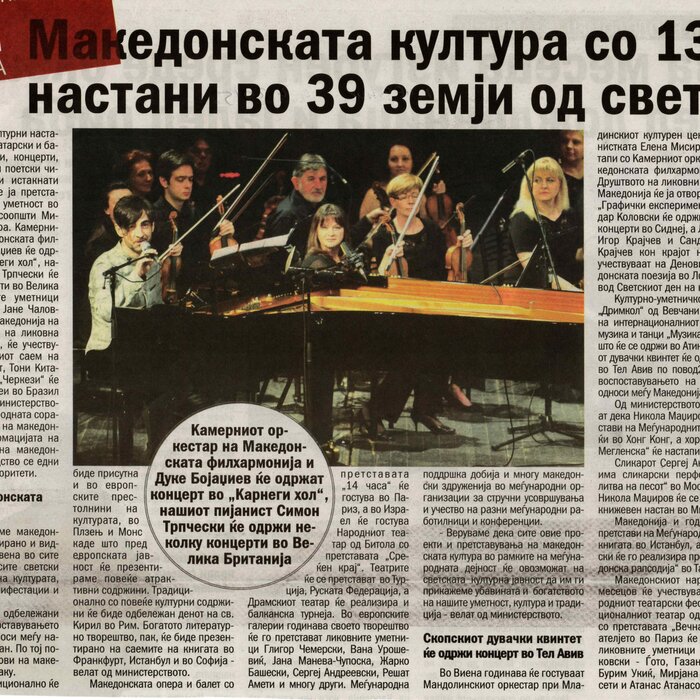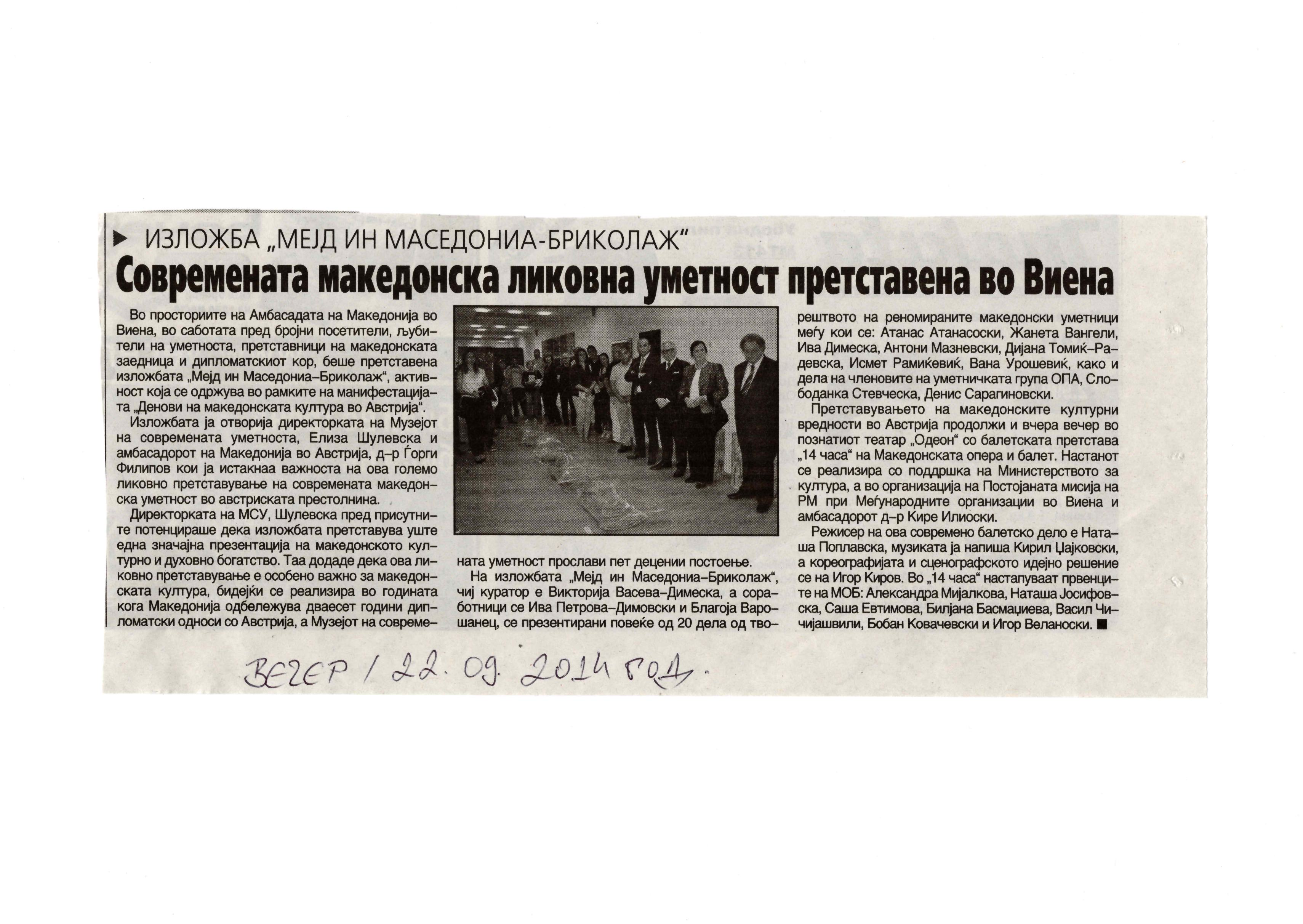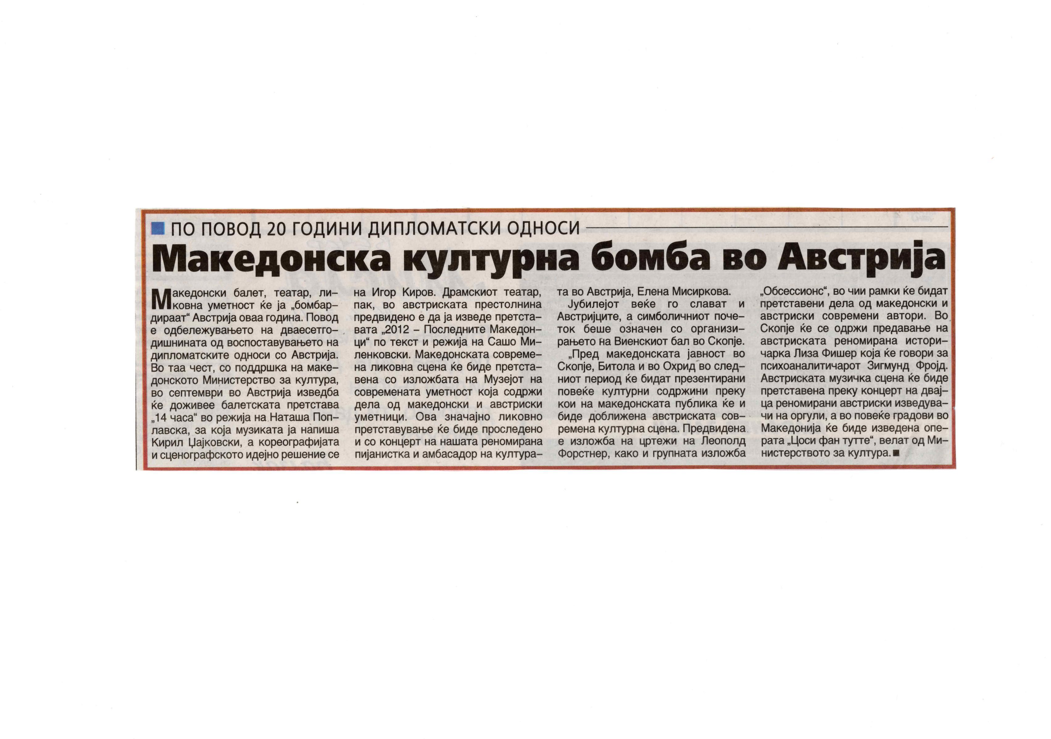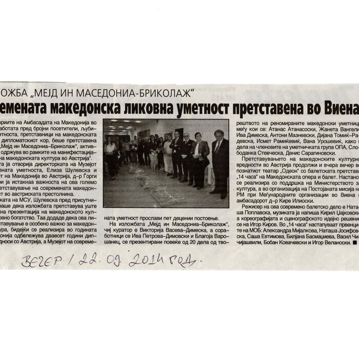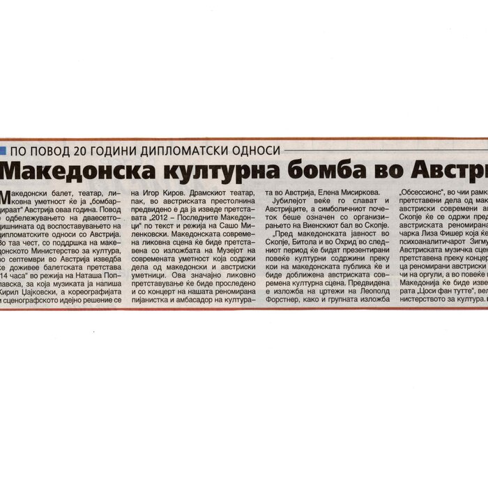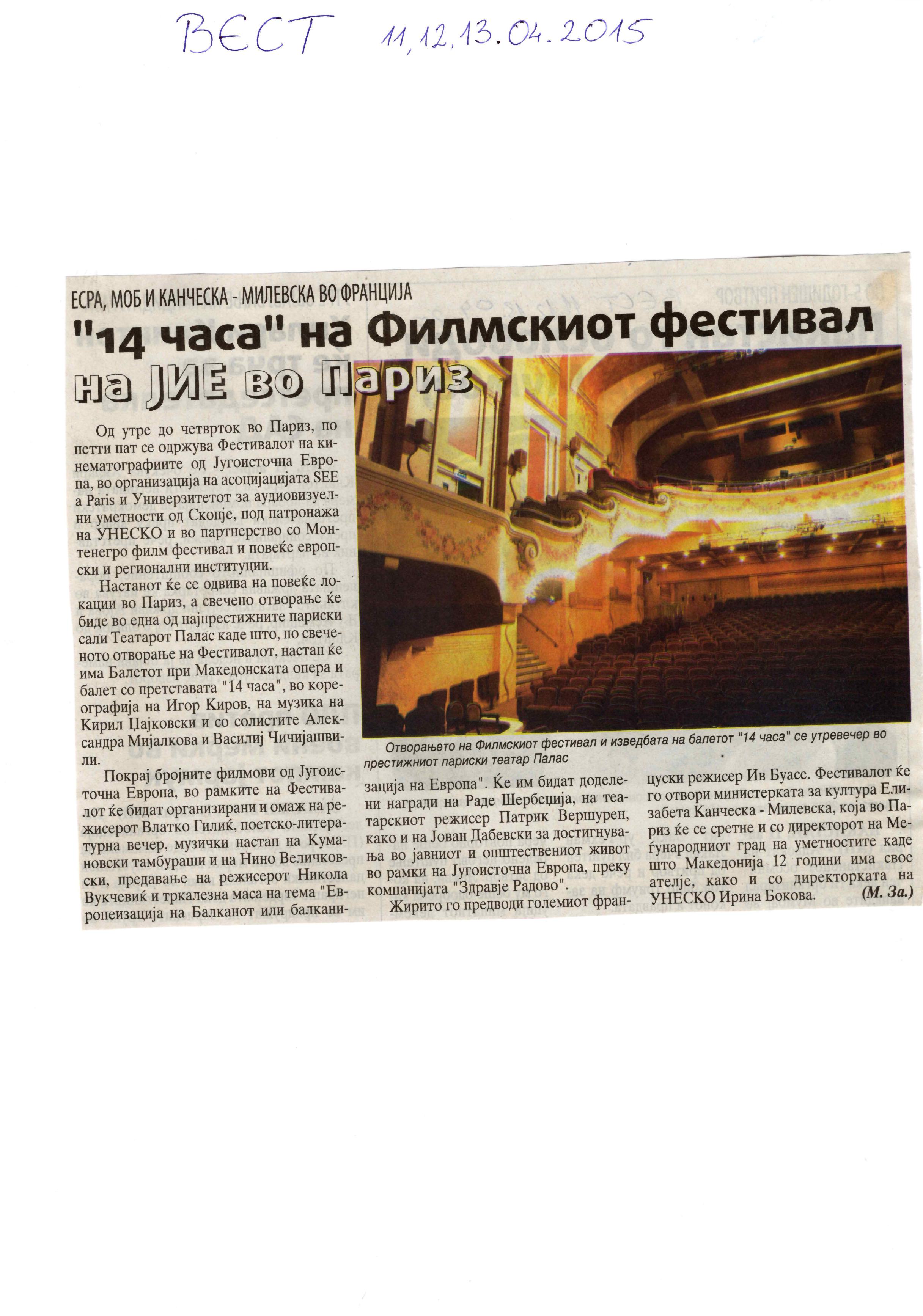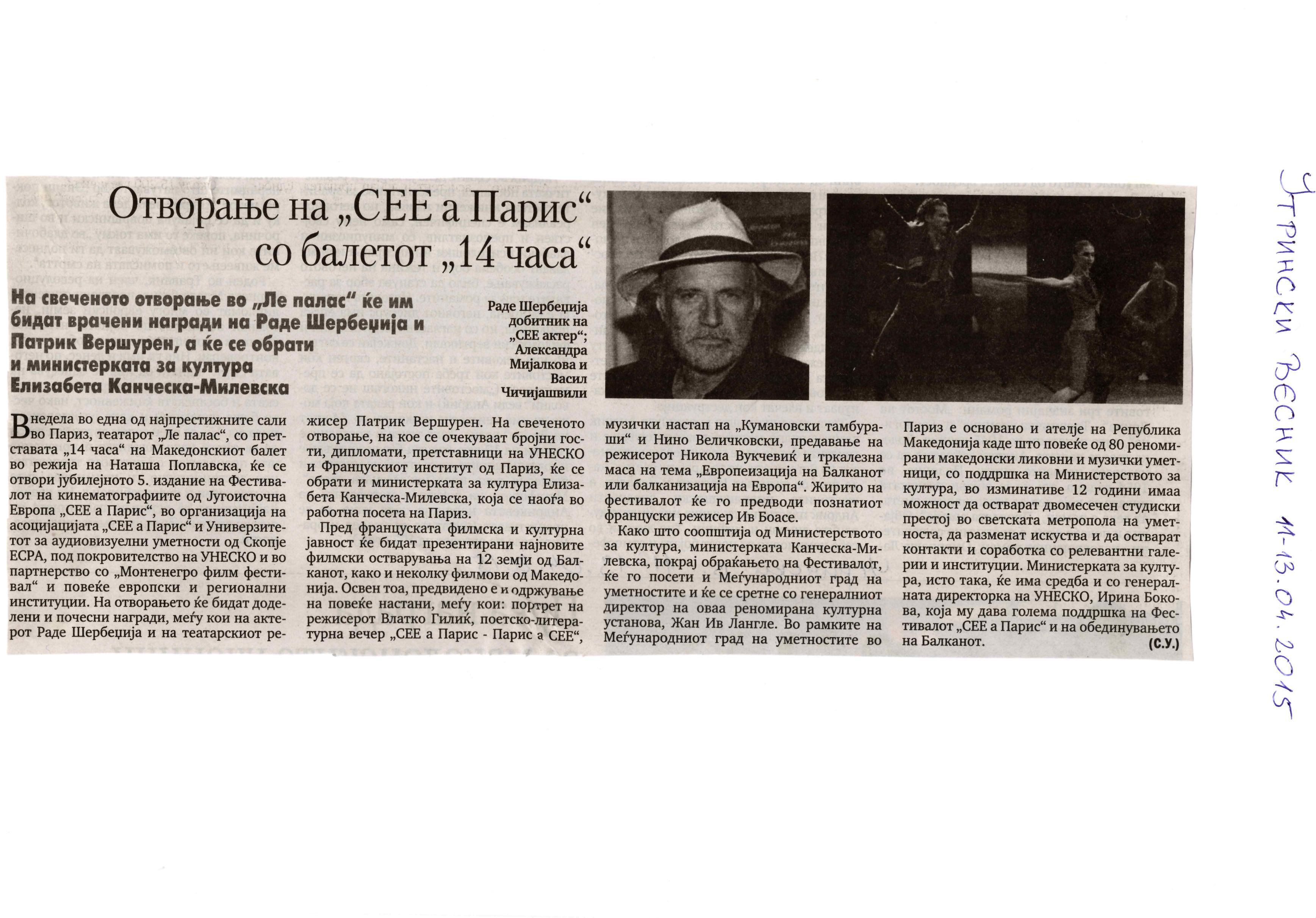 “14 Hours” is a contemporary ballet performance by Igor Kirov, created for the stage of the Macedonian Opera and Ballet. The music for the performance was composed by Kiril Džajkovski, while the libretto and direction were done by Natasha Poplavska.