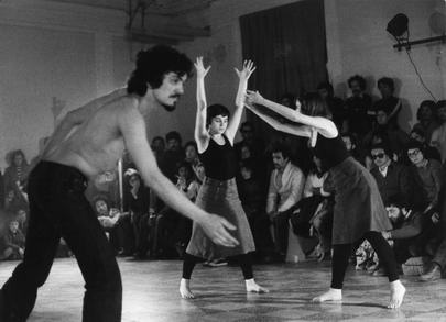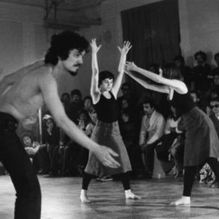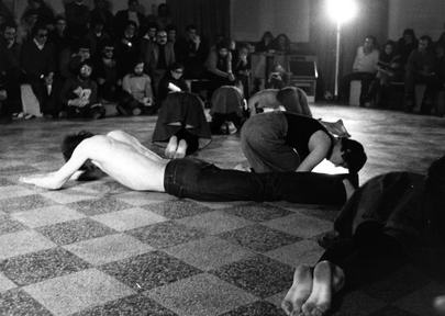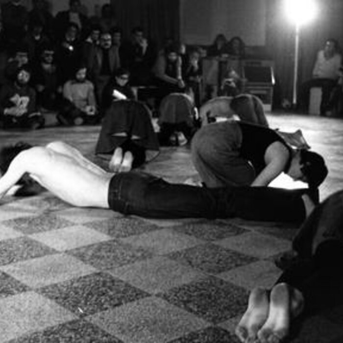 Milana’s Broš Chamber Ensemble of Free Dance (Komorni Ansambl Slobodnog Plesa – KASP) was known for offering a radical response to traditional forms with improvisation, challenging established dance positions and norms through direct, unstructured movement exploration, while extending practices to non-professional dancers and presenting them in non-theatrical spaces. The performance Event 13, which debuted at the disco club of Student Center in Zagreb, in 1975 and was later presented in other unconventional, underground spaces, is marked by all the specifics as mentioned earlier.Starting from the challenging dynamics of club environments, where loud music often creates a sense of isolation and aimlessness, hindering interaction among people, the performance begins as the audience enters the space, where the performers engage in a near-ritualistic act of passing a ball to one another. The performers then form two opposing lines, reinforcing the linear movement of the rolling balls and creating a dynamic of horizontal communication, and contrasting directions. One performer disrupts the group of aligned bodies, knocking them down as they slowly rise again. The performance concludes with a free dance, inviting the audience to participate, which they would usually do.