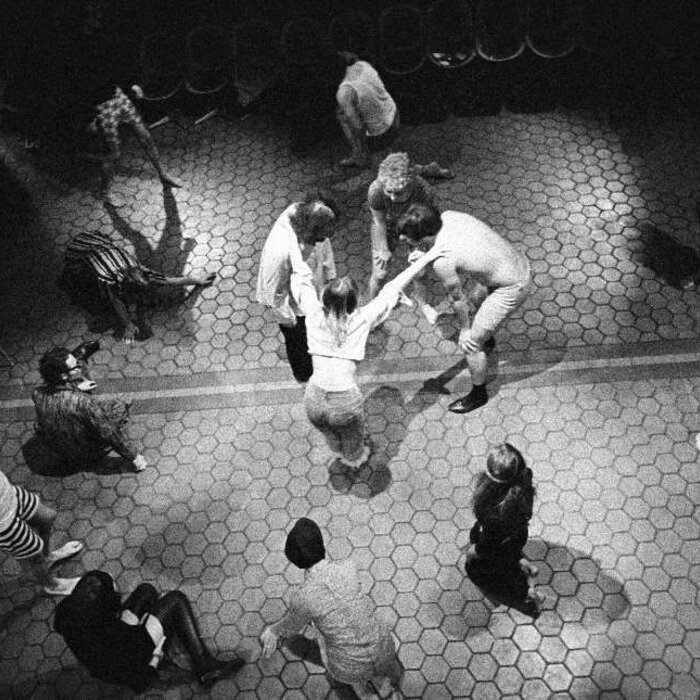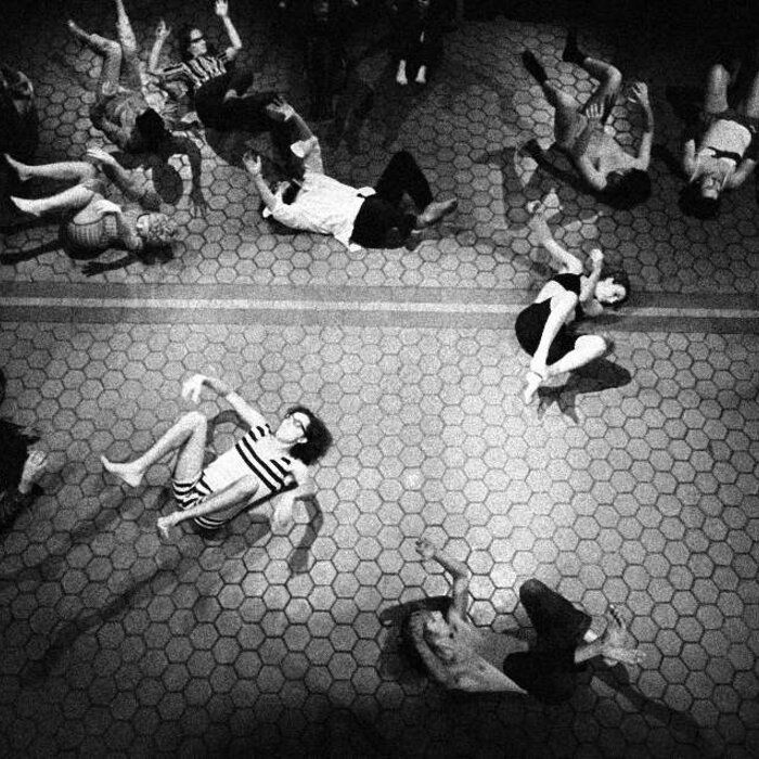The legendary performance Pupilija, Papa Pupilo and the Pupilceks (Pupilija, papa Pupilo pa Pupilčki) from October 1969 is a collaboration between the theatre director and playwright Dušan Jovanović and a bunch of youngsters from the poet theatre group 441/442/443. Among the hybrid theatre performances from the second half of the 20th century, the Pupilija Ferkeverk piece corresponds the most with the postmodern dance tendencies and the theatre (neo)avant-gardes of the 1960s. The everyday movements and actions, the collection of found objects used in acts, the appropriations, the references from pop culture, the exposed bodies with nakedness, the found scores (games, a photo-novel, and the choral organization of the group), the unconventional use of music and texts, and the parody of conventional theatre and dance forms, etc., were just some of the elements of the linear structure of the scenes, which one imagines can be organized by chance in any order without losing its meaning (with the exception of the final scene in which a chicken was slaughtered in front of the public). Theatre means and elements are used in an egalitarian way, the bodies of performers enter the stage profaned, yet controlled and scored. The premiere in the Knight’s Hall venue of the Križanke Summer Theatre was followed by a scandalous response from the local mainstream press due to the chicken slaughtering at the end of the performance that overshadowed the rest of it. However, the negative responses came mainly from the lack of theatrological concepts. On the day of the rerun, on the 4th of November 1969, the director of the venue, Danilo Bračič, banned all planned reruns and therefore, on the 6th of November, Pupilija Ferkeverk Theatre performed in the venue of the student campus of Ljubljana. Around 1,200 people attended. The same month the performance was presented in Maribor and shortly afterwards recorded for TV Ljubljana. In 1970, the performance toured Zagreb, Rijeka, and Belgrade. Pupilija, Papa Pupilo and the Pupilceks is one typical example of how a reformation of the theatre medium often ended up in forms that one can analyse as choreographies.