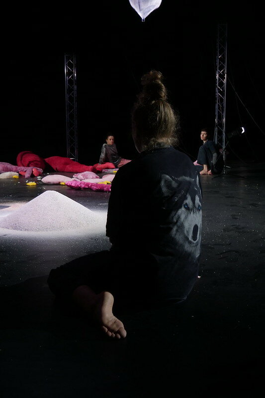 A Womb for an Adult is a dance performance, where the main focus is drawn to re-creating a body and a space: a body in space, but also space as a body generating a particular sensation. The stage setting is thought of as a space deriving its meaning from two places that are inherently interconnected: a construction site and a playground. The piece is proposing an extensive panorama permeated with bodies and objects through which the performers are exploring a visual dramaturgy of a playground. While interacting with objects that inhabit the space and are conceptually divided into tools and toys, the performers challenge the act of laboring and transform it into an act of playing. As a consequence of the movement, polymorphic relationships are appearing from which a variety of different sounds are produced.